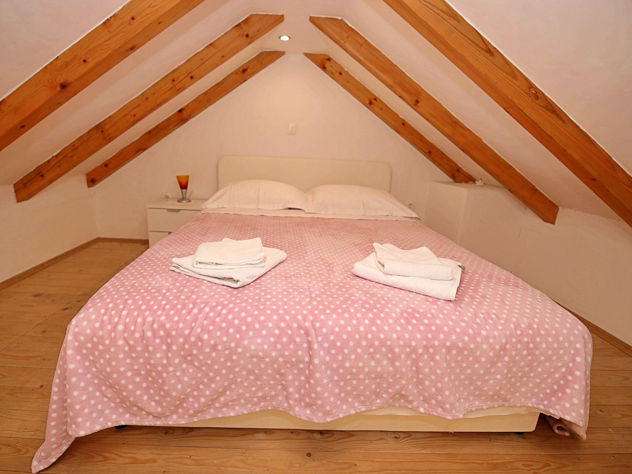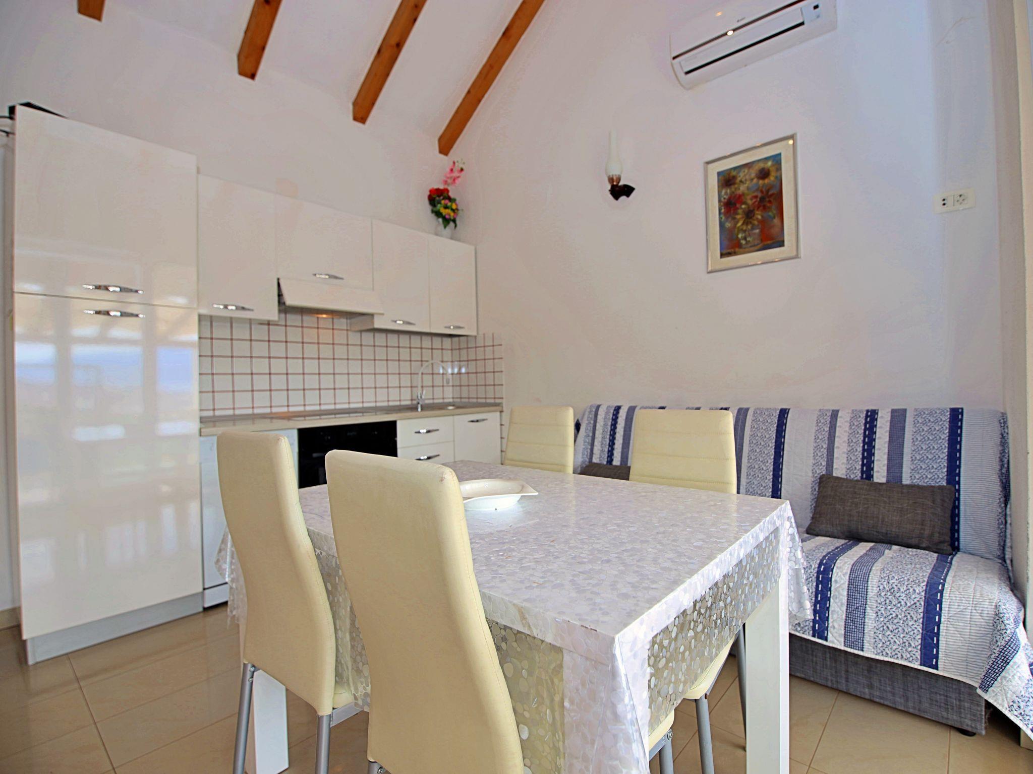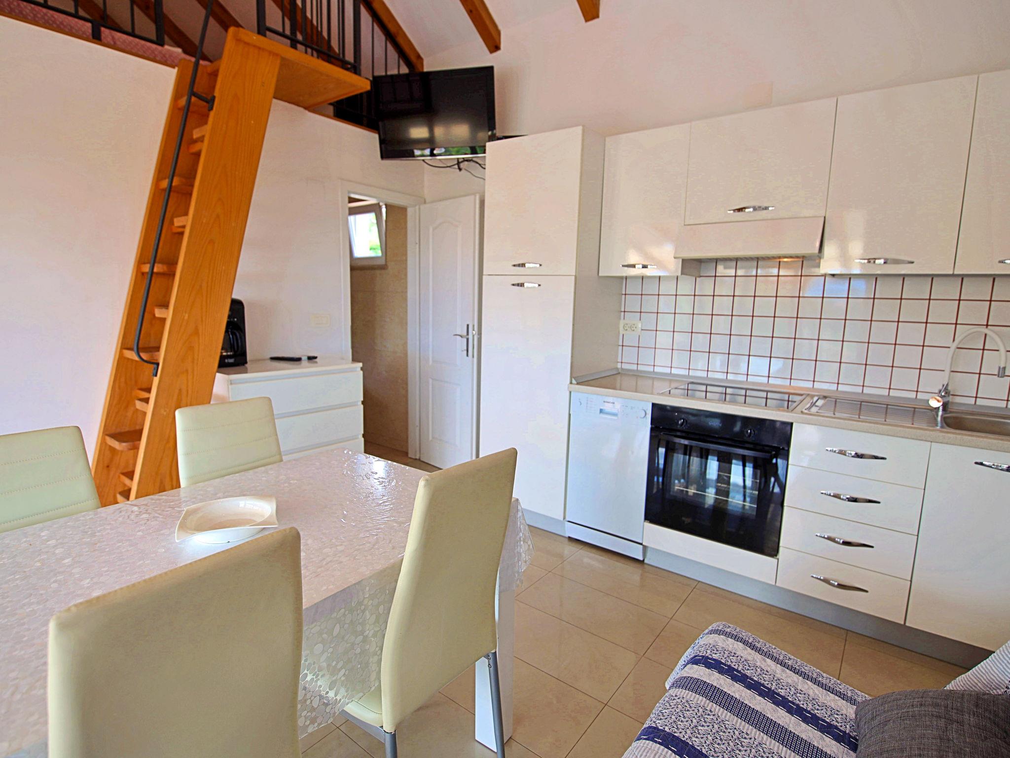 2-room house 29 m2 on 2 levels. Living/dining room with satellite TV (flat screen), air conditioning. Exit to the terrace. 1 room with 1 french bed (160 cm, length 200 cm). Open kitchen (4 hot plates, oven, dishwasher, freezer). Shower/WC. Top floor: (ladder) open gallery, with sloping ceilings, ceiling height 100 - 200 cm with 1 french bed (150 cm, length 200 cm). Terrace 22 m2, roofed. Terrace furniture, deck chairs. Beautiful view of the sea. Facilities: Internet (WiFi, free). Maximum 1 pet/ dog allowed.