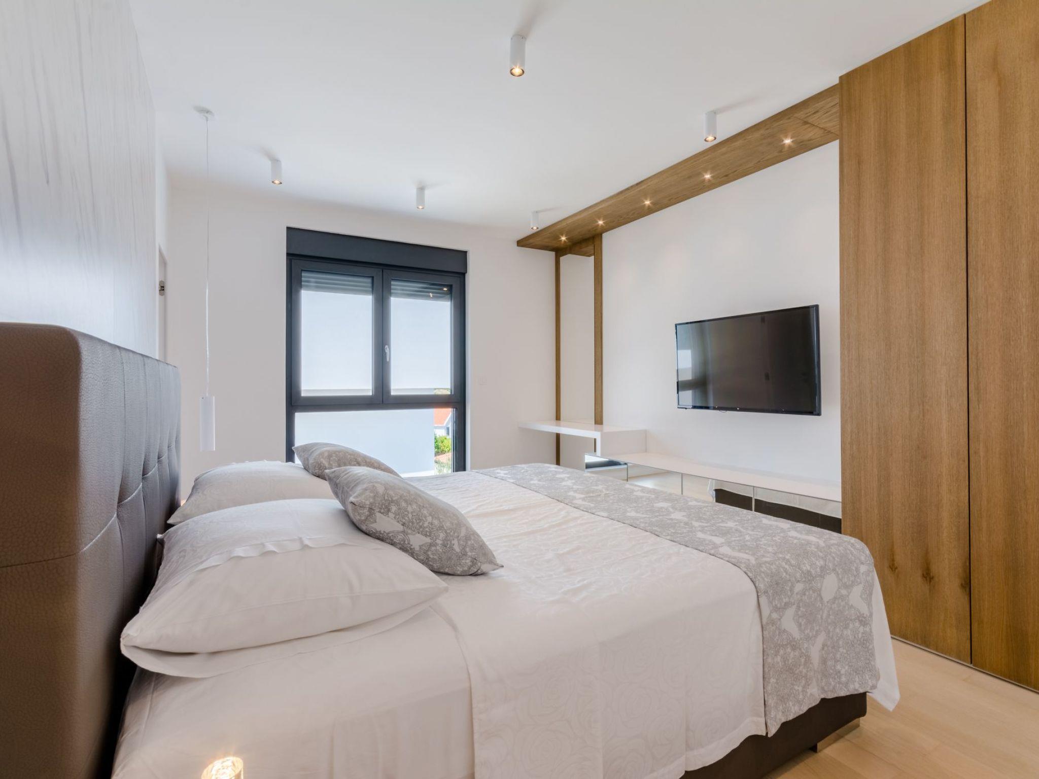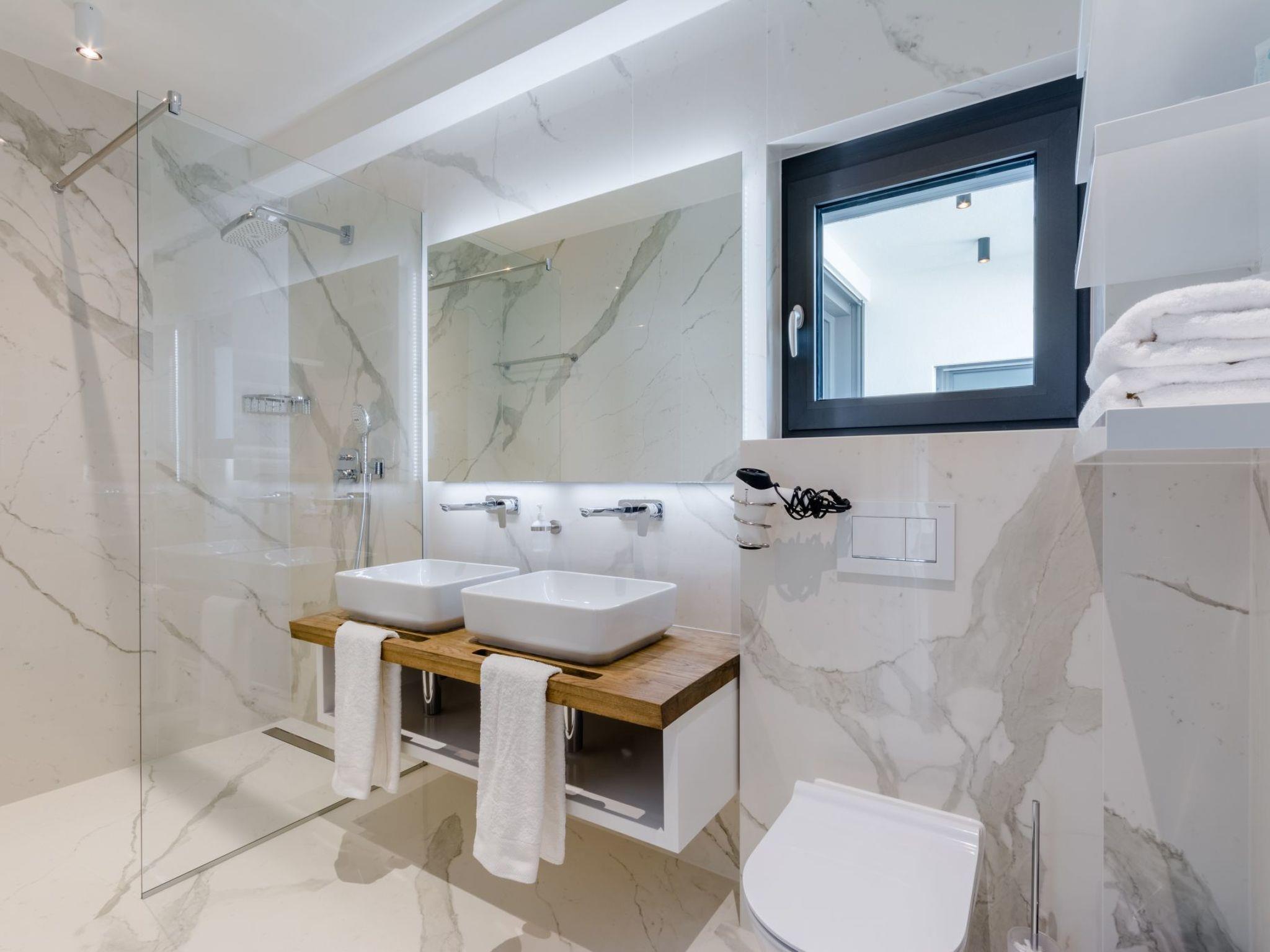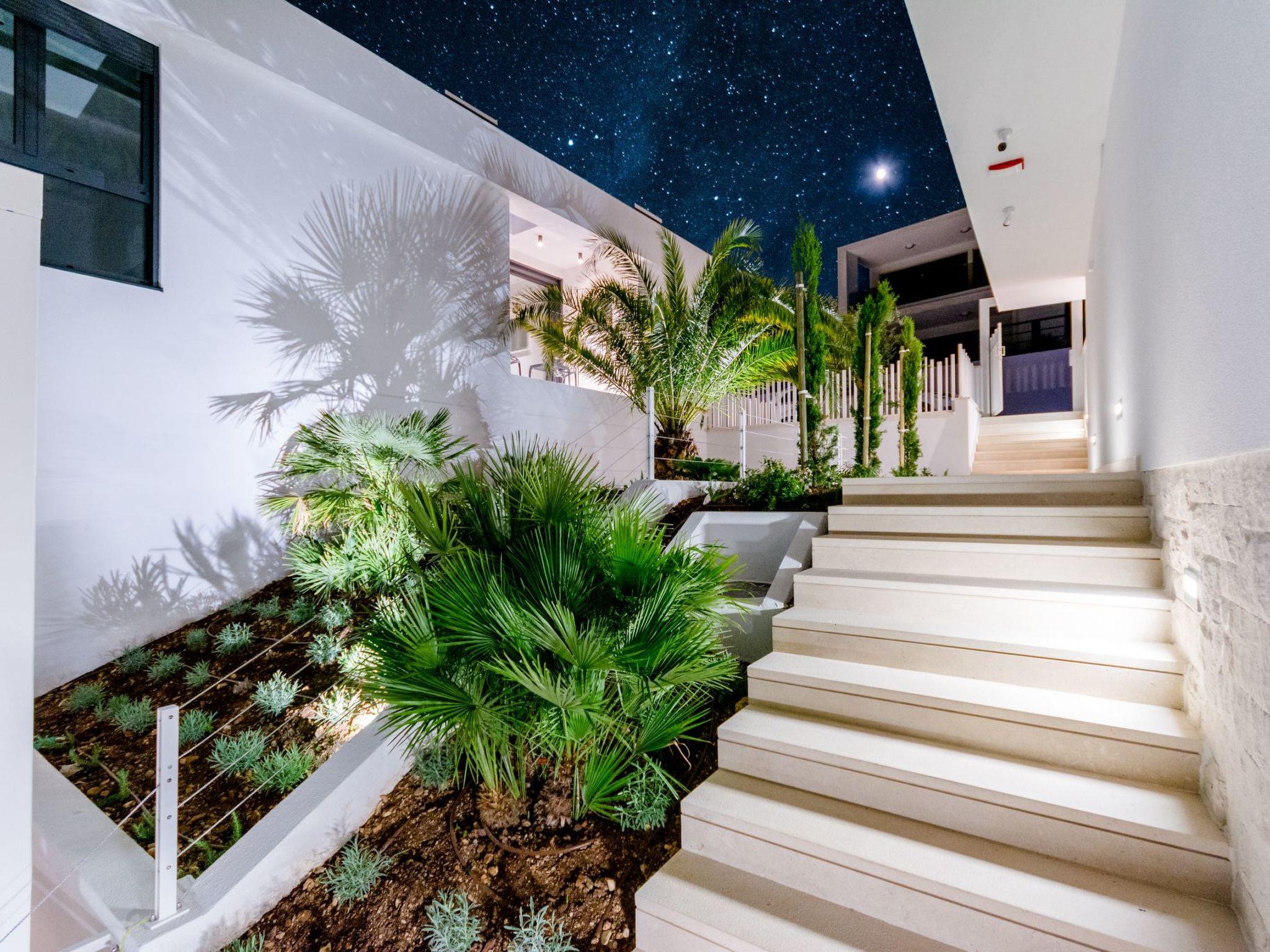 Our estate with a direct view of the Adriatic Sea was built in 2018 in compliance with cutting edge building standards, and it merges together state-of-the-art architecture and elegant luxury. You can observe the starry night sky from the seemingly edgeless heated infinity swimming pools, or enjoy the sunrise while having a delicious breakfast on one of our spacious terraces. Our stylishly furnished 620 m2 villa complex offers you two fitness rooms, as well as two ping pong tables. Six exclusively furnished bedrooms with private bathrooms and king-size beds welcome you to dreamland. We also provide you with free high-speed wireless Internet, as well as with LED smart TVs in every bedroom and in the living room.