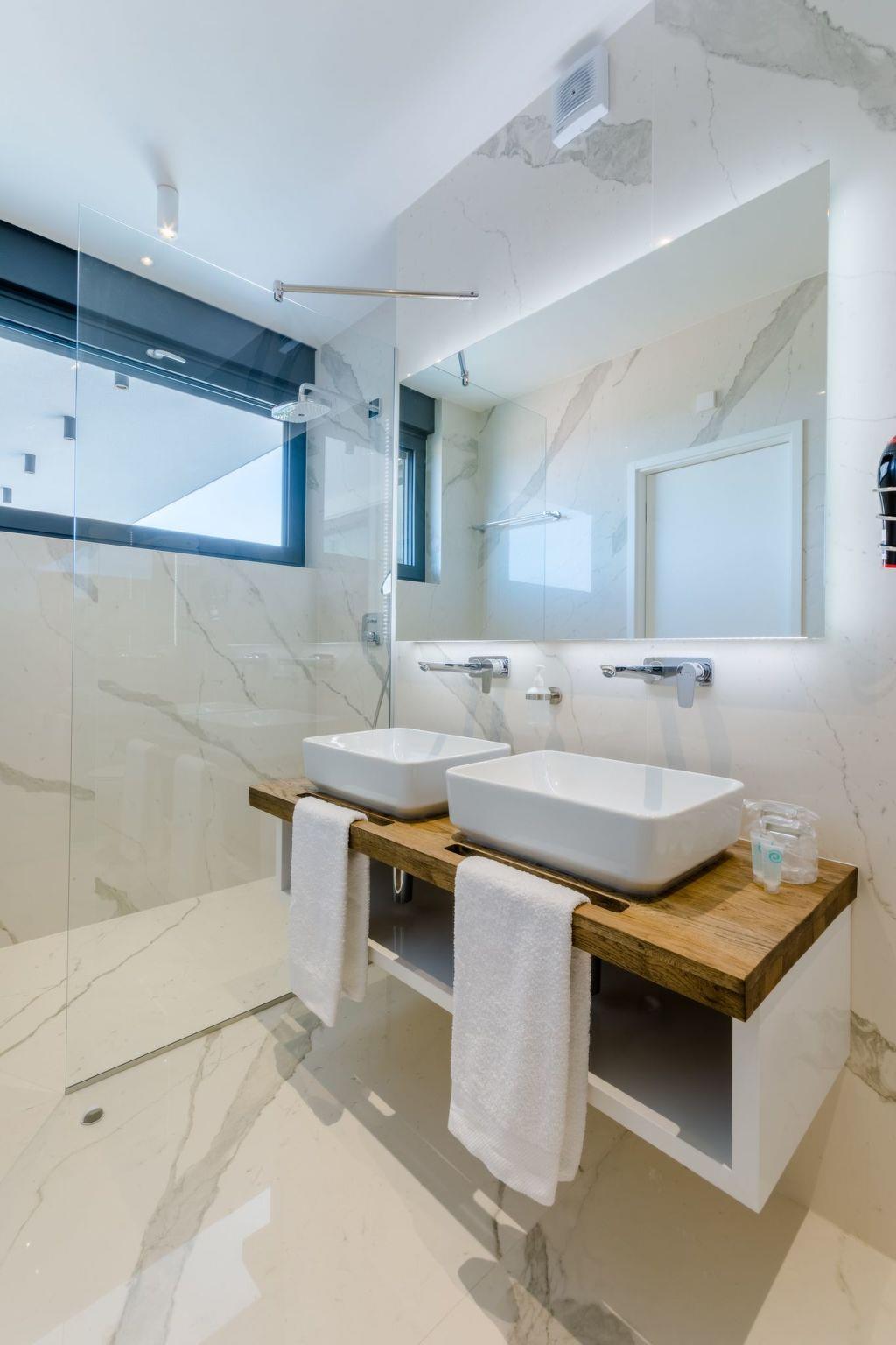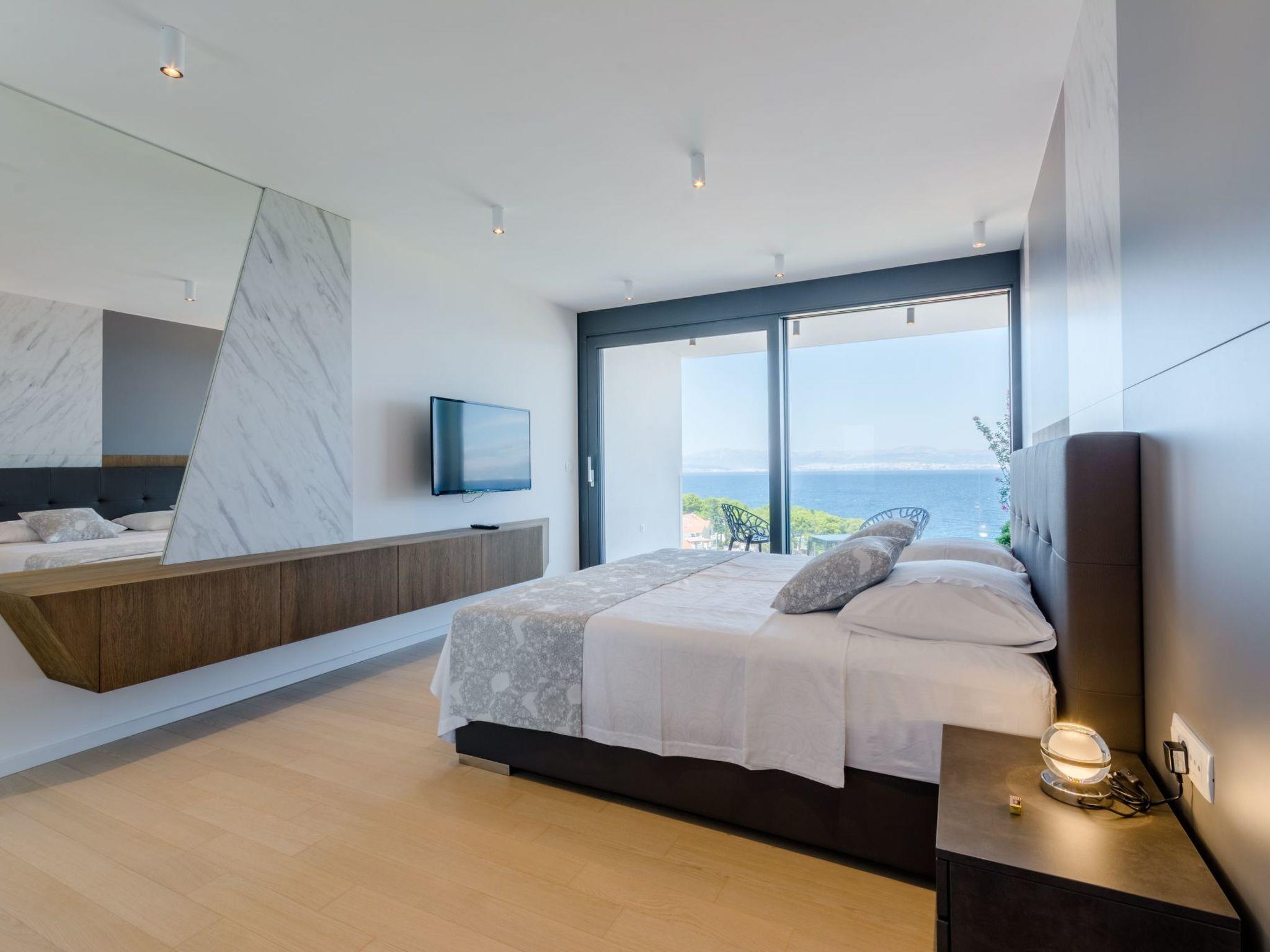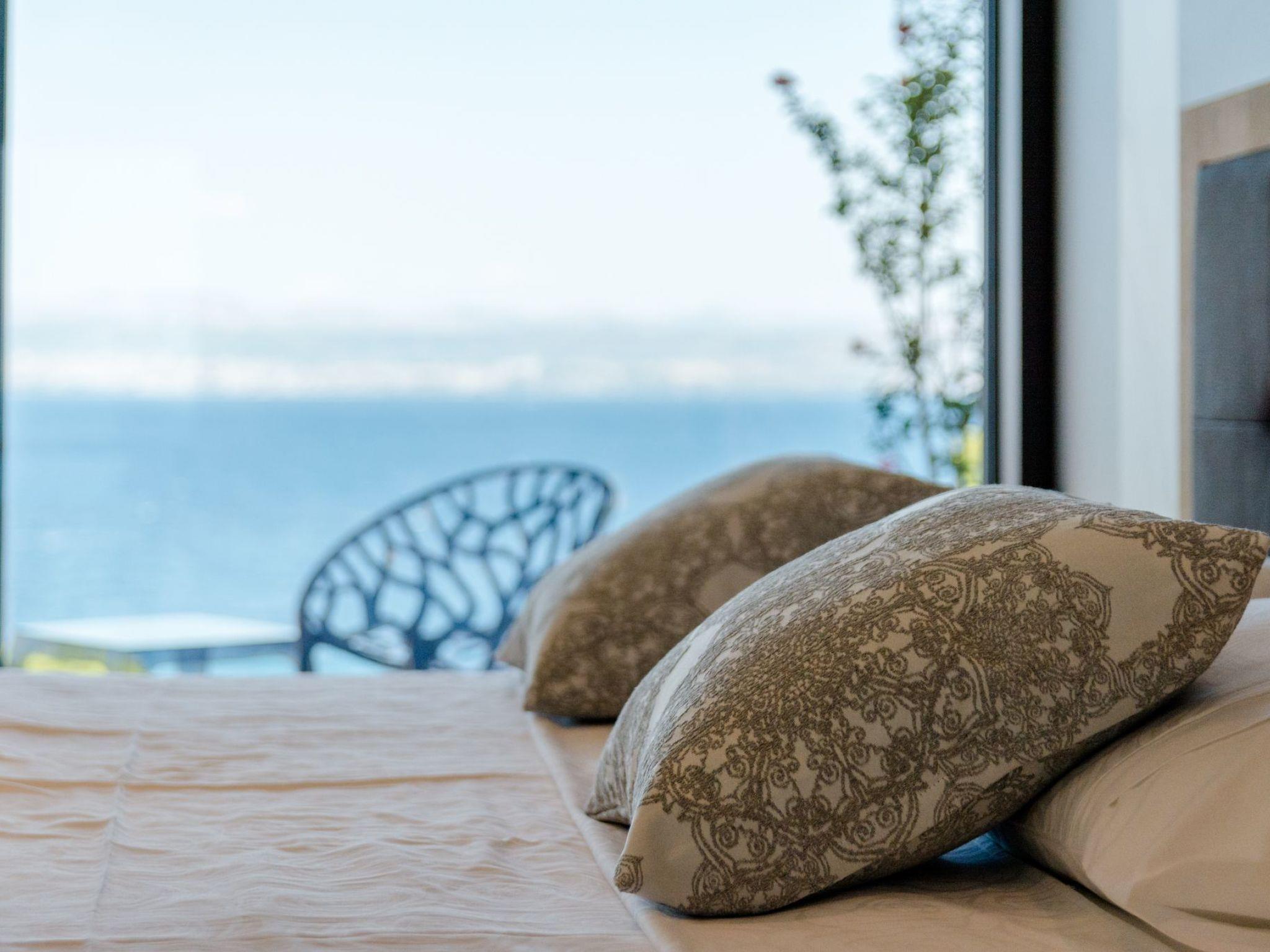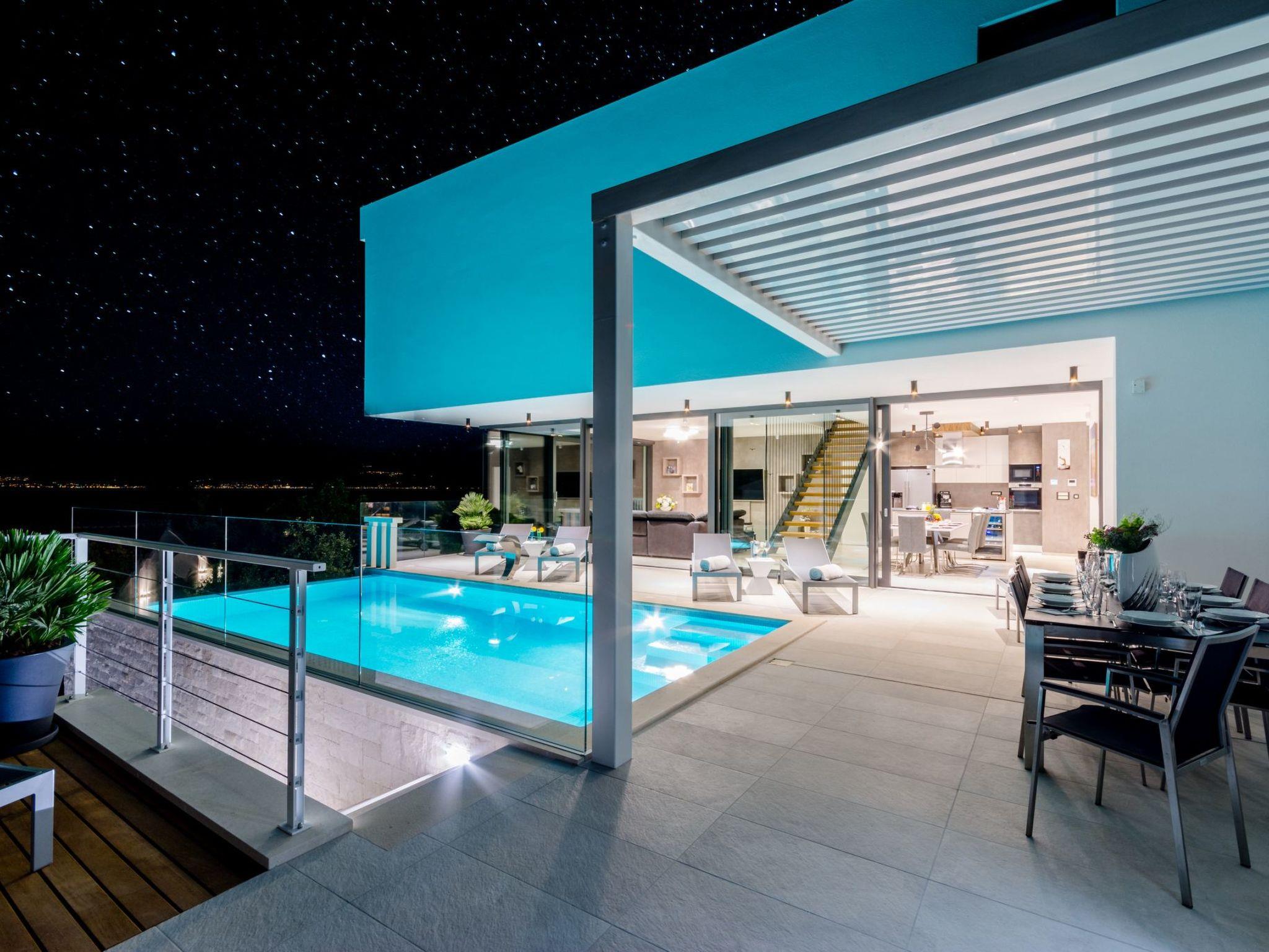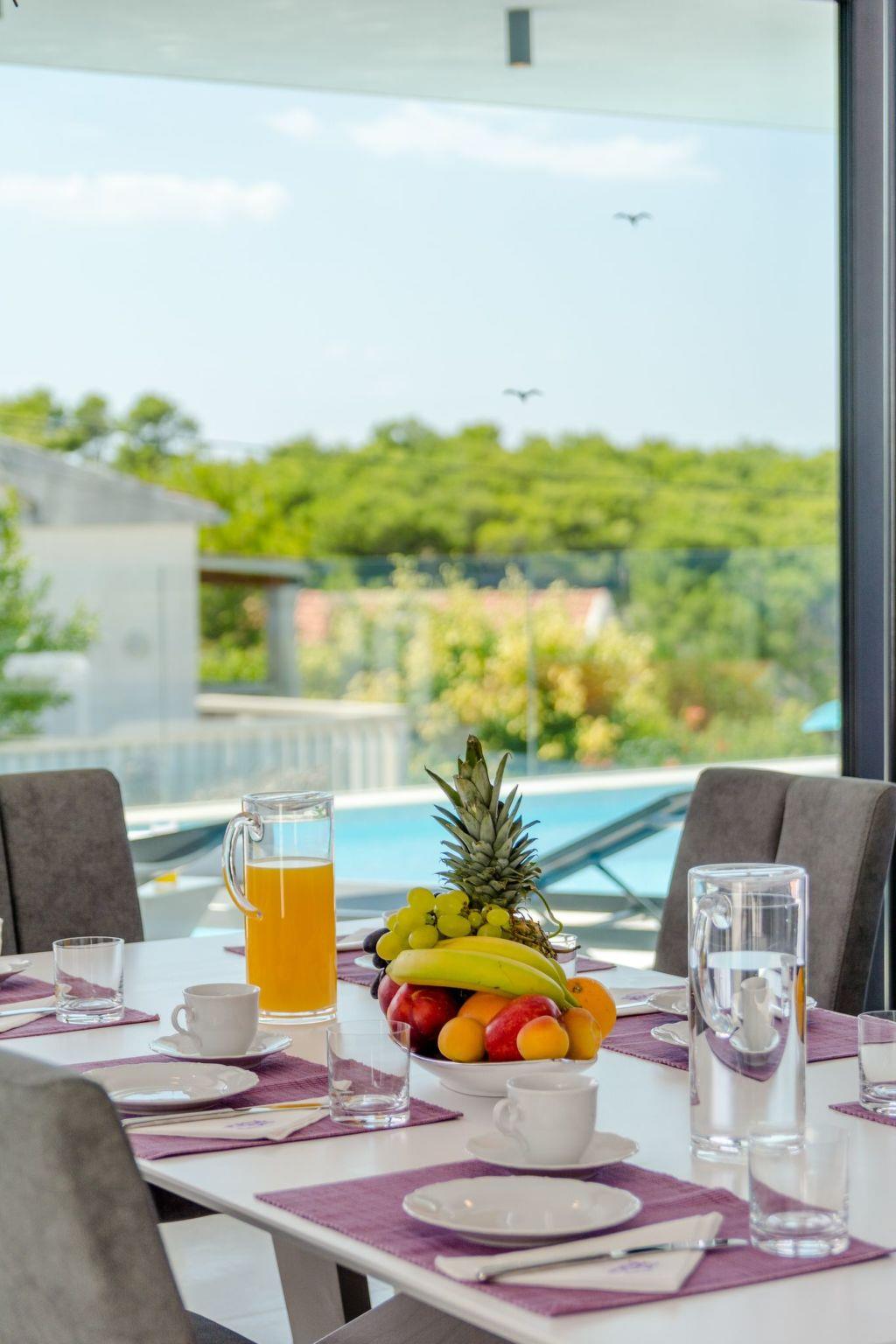 Our estate with a direct view of the Adriatic Sea was built in 2018 in compliance with cutting edge building standards, and it merges together state-of-the-art architecture and elegant luxury. You can observe the starry night sky from the seemingly edgeless heated infinity swimming pool, or enjoy the sunrise while having a delicious breakfast on the spacious terrace. Our stylishly furnished 300 m2 villa offers you a fitness room, as well as a ping pong table. Three exclusively furnished bedrooms with private bathrooms and king-size beds welcome you to dreamland. We also provide you with free high-speed wireless Internet, as well as with LED smart TVs in every bedroom and in the living room.
