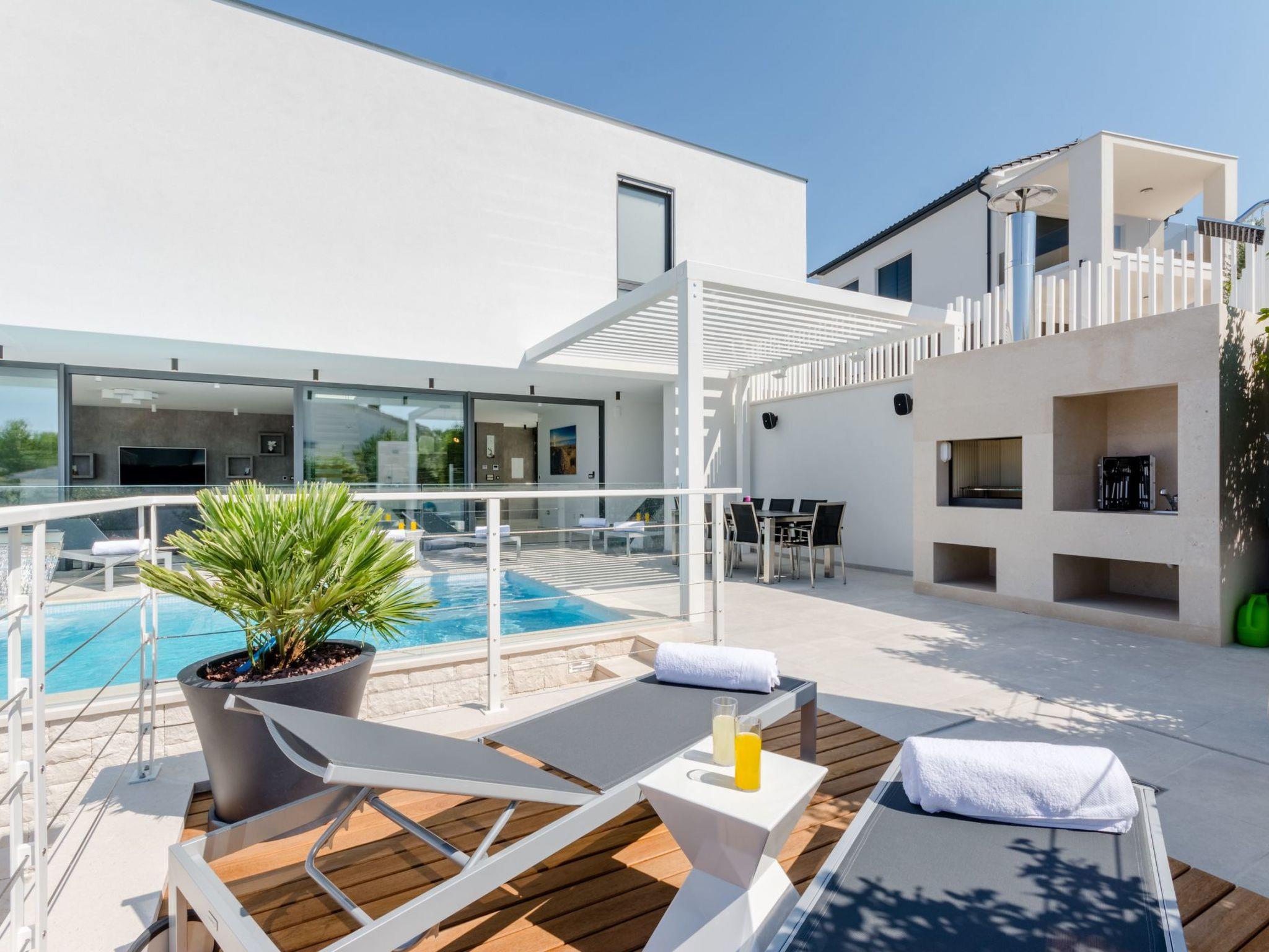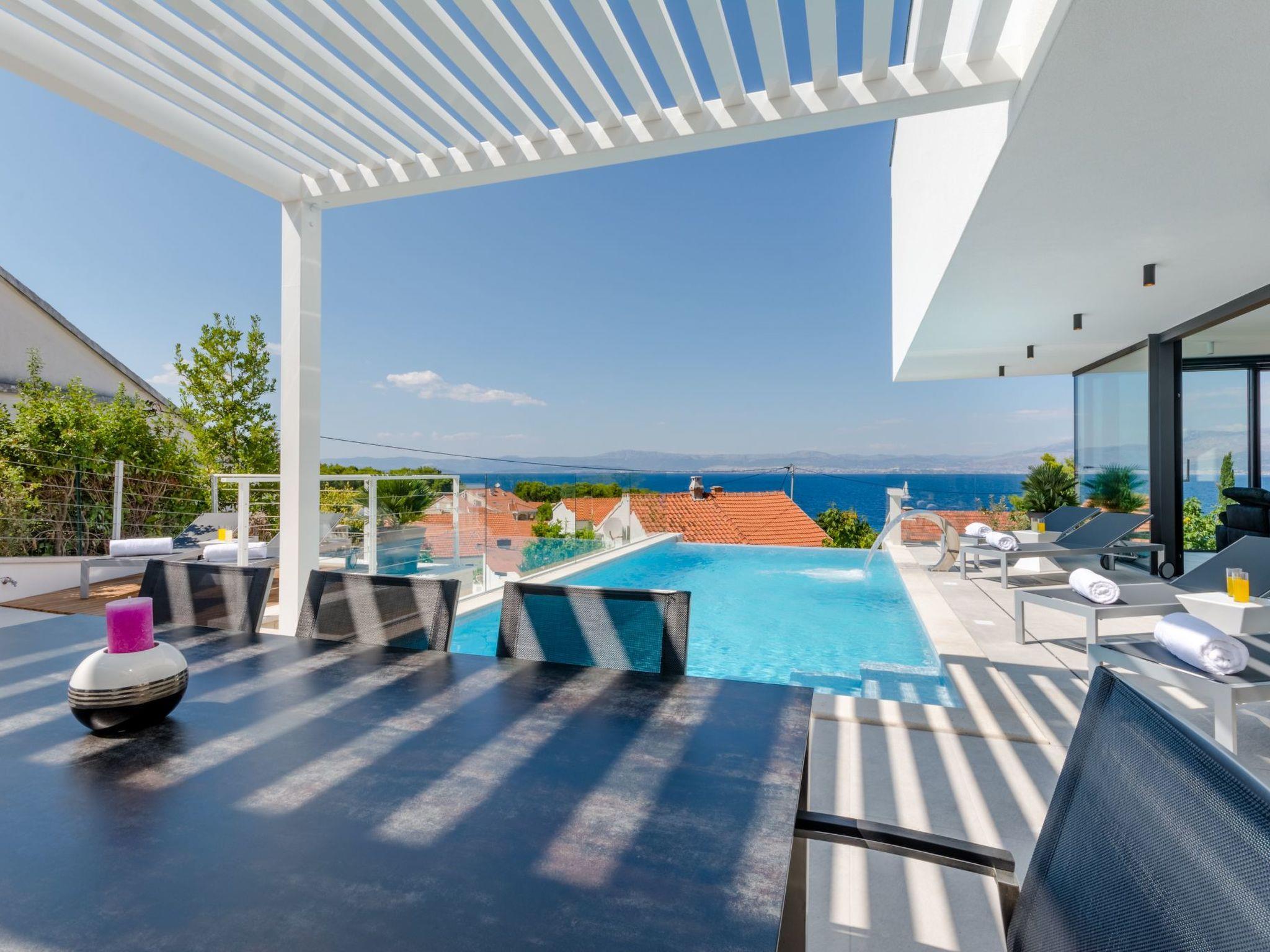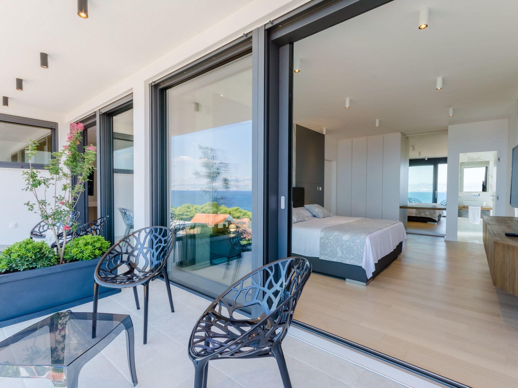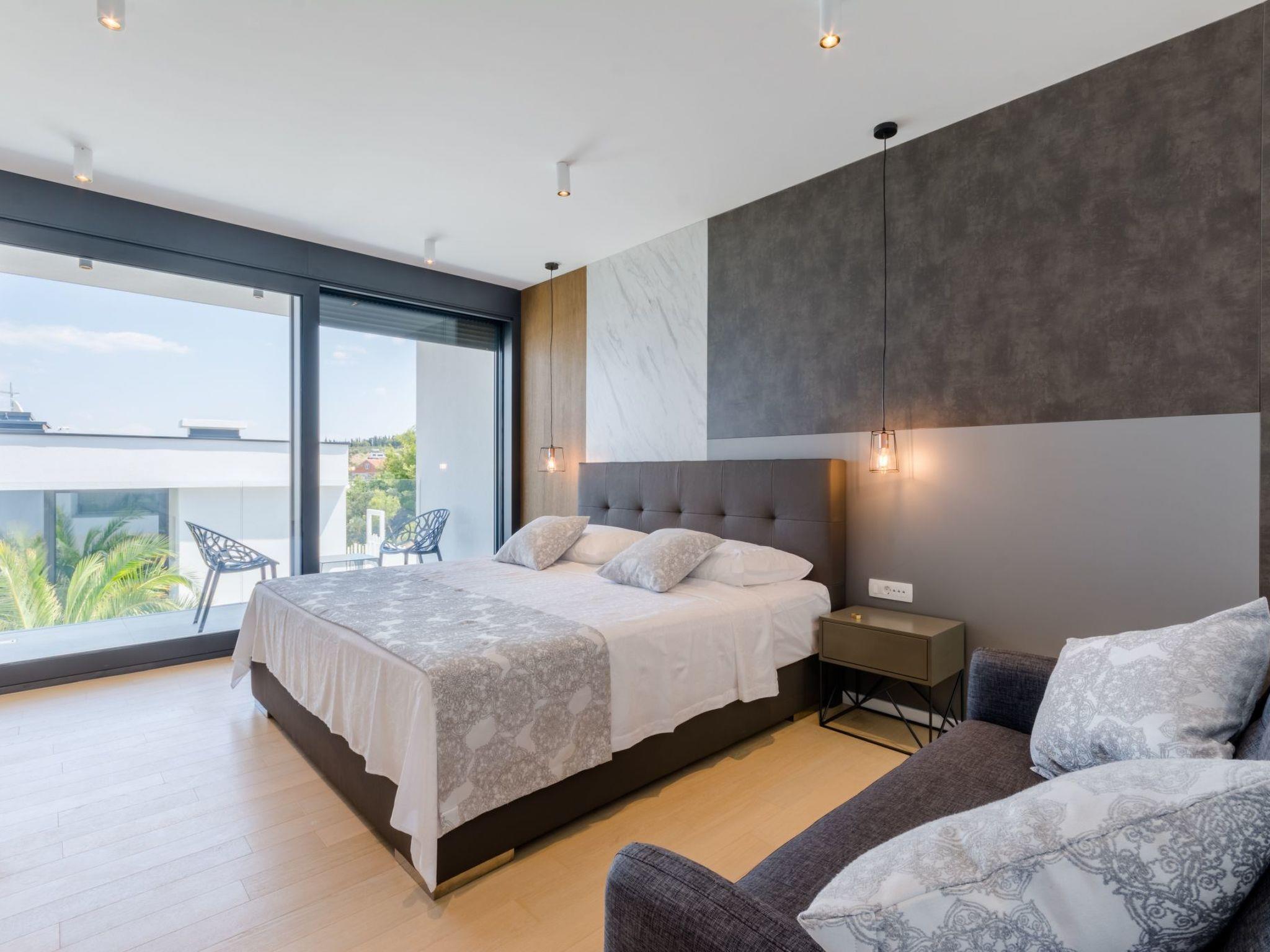 Our estate with a direct view of the Adriatic Sea was built in 2018 in compliance with cutting edge building standards, and it merges together state-of-the-art architecture and elegant luxury. You can observe the starry night sky from the seemingly edgeless heated infinity swimming pool, or enjoy the sunrise while having a delicious breakfast on the spacious terrace. Our stylishly furnished 300 m2 villa offers you a fitness room, as well as a ping pong table. Three exclusively furnished bedrooms with private bathrooms and king-size beds welcome you to dreamland. We also provide you with free high-speed wireless Internet, as well as with LED smart TVs in every bedroom and in the living room.