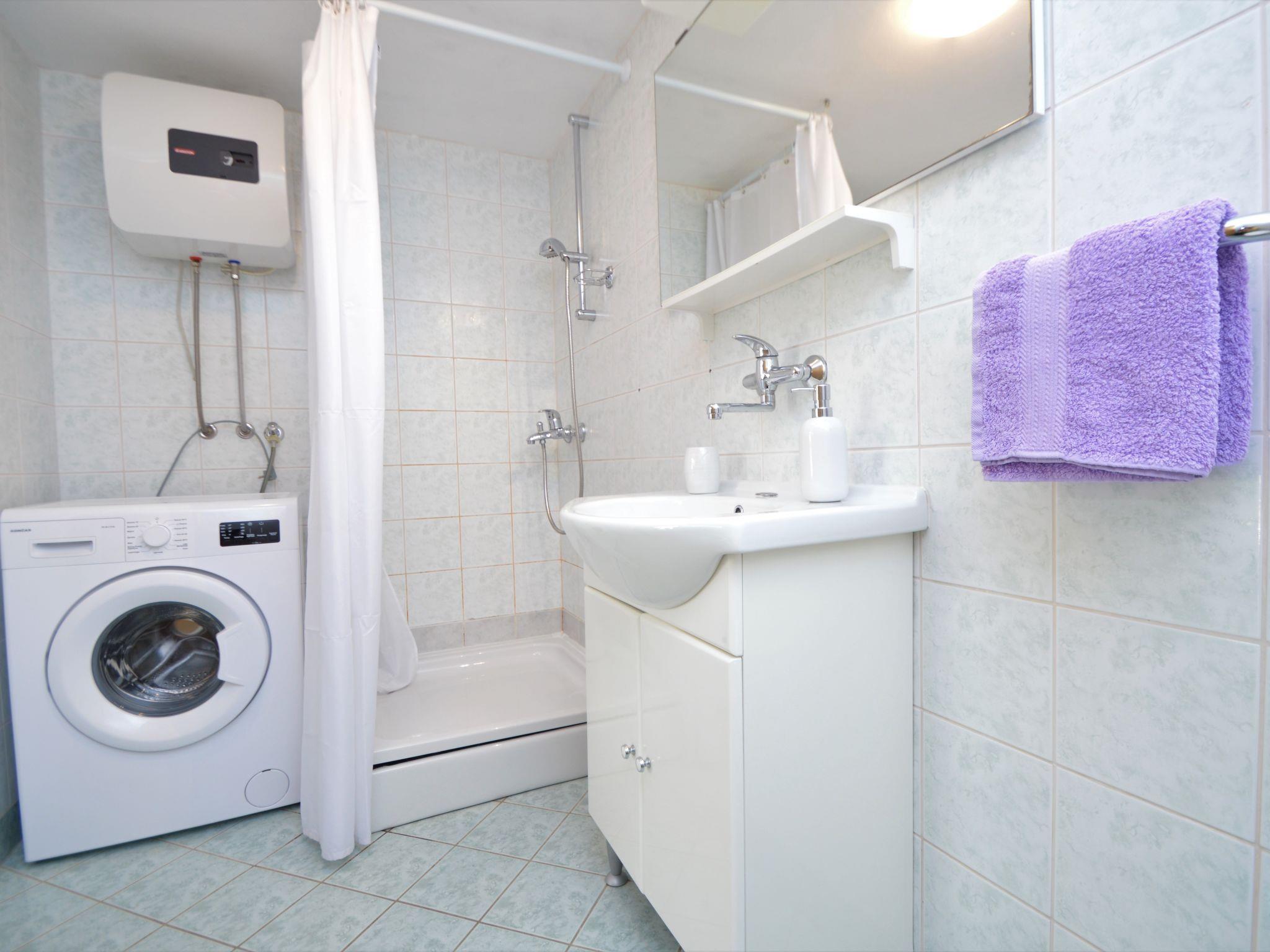 2-room apartment 50 m2, on the ground floor, north facing position. 2 rooms, ceiling height 215 cm, each room with 1 bed (90 cm, length 190 cm), 1 french bed (160 cm, length 200 cm). Kitchen (4 hot plates, oven, kettle, freezer, electric coffee machine) with dining table, ceiling height 215 cm, satellite TV and air conditioning. Exit to the terrace. Shower/WC. No heating option. Terrace 30 m2. Terrace furniture. Facilities: washing machine, iron, hair dryer. Internet (WiFi, free). Maximum 1 pet/ dog allowed.