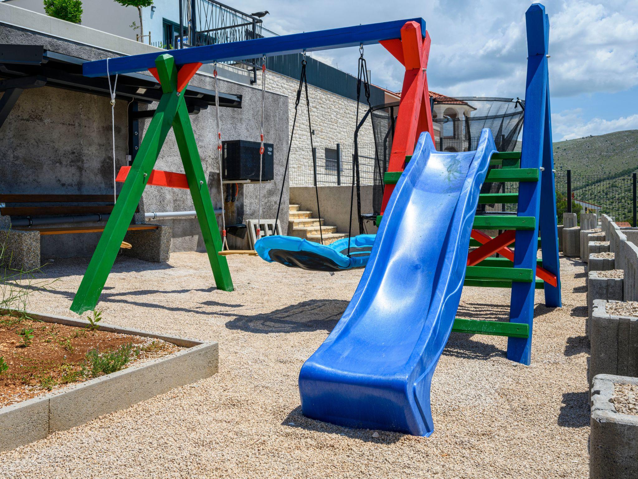 - A large and spacious children’s playground on the yard with swings, a teeter, a slide, a wooden playhouse and a covered bench