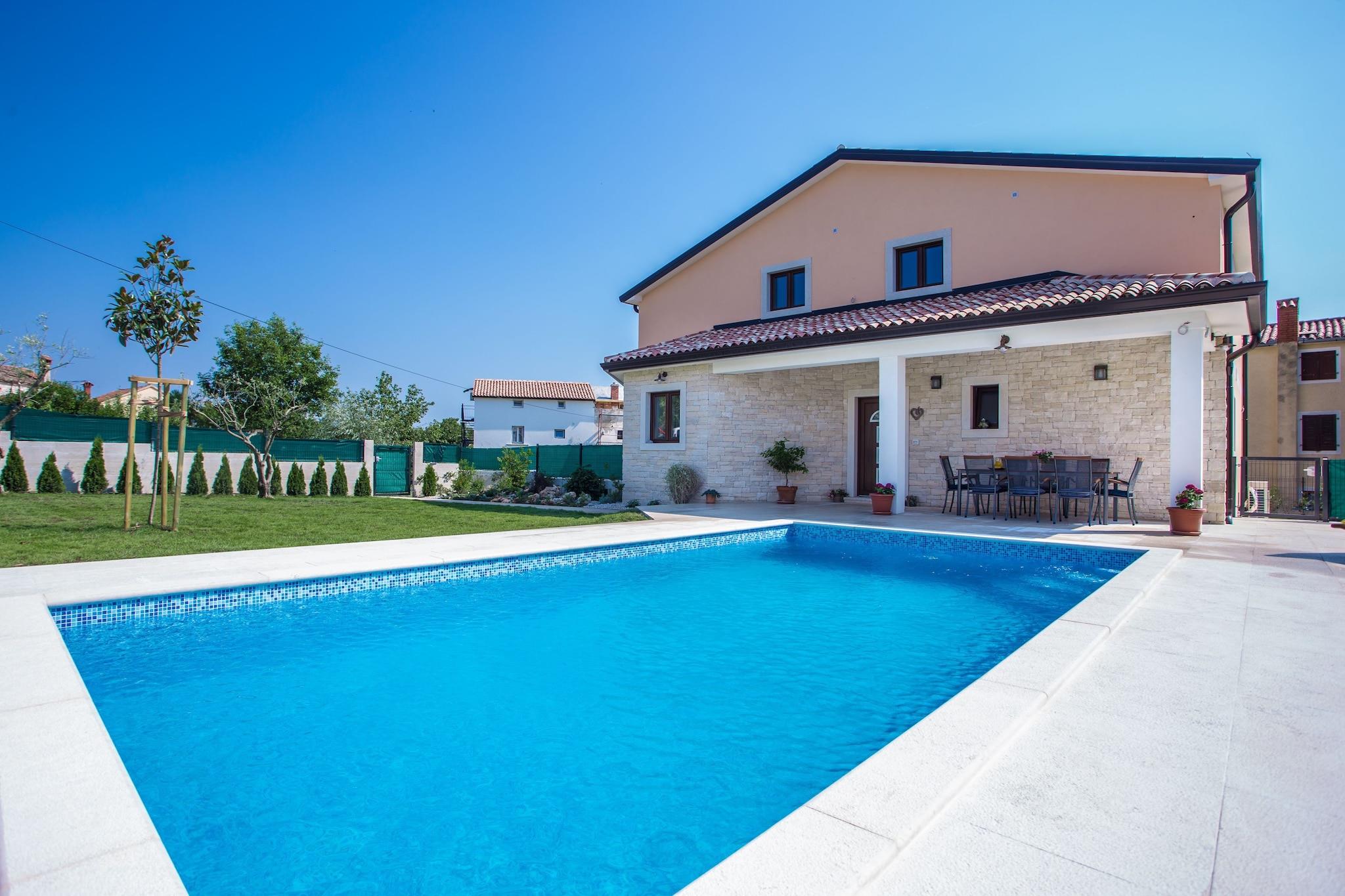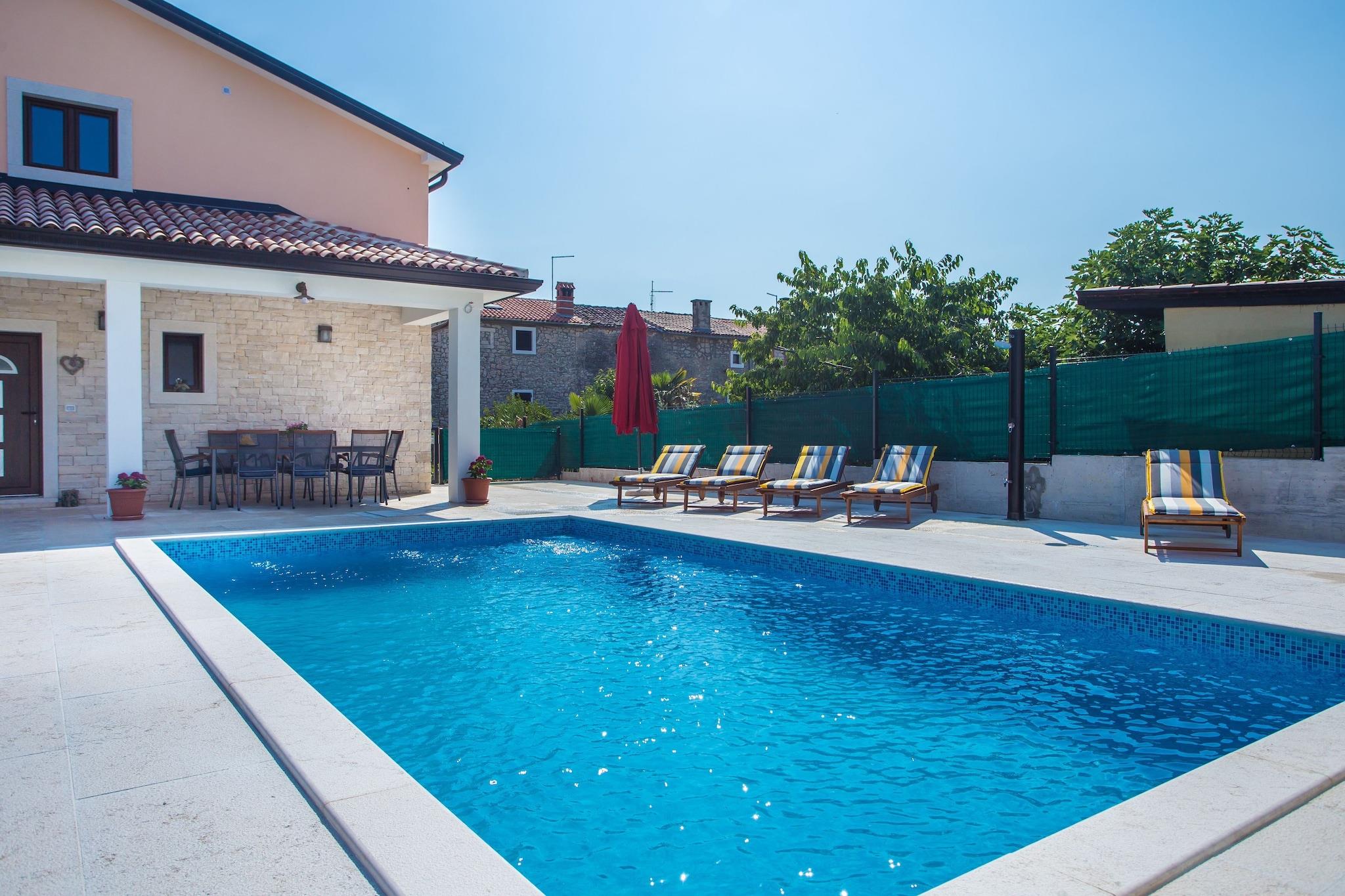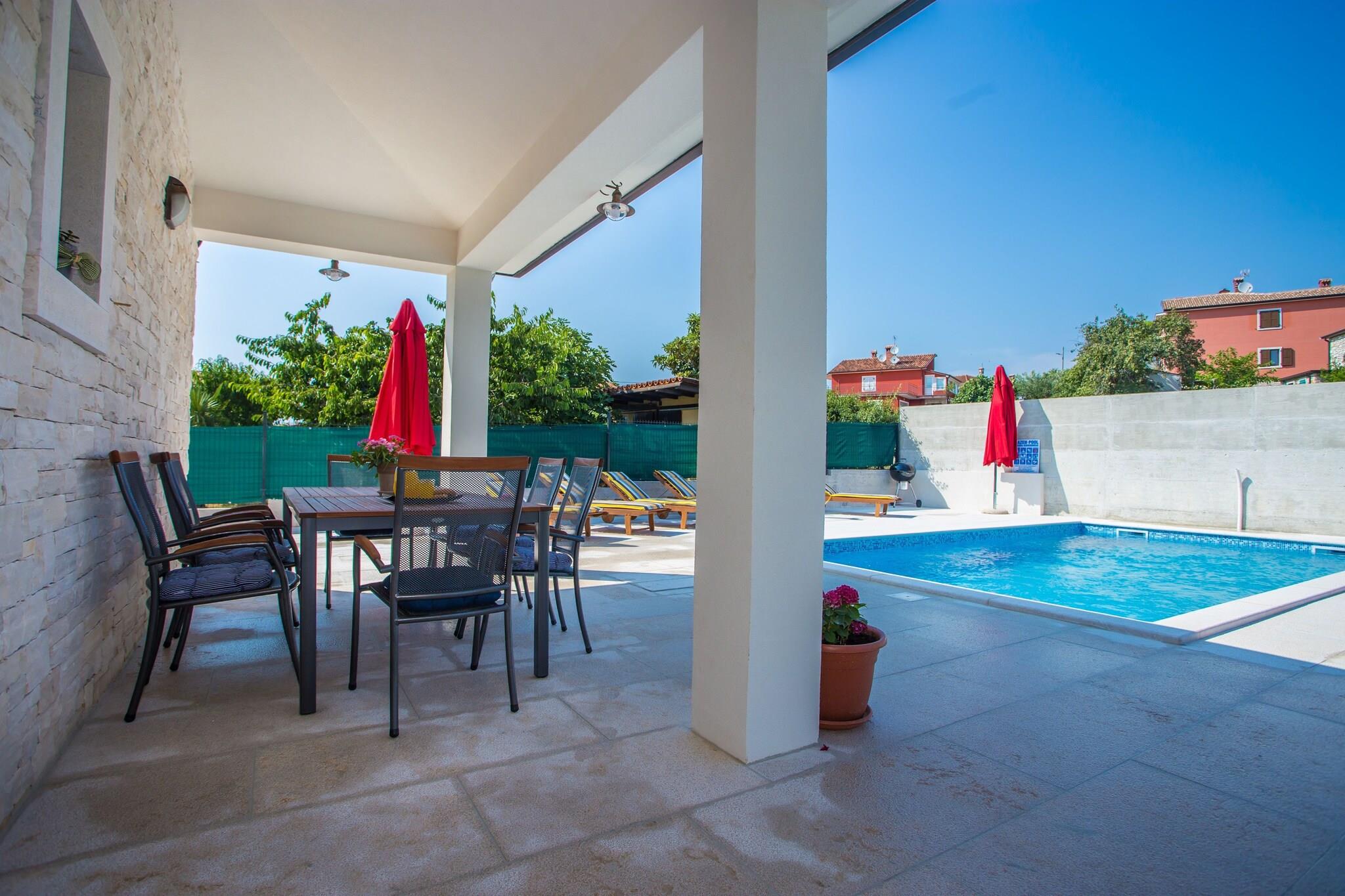 Stueetage: (Køkken(spisebord, kaffemaskine, ovn, mikrobølgeovn, opvaskemaskine , køle-fryseskab, vaskemaskine), stue / spisestue(enkeltsovesofa, Fjernsyn(parabol), sofahjørne), soveværelse(dobbeltseng), soveværelse(2x enkeltseng), soveværelse(enkeltseng, feltseng), badeværelse(badekar), badeværelse(bruser)) varme, klimaanlæg, terrasse, have(privat), havemøbler, grill, parkering, swimmingpool(privat)