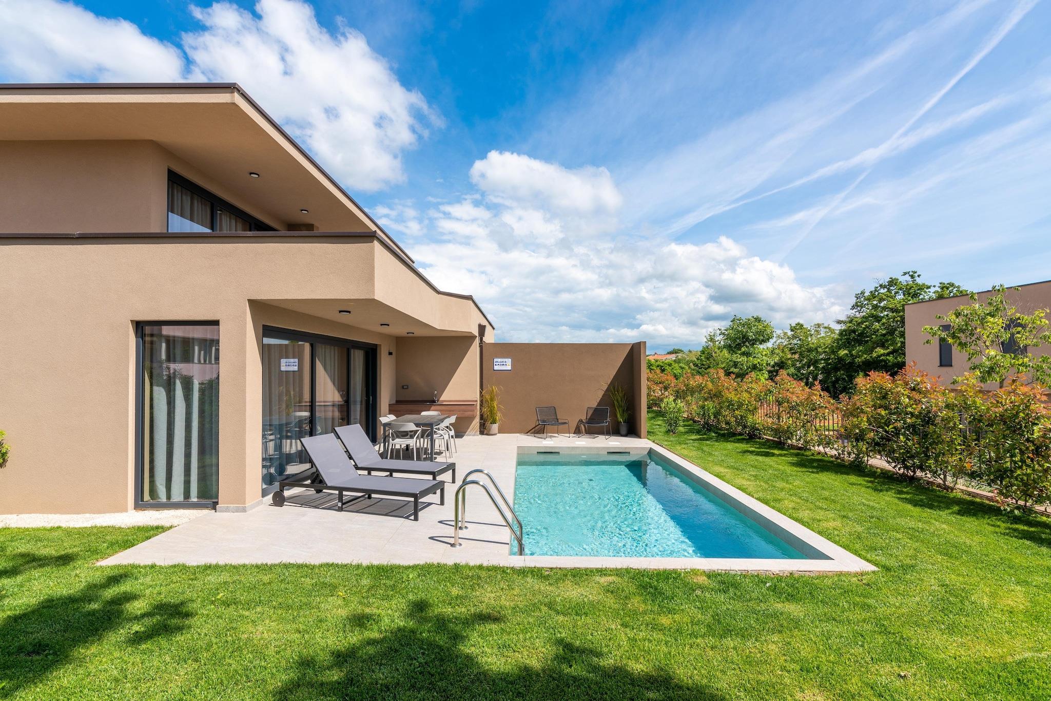 Stueetage: (Stue(enkeltsovesofa, Fjernsyn(fladskærm, parabol), sofahjørne), Køkken(spisebord, elkedel, brødrister, komfur, kaffemaskine, ovn, mikrobølgeovn, opvaskemaskine , køle-fryseskab, , Wine glasses), Soveværelse med badeværelse(dobbeltseng, bruser, håndvask, toilet, vaskemaskine, klimaanlæg), Soveværelse med badeværelse(dobbeltseng, bruser, håndvask, toilet, klimaanlæg), terrasse(privat)) klimaanlæg, have(privat), havemøbler, solstole, parkering, swimmingpool(privat), loungemøbler
