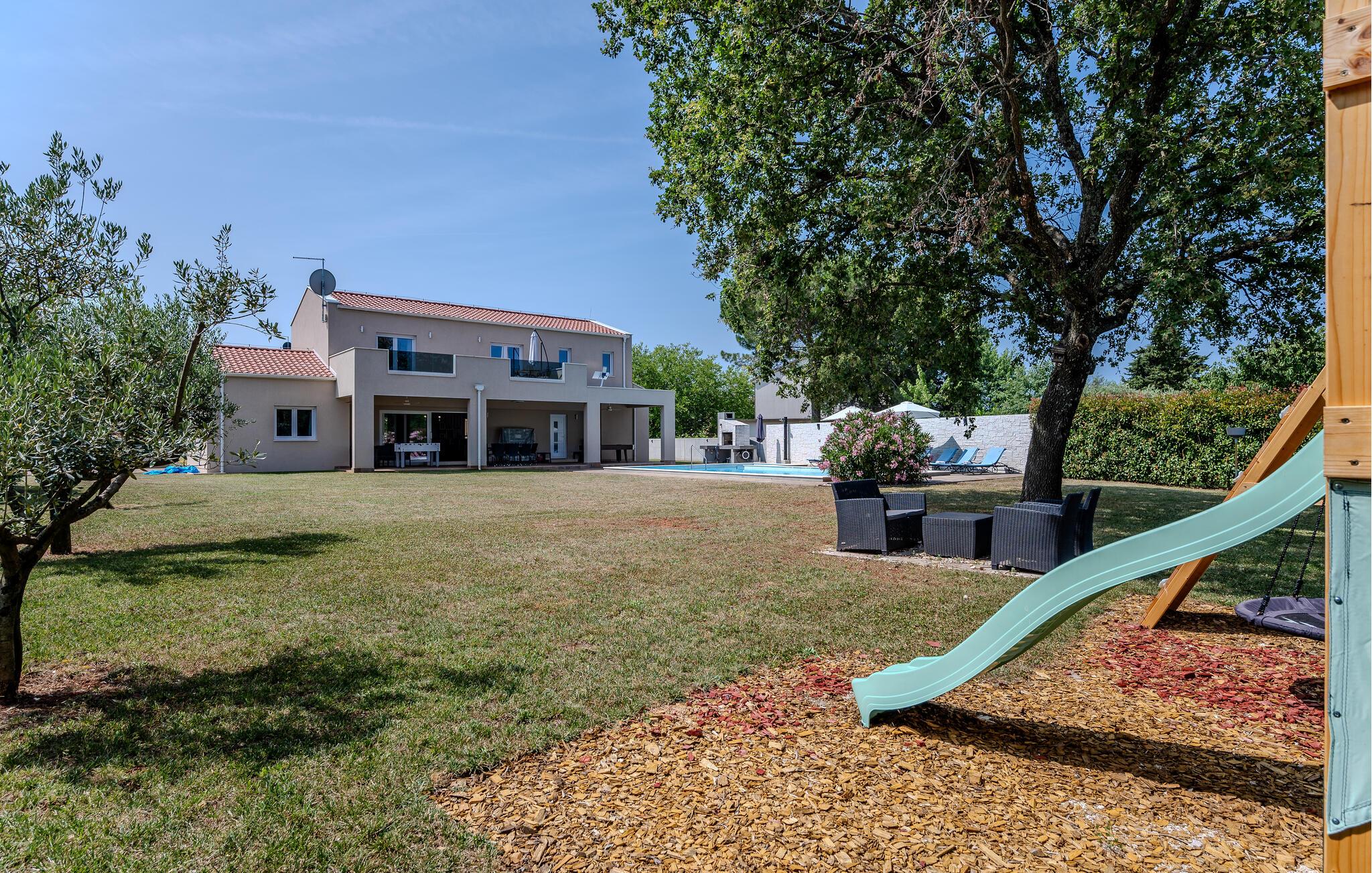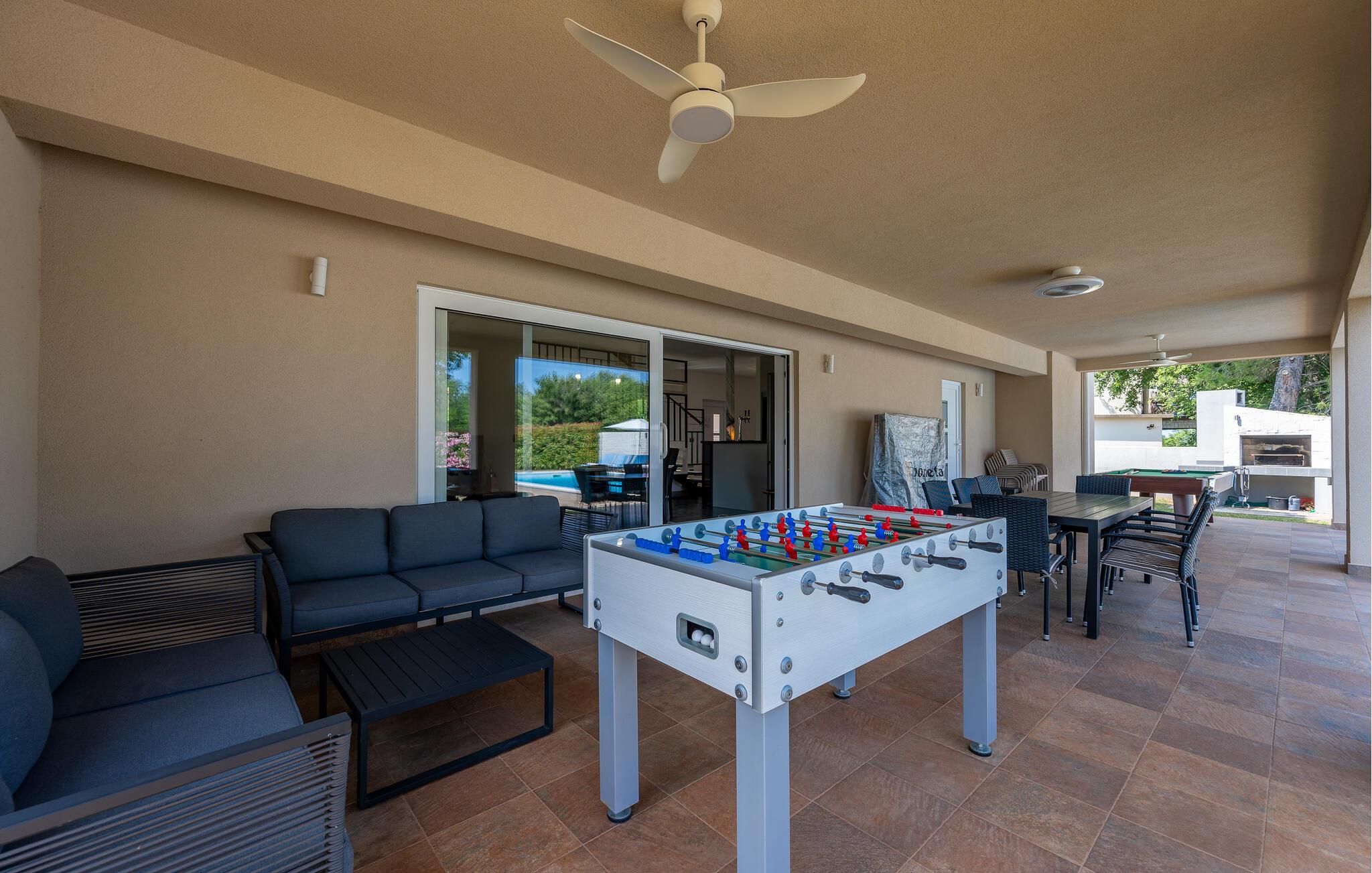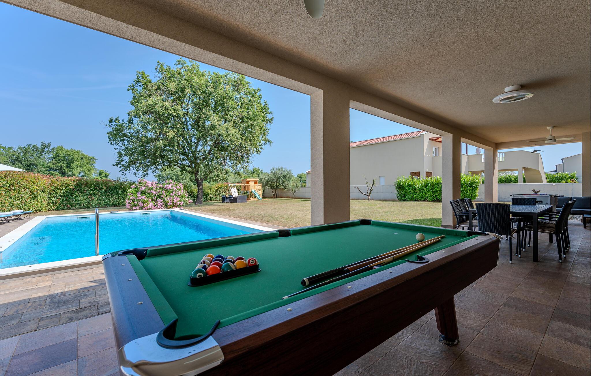 Den indhegnede grund tilbyder dejlige legemuligheder for børnene – udfordr jer selv ved bordfodbold, bordtennis eller billard, og snup en frisk dukkert i poolen, når I har lyst. Snak over et glas vin i skyggen af træerne, bolt jer med jeres hund på græsplænen, og nyd jeres tid sammen med sommermåltider på terrassen.