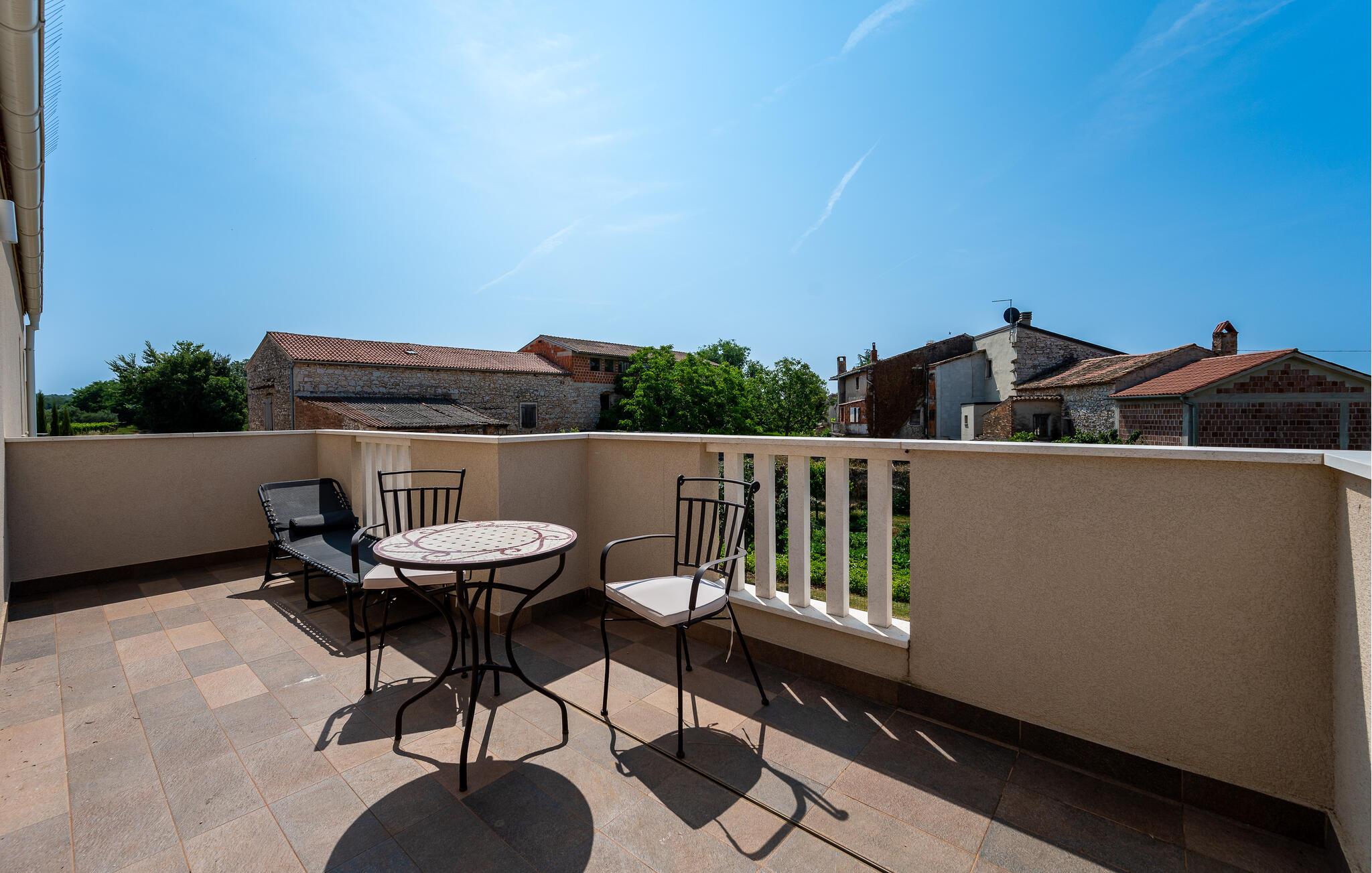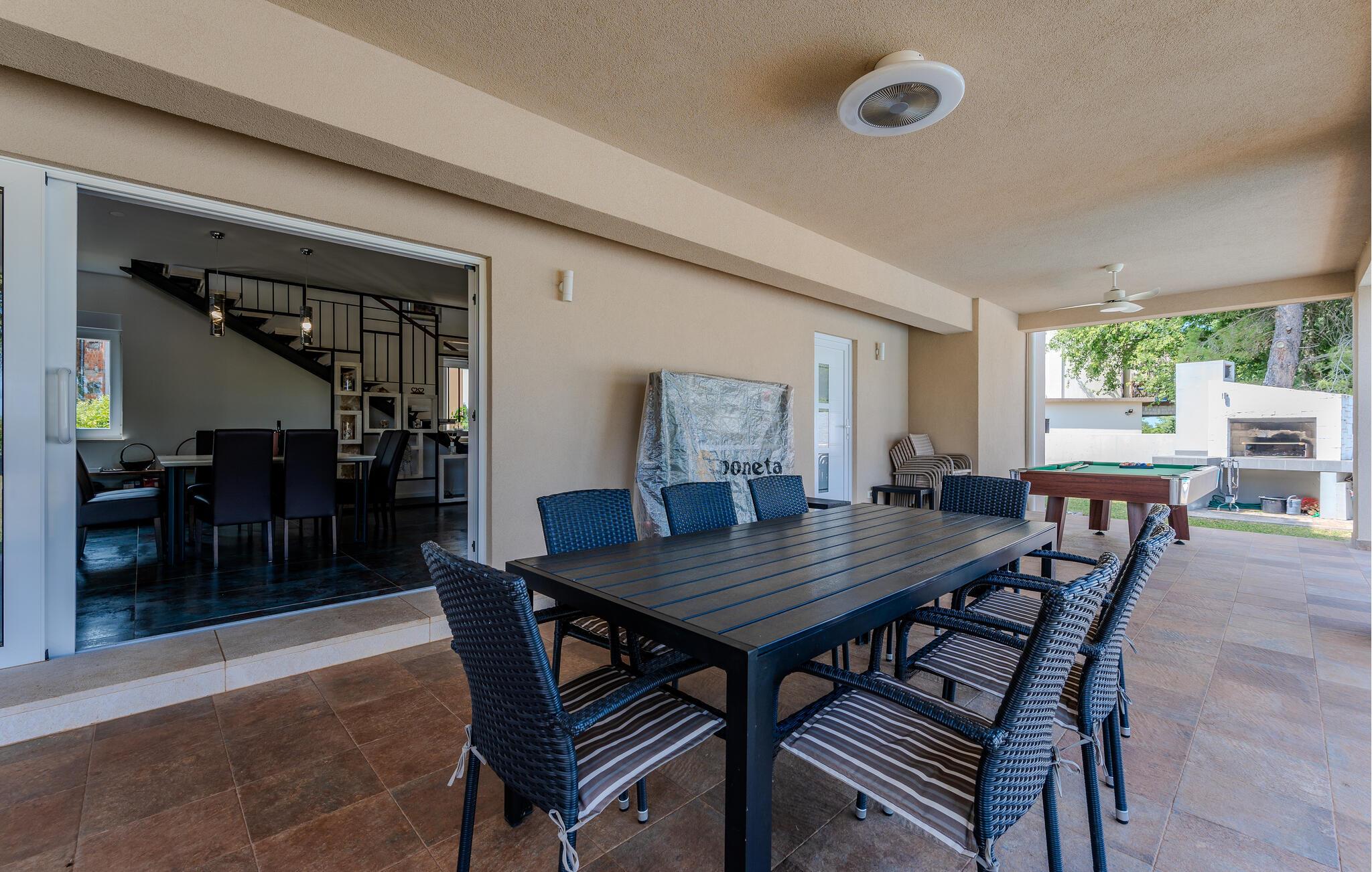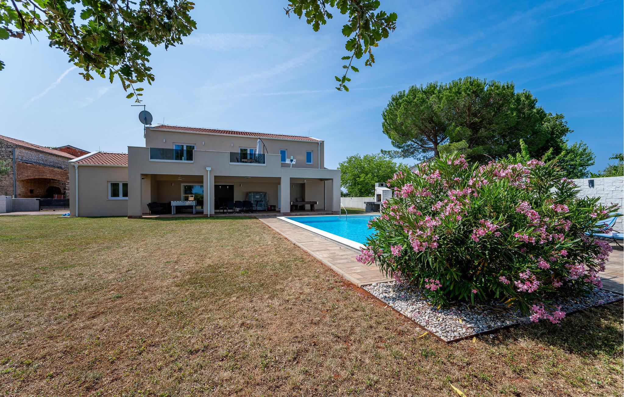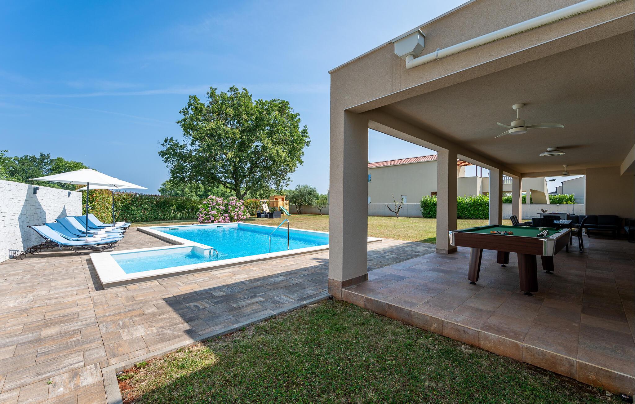 Den indhegnede grund tilbyder dejlige legemuligheder for børnene – udfordr jer selv ved bordfodbold, bordtennis eller billard, og snup en frisk dukkert i poolen, når I har lyst. Snak over et glas vin i skyggen af træerne, bolt jer med jeres hund på græsplænen, og nyd jeres tid sammen med sommermåltider på terrassen.