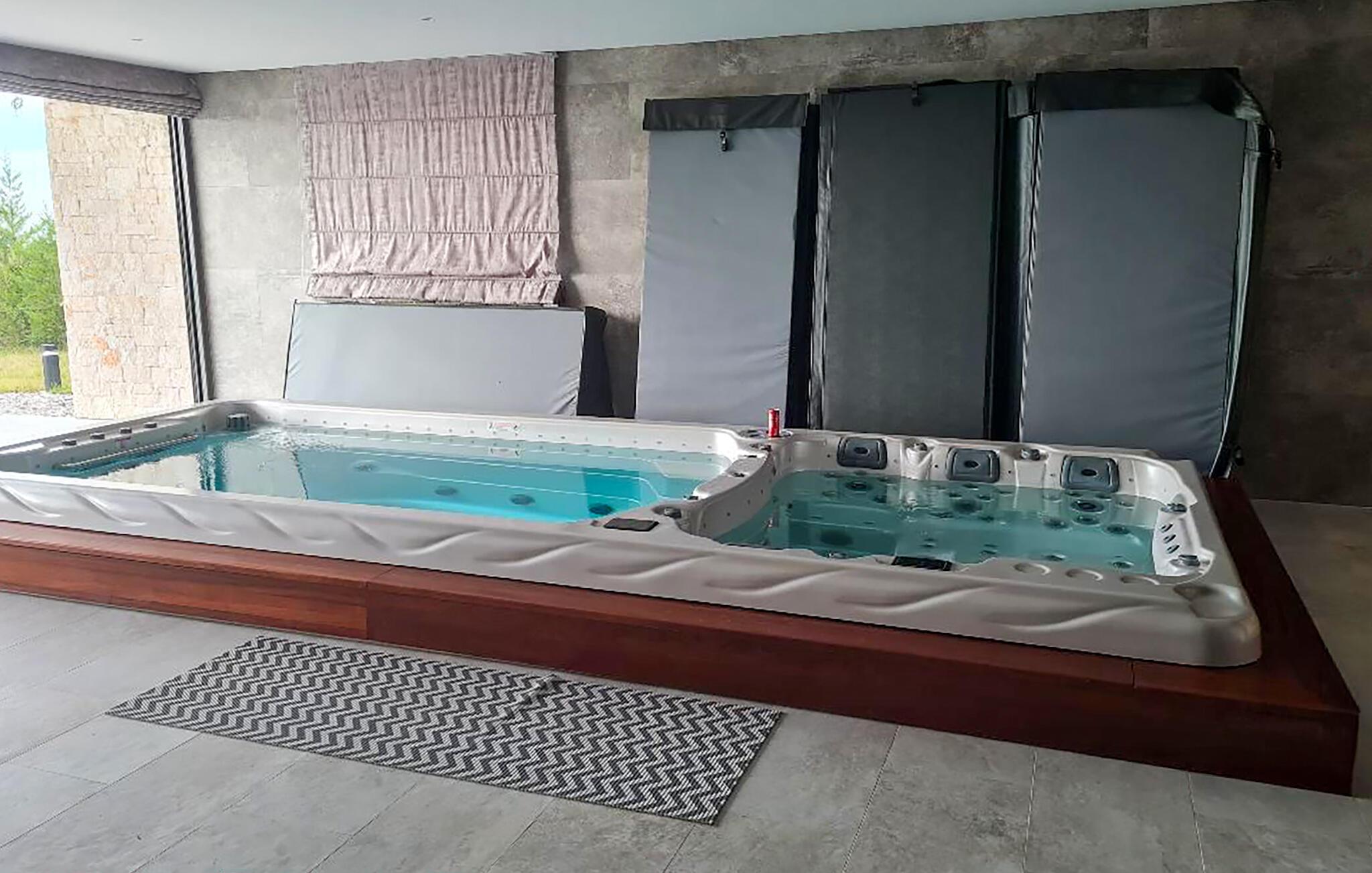Lad de komfortable og eksklusive møbler i dette moderne feriehus invitere jer til en afslappende ferie. Skab kulinariske lækkerier og nyd stilfulde måltider ved det indbydende spisebord. Forkæl jer selv med afslappende øjeblikke i spabadet og saunaen, hold jer i form på træningsudstyret, og snak over et glas vin i den hyggelige stue om aftenen.