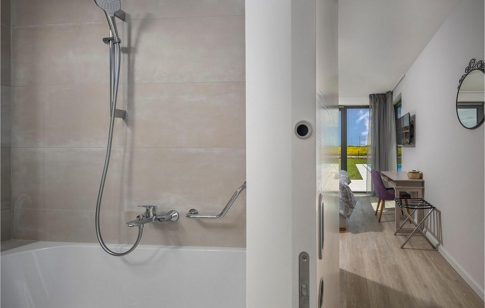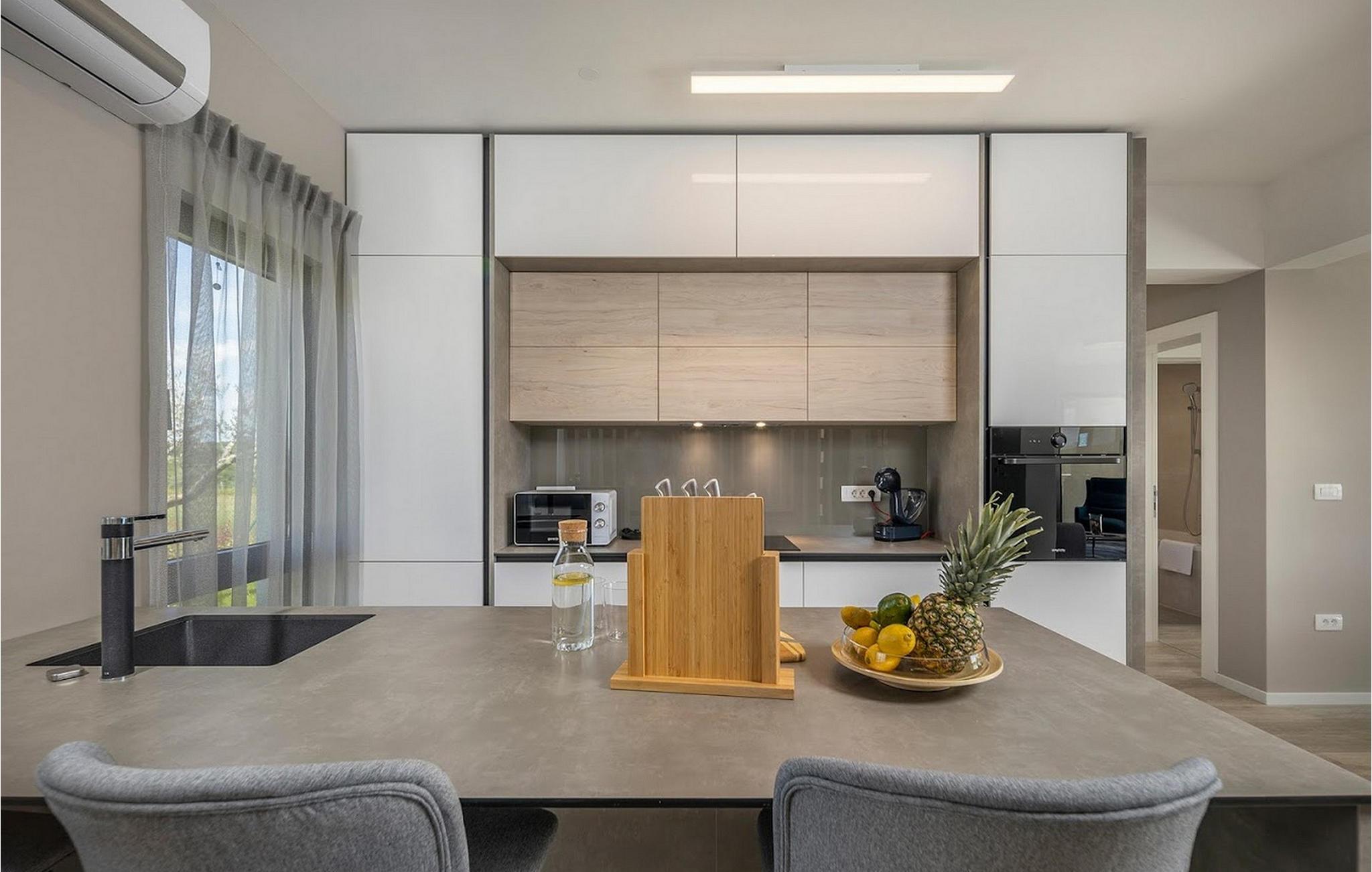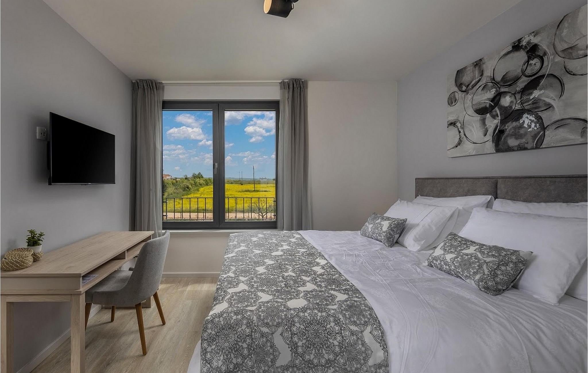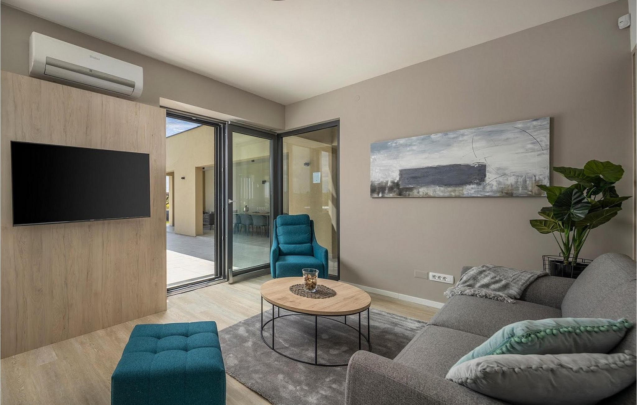 Den smukke, moderne Villa Estate ligger i en lille landsby Brtonigla i den nordvestlige del af Istrien-halvøen. Omgivet af uspoleret natur er denne villa en sand oase af ro, der vil gøre din ferie til en fornøjelse. Villaen har plads til i alt 10 personer og har 4 soveværelser med eget bad. Der er 3 soveværelser på øverste etage af villaen og endnu et soveværelse i stueetagen. Derudover er der på villaens første sal to terrasser, hvor du kan nyde smukke og afslappende stunder. I villaens stueetage er der et moderne køkken, en spisestue og en rummelig stue. På villaens rummelige terrasse er der en skøn opvarmet pool på 40m2 og en dybde på 1,35 m. Omkring poolen er der 6 liggestole, hvor man kan nyde sommersolen. I villaens gårdhave er der desuden sommerkøkken samt udendørs bord og grill. I villaens gårdhave finder du en legeplads med trampolin og cykler, og villaen har også yderligere faciliteter såsom jacuzzi, dart eller badminton. To parkeringspladser er tilgængelige i villaens gårdhave. Villa Estate er en del af et større kompleks af tre villaer. Den udlejes som en separat villa, men sammen med de nærliggende søstervillaer Primavera og La Reina Brtonigla udgør den et moderne kompleks, der tilbyder overnatning til i alt 33 gæster. Villaerne ved siden af hinanden er et ideelt valg for store grupper og familier, der ønsker at nyde den perfekte ferie omgivet af uberørt natur. Alle tre villaer er meget ens i deres layout, udstyret med en smuk terrasse med pool, yderligere faciliteter såsom cykler eller jacuzzier. Villa Estate og Villa Primavera ligger ved siden af hinanden, har hver 4 værelser og er velegnet til maksimalt 10 personer, mens den større og lidt fjernere Villa La Reina Brtonigla har 5 værelser og en maksimal kapacitet på 13 personer. I Brtonigla vil du helt sikkert nyde adskillige aktiviteter i naturen eller interessante kulturelle og gastronomiske tilbud i Istrien. Gå ikke glip af at prøve nogle af Istriens specialiteter, såsom den dyre trøffel, en underjordisk vild svamp, der vokser i Motovun-skoven i det centrale Istrien. Ud over trøfler er Istrien også kendt for sine usædvanligt højkvalitets vin- og olivenolietilbud, hvilket sætter det foran europæiske mestre som Spanien og Frankrig. I Istrien vil du støde på adskillige vinmarker og vinveje, hvis landskab, naturlige skønhed og århundreder gamle vinkultur vil ikke efterlade nogen ligeglade. Forskellige festivaler dedikeret til Istriens rige eno-gastronomiske tilbud finder sted i Brtonigla i sommermånederne. Gå ikke glip af at besøge festivalen for chokolade og vin, som vil fremkalde alle gourmetnydelser, eller festivalen i Istrien Malvasia, en indfødt sort af istrisk vin. Ikke langt fra Brtonigla ligger Aquapark Istralandia, hvis vandeventyr helt sikkert vil blive nydt af de små. Lidt fjernere strande kan findes i centrum af Umag, såsom den stenede Karigador-strand eller Kanova-stranden. Forkæl dig selv med alt det magiske Istriens charme og forkæl dig selv med afslappende øjeblikke i luksusen ved Villa Estate! Poolopvarmning er tilgængelig mod et ekstra gebyr, der skal betales lokalt. Kæledyr er tilladt på denne ejendom efter ejerens skøn og mod et gebyr. Bemærk venligst, at denne ejendom kun accepterer ungdomsgrupper eller polterabender mod betaling af et refunderbart depositum. En ungdomsgruppe i denne ejendom består af personer under 30 år. Er I en ungdomsgruppe eller polterabend, vil I blive bedt om at betale depositum ved ankomst. Ethvert beløb, der kræves for at reparere eventuelle skader på boligen forårsaget af dig under dit ophold, vil blive trukket fra depositumet og derefter returneret til dig.