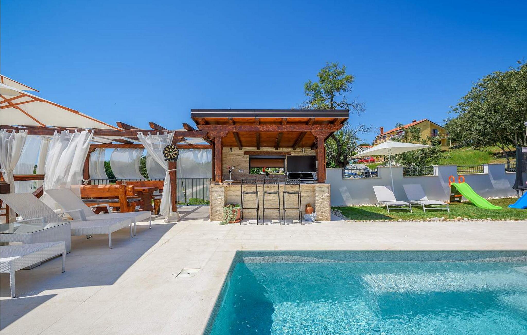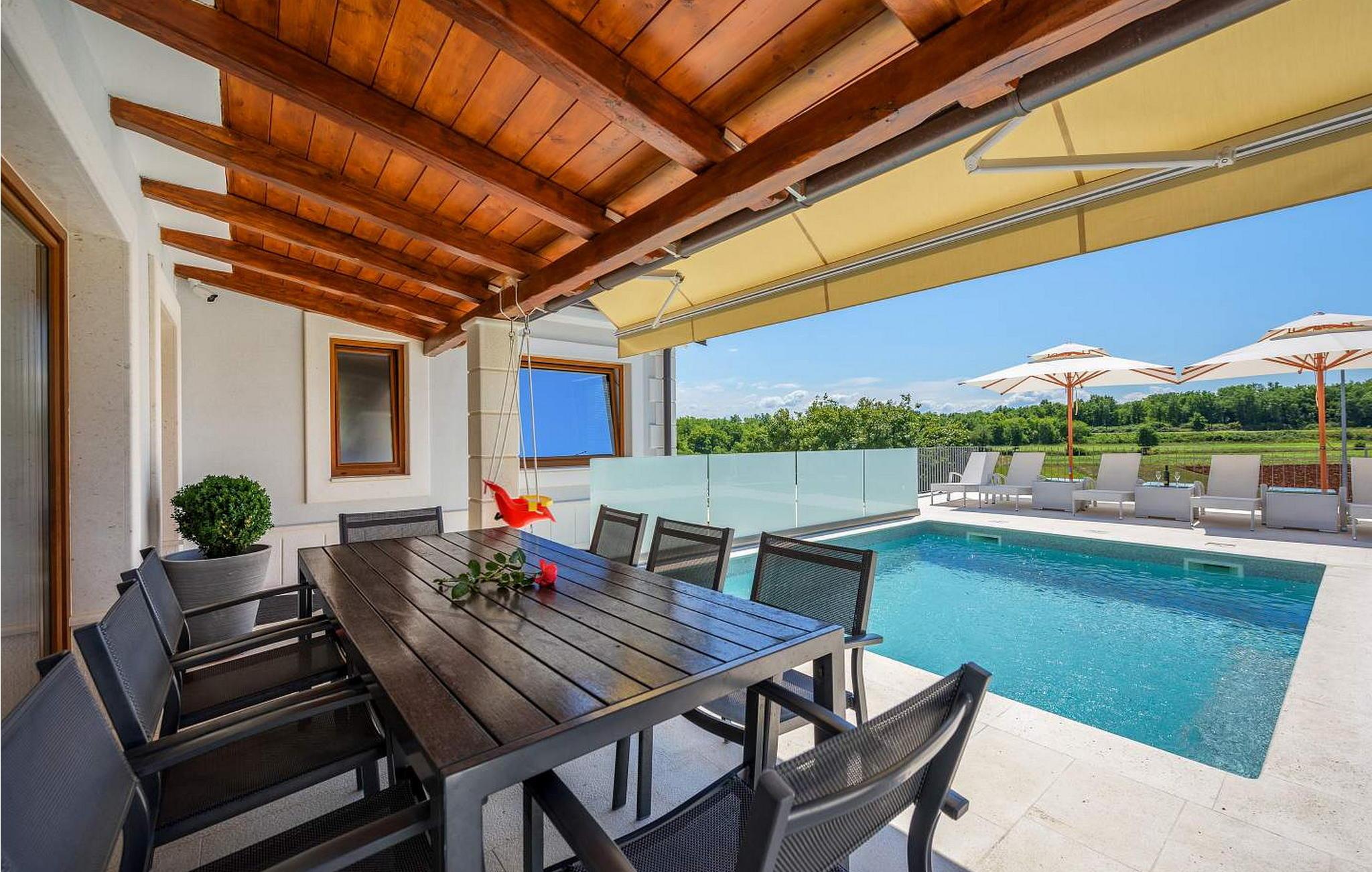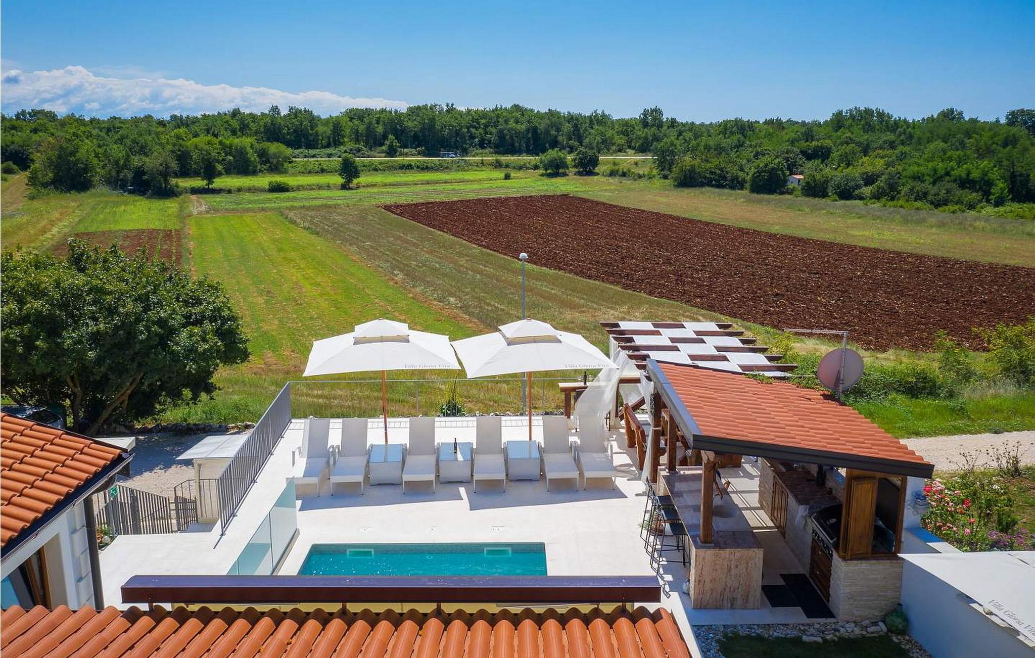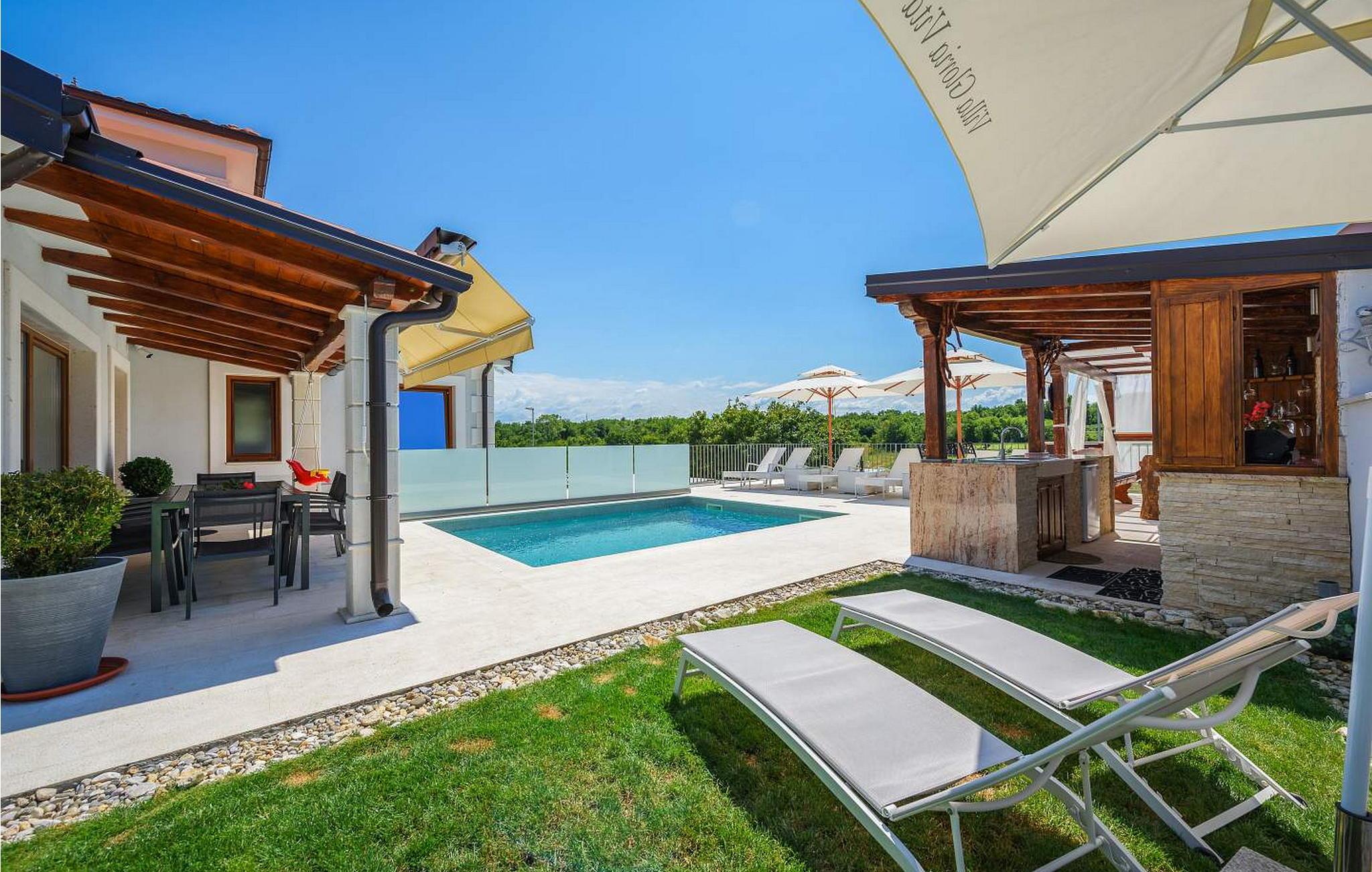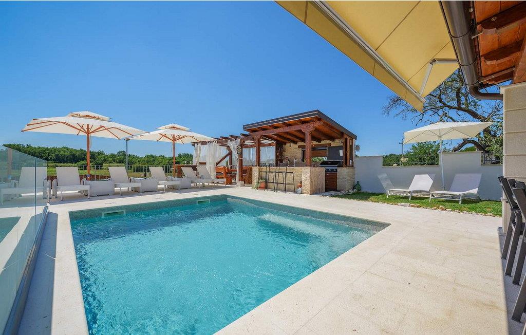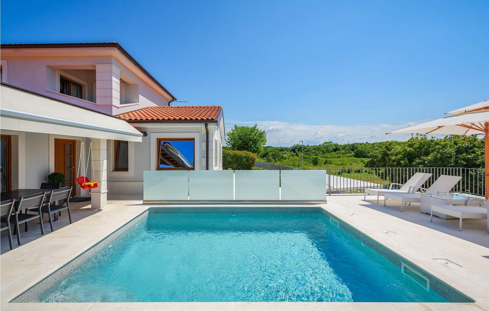 Villa Gloria Vita er et smukt, moderne feriehus i de rolige landlige omgivelser i Nova Vas, kun 8 km fra Novigrad og den nærmeste strand. Dette fredelige oase tilbyder nem adgang til lokale taverner, vinkældre og det nærliggende vandland Istralandia. Villaen er beliggende på indhegnet grund med en indbydende udendørs pool, et sommerkøkken med gasgrill og en udendørs bar. De overdækkede terrasser er perfekte til at nyde udendørs spisning, mens der inde i villaen er et spabad til ultimativ afslapning. Stueetagen af villaen er fordelt på tre niveauer og indeholder en hyggelig stue med et fuldt udstyret køkken, en spiseplads og en sovesofa, samt to komfortable soveværelser, begge med private badeværelser. Første sal rummer et privat soveværelse med balkon og eget badeværelse, hvilket giver et fredeligt tilflugtssted. Under soldækket byder kælderen på en airconditioneret opholdsstue med et stort spisebord, et køkken med vin- og ølhaner, en sofa, et fjernsyn og et ekstra soveværelse med bad/toilet. Bemærk venligst, at denne ejendom ikke accepterer ungdomsgrupper eller polterabender. En ungdomsgruppe på denne ejendom består af personer på 26 år eller derunder.