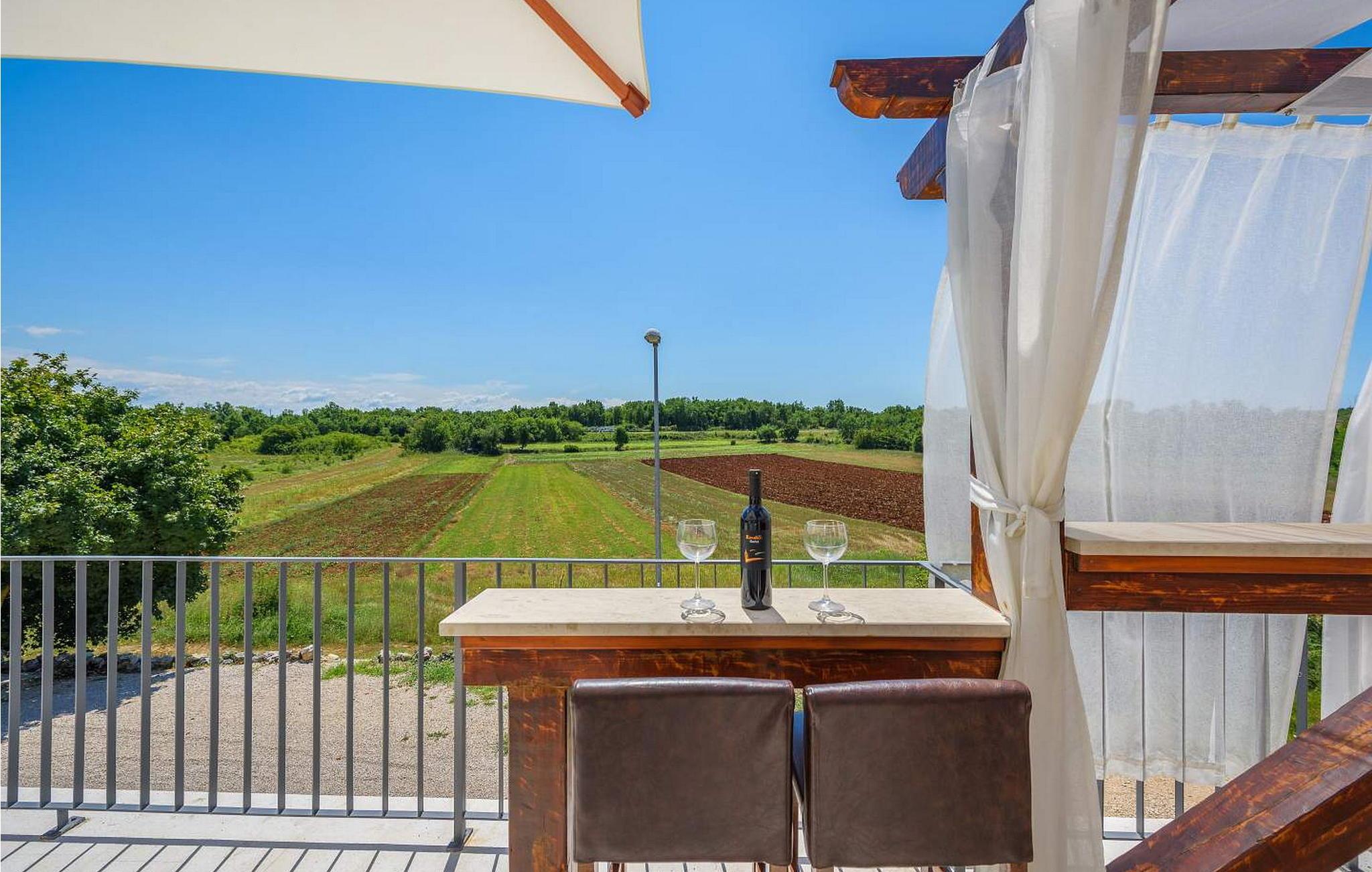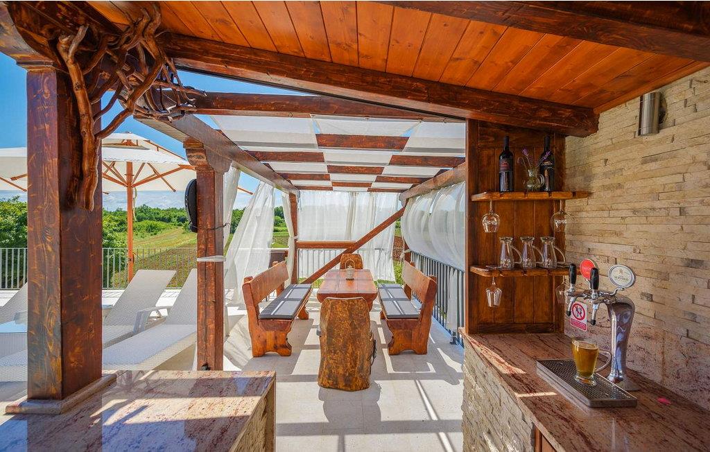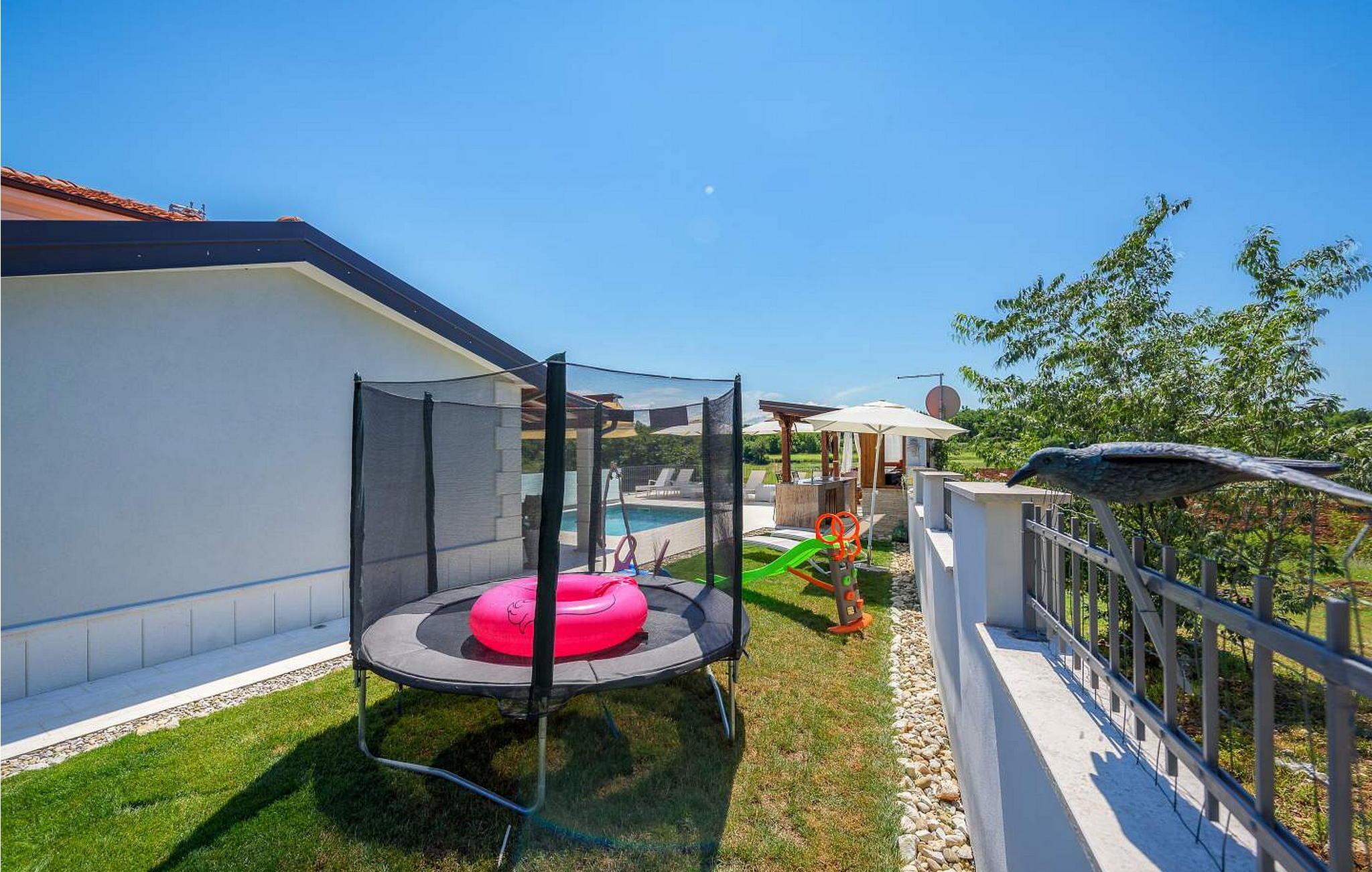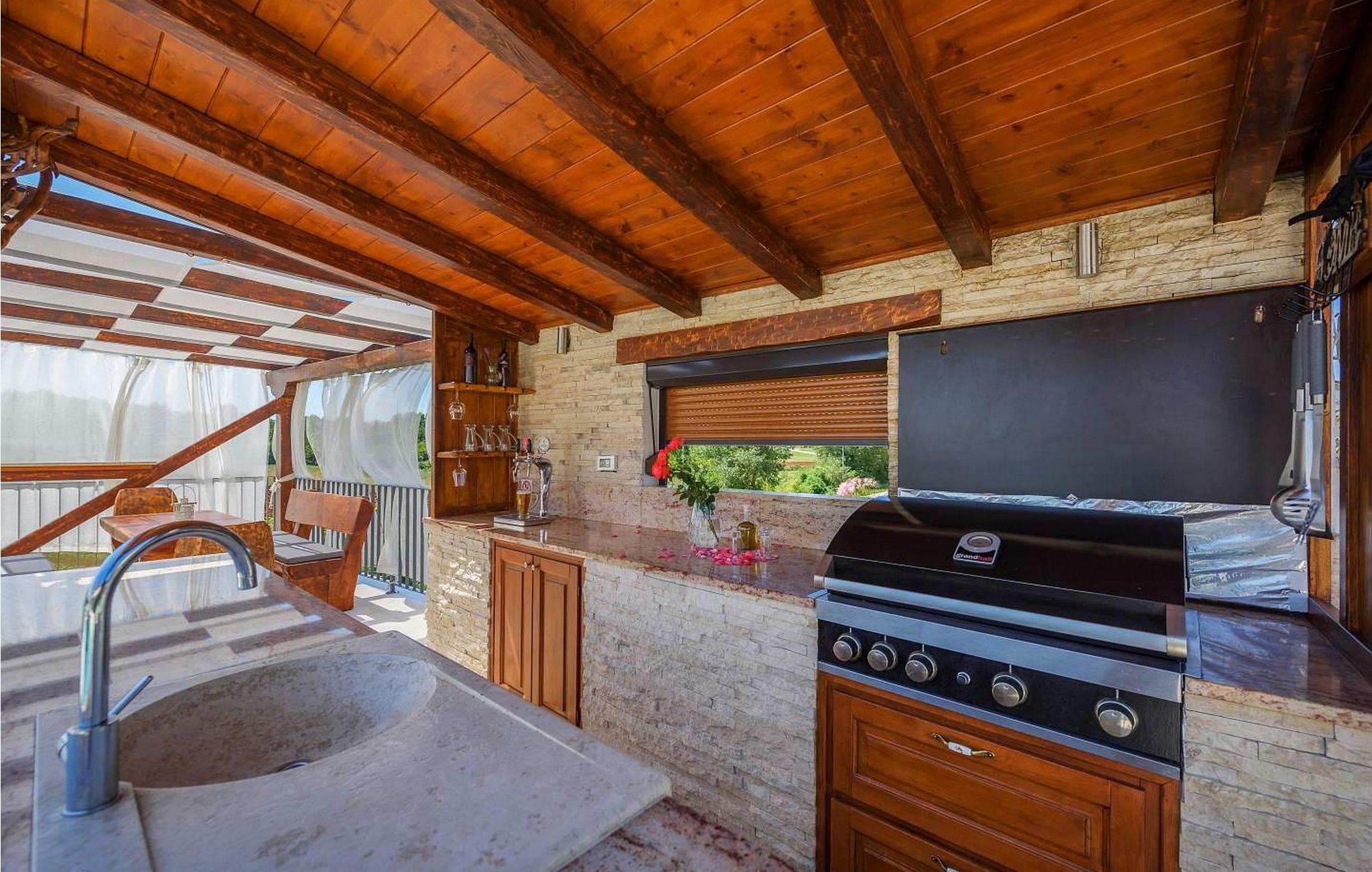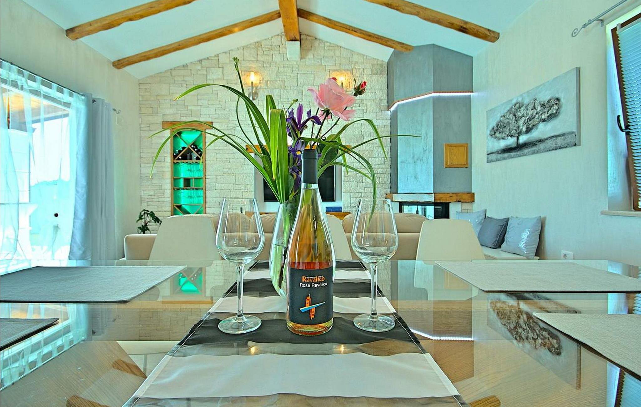 Villa Gloria Vita er et smukt, moderne feriehus i de rolige landlige omgivelser i Nova Vas, kun 8 km fra Novigrad og den nærmeste strand. Dette fredelige oase tilbyder nem adgang til lokale taverner, vinkældre og det nærliggende vandland Istralandia. Villaen er beliggende på indhegnet grund med en indbydende udendørs pool, et sommerkøkken med gasgrill og en udendørs bar. De overdækkede terrasser er perfekte til at nyde udendørs spisning, mens der inde i villaen er et spabad til ultimativ afslapning. Stueetagen af villaen er fordelt på tre niveauer og indeholder en hyggelig stue med et fuldt udstyret køkken, en spiseplads og en sovesofa, samt to komfortable soveværelser, begge med private badeværelser. Første sal rummer et privat soveværelse med balkon og eget badeværelse, hvilket giver et fredeligt tilflugtssted. Under soldækket byder kælderen på en airconditioneret opholdsstue med et stort spisebord, et køkken med vin- og ølhaner, en sofa, et fjernsyn og et ekstra soveværelse med bad/toilet. Bemærk venligst, at denne ejendom ikke accepterer ungdomsgrupper eller polterabender. En ungdomsgruppe på denne ejendom består af personer på 26 år eller derunder.