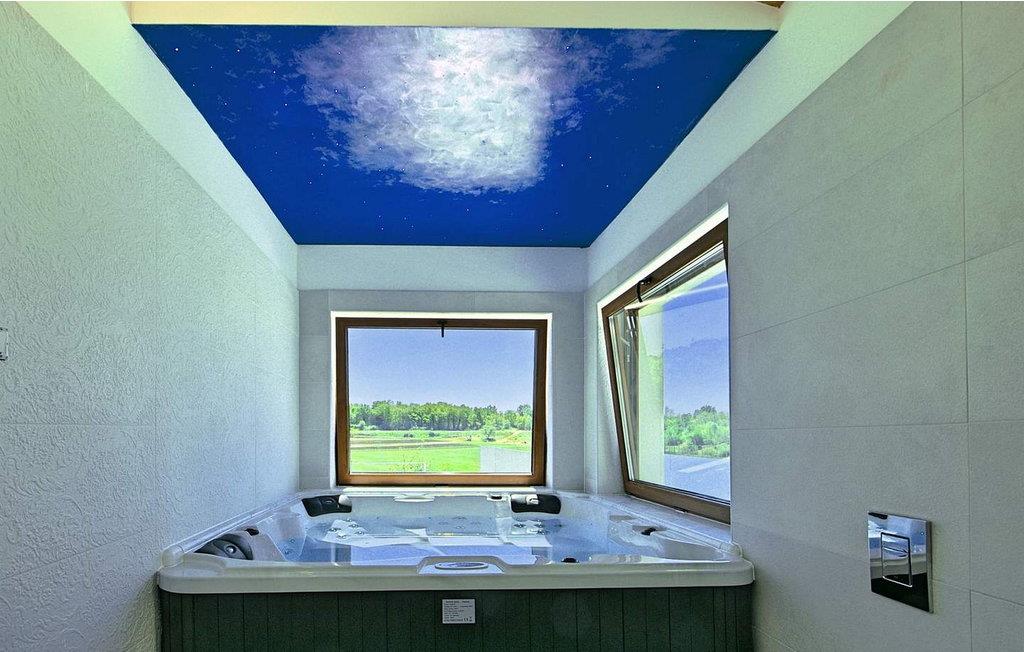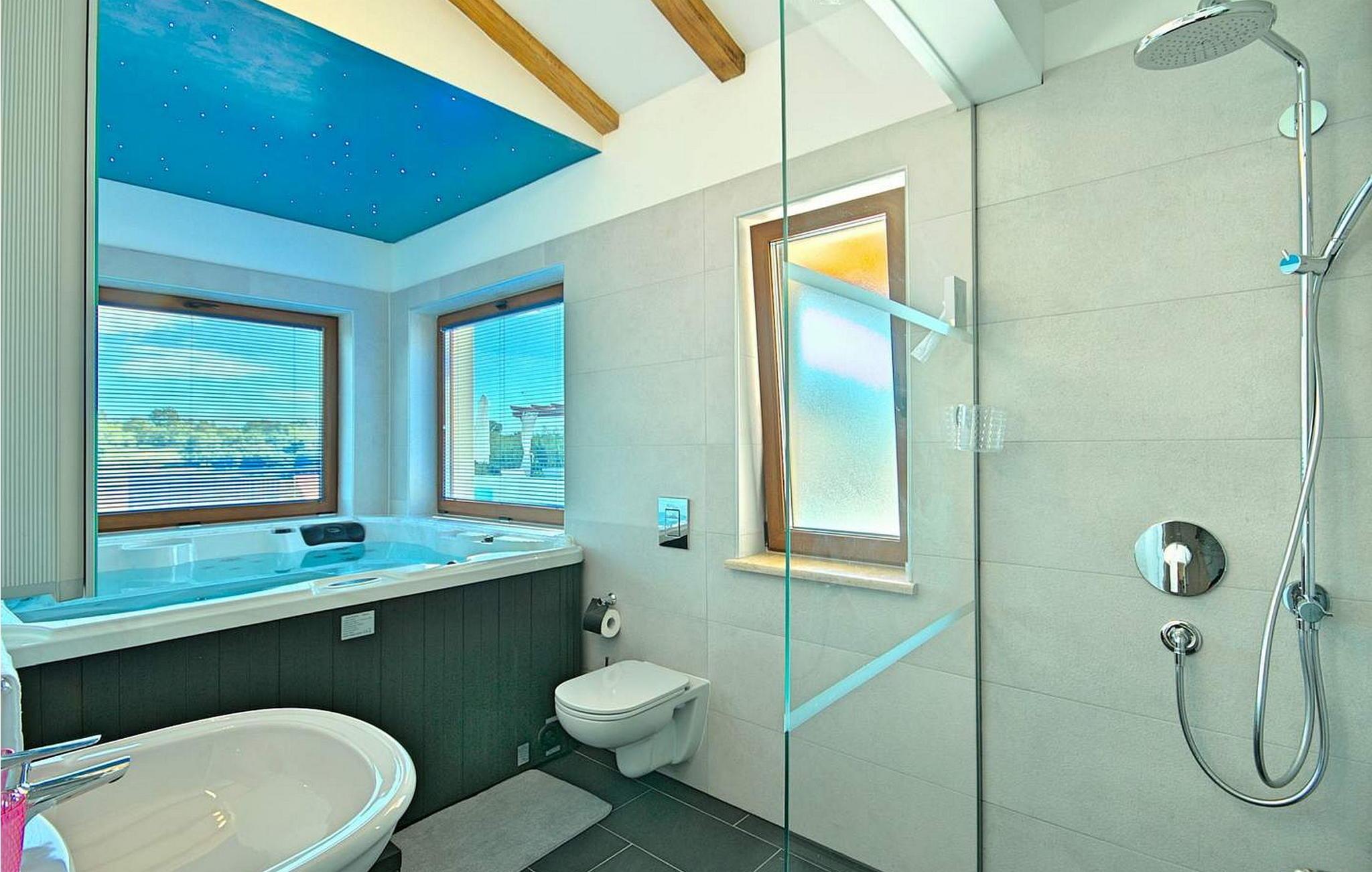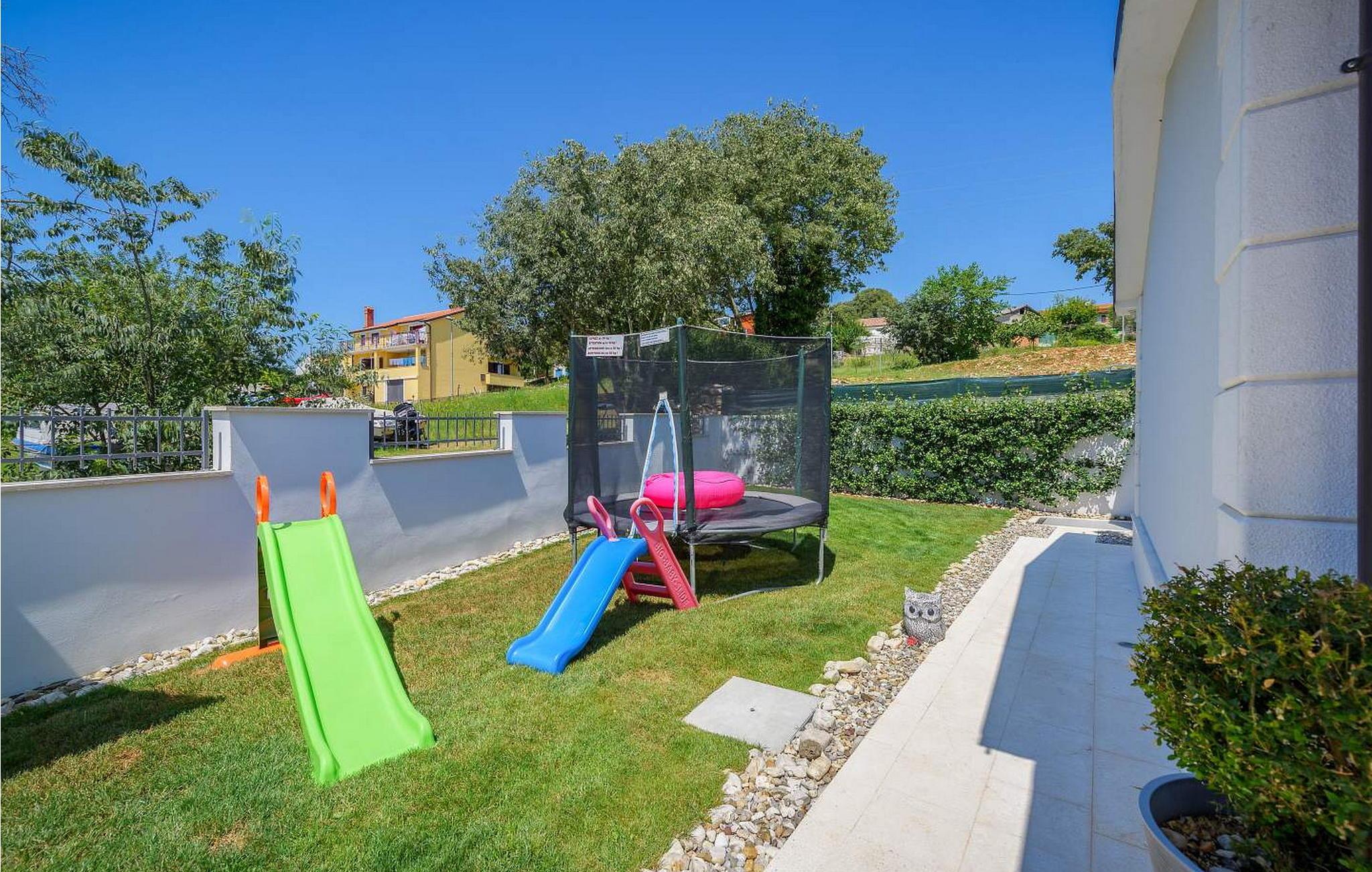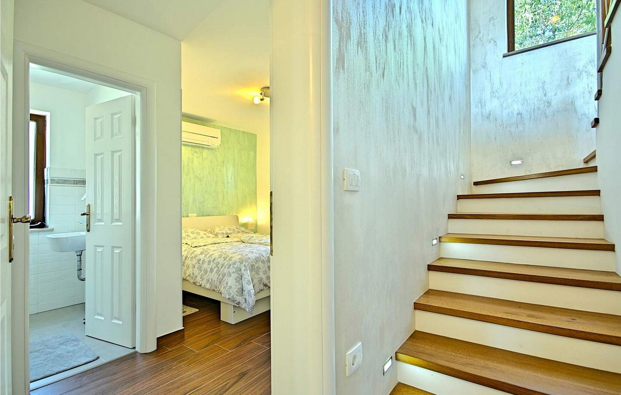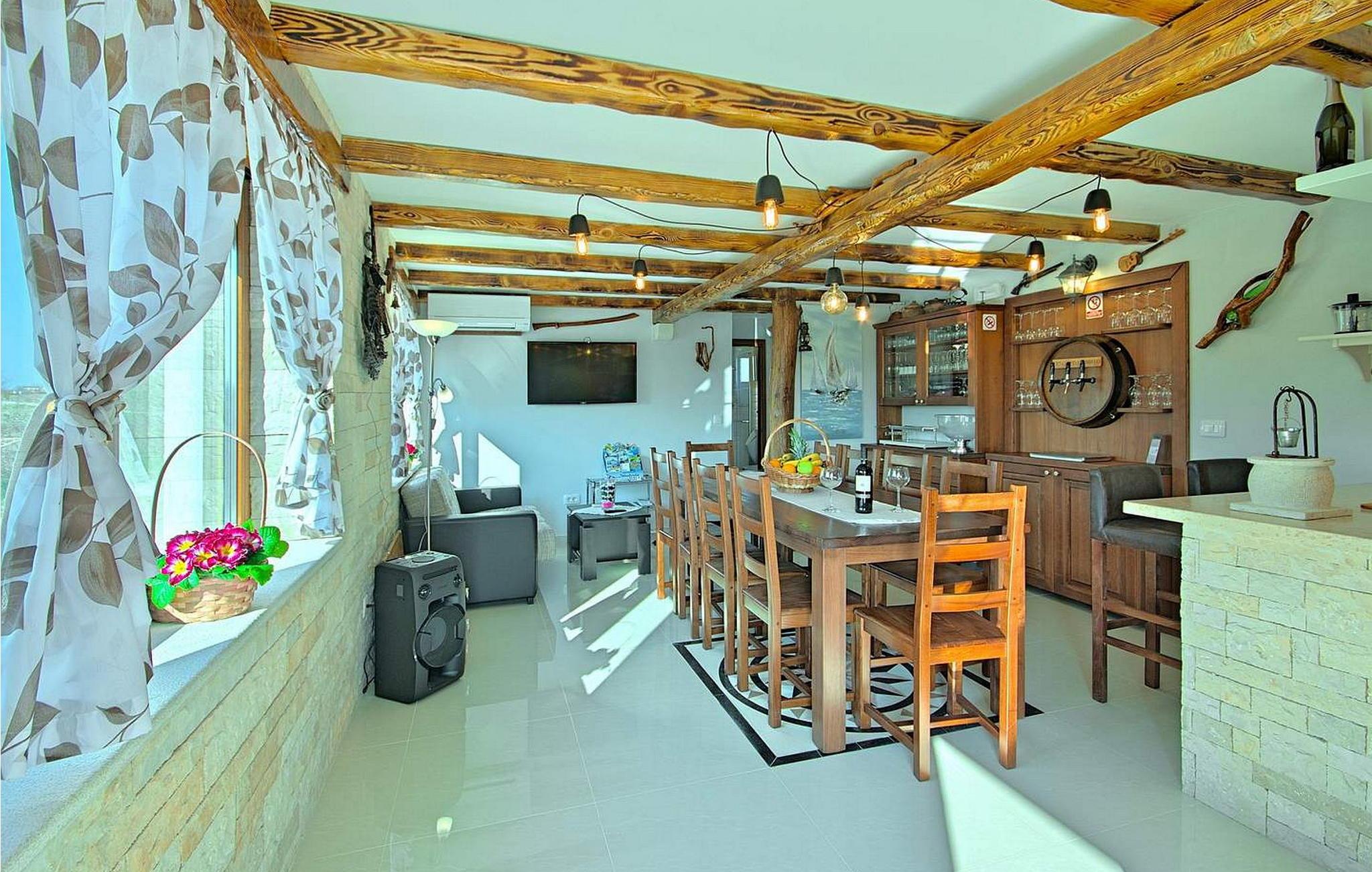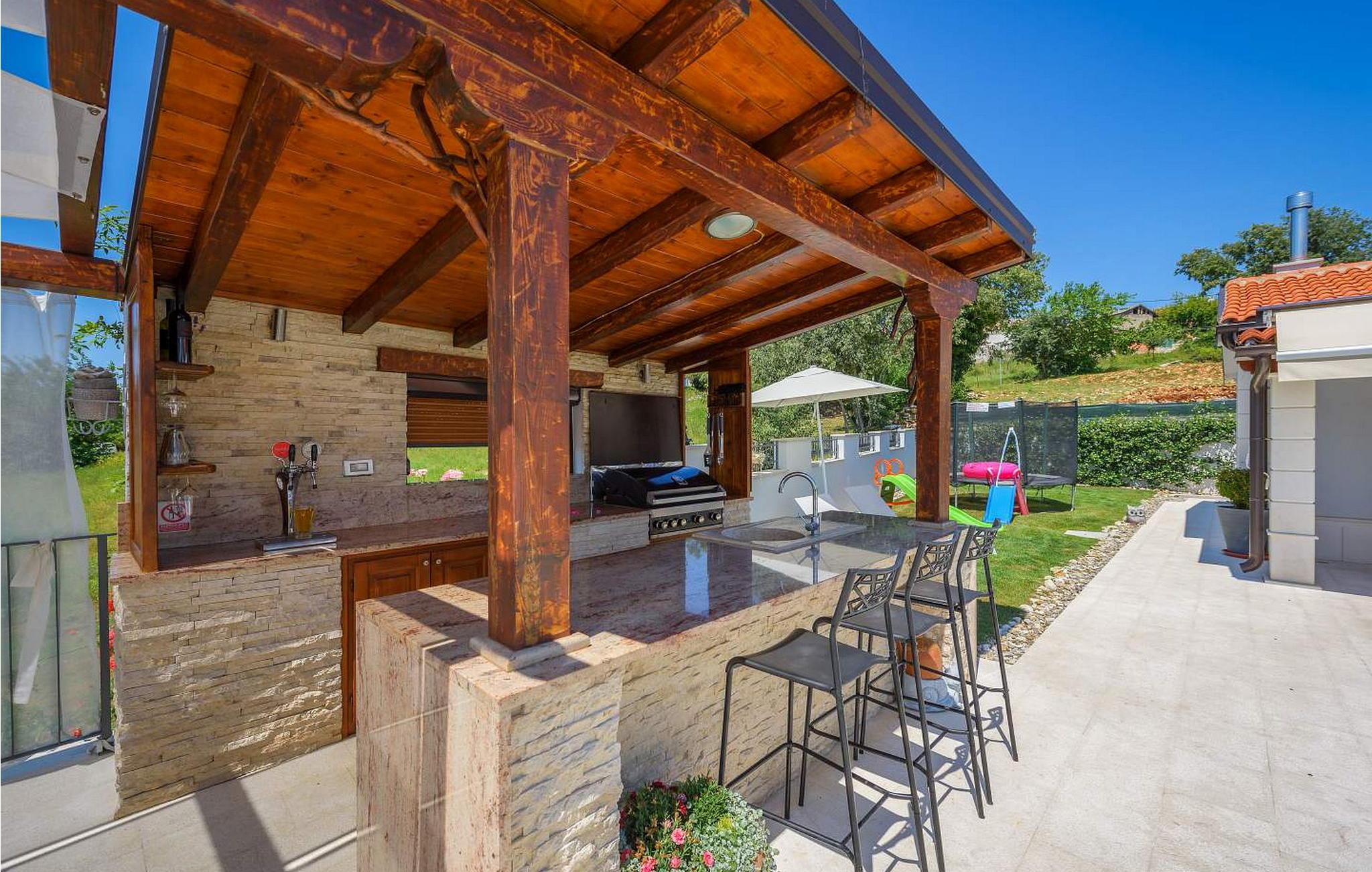 Villa Gloria Vita er et smukt, moderne feriehus i de rolige landlige omgivelser i Nova Vas, kun 8 km fra Novigrad og den nærmeste strand. Dette fredelige oase tilbyder nem adgang til lokale taverner, vinkældre og det nærliggende vandland Istralandia. Villaen er beliggende på indhegnet grund med en indbydende udendørs pool, et sommerkøkken med gasgrill og en udendørs bar. De overdækkede terrasser er perfekte til at nyde udendørs spisning, mens der inde i villaen er et spabad til ultimativ afslapning. Stueetagen af villaen er fordelt på tre niveauer og indeholder en hyggelig stue med et fuldt udstyret køkken, en spiseplads og en sovesofa, samt to komfortable soveværelser, begge med private badeværelser. Første sal rummer et privat soveværelse med balkon og eget badeværelse, hvilket giver et fredeligt tilflugtssted. Under soldækket byder kælderen på en airconditioneret opholdsstue med et stort spisebord, et køkken med vin- og ølhaner, en sofa, et fjernsyn og et ekstra soveværelse med bad/toilet. Bemærk venligst, at denne ejendom ikke accepterer ungdomsgrupper eller polterabender. En ungdomsgruppe på denne ejendom består af personer på 26 år eller derunder.