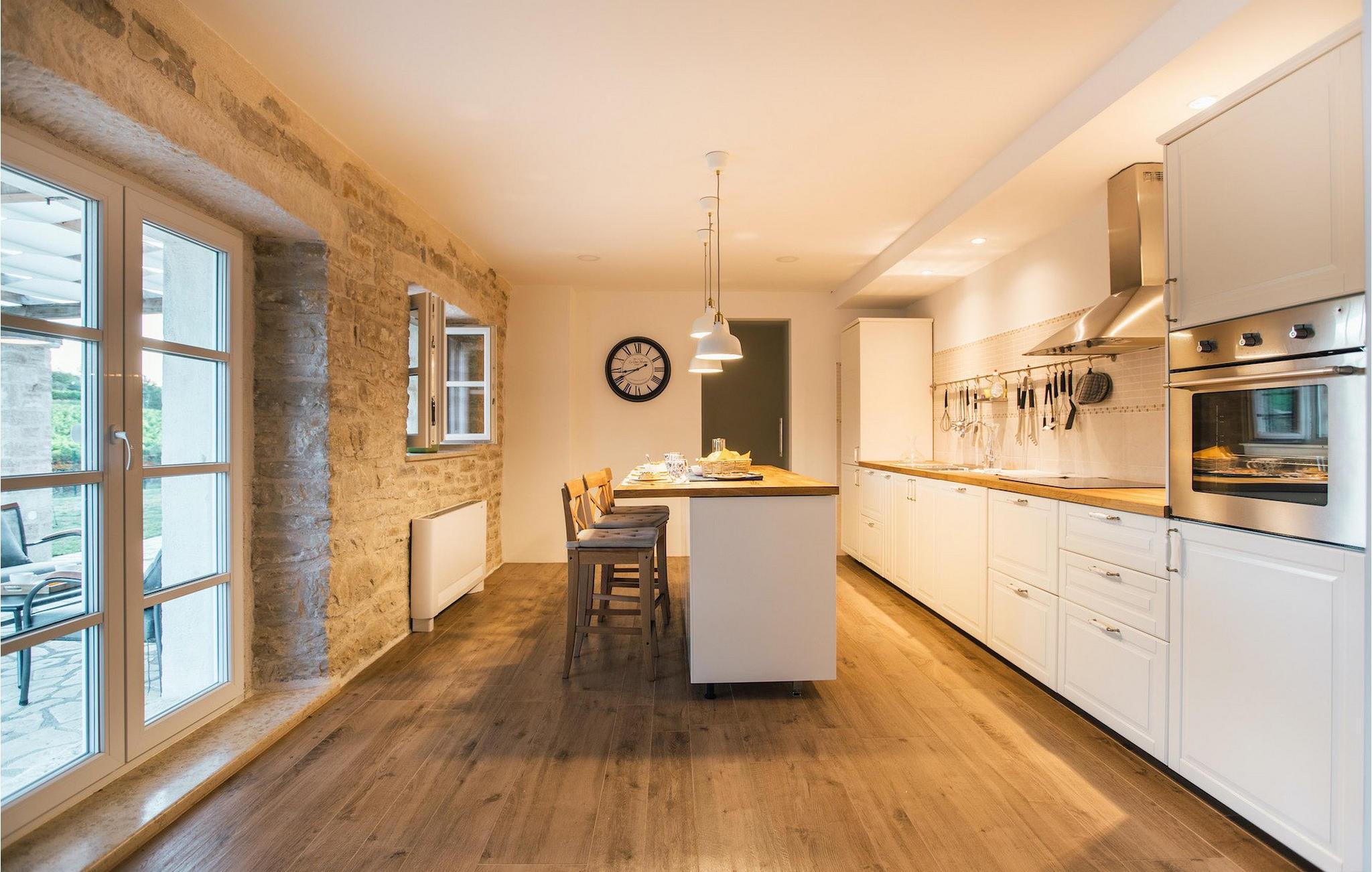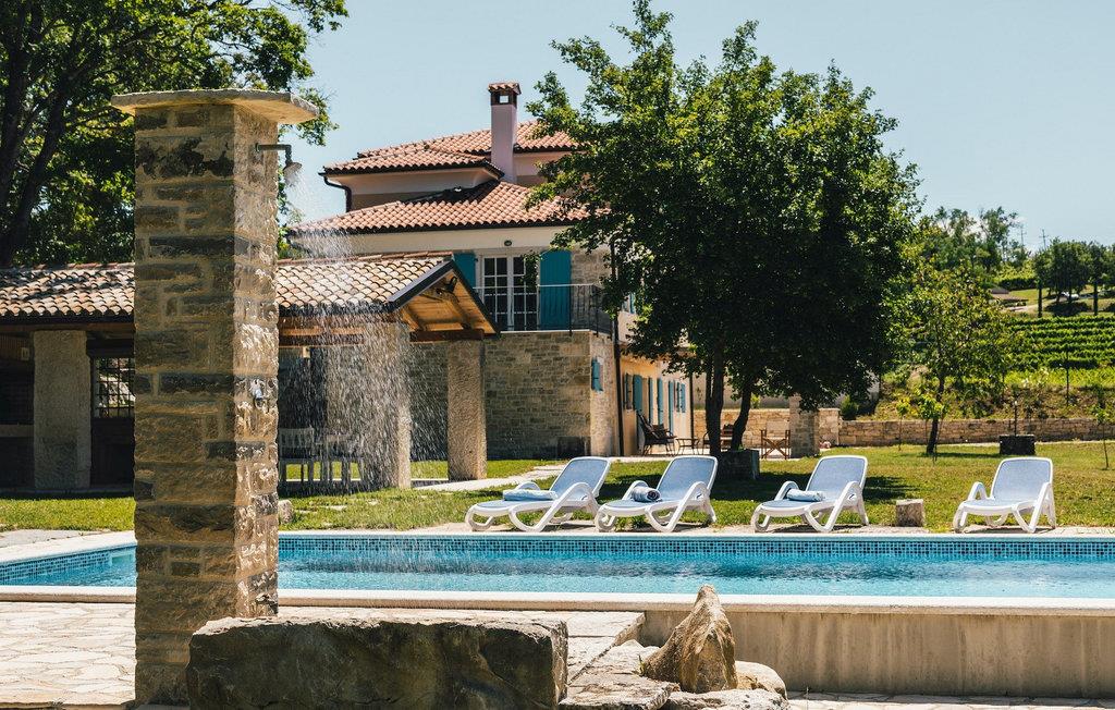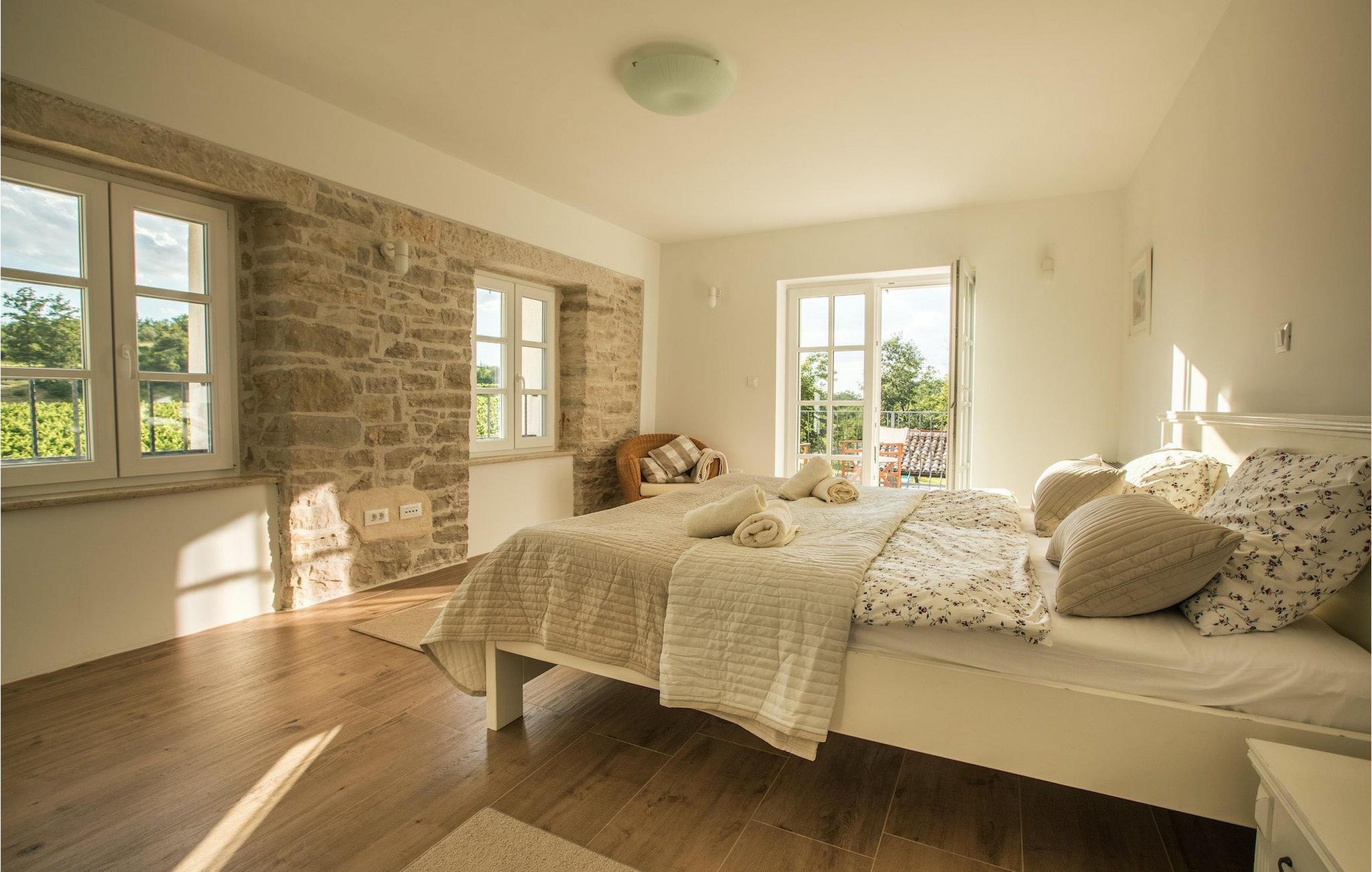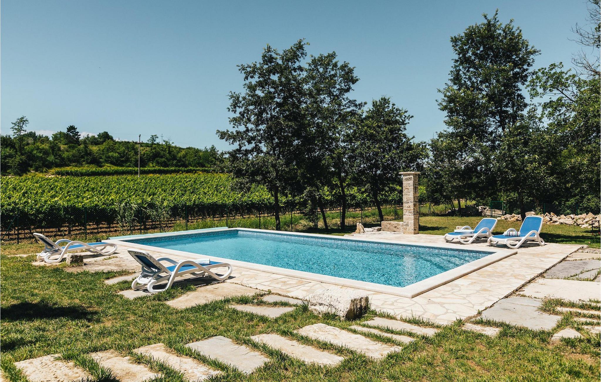 Villa Kanedolo har en idyllisk beliggenhed ikke langt fra den romantiske by Momjan. Villaen er omgivet af romantiske vinmarker, der minder om Toscana og inviterer dig til at blive forelsket i Istrien. Selve huset blev designet og indrettet i en blanding af traditionel landlig og moderne stil. Villaen kan rumme op til 9 gæster og består af 3 etager. Den lyse åbent koncept stue/alrum med køkken er placeret i stueetagen, hvor du også finder et gæstetoilet. De 4 soveværelser og 3 badeværelser er fordelt på de 2 øverste etager. 2 soveværelser, hvoraf det ene har eget badeværelse, er placeret på første sal sammen med et separat badeværelse. De to andre soveværelser, som deler badeværelse, er placeret på anden sal. Fra terrassen på øverste etage er der en vidunderlig udsigt over vinmarkerne og de romantiske omgivelser. Den dejlige overdækkede terrasse i stueetagen med komfortabelt loungeområde er det ideelle sted for en morgenkaffe eller til at se solnedgange om aftenen med et glas istrisk Malvazija. Et udendørs køkken med grill og overdækket spiseplads er placeret mellem poolen og villaen. Den smukke private pool er også omgivet af natur og byder på fremragende forfriskning på varme sommerdage. Nyd din ferie i dette magiske stykke istriske paradis! :)