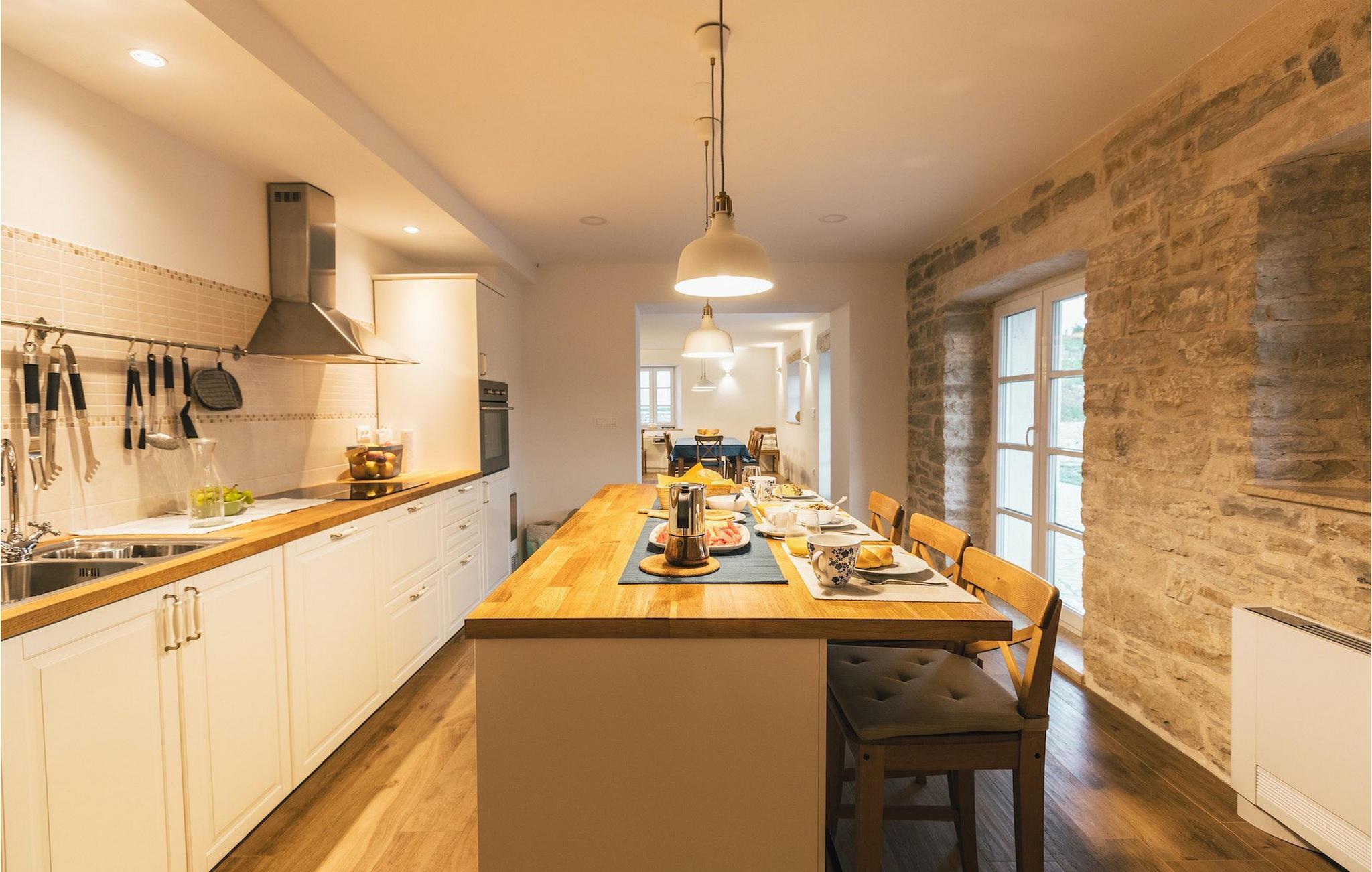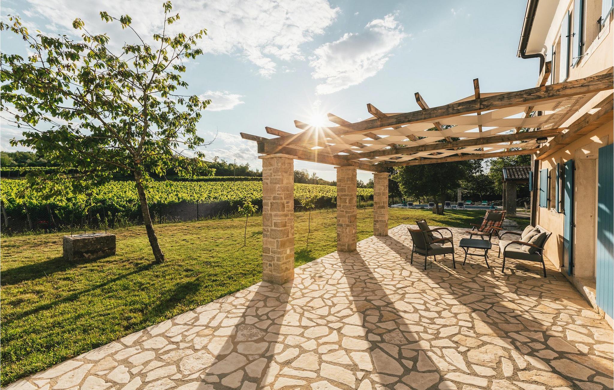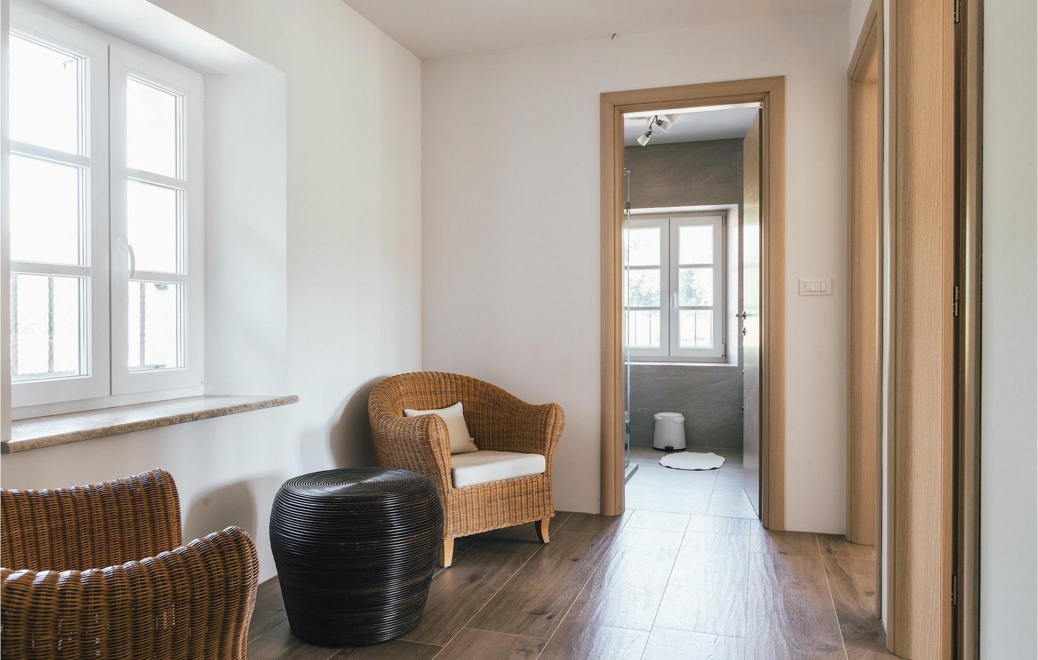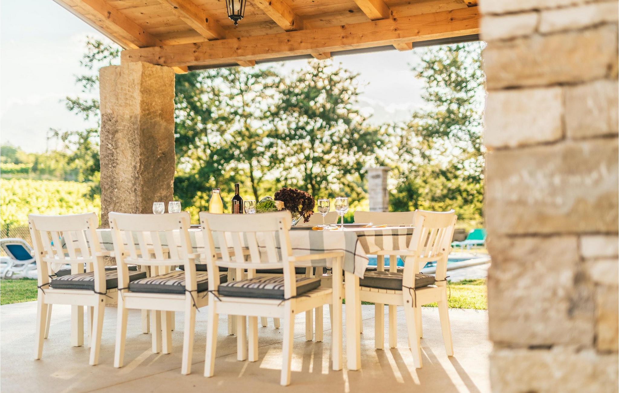Villa Kanedolo har en idyllisk beliggenhed ikke langt fra den romantiske by Momjan. Villaen er omgivet af romantiske vinmarker, der minder om Toscana og inviterer dig til at blive forelsket i Istrien. Selve huset blev designet og indrettet i en blanding af traditionel landlig og moderne stil. Villaen kan rumme op til 9 gæster og består af 3 etager. Den lyse åbent koncept stue/alrum med køkken er placeret i stueetagen, hvor du også finder et gæstetoilet. De 4 soveværelser og 3 badeværelser er fordelt på de 2 øverste etager. 2 soveværelser, hvoraf det ene har eget badeværelse, er placeret på første sal sammen med et separat badeværelse. De to andre soveværelser, som deler badeværelse, er placeret på anden sal. Fra terrassen på øverste etage er der en vidunderlig udsigt over vinmarkerne og de romantiske omgivelser. Den dejlige overdækkede terrasse i stueetagen med komfortabelt loungeområde er det ideelle sted for en morgenkaffe eller til at se solnedgange om aftenen med et glas istrisk Malvazija. Et udendørs køkken med grill og overdækket spiseplads er placeret mellem poolen og villaen. Den smukke private pool er også omgivet af natur og byder på fremragende forfriskning på varme sommerdage. Nyd din ferie i dette magiske stykke istriske paradis! :)