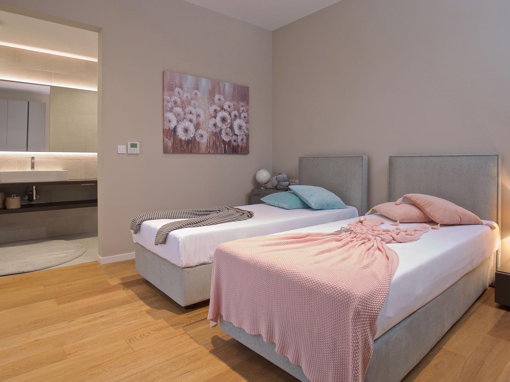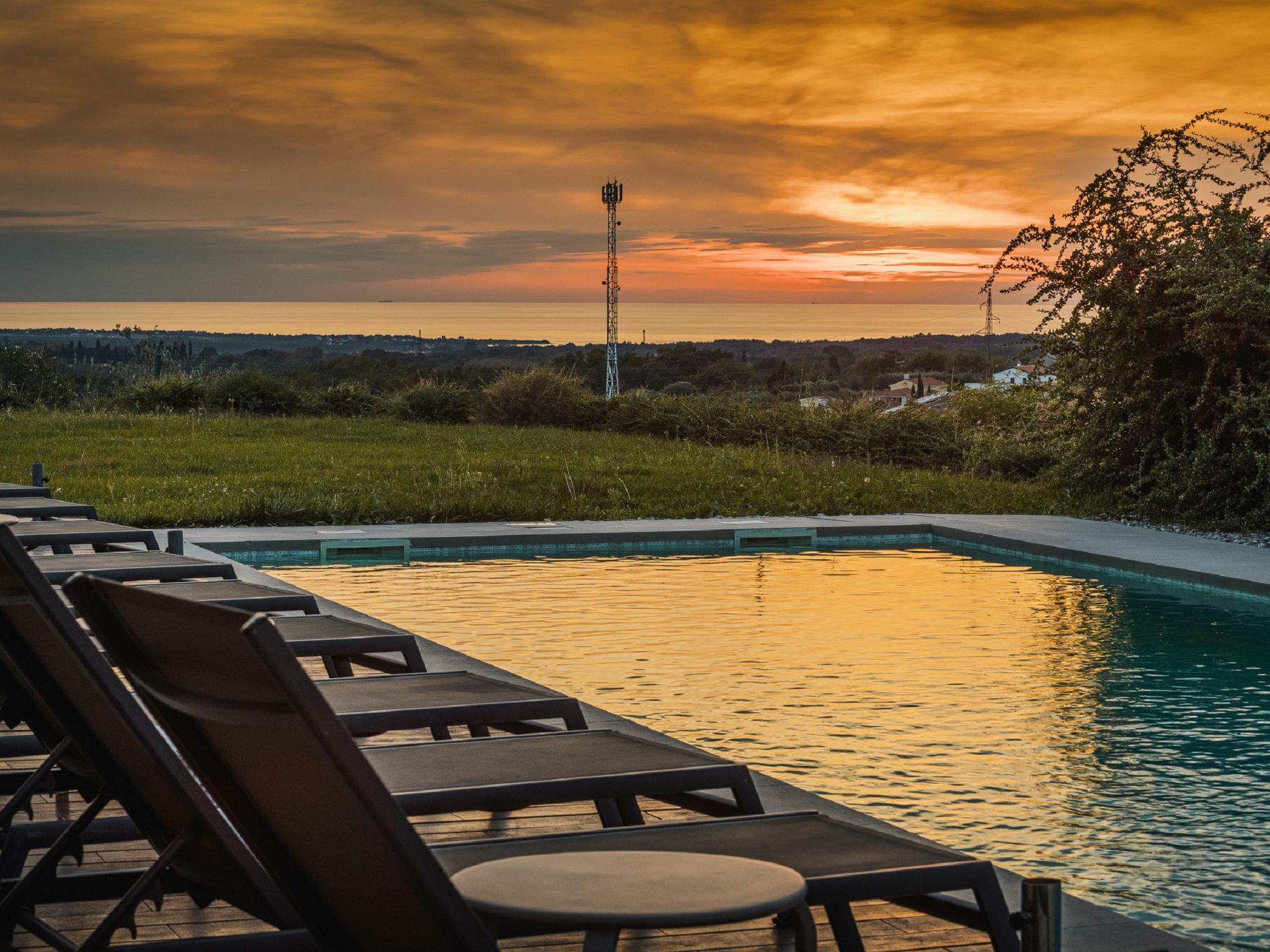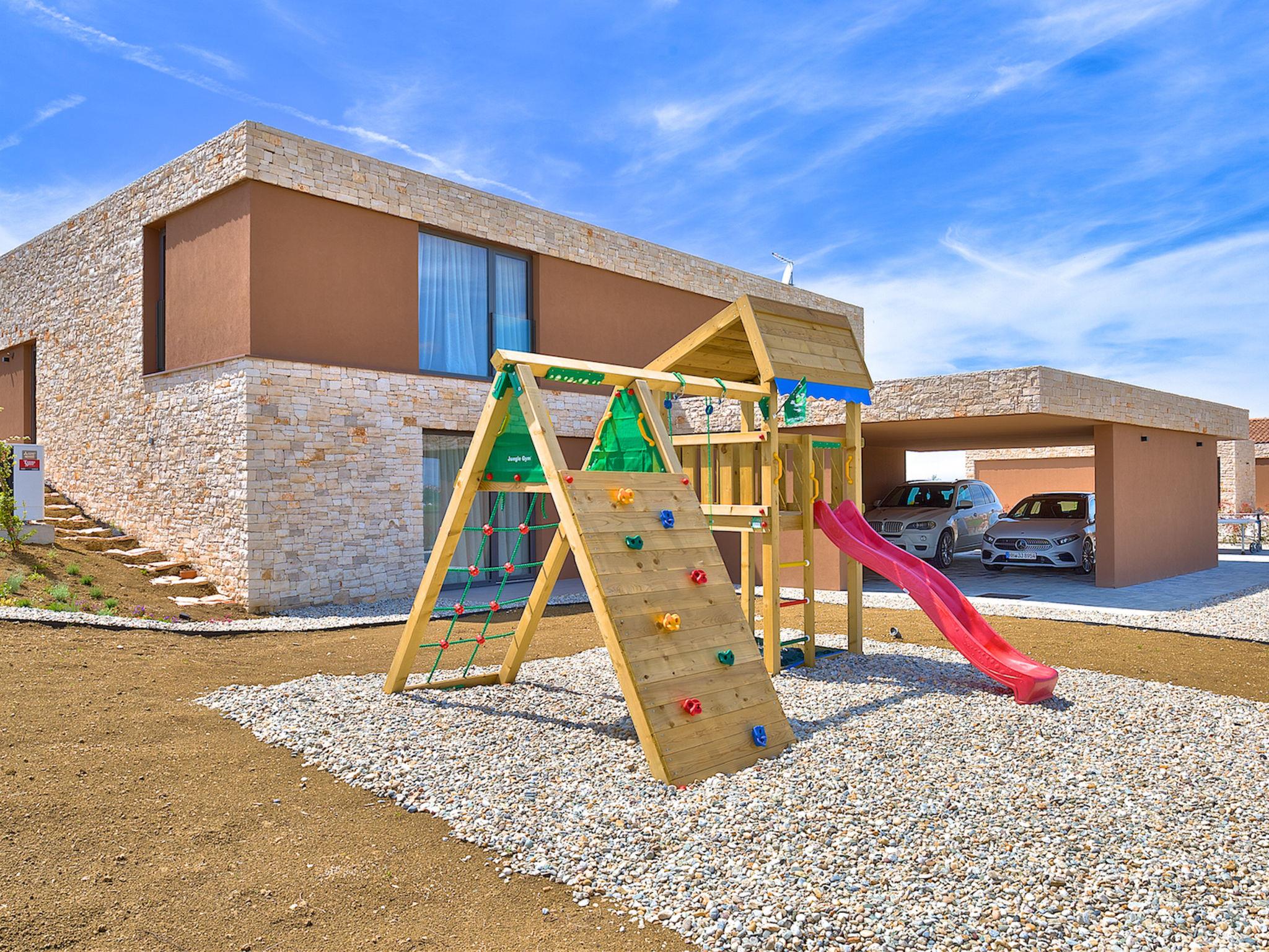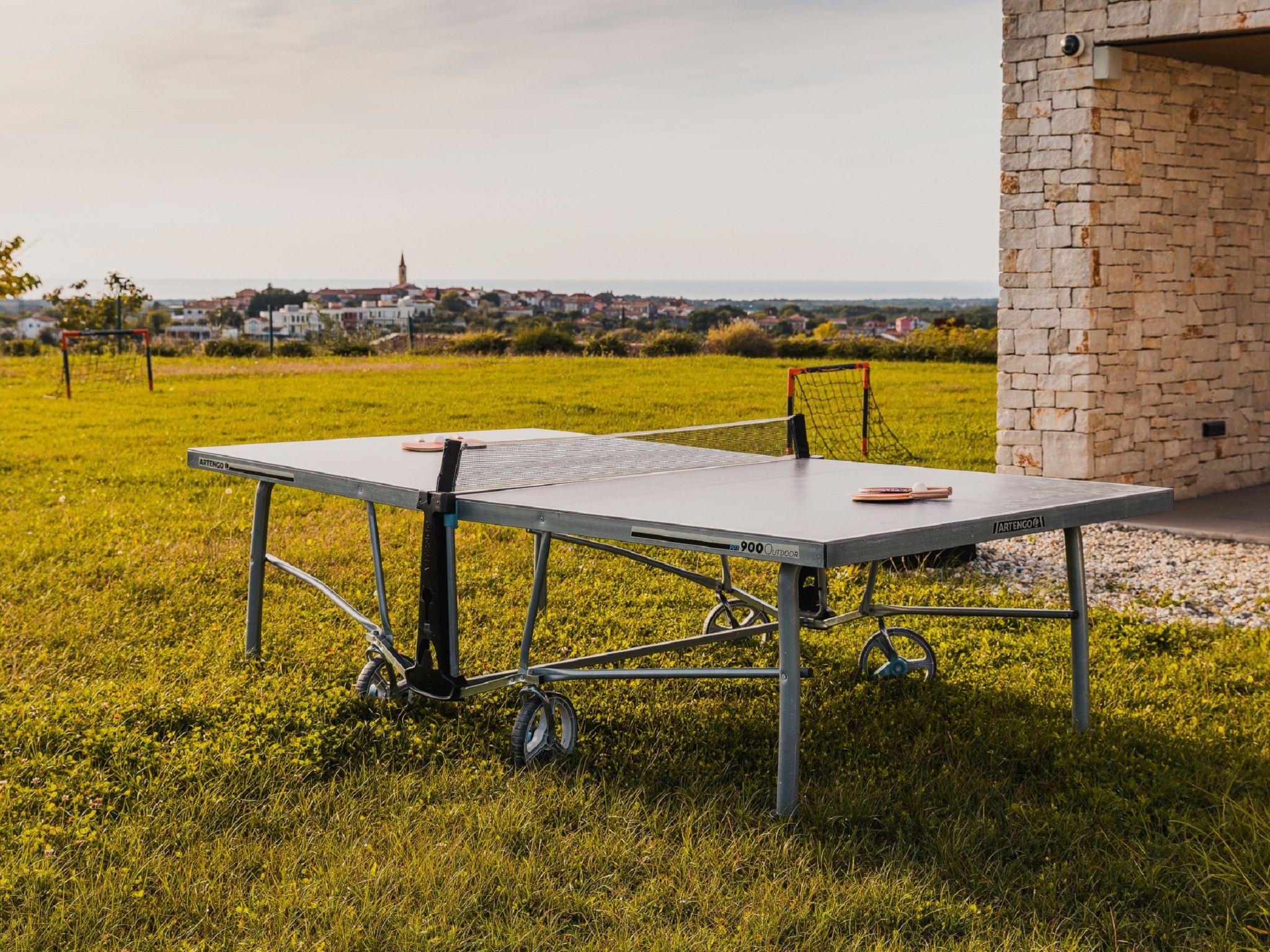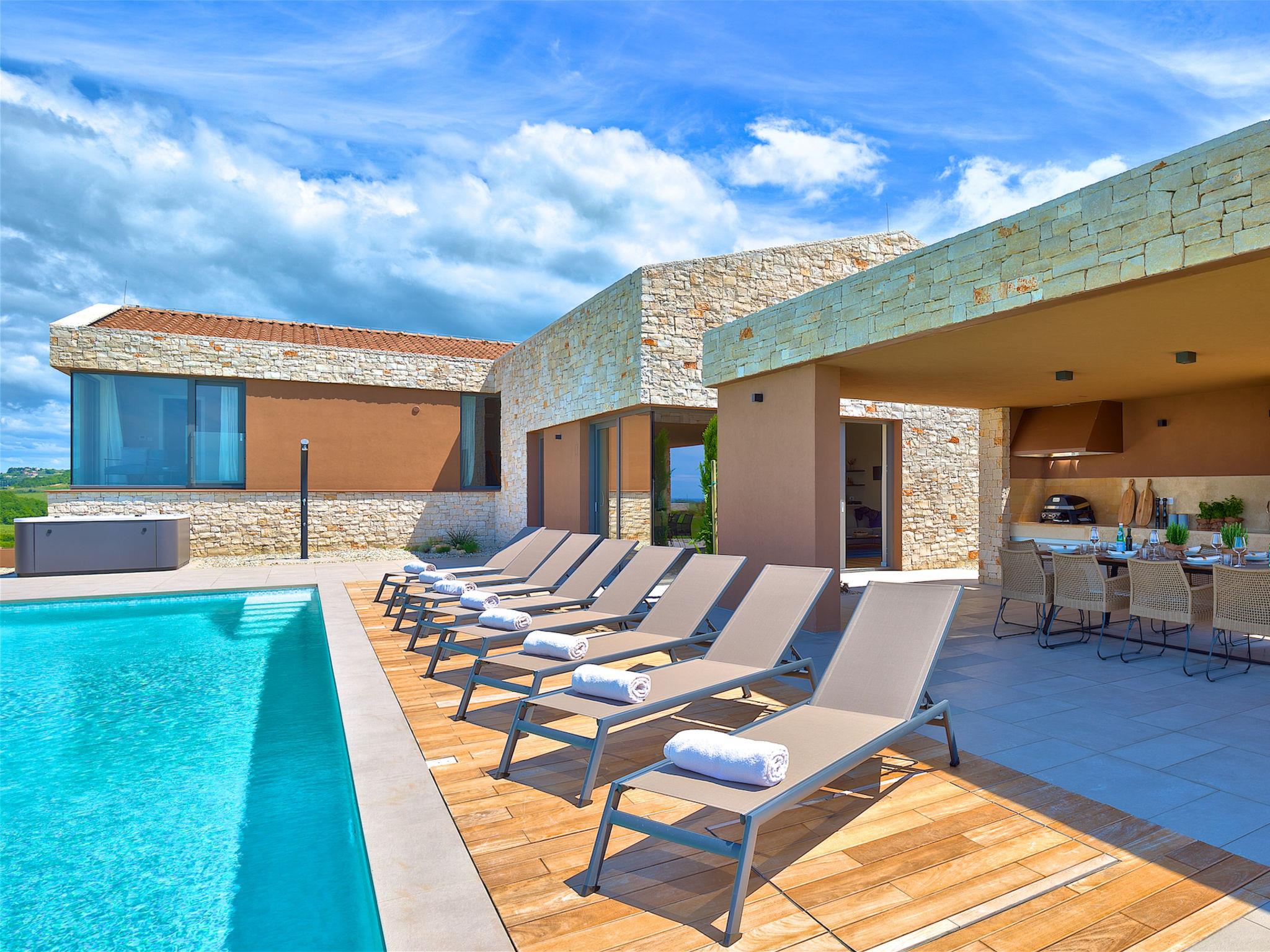 Brtonigla 6 km from Buje: Modern, beautiful villa "Vigneto", 3 storeys. In the hamlet Monte Marzari 1.2 km from the centre of Brtonigla, 10 km from the centre of Novigrad, 13 km from the centre of Umag, in a sunny position, 8 km from the sea. Private: property 2'000 m2 (fenced), garden with lawn 1'600 m2, swimming pool angular, heated (41 m2, depth 150 cm, seasonal availability: 01.Jan. - 31.Dec.) with internal staircase. Outdoor shower, hot tub, table tennis, children's playground (slide, swing). In the house: internet access, table football, air conditioning, burglar alarm system, washing machine, tumble dryer. Available: bicycles (4). Parking (for 4 cars) at the house on the premises. Shop 1.2 km, supermarket 6.4 km, restaurant 1 km, bus stop 1.4 km, pebble beach 8 km, diving center 8 km. Minigolf 11 km. Nearby attractions: Aquapark 5.2 km. Swimming pool heated (extra). It is necessary to announce 7 days in advance if the pool heating is required.