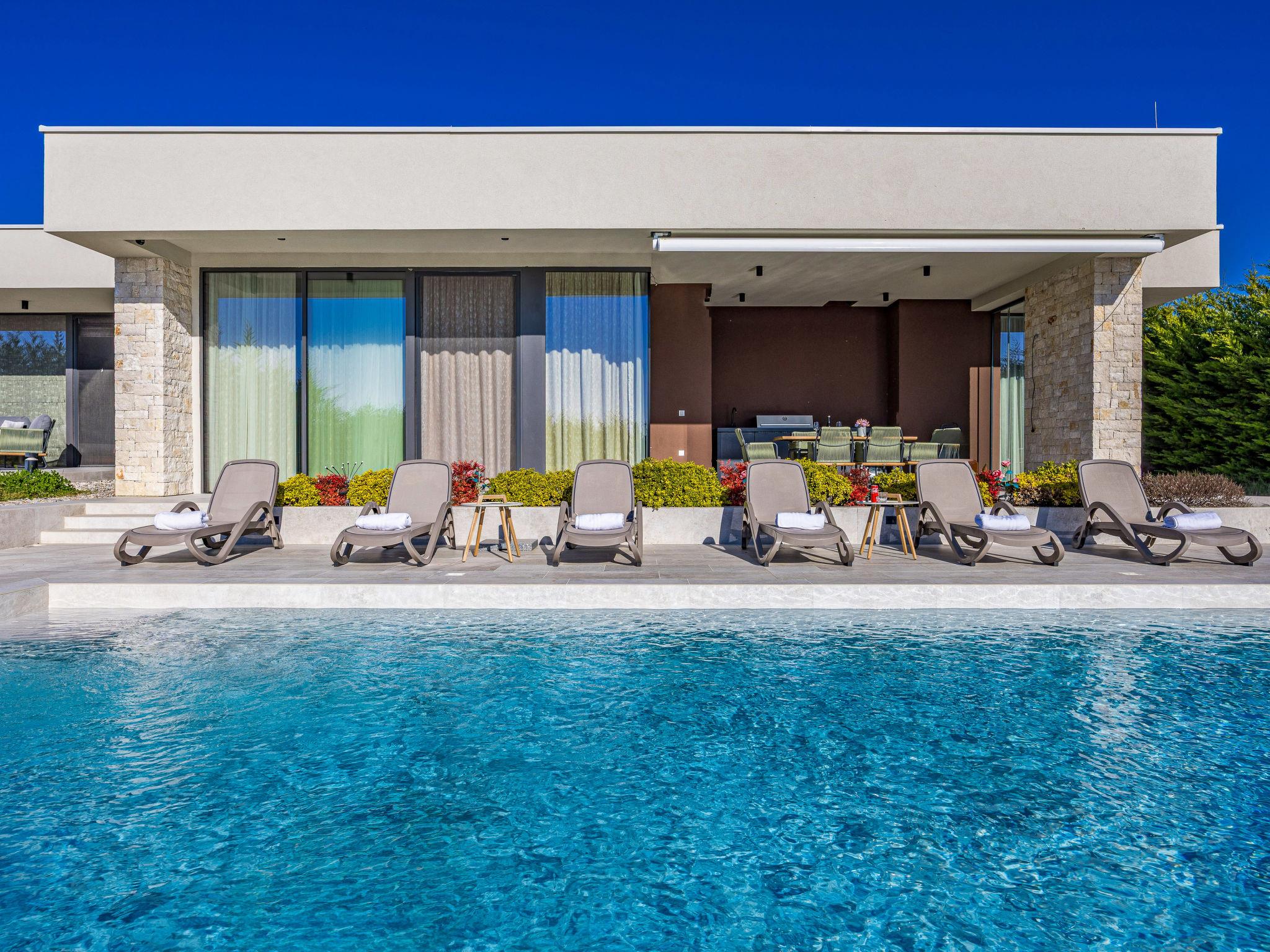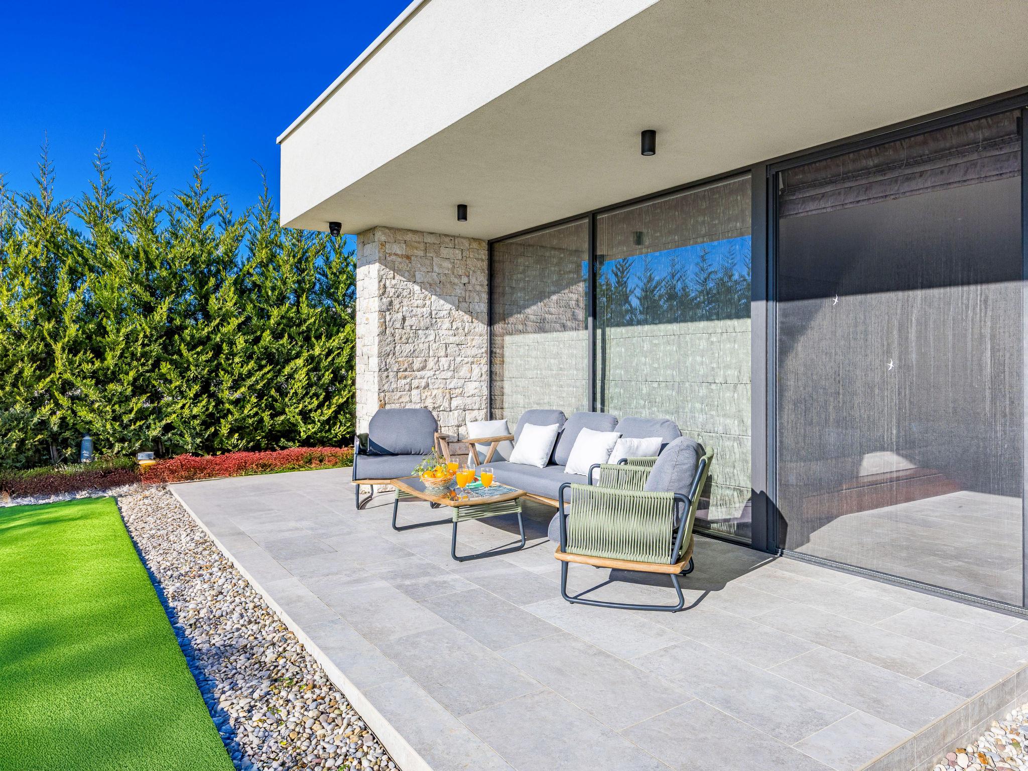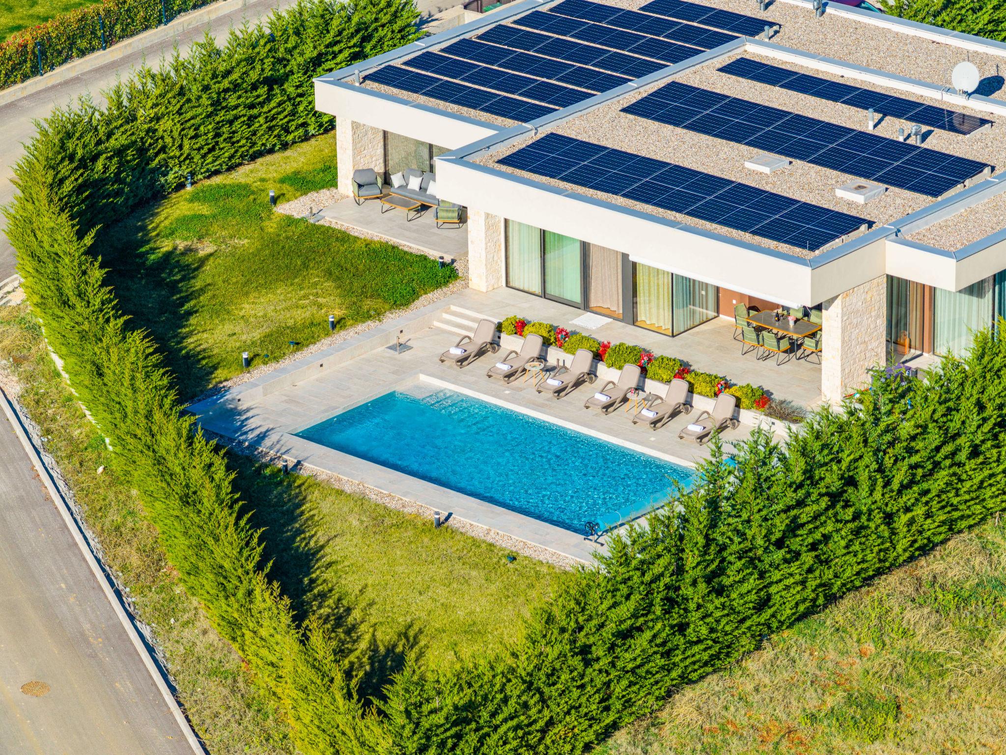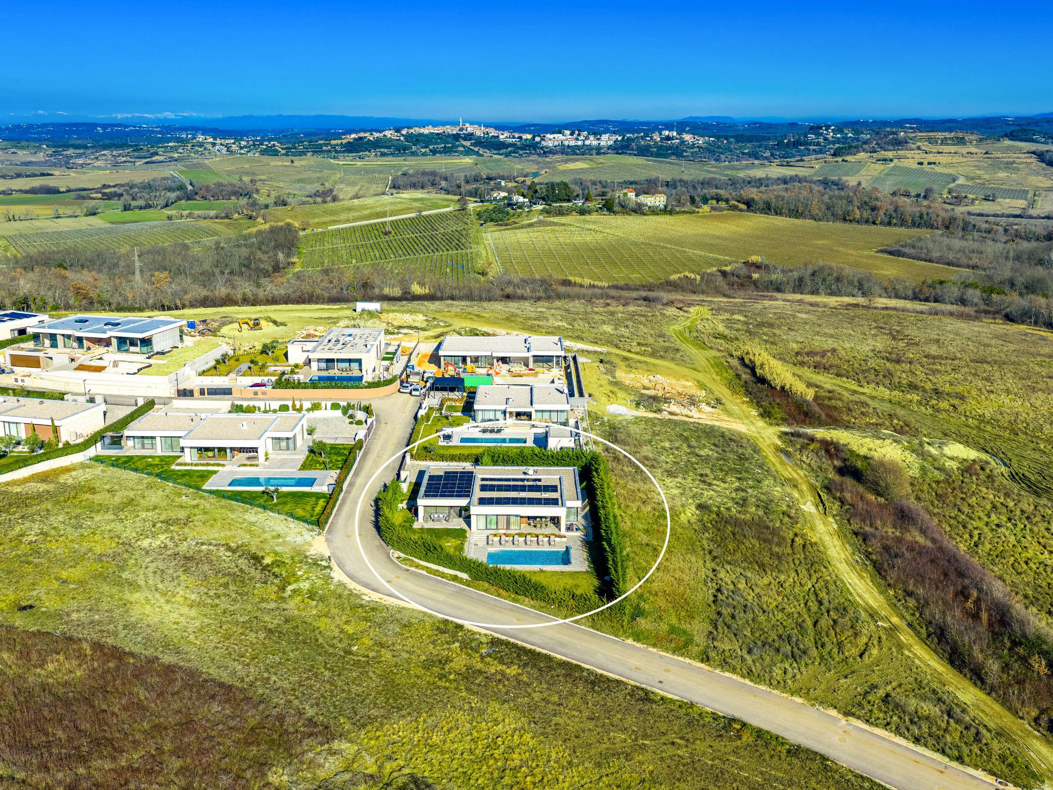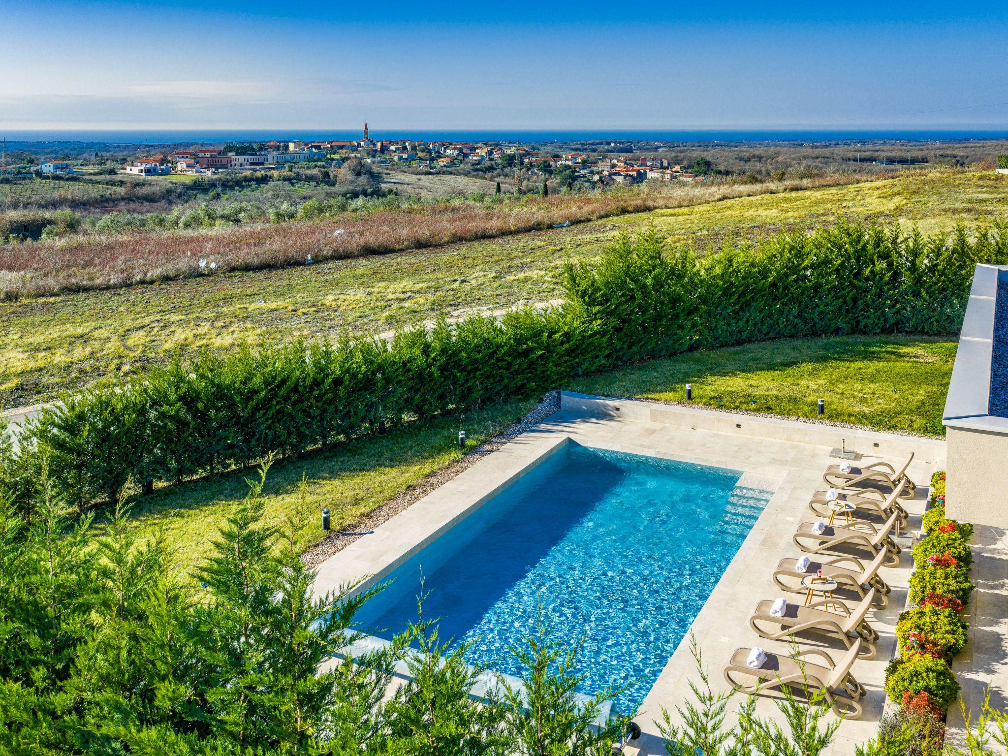Brtonigla 6 km from Buje: Modern, beautiful villa "Miracle", built in 2025. In the hamlet Monte Marzari 1.2 km from the centre of Brtonigla, 10 km from the centre of Novigrad, 13 km from the centre of Umag, in a sunny position, 8 km from the sea. Private: property 1'150 m2 (fenced), garden with lawn, swimming pool angular, heated (10 x 5 m, 50 m2, depth 150 cm, seasonal availability: 01.Jan. - 31.Dec.) with internal staircase. Outdoor shower. In the house: internet access, fitness room, massage (extra). Hot tub (all included), infrared sauna, air conditioning, burglar alarm system, washing machine, tumble dryer. Parking (for 2 cars) at the house on the premises. Shop 1.2 km, supermarket 6.4 km, restaurant 1 km, bus stop 1.4 km, pebble beach 8 km, diving center 8 km. Golf course (18 hole) 20 km, minigolf 11 km. Nearby attractions: Aquapark 5.2 km. The owner does not accept any youth groups. Swimming pool heated (extra). It is necessary to announce 7 days in advance if the pool heating is required.