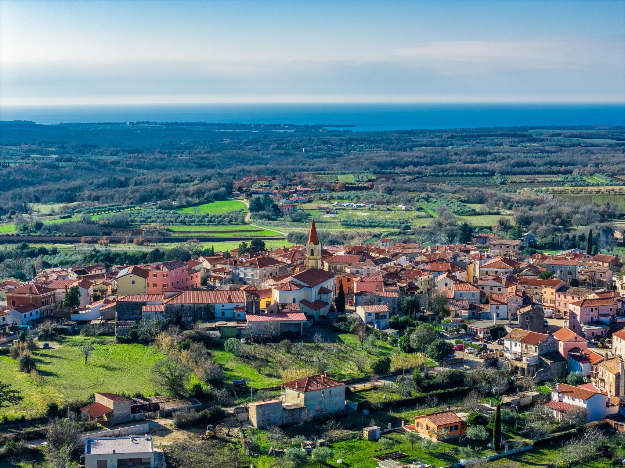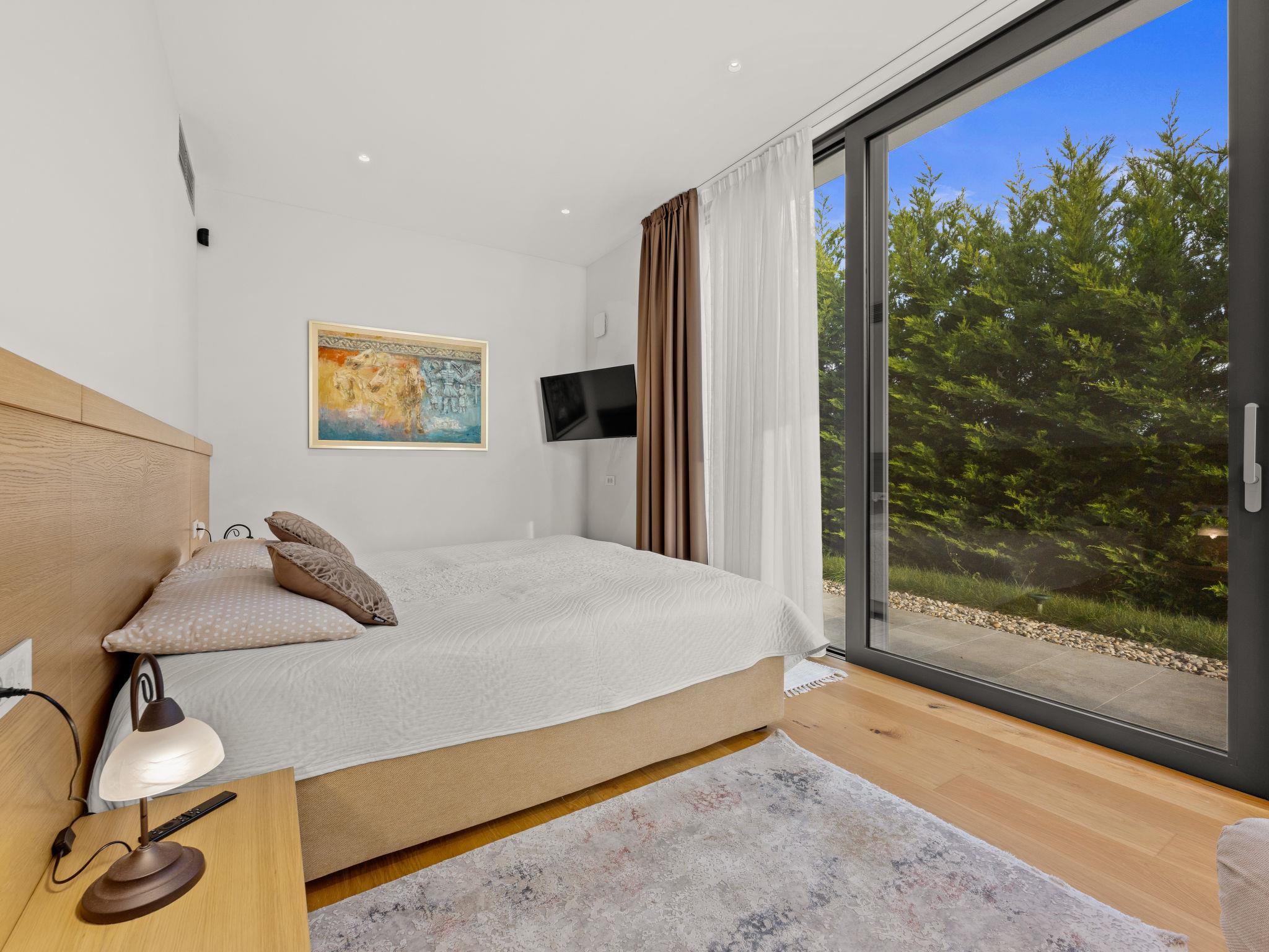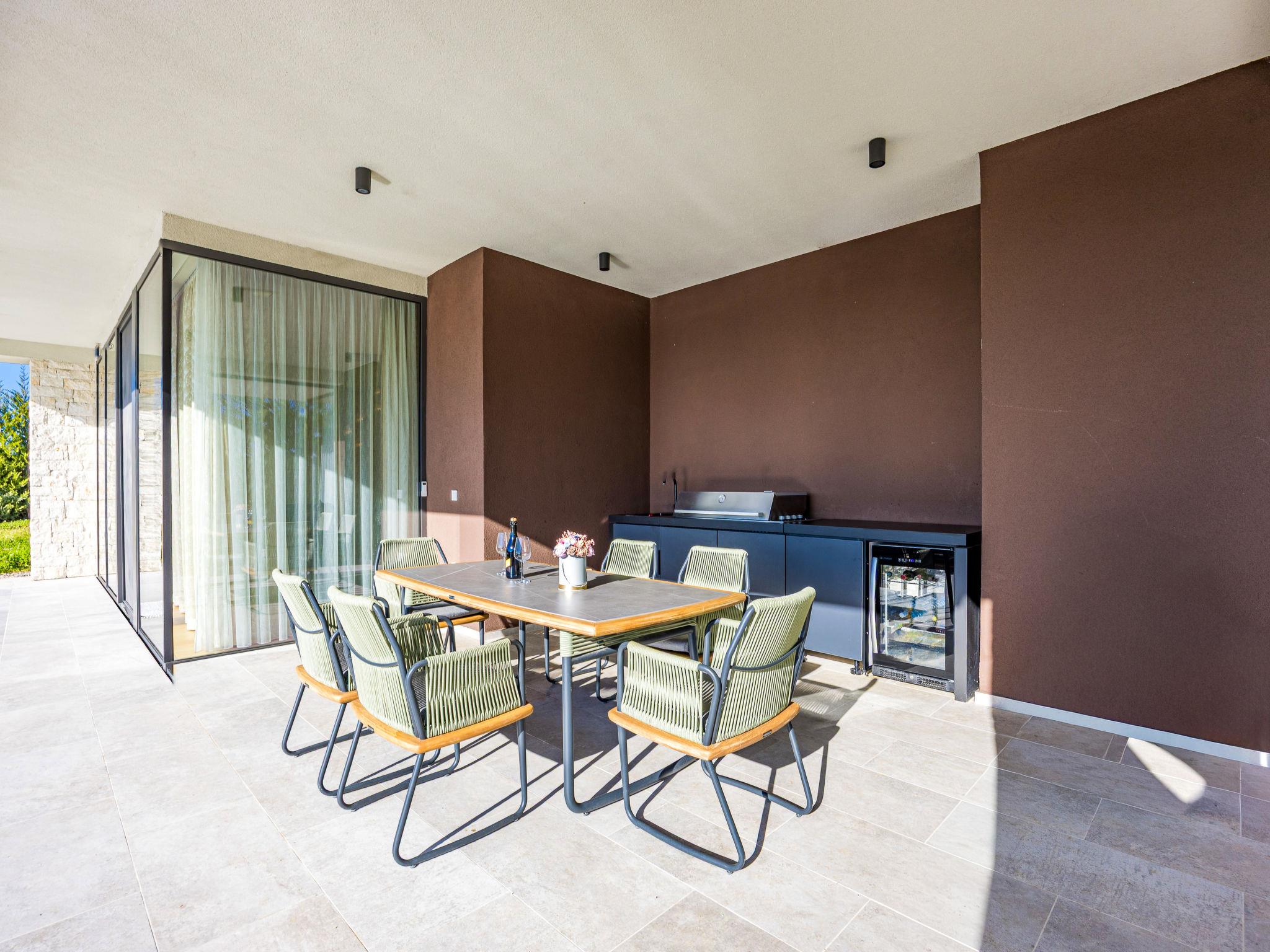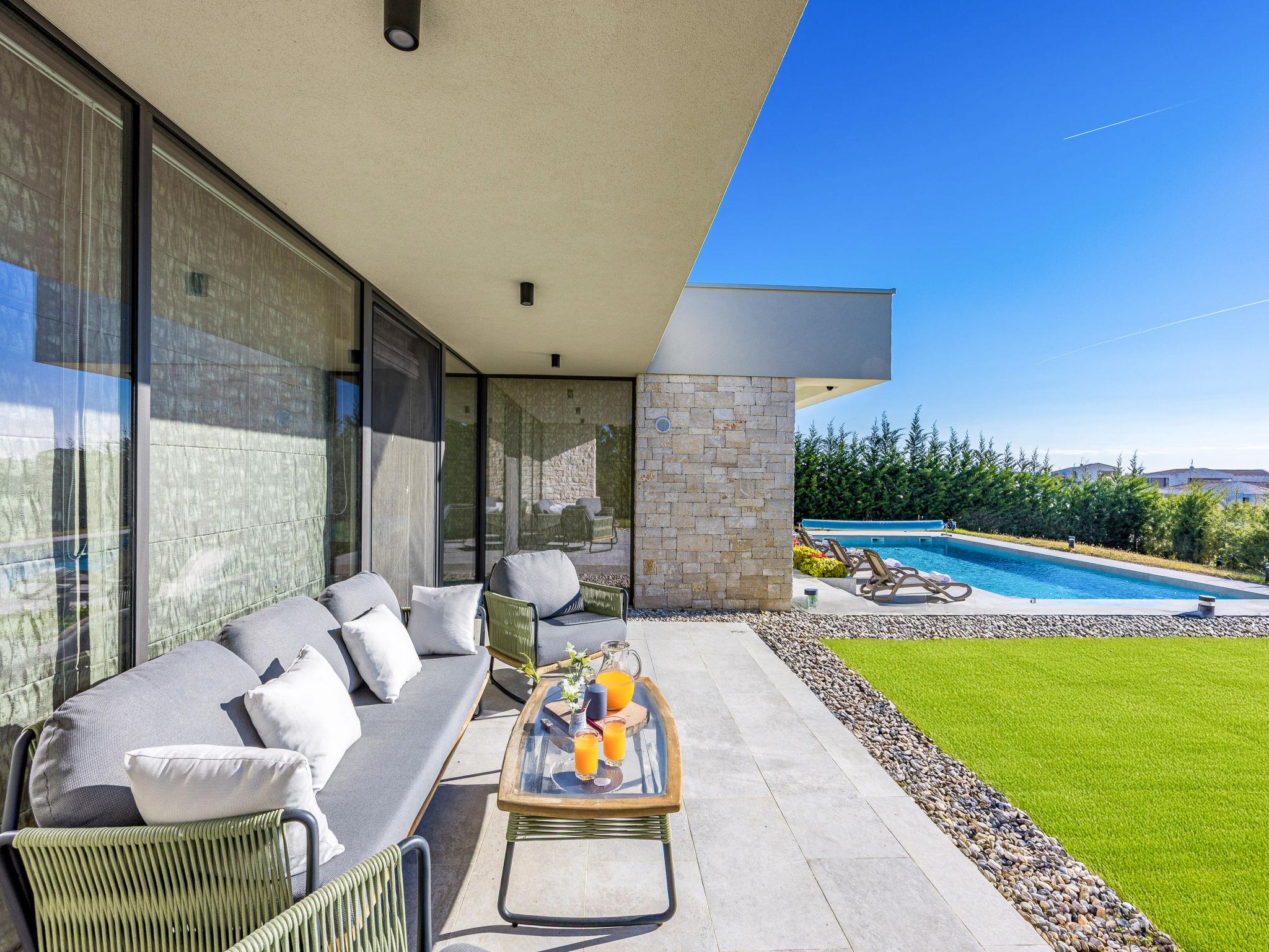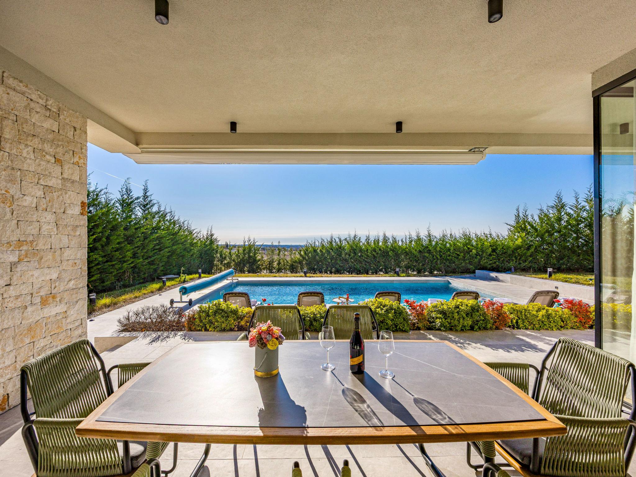 Brtonigla 6 km from Buje: Modern, beautiful villa "Miracle", built in 2025. In the hamlet Monte Marzari 1.2 km from the centre of Brtonigla, 10 km from the centre of Novigrad, 13 km from the centre of Umag, in a sunny position, 8 km from the sea. Private: property 1'150 m2 (fenced), garden with lawn, swimming pool angular, heated (10 x 5 m, 50 m2, depth 150 cm, seasonal availability: 01.Jan. - 31.Dec.) with internal staircase. Outdoor shower. In the house: internet access, fitness room, massage (extra). Hot tub (all included), infrared sauna, air conditioning, burglar alarm system, washing machine, tumble dryer. Parking (for 2 cars) at the house on the premises. Shop 1.2 km, supermarket 6.4 km, restaurant 1 km, bus stop 1.4 km, pebble beach 8 km, diving center 8 km. Golf course (18 hole) 20 km, minigolf 11 km. Nearby attractions: Aquapark 5.2 km. The owner does not accept any youth groups. Swimming pool heated (extra). It is necessary to announce 7 days in advance if the pool heating is required.