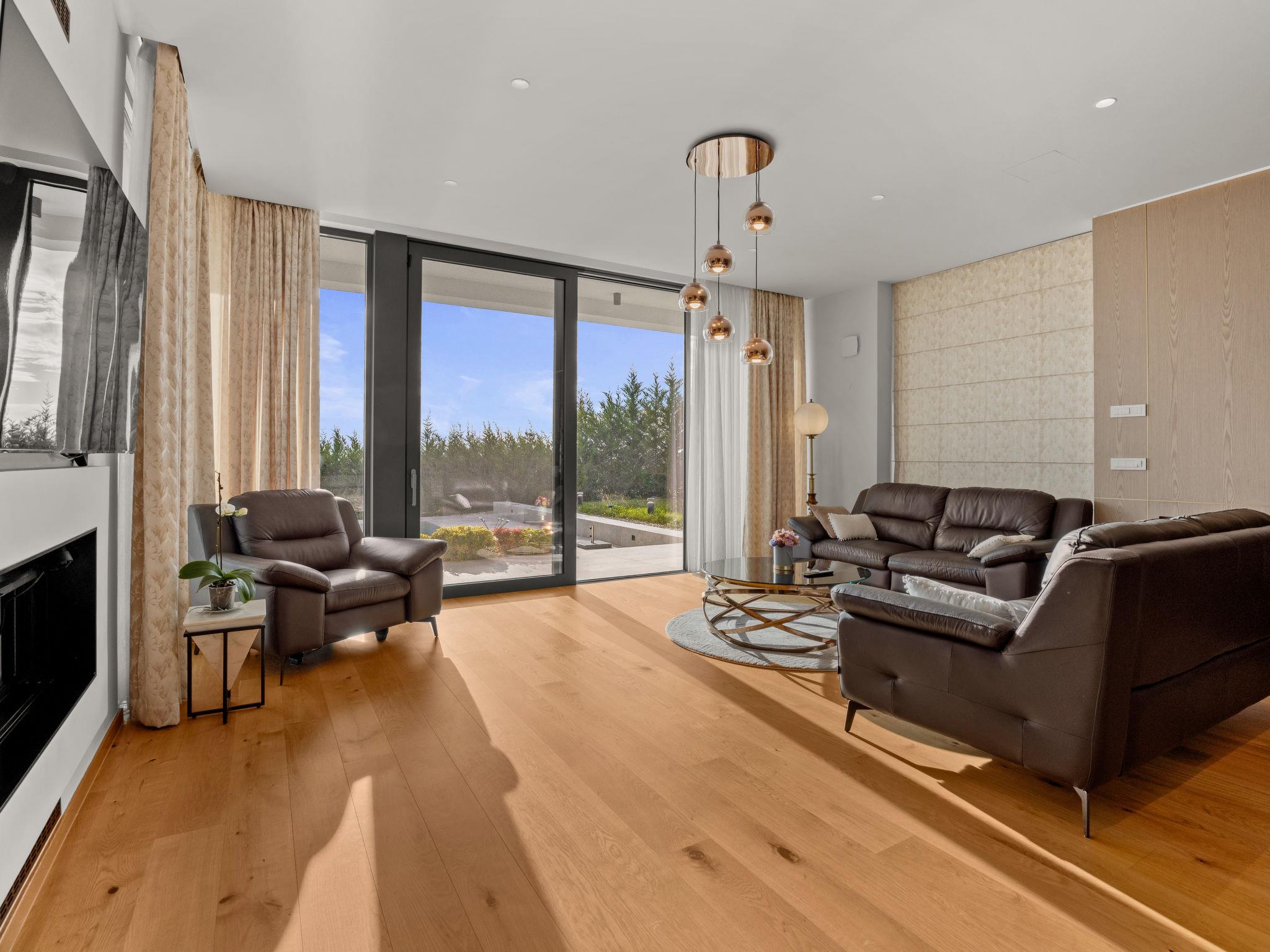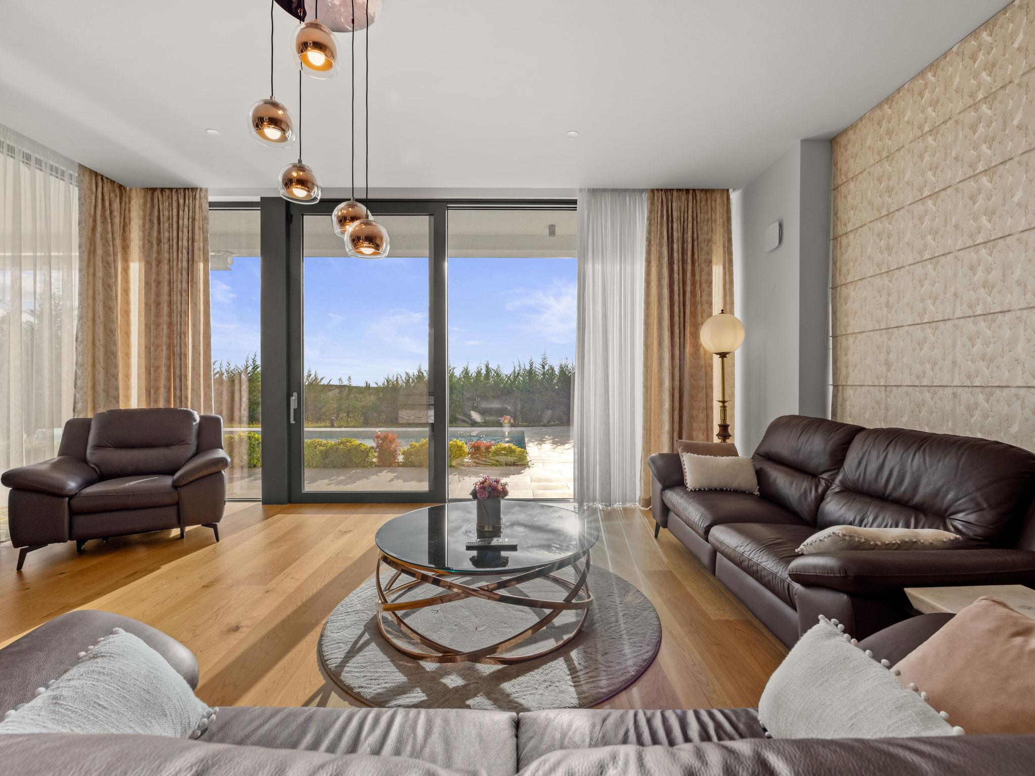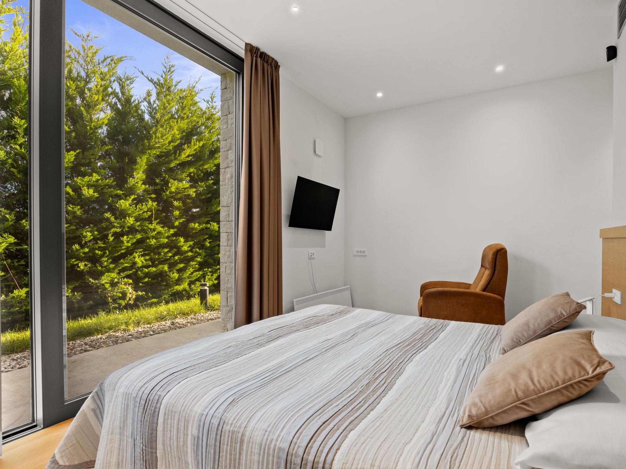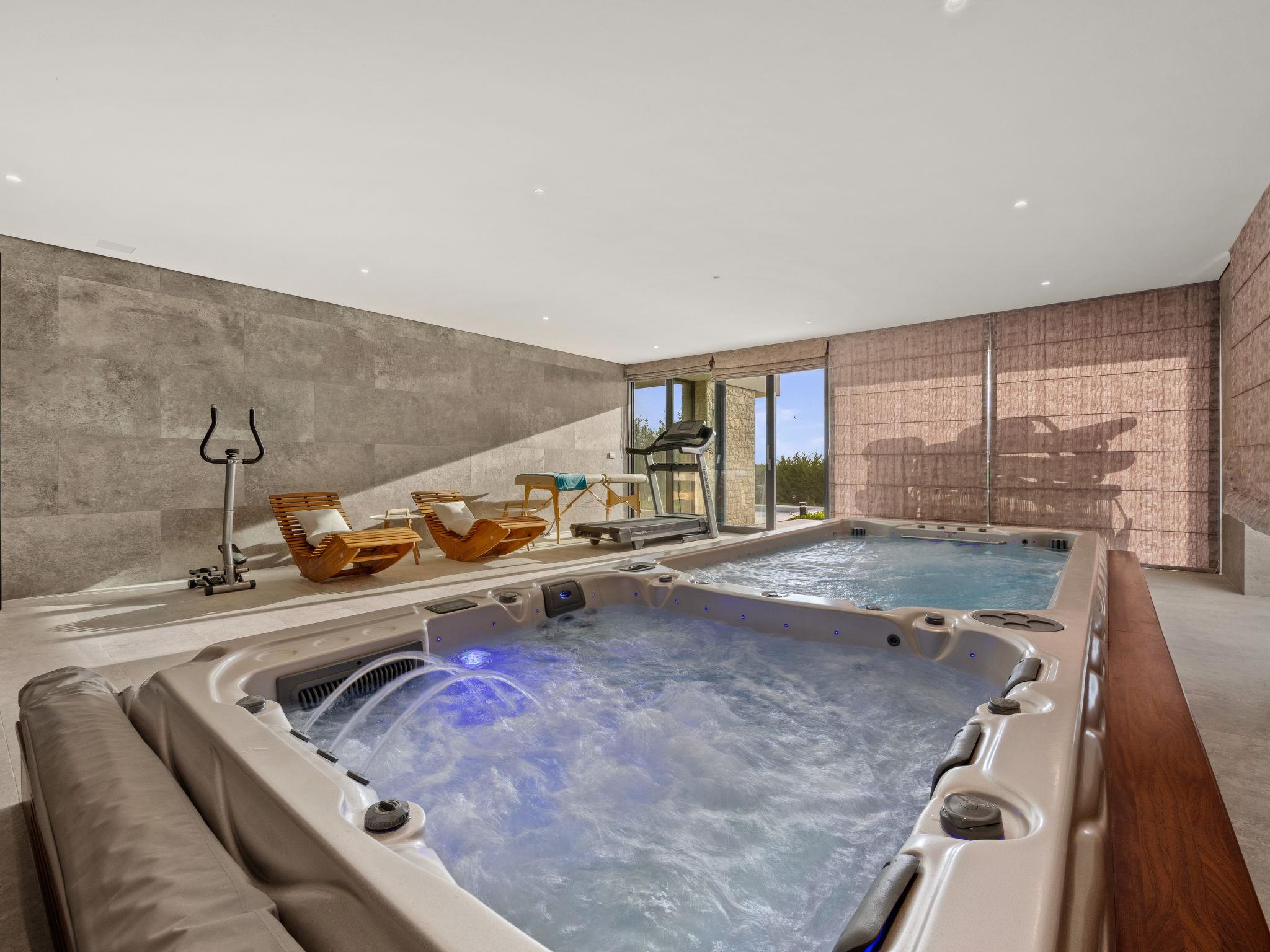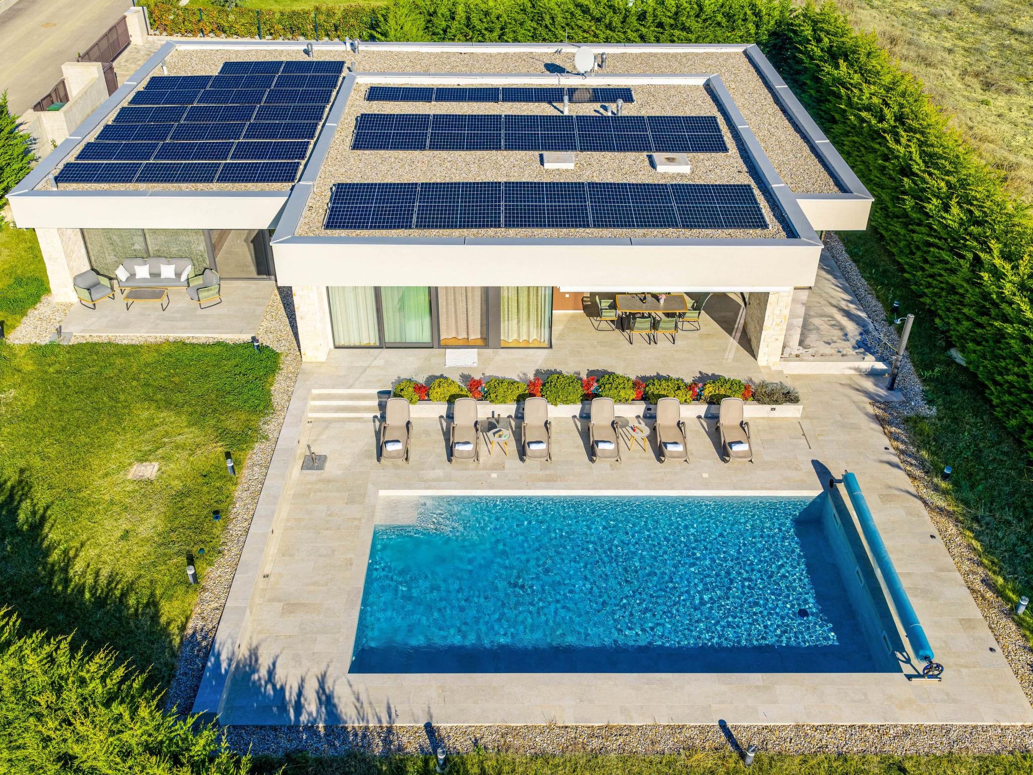 Brtonigla 6 km from Buje: Modern, beautiful villa "Miracle", built in 2025. In the hamlet Monte Marzari 1.2 km from the centre of Brtonigla, 10 km from the centre of Novigrad, 13 km from the centre of Umag, in a sunny position, 8 km from the sea. Private: property 1'150 m2 (fenced), garden with lawn, swimming pool angular, heated (10 x 5 m, 50 m2, depth 150 cm, seasonal availability: 01.Jan. - 31.Dec.) with internal staircase. Outdoor shower. In the house: internet access, fitness room, massage (extra). Hot tub (all included), infrared sauna, air conditioning, burglar alarm system, washing machine, tumble dryer. Parking (for 2 cars) at the house on the premises. Shop 1.2 km, supermarket 6.4 km, restaurant 1 km, bus stop 1.4 km, pebble beach 8 km, diving center 8 km. Golf course (18 hole) 20 km, minigolf 11 km. Nearby attractions: Aquapark 5.2 km. The owner does not accept any youth groups. Swimming pool heated (extra). It is necessary to announce 7 days in advance if the pool heating is required.