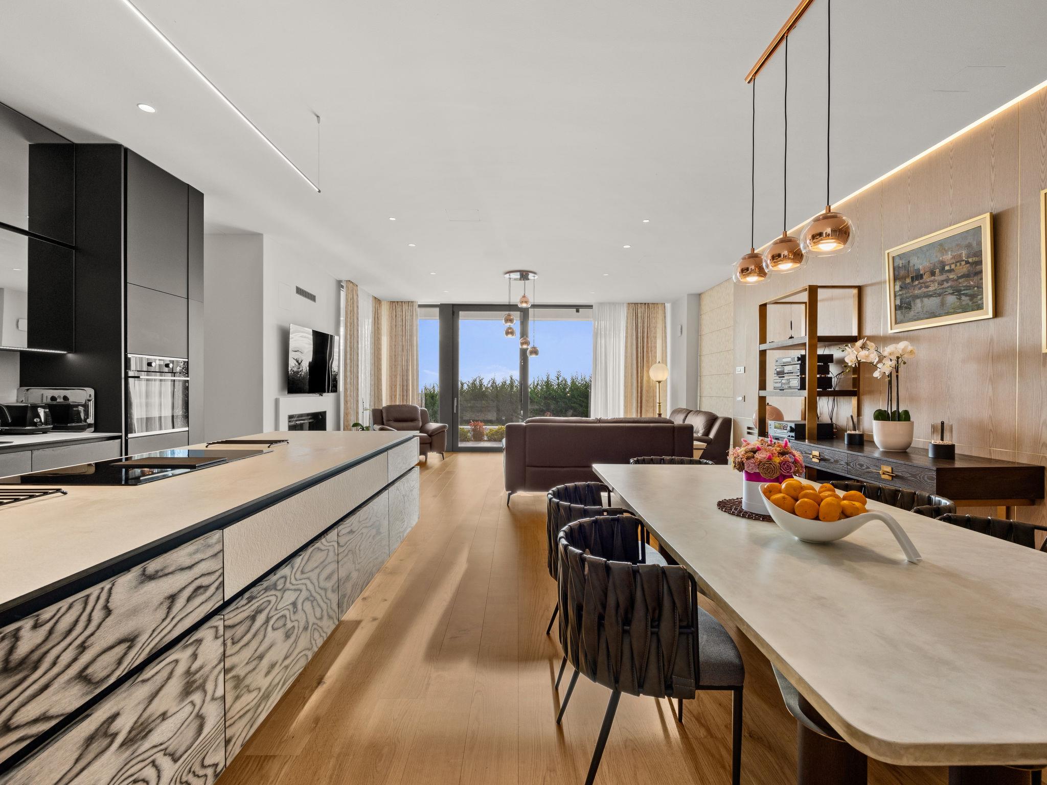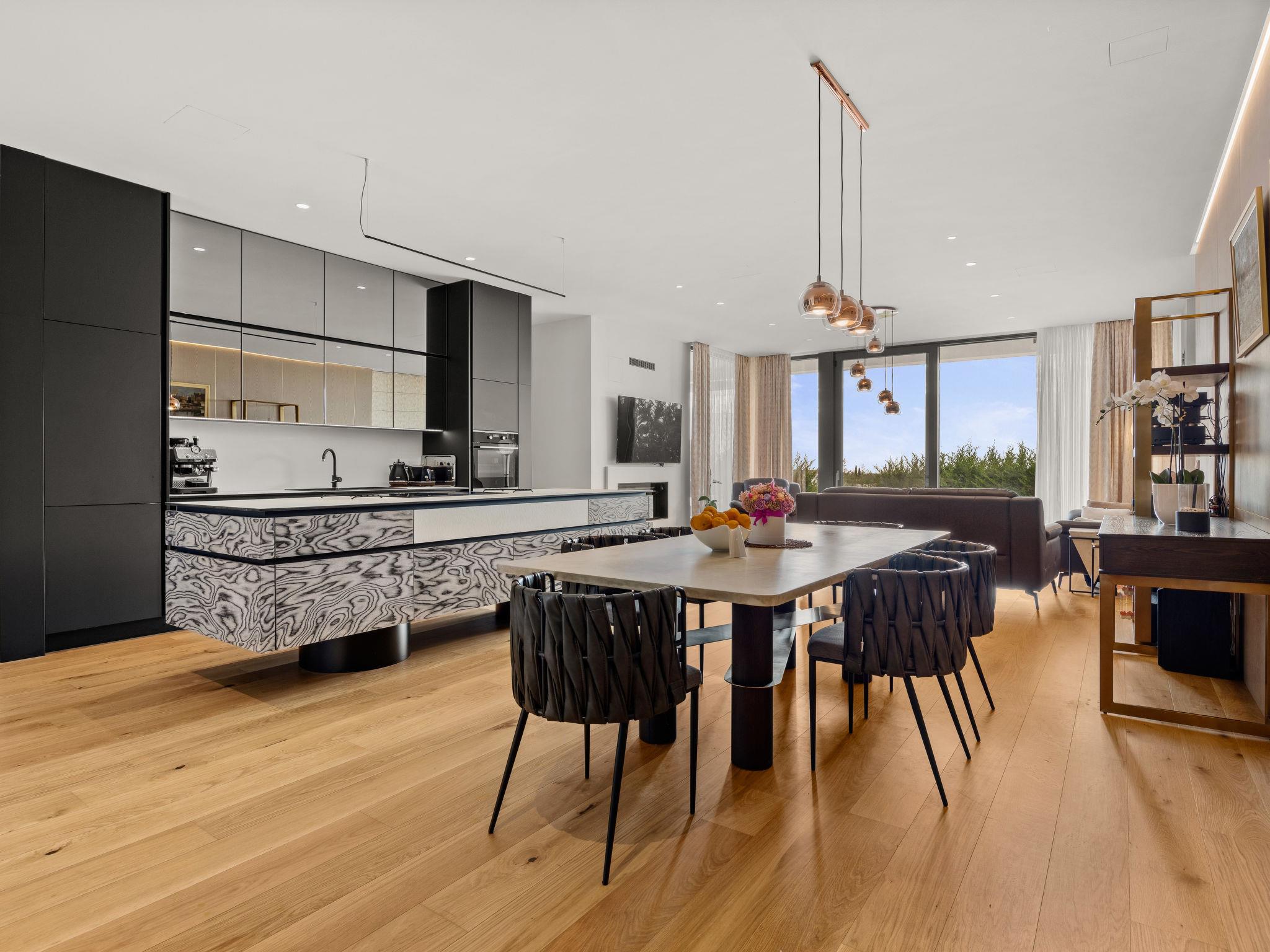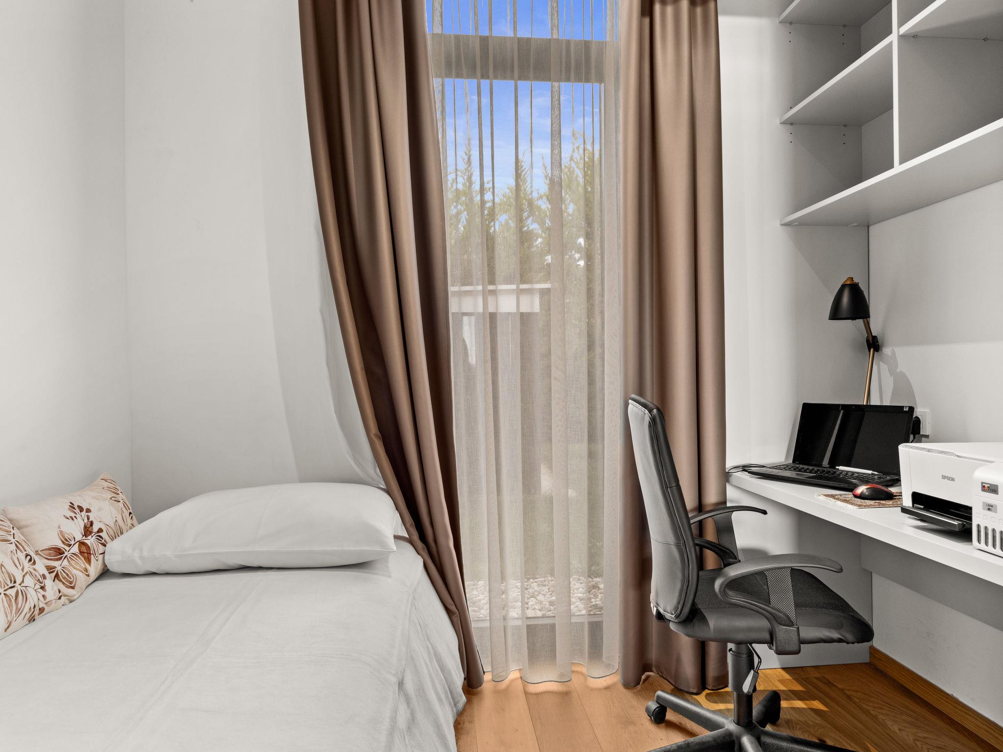 4-room villa 341 m2, on the ground floor. Spacious and bright, comfortable and modern furnishings: living/dining room with satellite TV and flat screen. Exit to the terrace, to the swimming pool. 1 room with 1 french bed (180 cm, length 200 cm), 1 folding bed (90 cm, length 200 cm), shower/WC and satellite TV. Exit to the terrace. 1 room with 1 french bed (180 cm, length 200 cm), satellite TV. Exit to the terrace. 1 room with 1 bed (90 cm, length 200 cm). Open kitchen (oven, dishwasher, 4 ceramic glass hob hotplates, toaster, kettle, freezer, electric coffee machine). Shower, Sauna. Floor heating, forced-air heating. Terrace 70 m2, roofed. Terrace furniture, electric barbecue, deck chairs. Panoramic view of the sea. Facilities: safe, iron, mosquito net, children's high chair, baby cot. Internet (WiFi, free). 1 pet/ dog allowed.