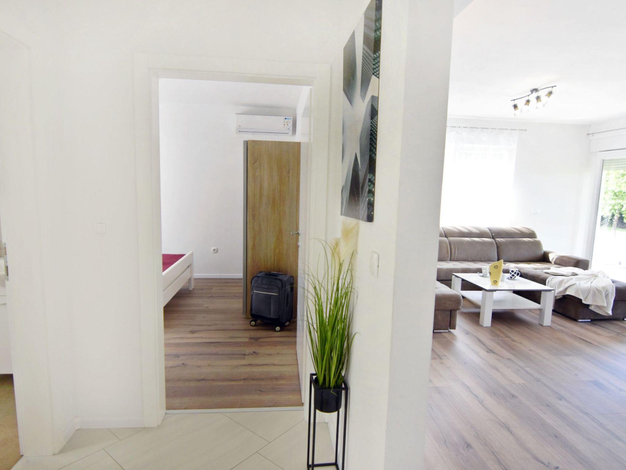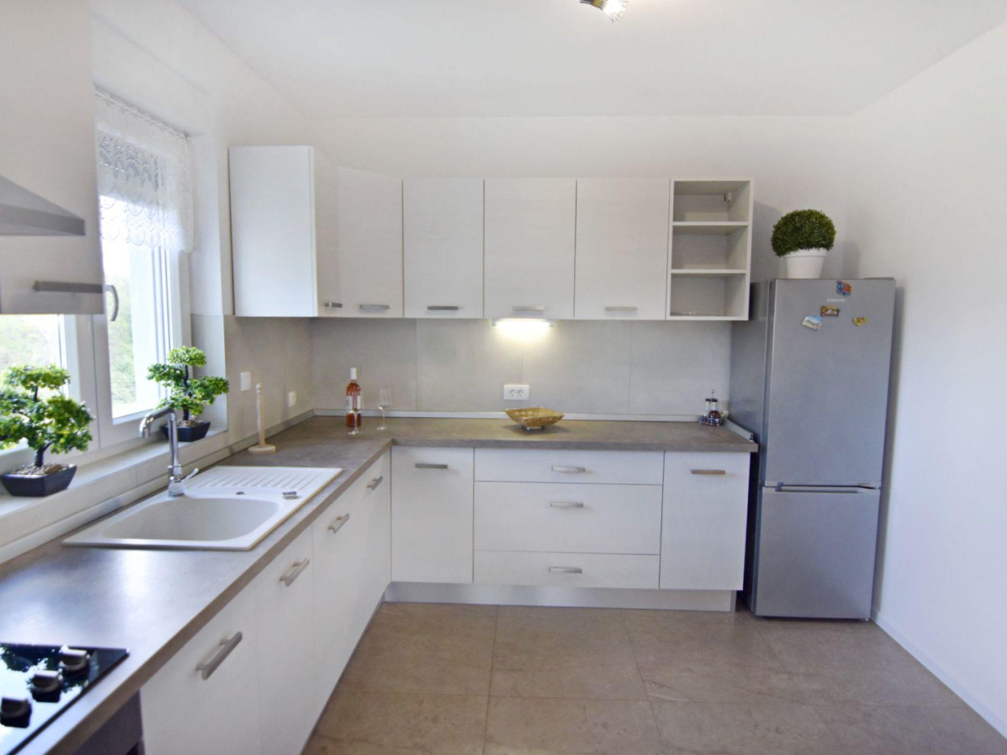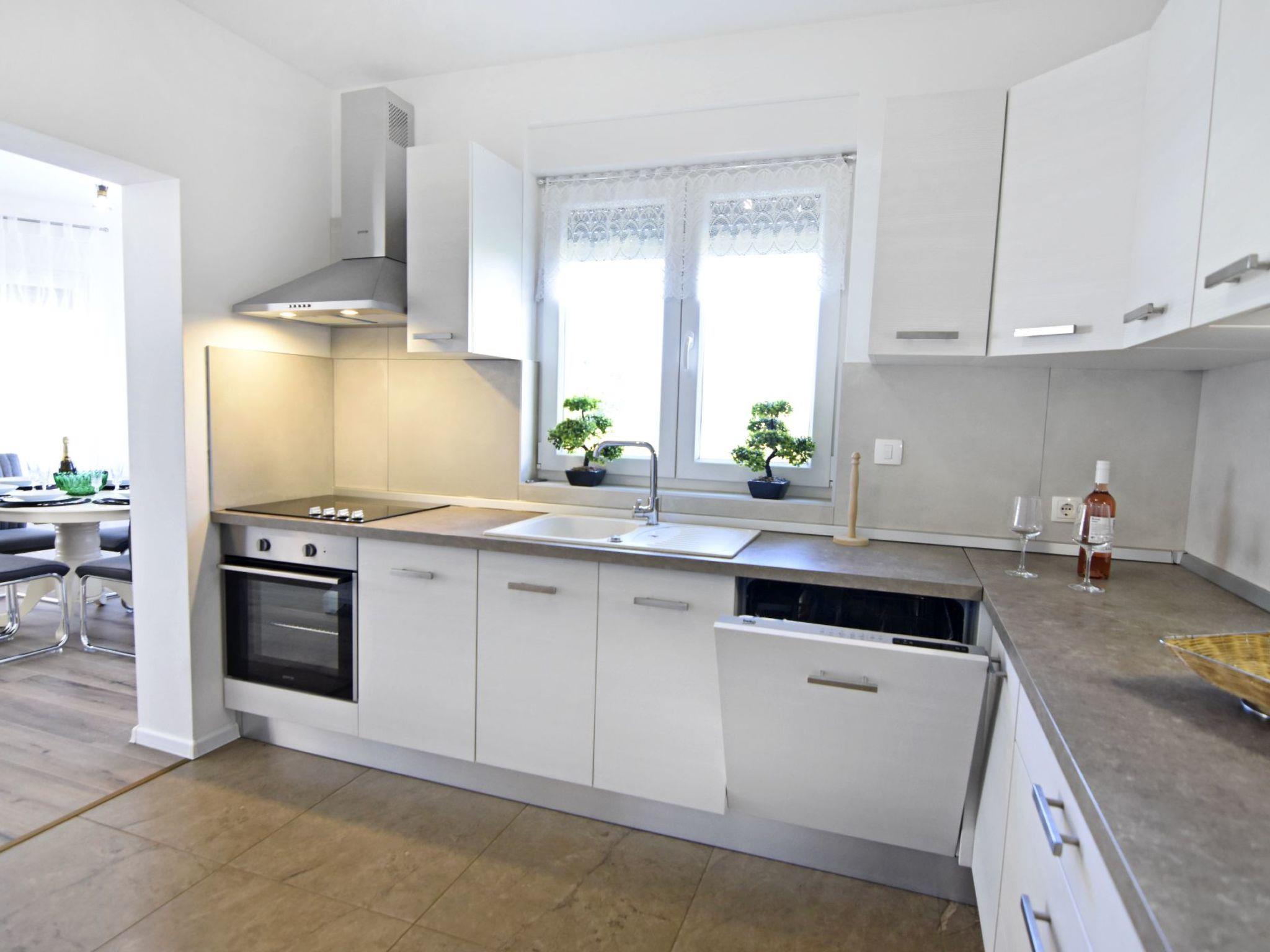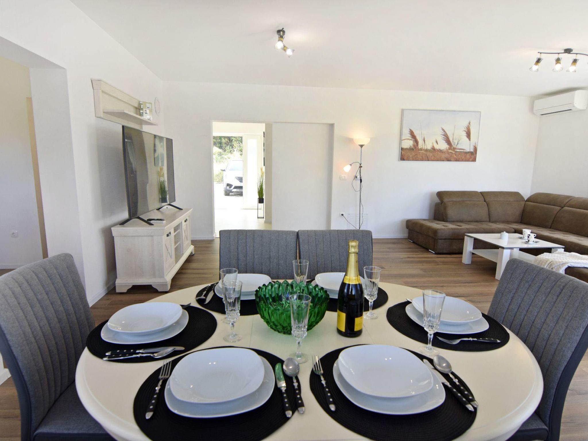 The interior of the house invites you to linger. The entrance corridor leads to the individually air-conditioned bedrooms - two with double beds and one with two single beds, all equipped with wardrobes, bedside tables and lamps. There are two bathrooms, one with a bathtub, the other with a shower, both offering comfort and privacy. The large living room, furnished with a comfortable sofa bed for two people, flat-screen satellite TV, Wi-Fi and board games, leads into the dining area and the modern kitchen, which is equipped with everything you need to prepare delicious meals.