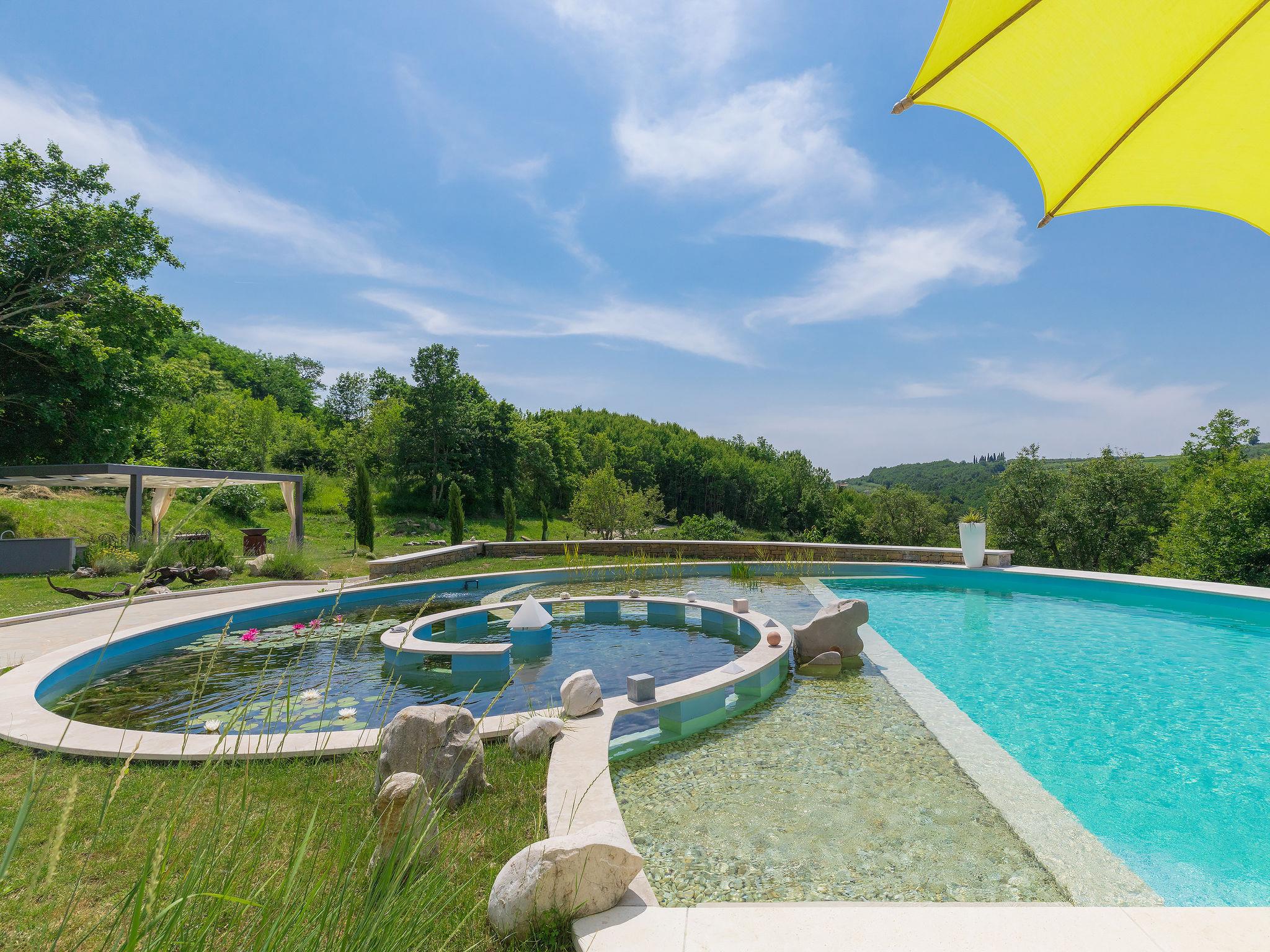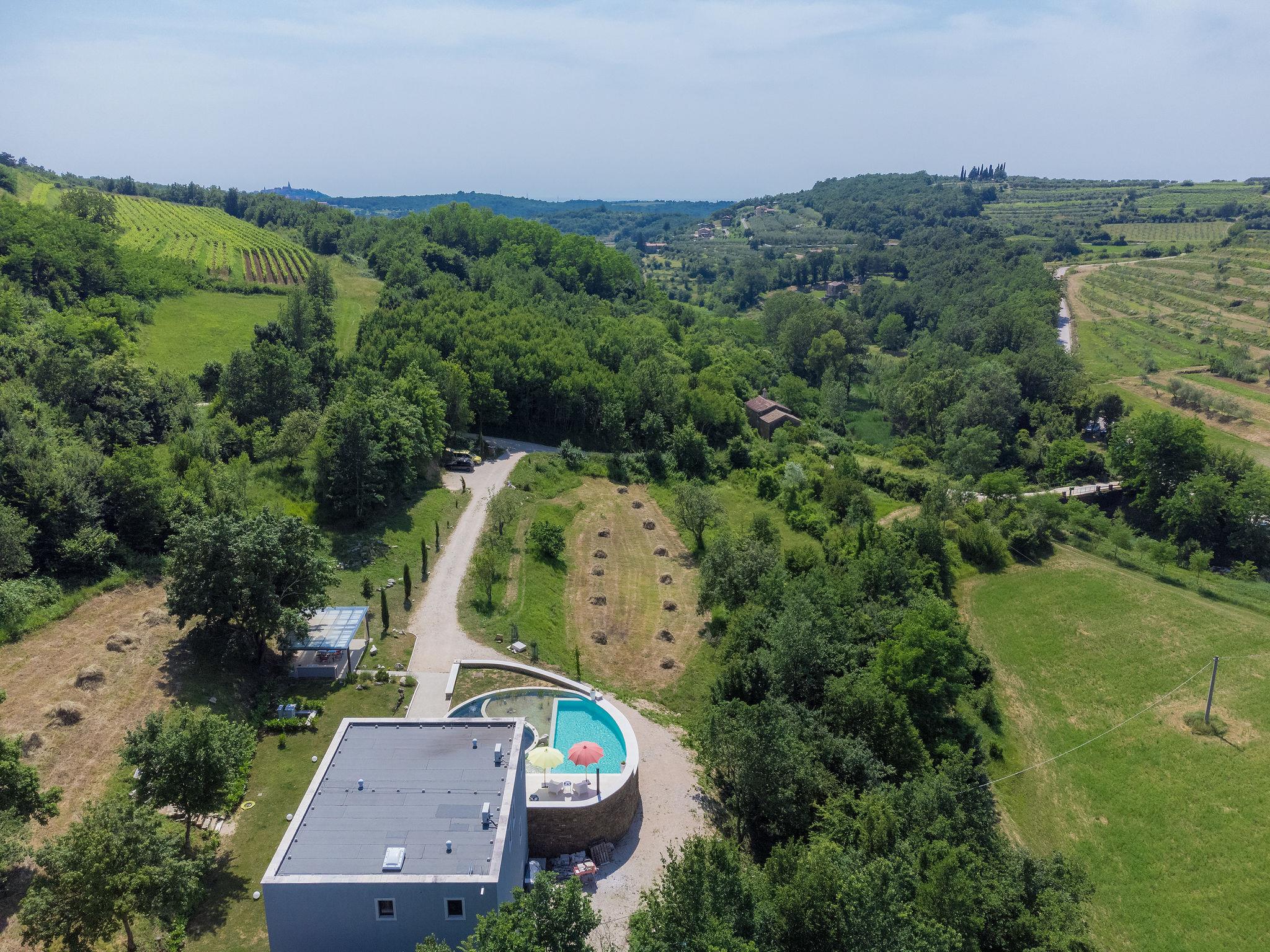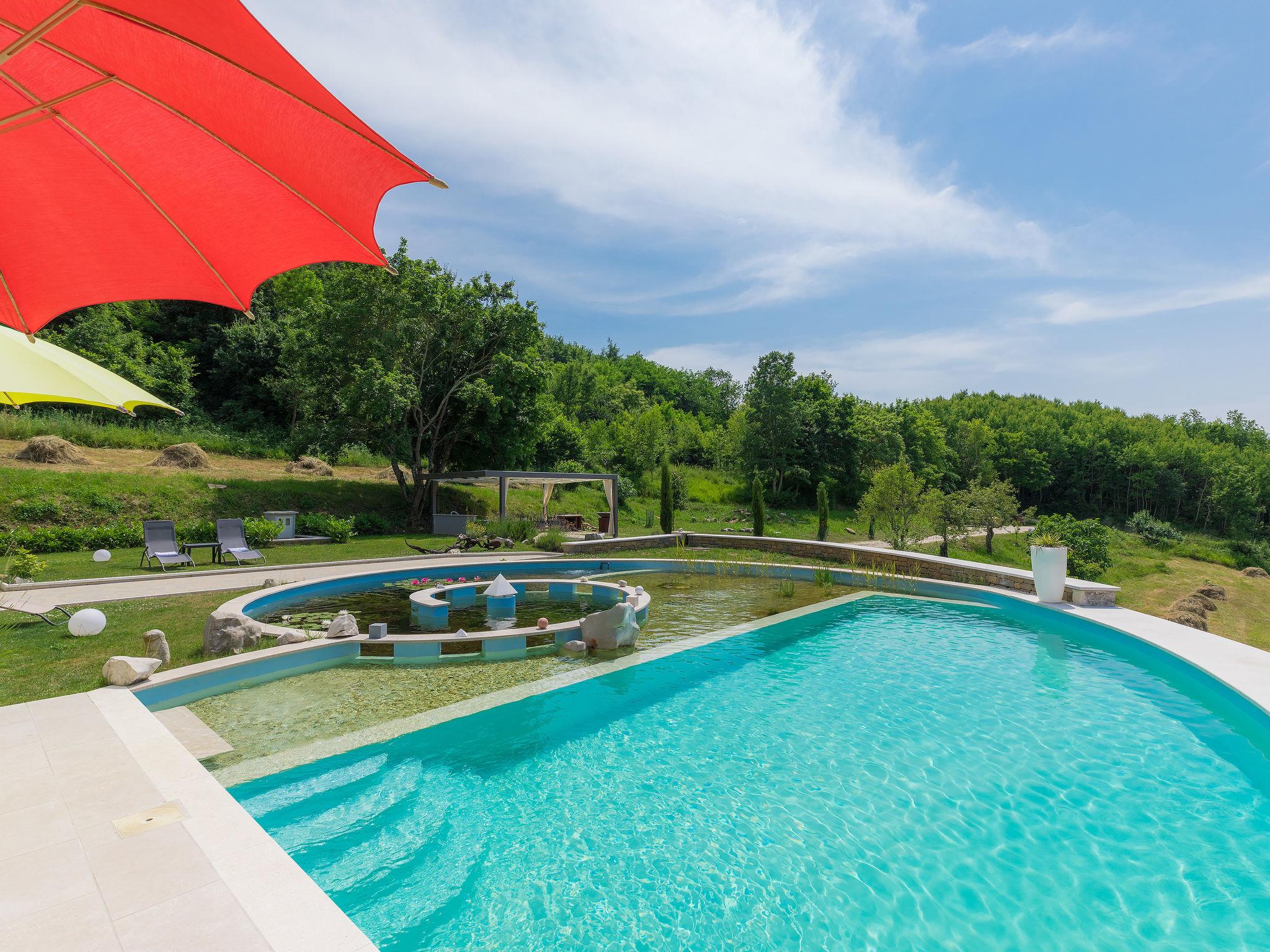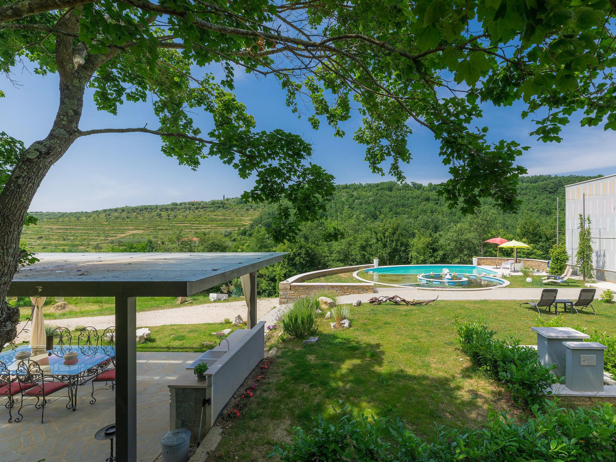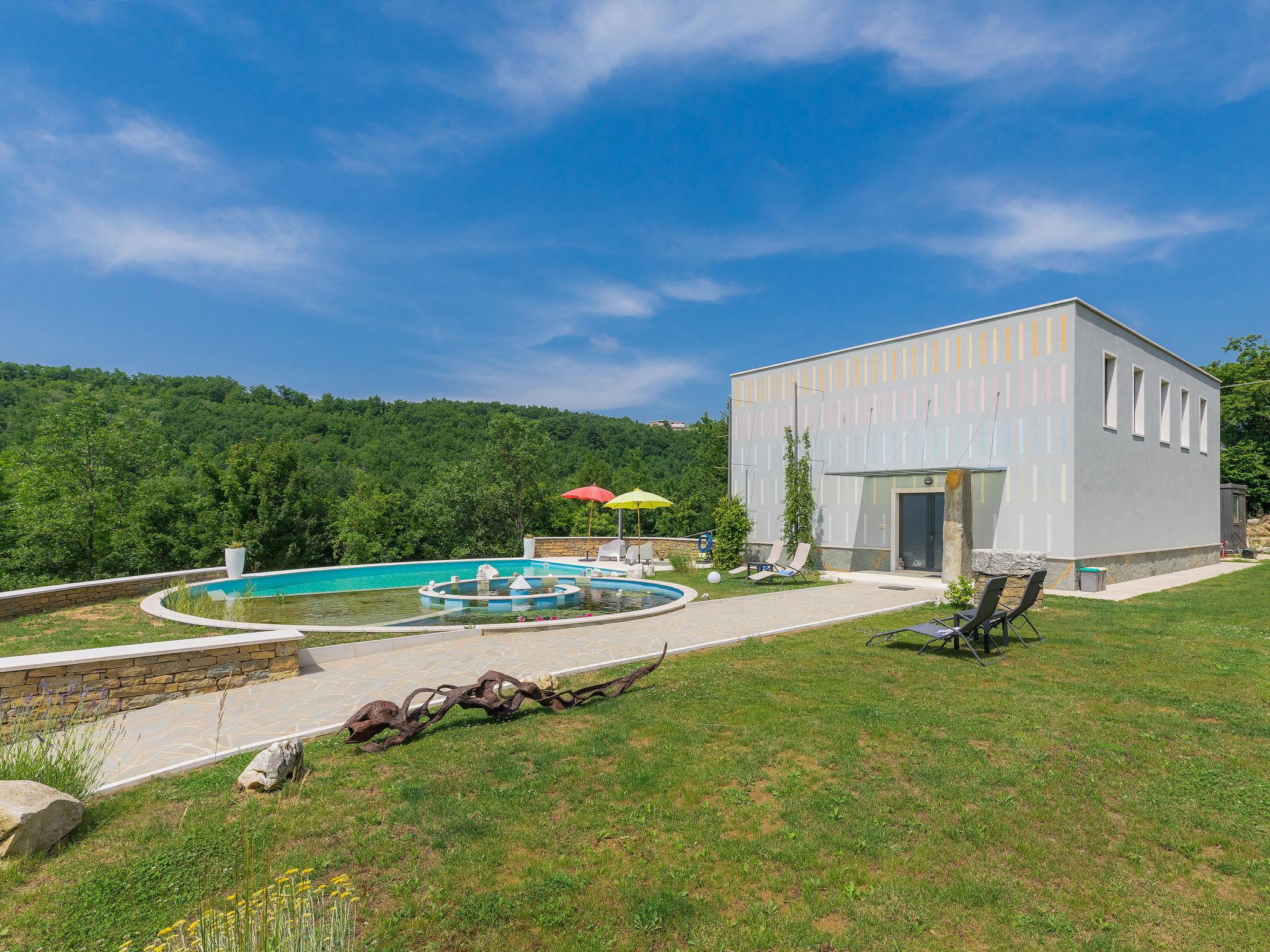 Momjan 5 km from Buje: Modern villa "Studio Gallery Bura", 2 storeys. 400 m from the centre of Momjan, 17 km from the centre of Umag, in a quiet, sunny position on a slope, 17 km from the sea, in the countryside. Private: property 10'000 m2, garden with lawn and trees, swimming pool (40 m2, depth 135 cm, seasonal availability: 15.May. - 01.Oct.) with internal staircase. Unconventional pool shape. Outdoor shower, terrace (35 m2), garden furniture, barbecue. In the house: internet access, washing machine. Motor access to the house (250 m via unmade road). Parking (for 4 cars) at the house on the premises. Shop 400 m, supermarket 5 km, restaurant 200 m, bus stop 10.8 km, pebble beach 17 km. Walking paths from the house 100 m, cycle lane 150 m. The owner does not accept any youth groups. The swimming pool for private use is a self-cleaning bio-swimming pool.