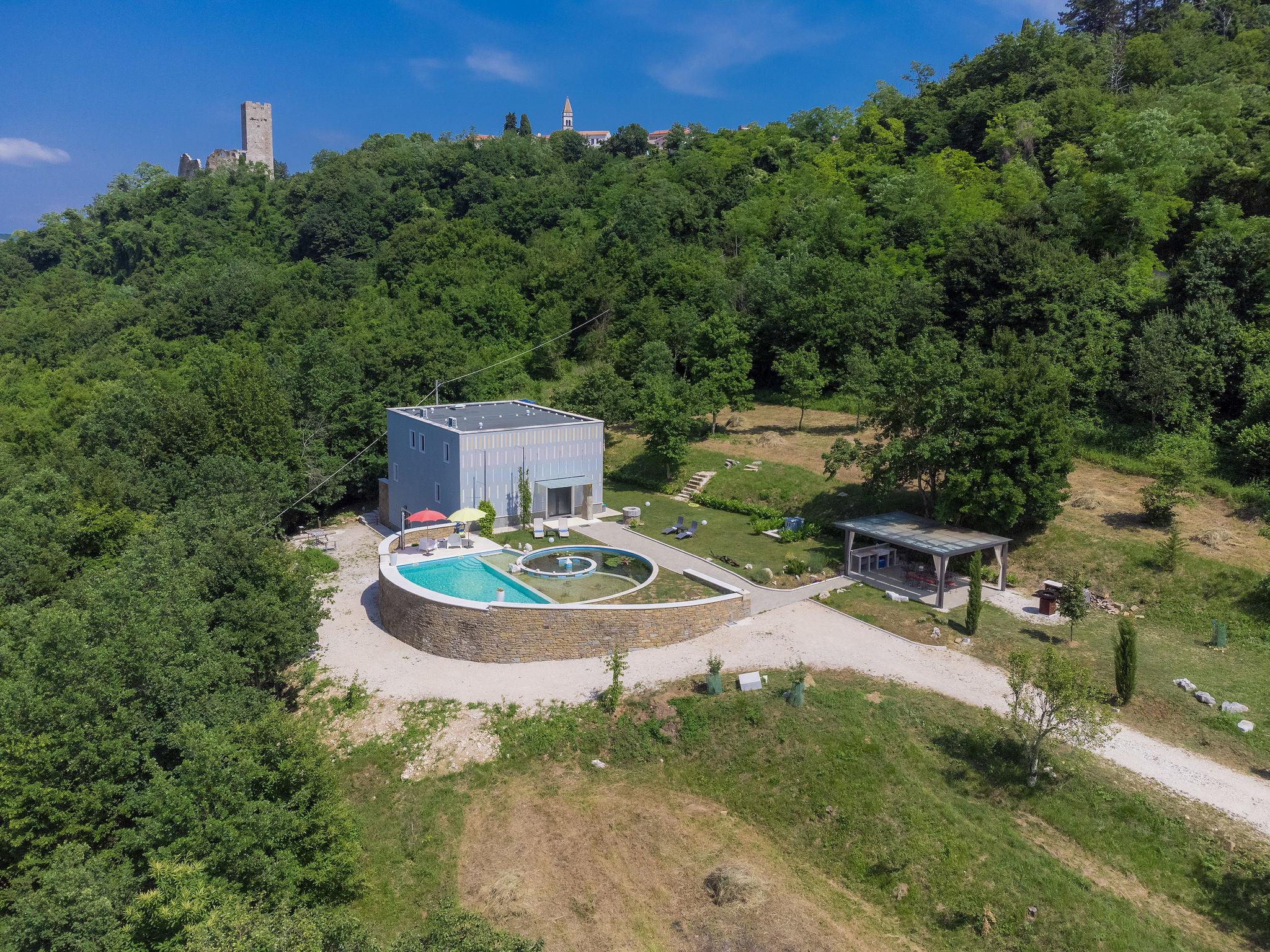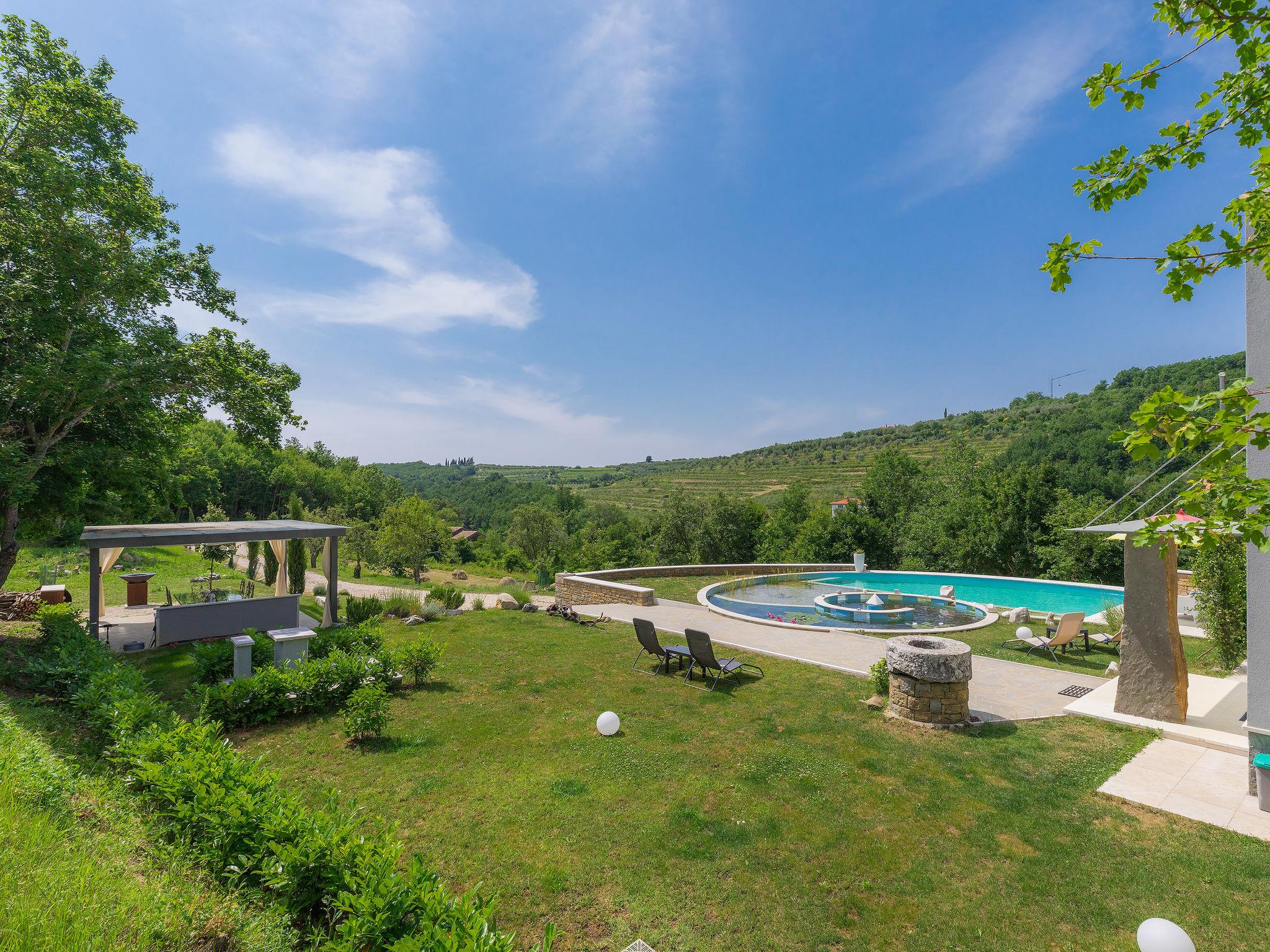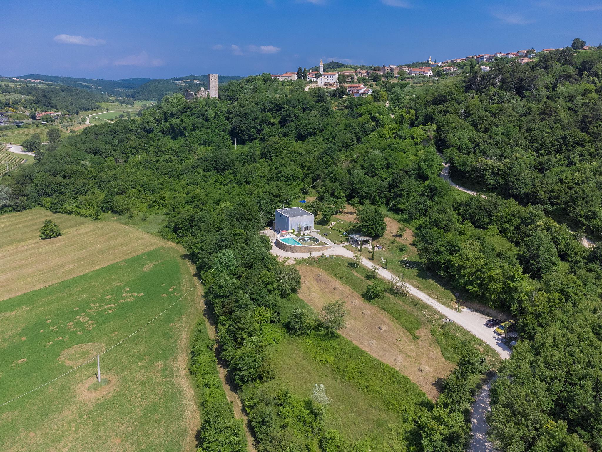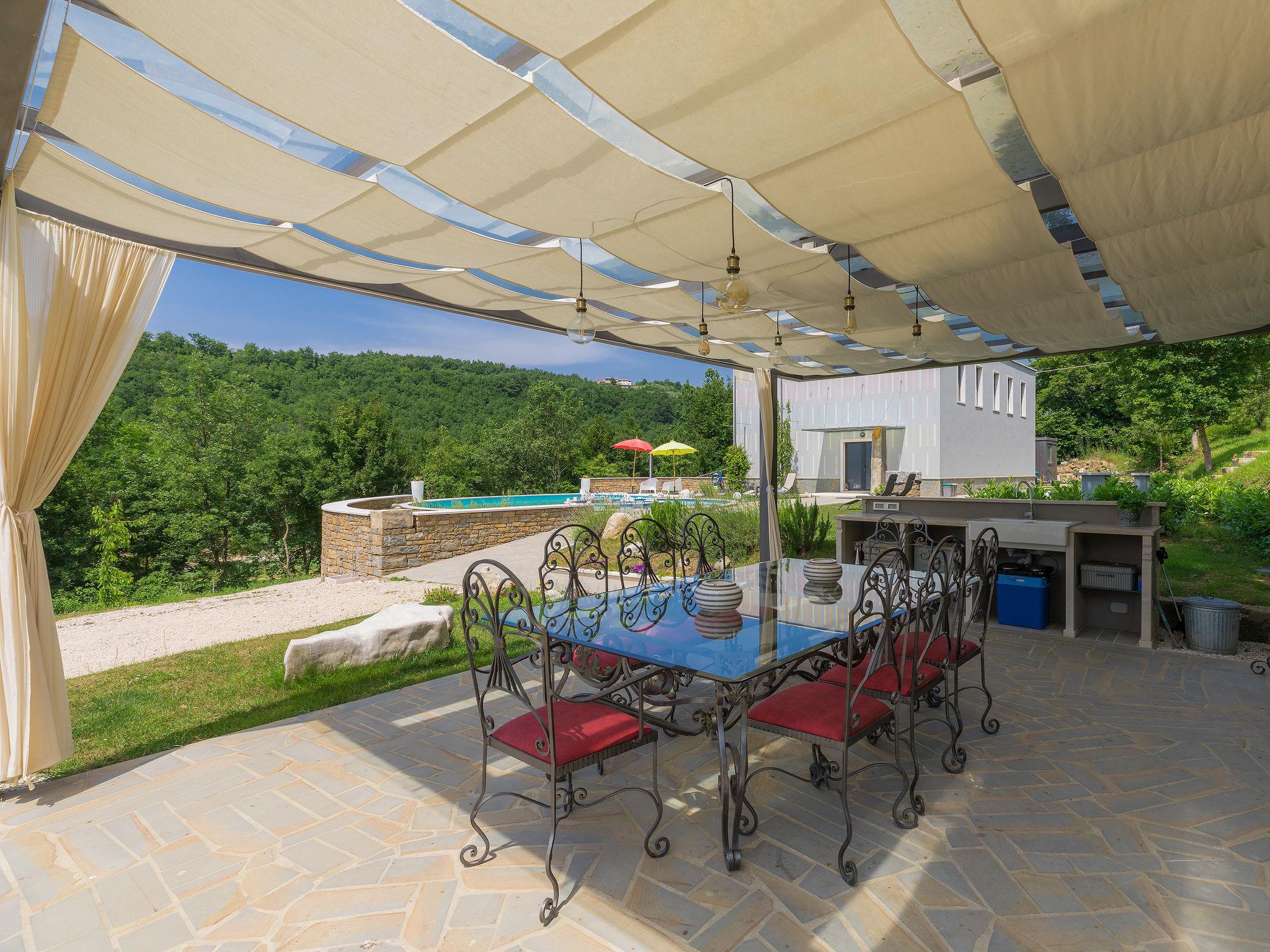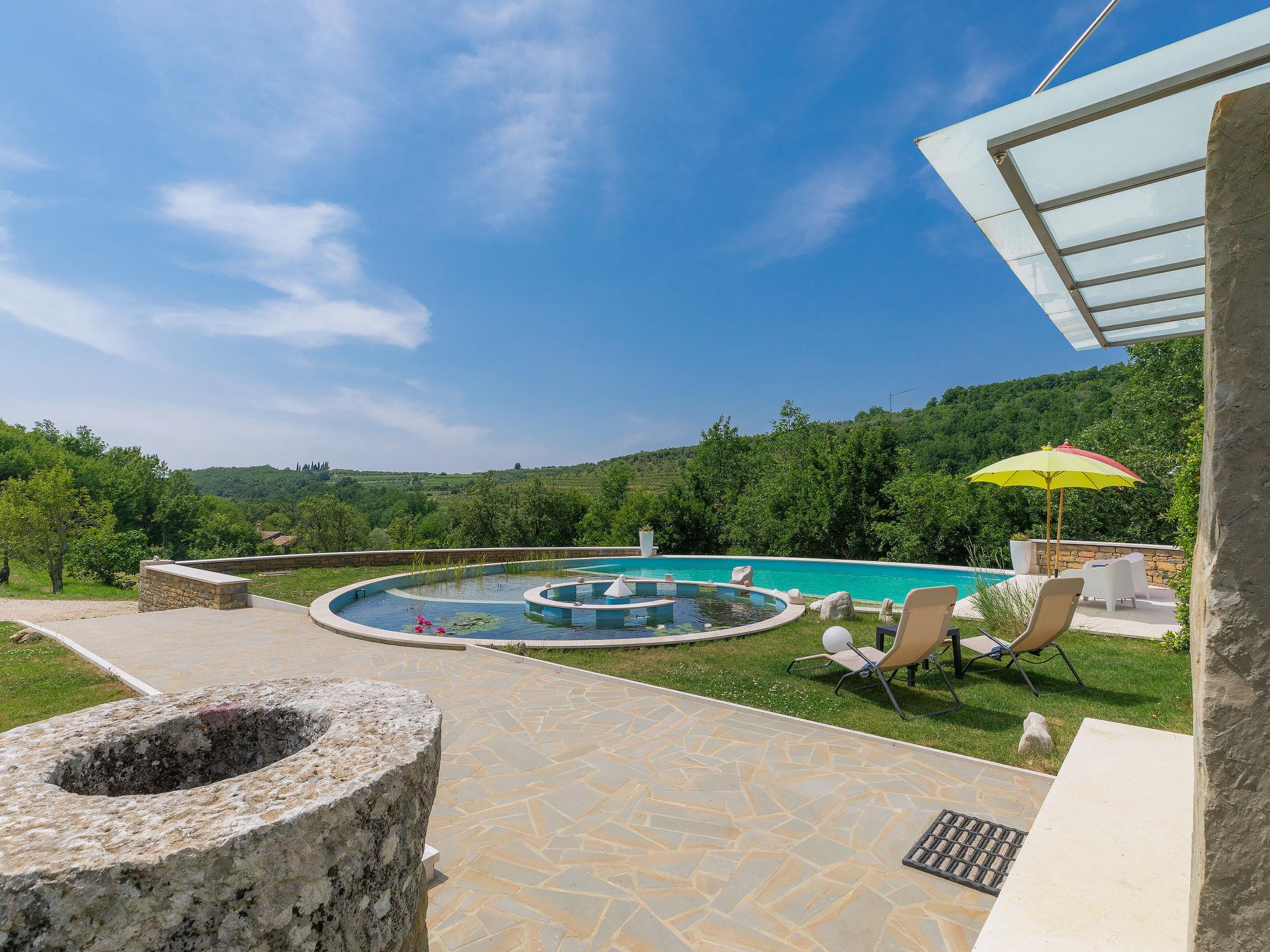 Momjan 5 km from Buje: Modern villa "Studio Gallery Bura", 2 storeys. 400 m from the centre of Momjan, 17 km from the centre of Umag, in a quiet, sunny position on a slope, 17 km from the sea, in the countryside. Private: property 10'000 m2, garden with lawn and trees, swimming pool (40 m2, depth 135 cm, seasonal availability: 15.May. - 01.Oct.) with internal staircase. Unconventional pool shape. Outdoor shower, terrace (35 m2), garden furniture, barbecue. In the house: internet access, washing machine. Motor access to the house (250 m via unmade road). Parking (for 4 cars) at the house on the premises. Shop 400 m, supermarket 5 km, restaurant 200 m, bus stop 10.8 km, pebble beach 17 km. Walking paths from the house 100 m, cycle lane 150 m. The owner does not accept any youth groups. The swimming pool for private use is a self-cleaning bio-swimming pool.