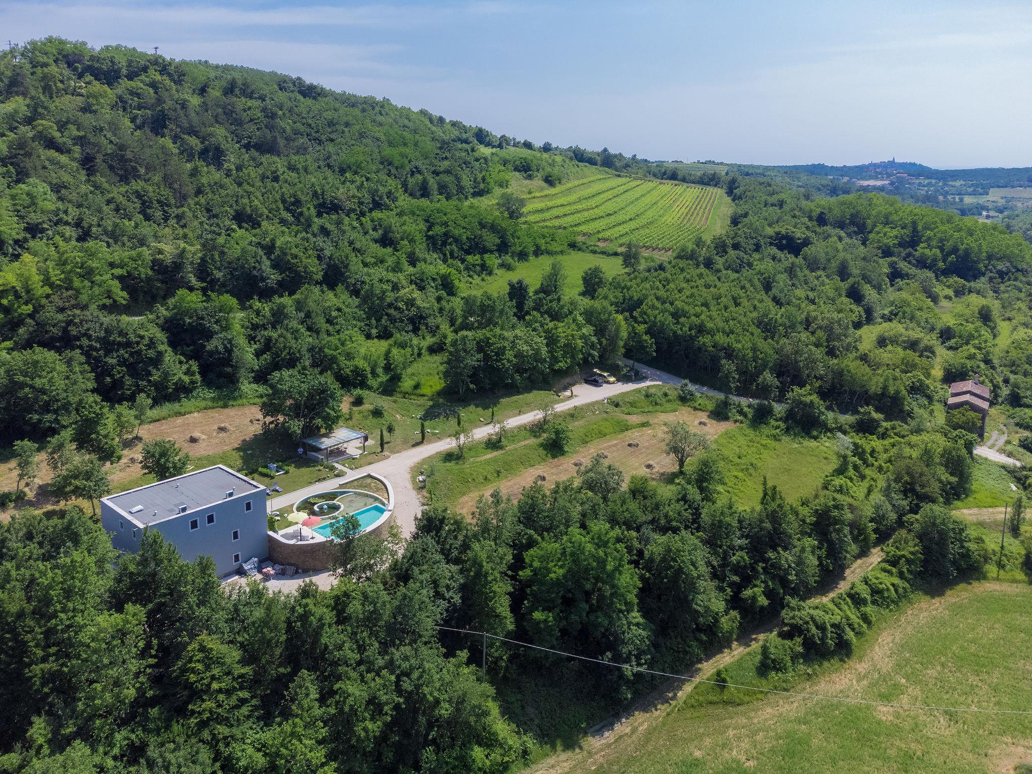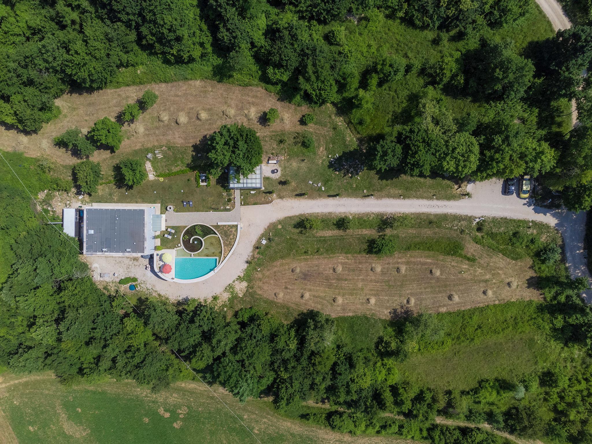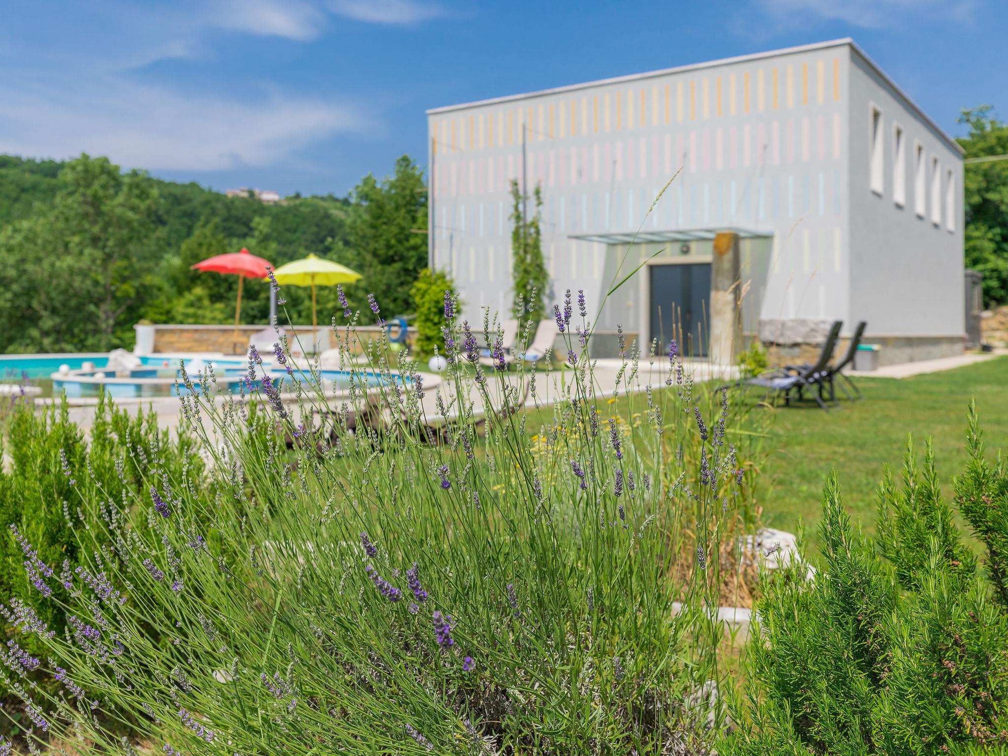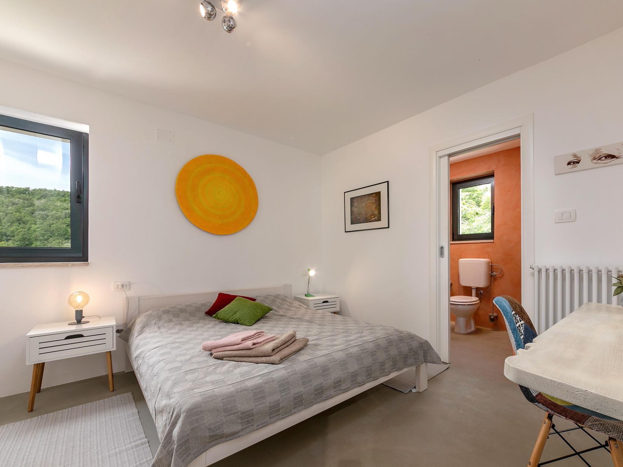Momjan 5 km from Buje: Modern villa "Studio Gallery Bura", 2 storeys. 400 m from the centre of Momjan, 17 km from the centre of Umag, in a quiet, sunny position on a slope, 17 km from the sea, in the countryside. Private: property 10'000 m2, garden with lawn and trees, swimming pool (40 m2, depth 135 cm, seasonal availability: 15.May. - 01.Oct.) with internal staircase. Unconventional pool shape. Outdoor shower, terrace (35 m2), garden furniture, barbecue. In the house: internet access, washing machine. Motor access to the house (250 m via unmade road). Parking (for 4 cars) at the house on the premises. Shop 400 m, supermarket 5 km, restaurant 200 m, bus stop 10.8 km, pebble beach 17 km. Walking paths from the house 100 m, cycle lane 150 m. The owner does not accept any youth groups. The swimming pool for private use is a self-cleaning bio-swimming pool.