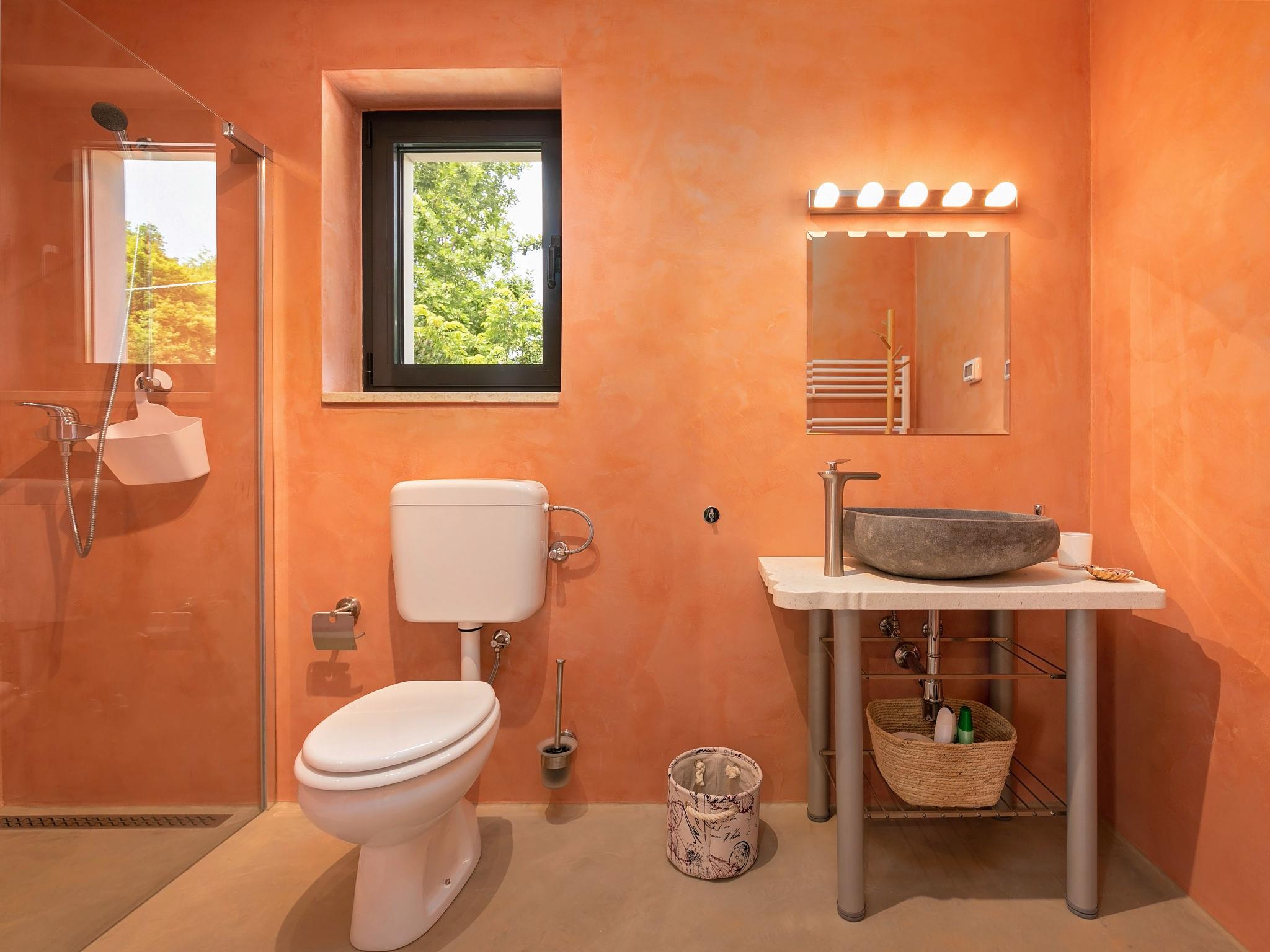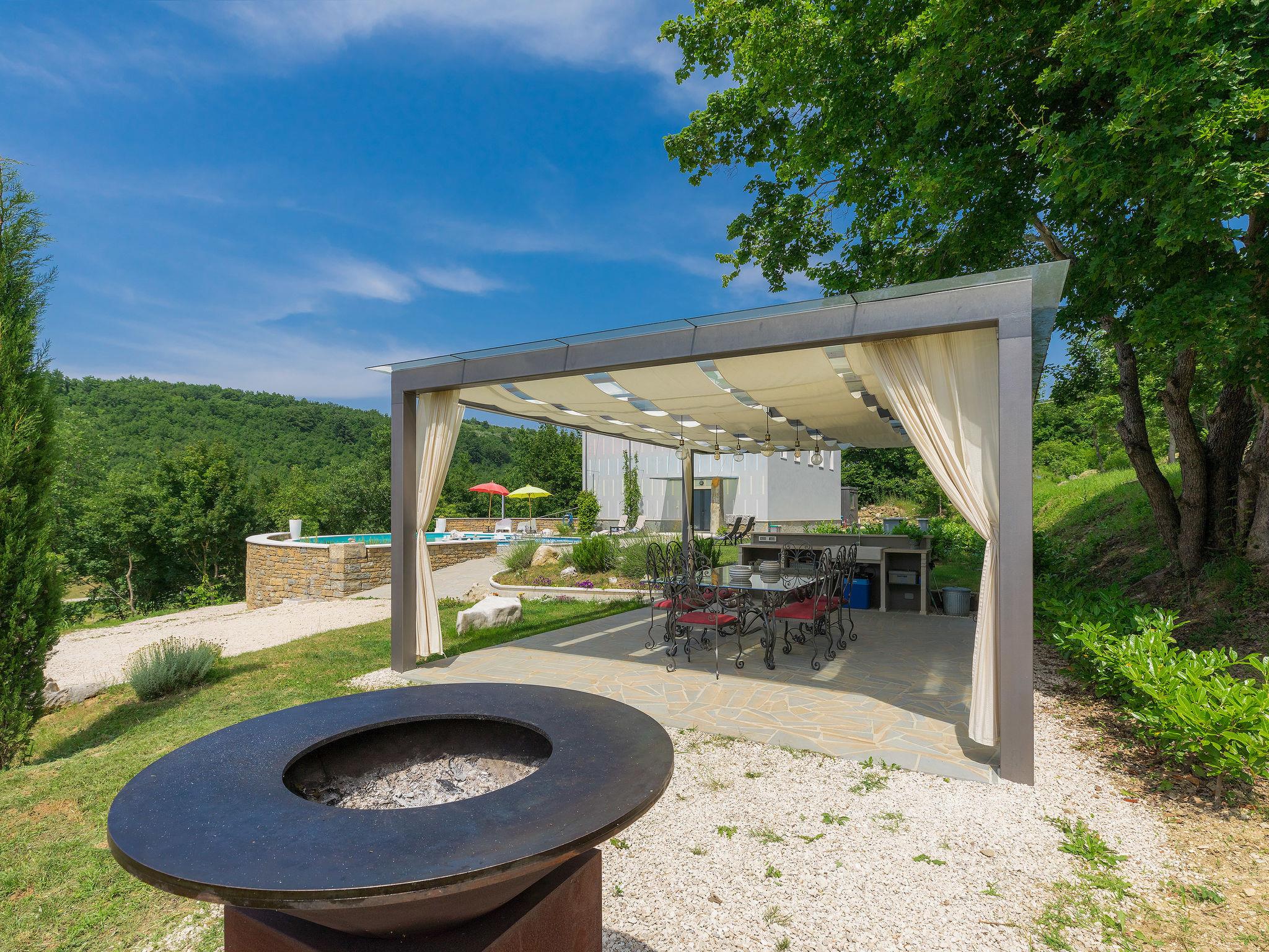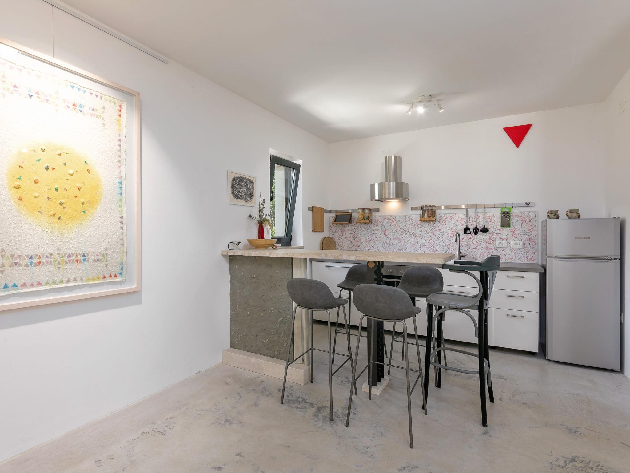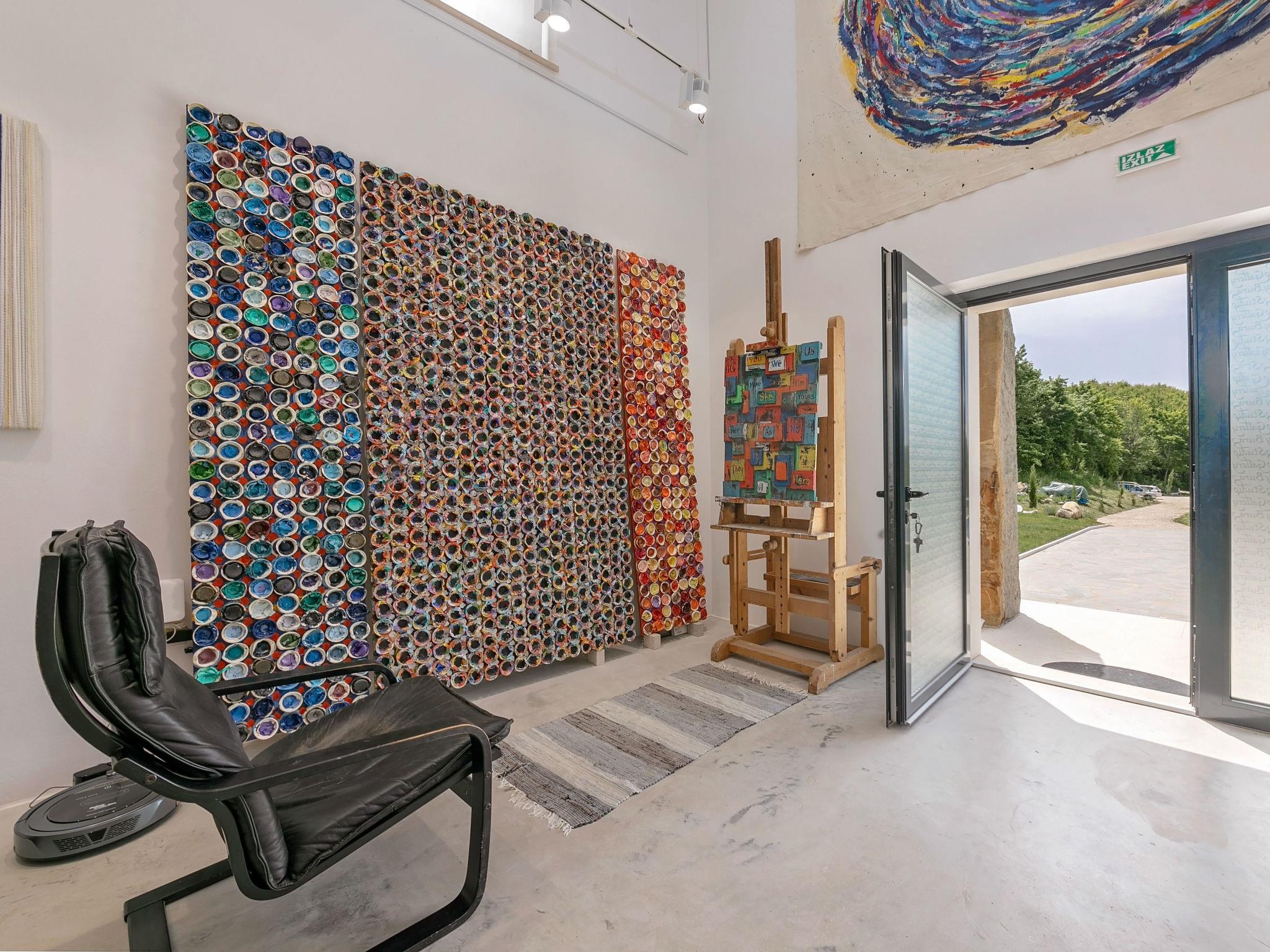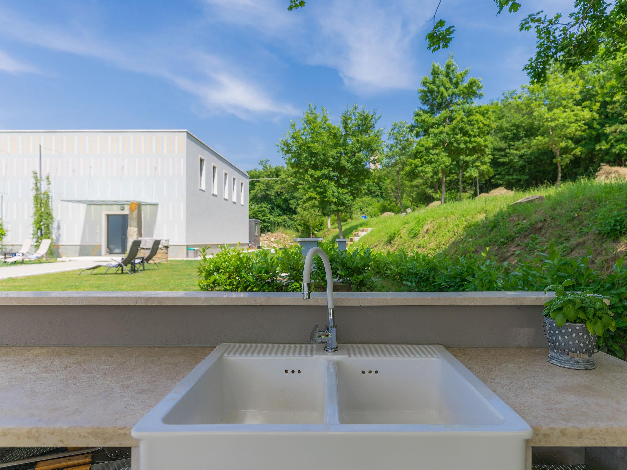 Momjan 5 km from Buje: Modern villa "Studio Gallery Bura", 2 storeys. 400 m from the centre of Momjan, 17 km from the centre of Umag, in a quiet, sunny position on a slope, 17 km from the sea, in the countryside. Private: property 10'000 m2, garden with lawn and trees, swimming pool (40 m2, depth 135 cm, seasonal availability: 15.May. - 01.Oct.) with internal staircase. Unconventional pool shape. Outdoor shower, terrace (35 m2), garden furniture, barbecue. In the house: internet access, washing machine. Motor access to the house (250 m via unmade road). Parking (for 4 cars) at the house on the premises. Shop 400 m, supermarket 5 km, restaurant 200 m, bus stop 10.8 km, pebble beach 17 km. Walking paths from the house 100 m, cycle lane 150 m. The owner does not accept any youth groups. The swimming pool for private use is a self-cleaning bio-swimming pool.