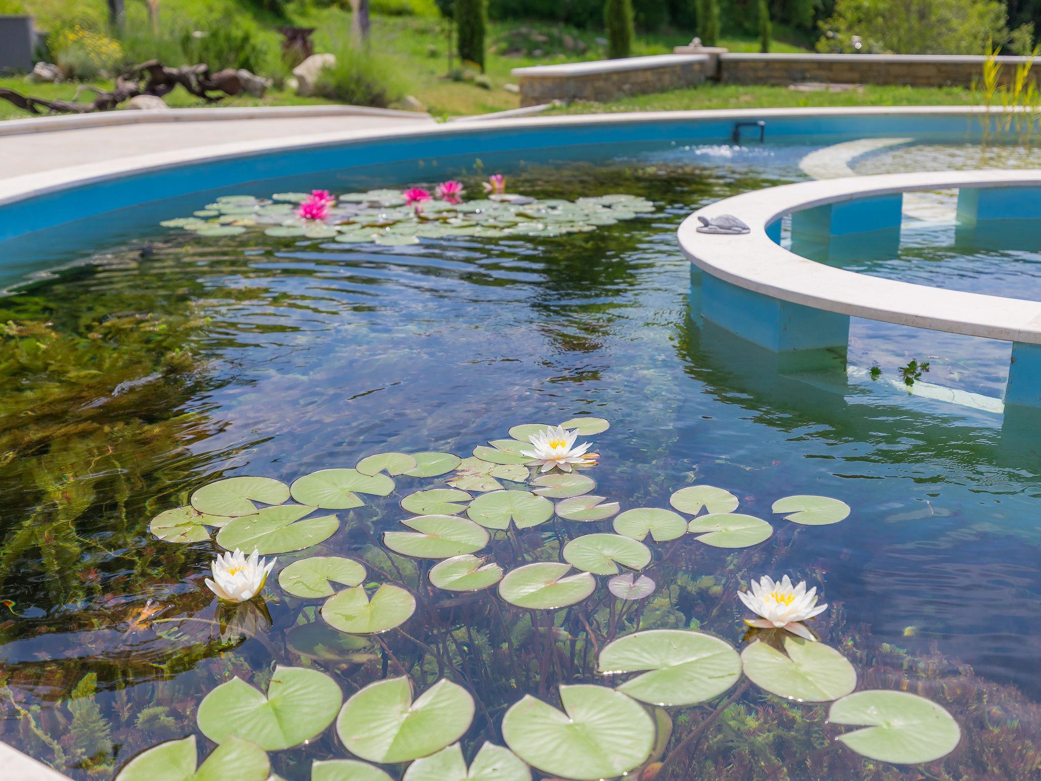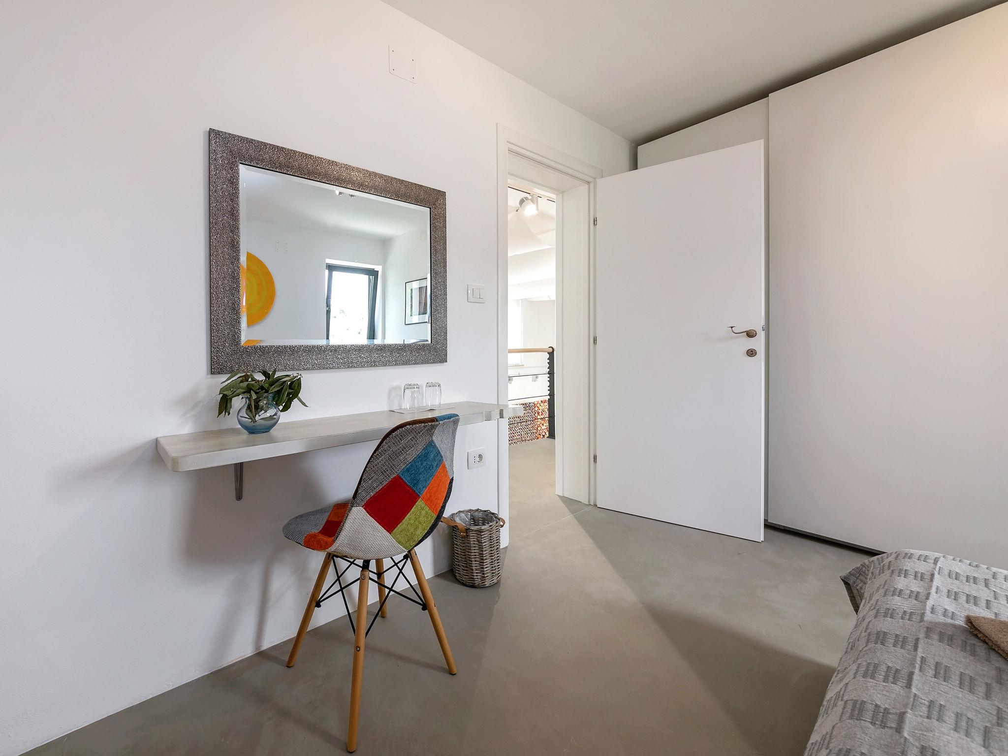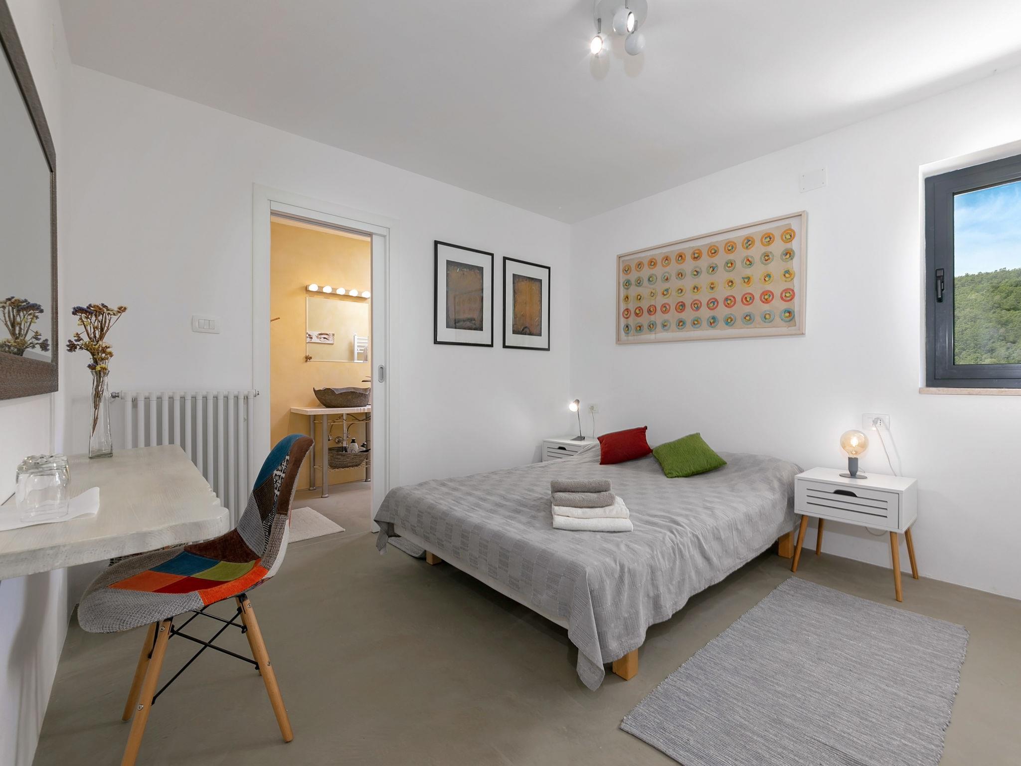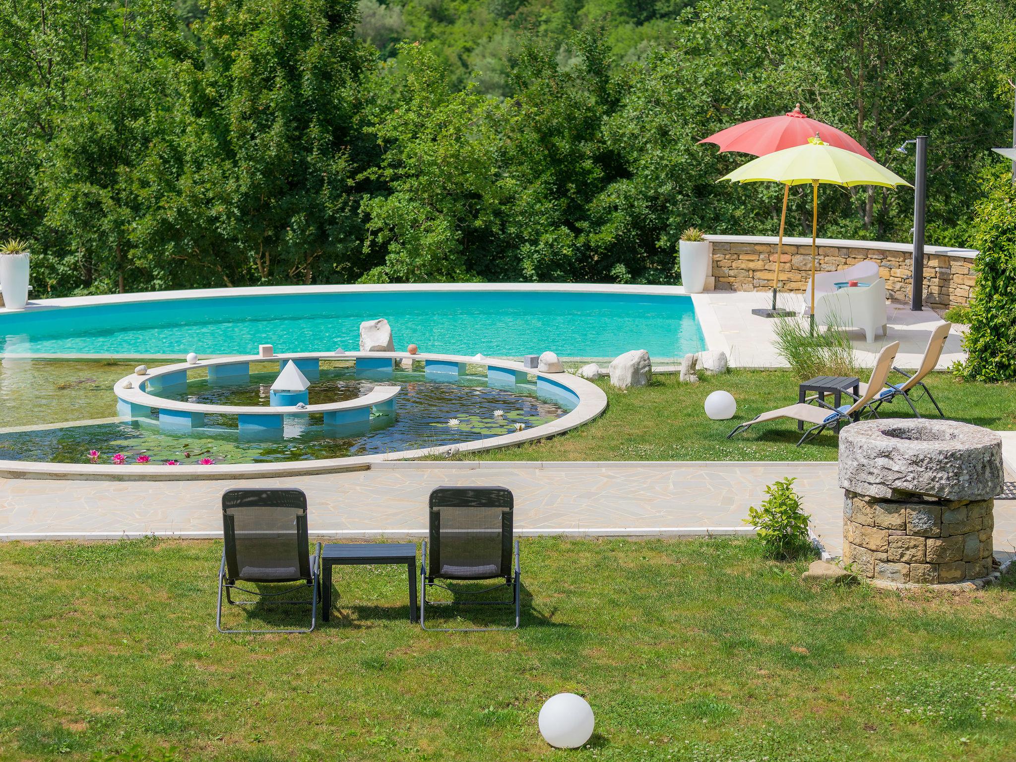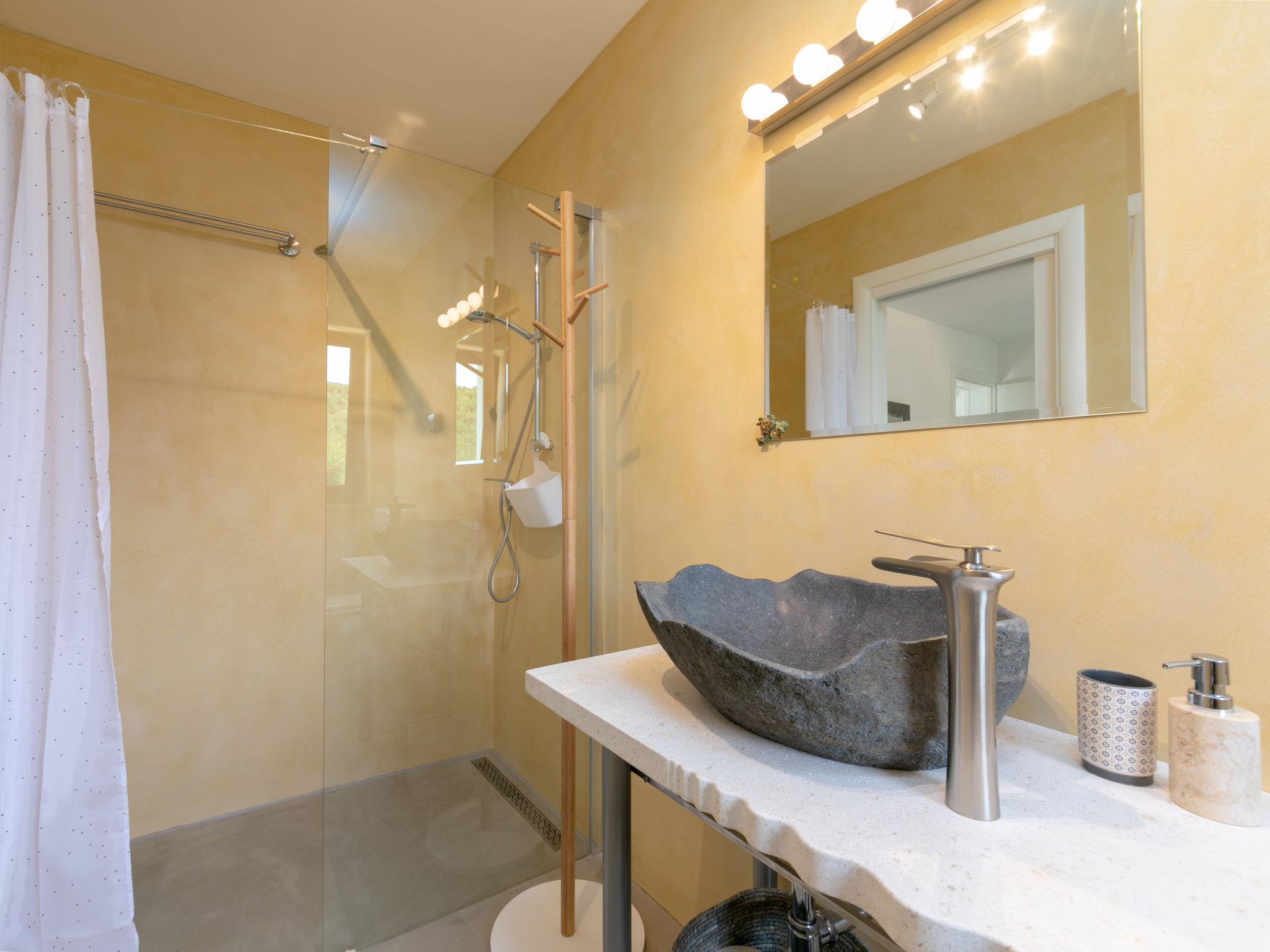 Momjan 5 km from Buje: Modern villa "Studio Gallery Bura", 2 storeys. 400 m from the centre of Momjan, 17 km from the centre of Umag, in a quiet, sunny position on a slope, 17 km from the sea, in the countryside. Private: property 10'000 m2, garden with lawn and trees, swimming pool (40 m2, depth 135 cm, seasonal availability: 15.May. - 01.Oct.) with internal staircase. Unconventional pool shape. Outdoor shower, terrace (35 m2), garden furniture, barbecue. In the house: internet access, washing machine. Motor access to the house (250 m via unmade road). Parking (for 4 cars) at the house on the premises. Shop 400 m, supermarket 5 km, restaurant 200 m, bus stop 10.8 km, pebble beach 17 km. Walking paths from the house 100 m, cycle lane 150 m. The owner does not accept any youth groups. The swimming pool for private use is a self-cleaning bio-swimming pool.