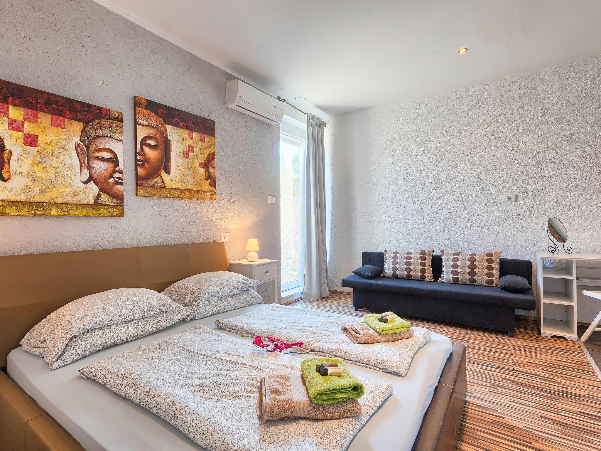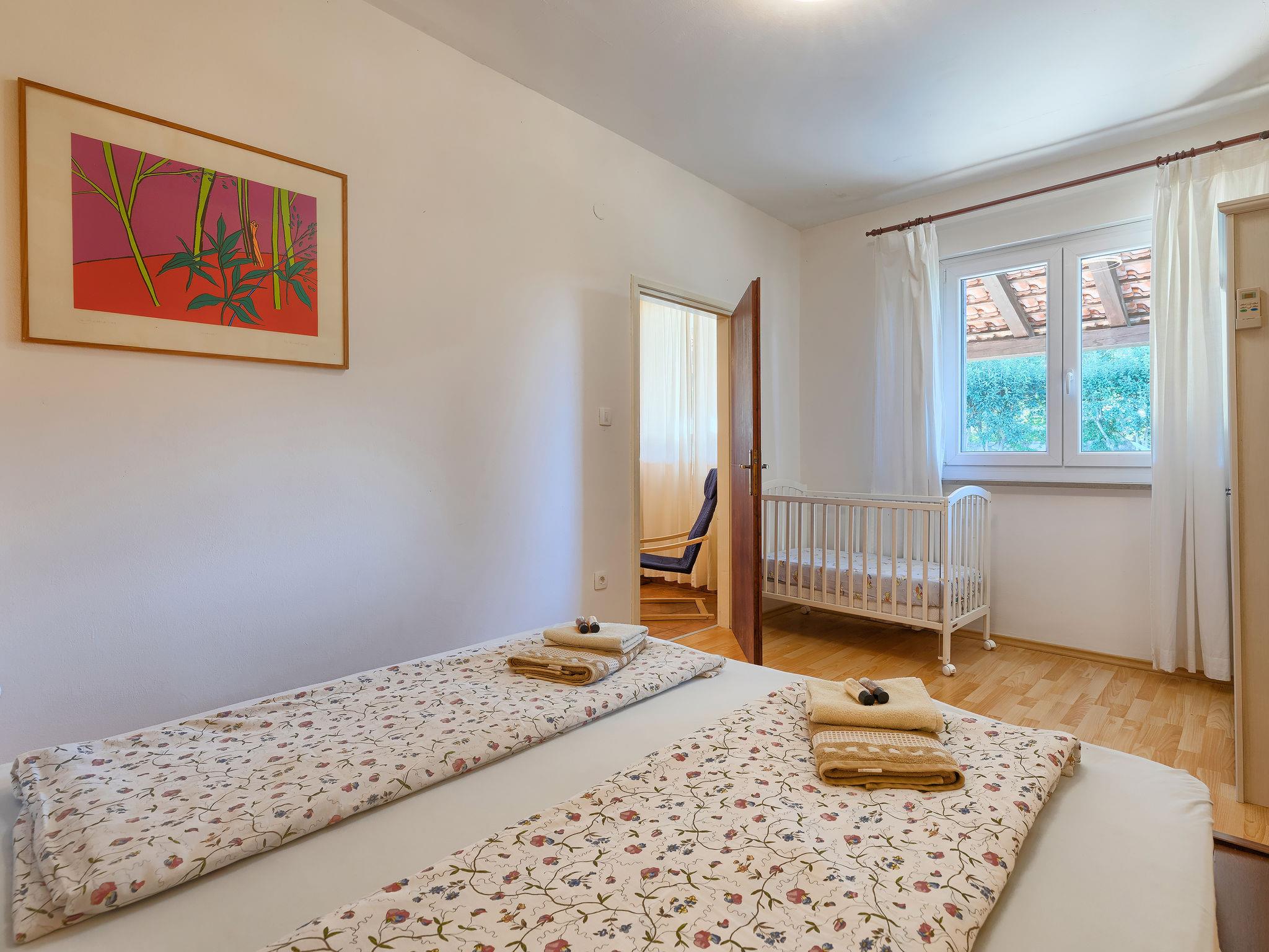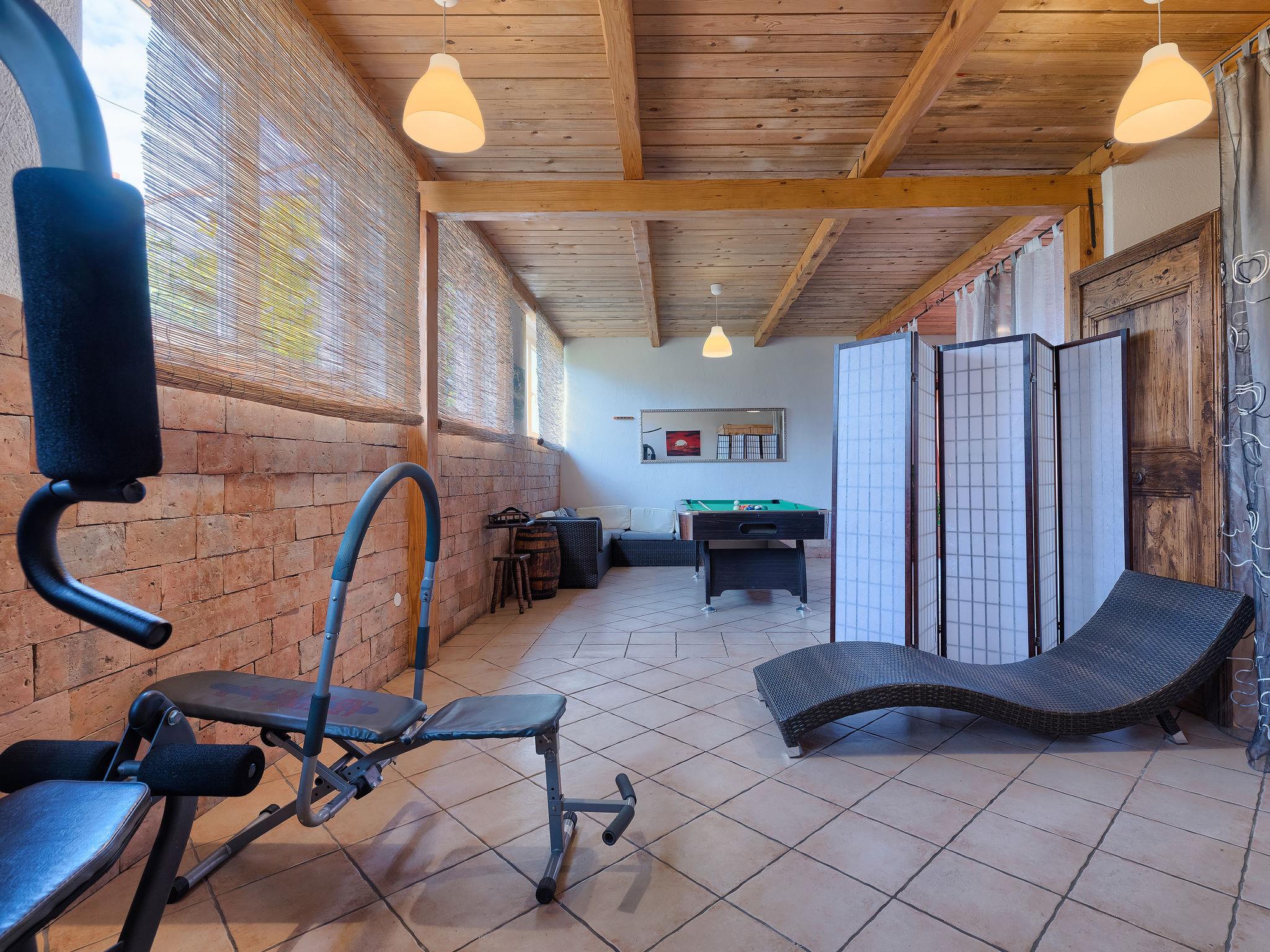 7-room house 300 m2. Living/dining room with 1 double sofabed, satellite TV, DVD and air conditioning. Exit to the terrace. Living room with satellite TV. Exit to the terrace, to the swimming pool. 1 room with 1 double bed (2 x 80 cm, length 200 cm), air conditioning. 3 rooms, each room with 1 french bed (160 cm, length 200 cm), shower/WC, satellite TV and air conditioning. 1 room with 1 french bed (160 cm, length 200 cm). Open kitchen (4 hot plates, oven, dishwasher, microwave, freezer). Bath/WC, 2 sep. WC's. Wood heating. Terrace 15 m2, roofed, terrace 20 m2, roofed. Terrace furniture, barbecue. View of the garden. Facilities: baby cot. Internet (WiFi, free). Maximum 2 pets/ dogs allowed.