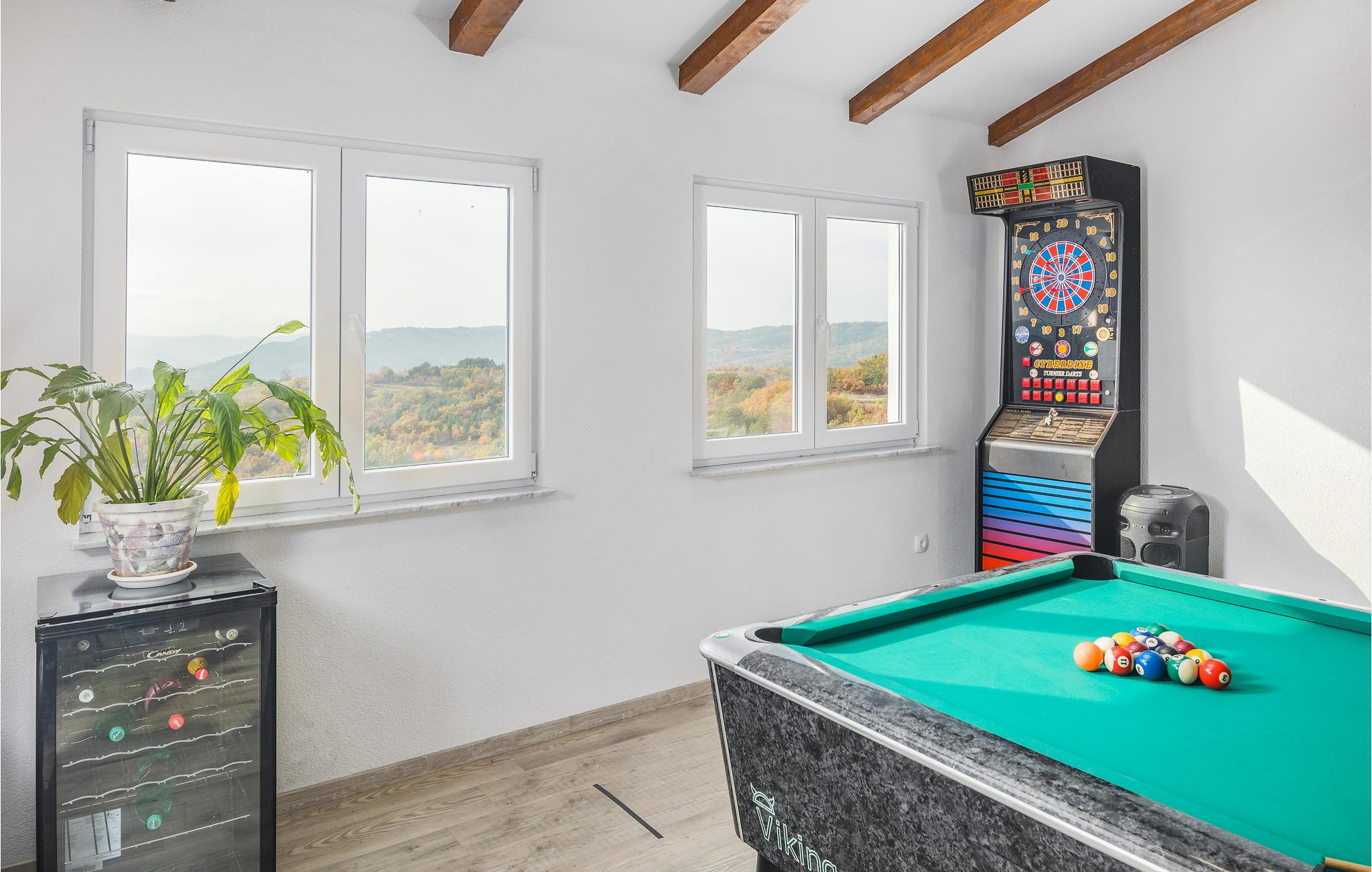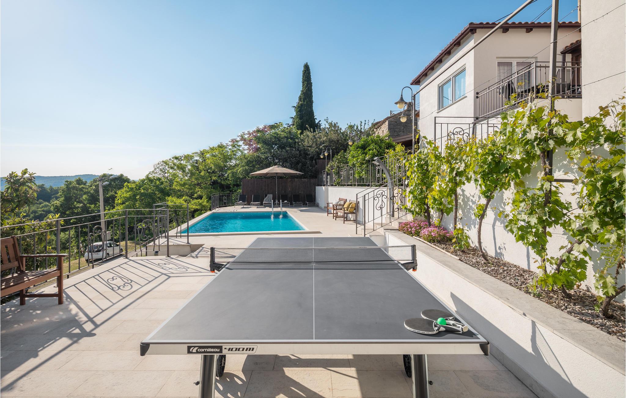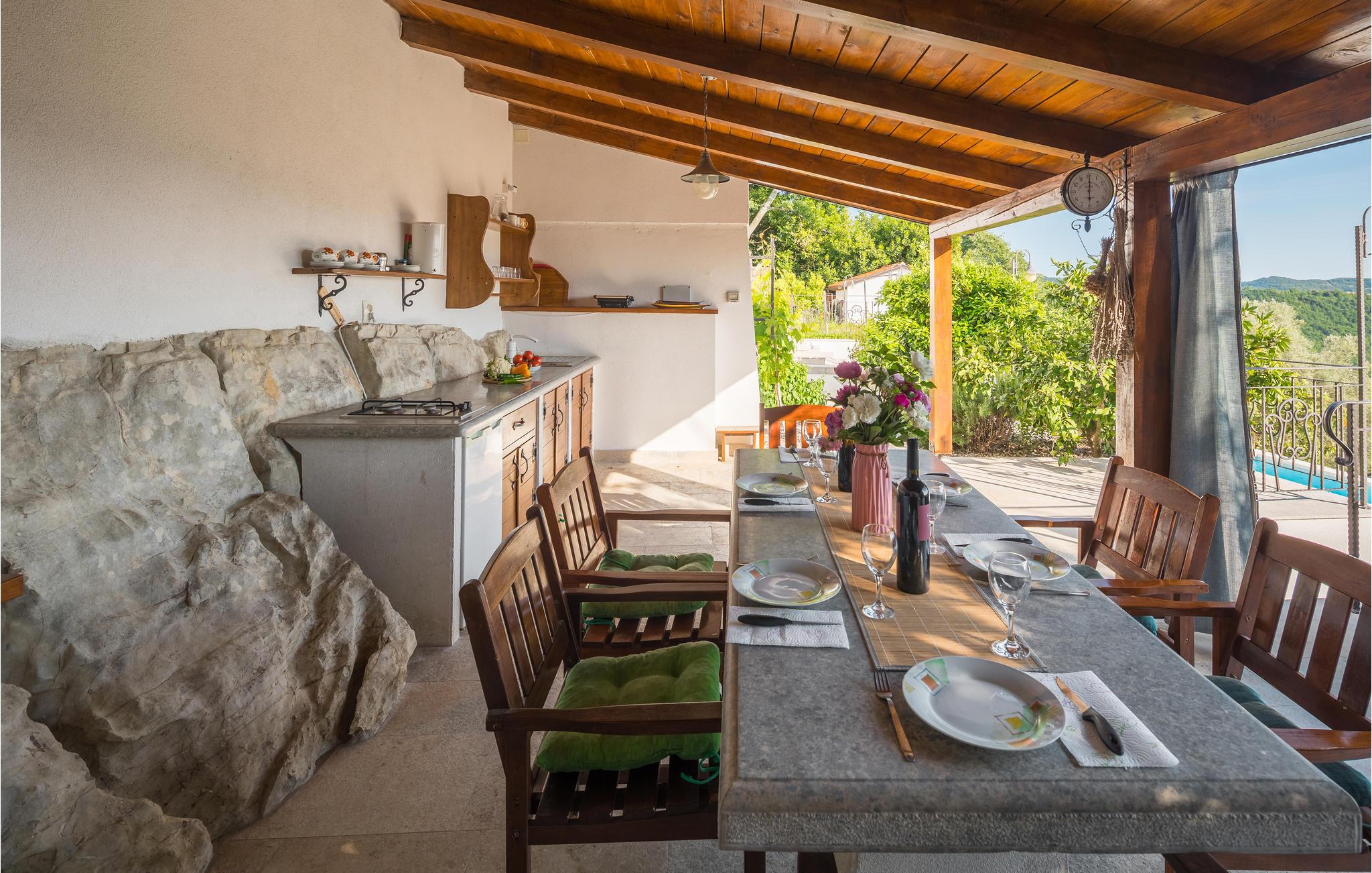 I bakkerne over byen Buzet ligger dette feriehus. Det er omgivet af frodigt grønt, luften er fisk og ren, her vil alle der holder af lange spadsereture i uberørt natur og skønne lune sommernætter føle sig helt hjemme. Nyd morgenkaffen på terrassen og slut dagen af samme sted, med et køligt glas vin, med udsigten over landskaberne hvor tusmørket langsomt breder sig. Lige ved siden af poolen er et udendørs køkken. Et af toiletterne kan kun tilgås udefra. Besøg Buzet og regionens andre byer som Groznjan og Motovun, hvor der er mange arrangementer i sommermånederne.