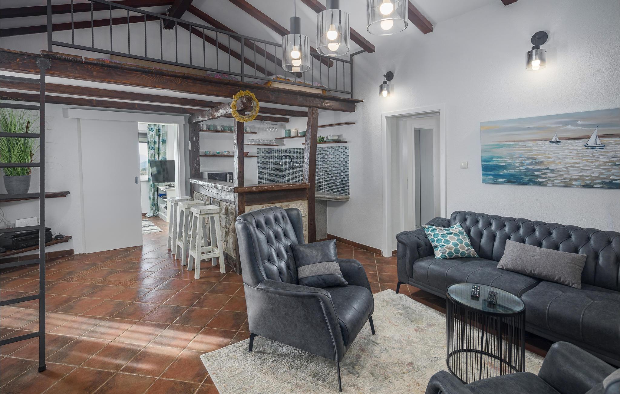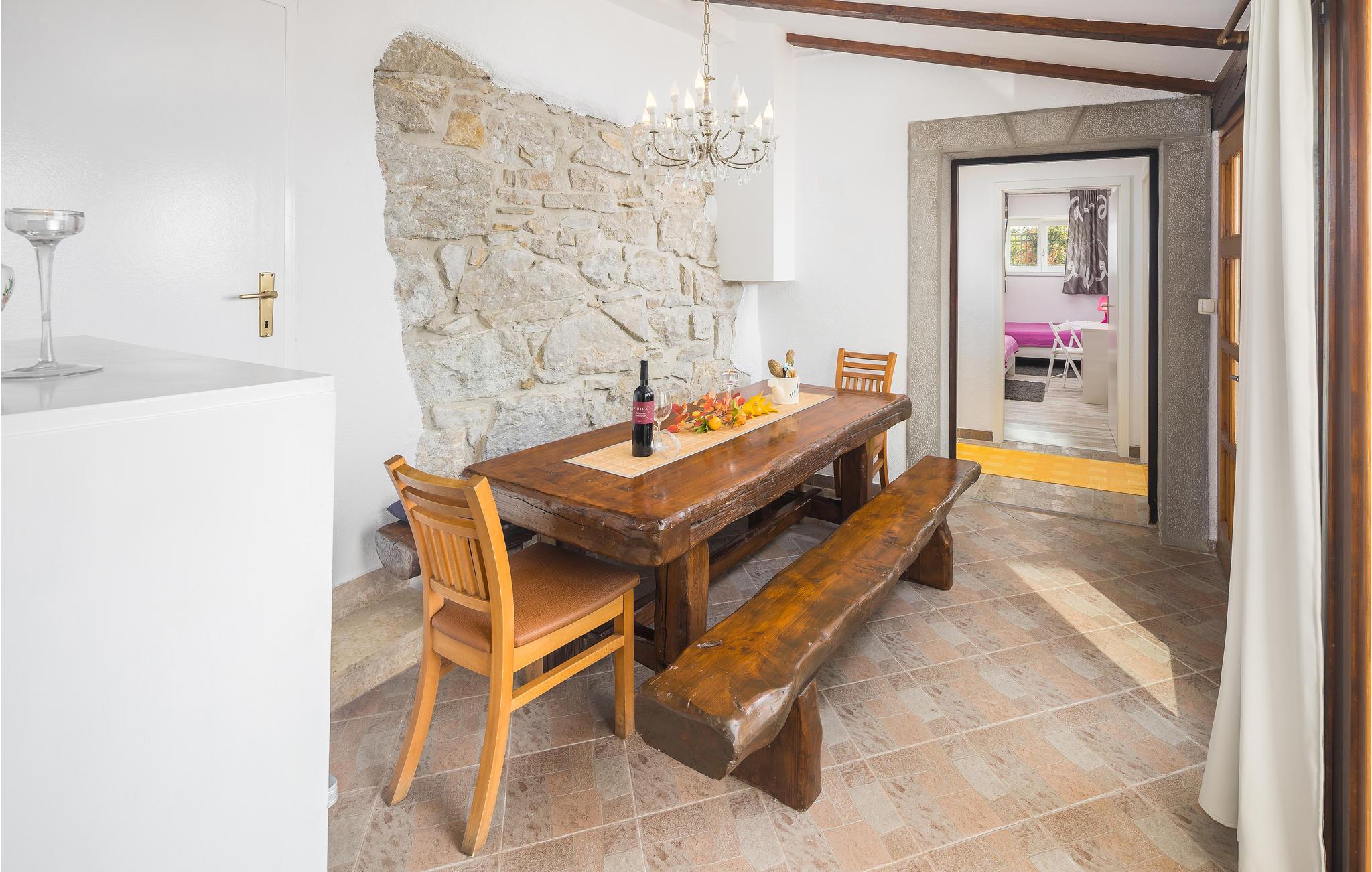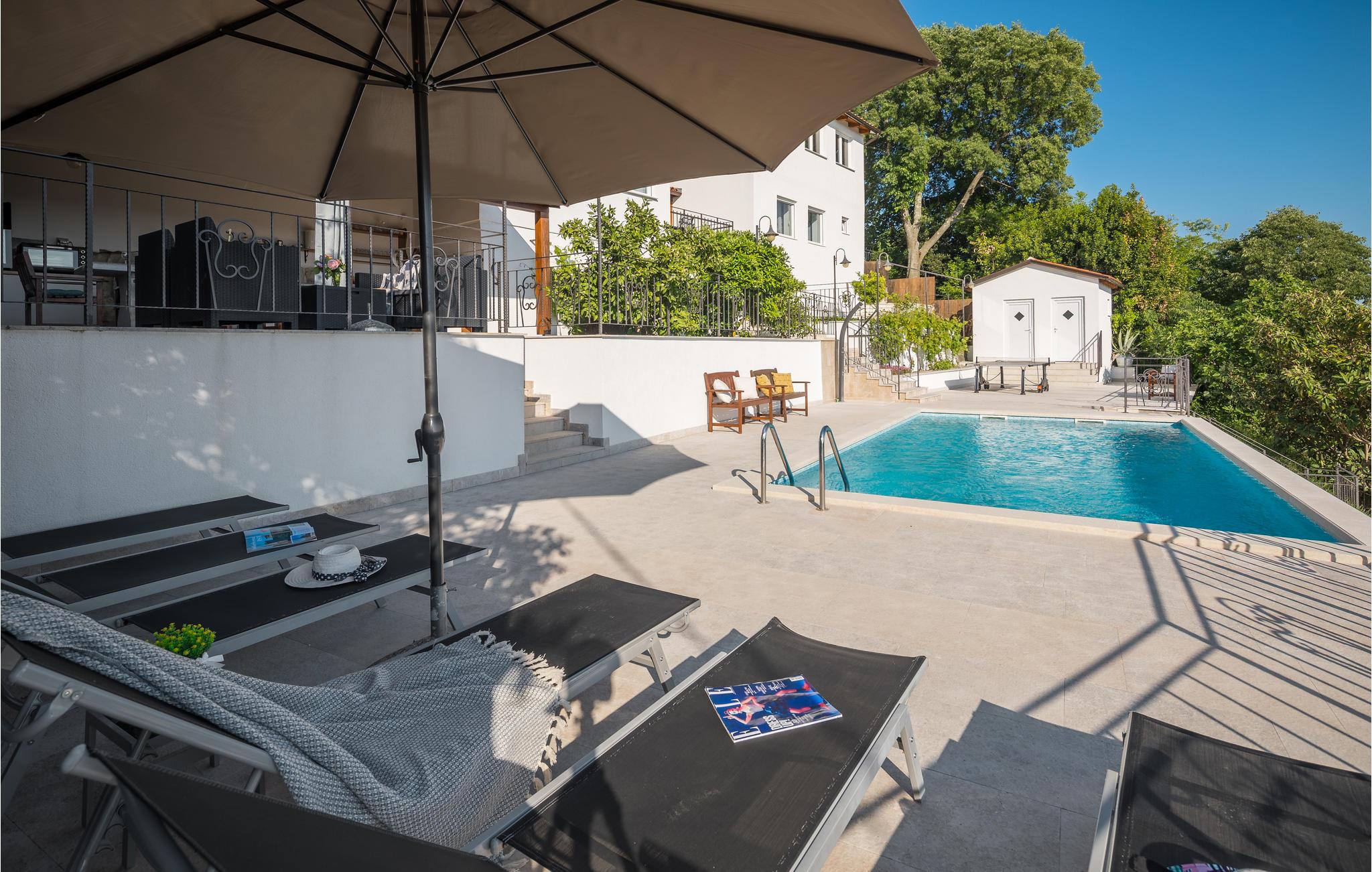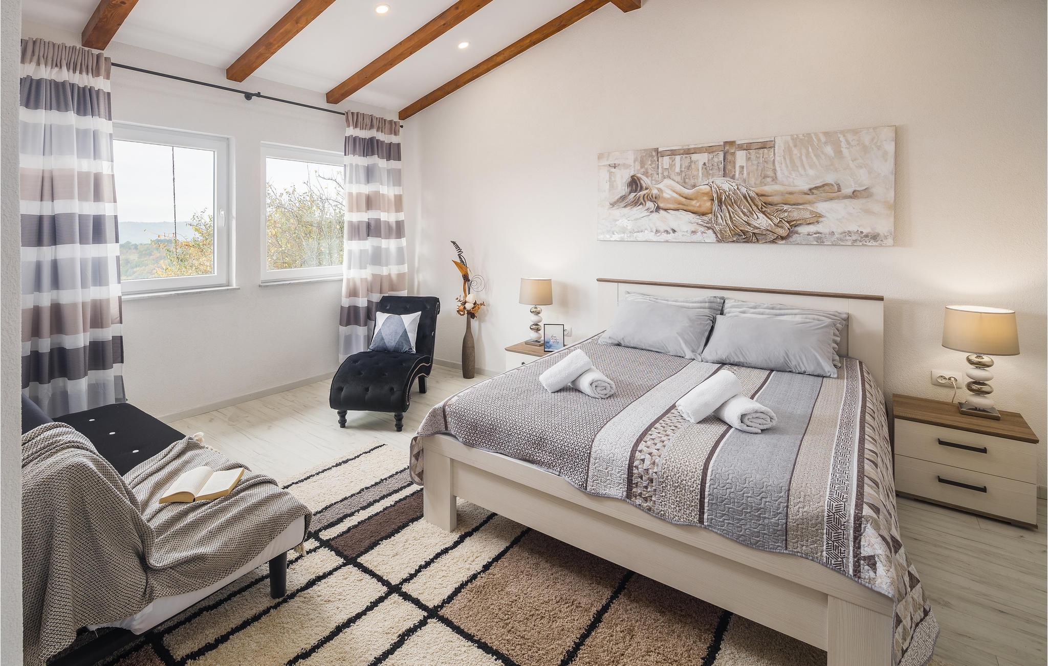 I bakkerne over byen Buzet ligger dette feriehus. Det er omgivet af frodigt grønt, luften er fisk og ren, her vil alle der holder af lange spadsereture i uberørt natur og skønne lune sommernætter føle sig helt hjemme. Nyd morgenkaffen på terrassen og slut dagen af samme sted, med et køligt glas vin, med udsigten over landskaberne hvor tusmørket langsomt breder sig. Lige ved siden af poolen er et udendørs køkken. Et af toiletterne kan kun tilgås udefra. Besøg Buzet og regionens andre byer som Groznjan og Motovun, hvor der er mange arrangementer i sommermånederne.