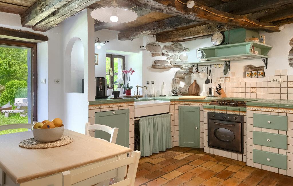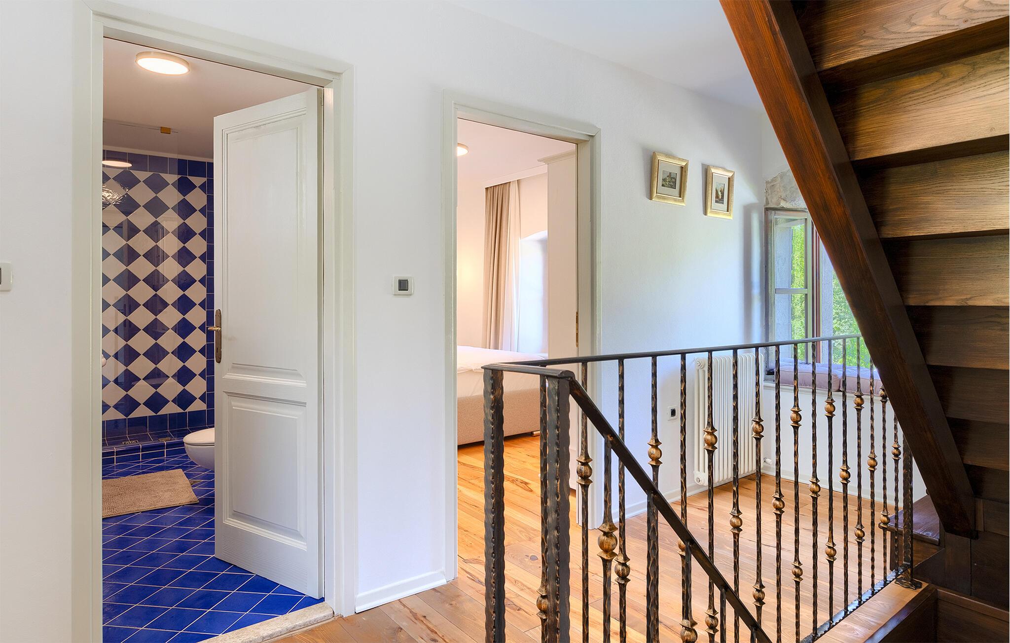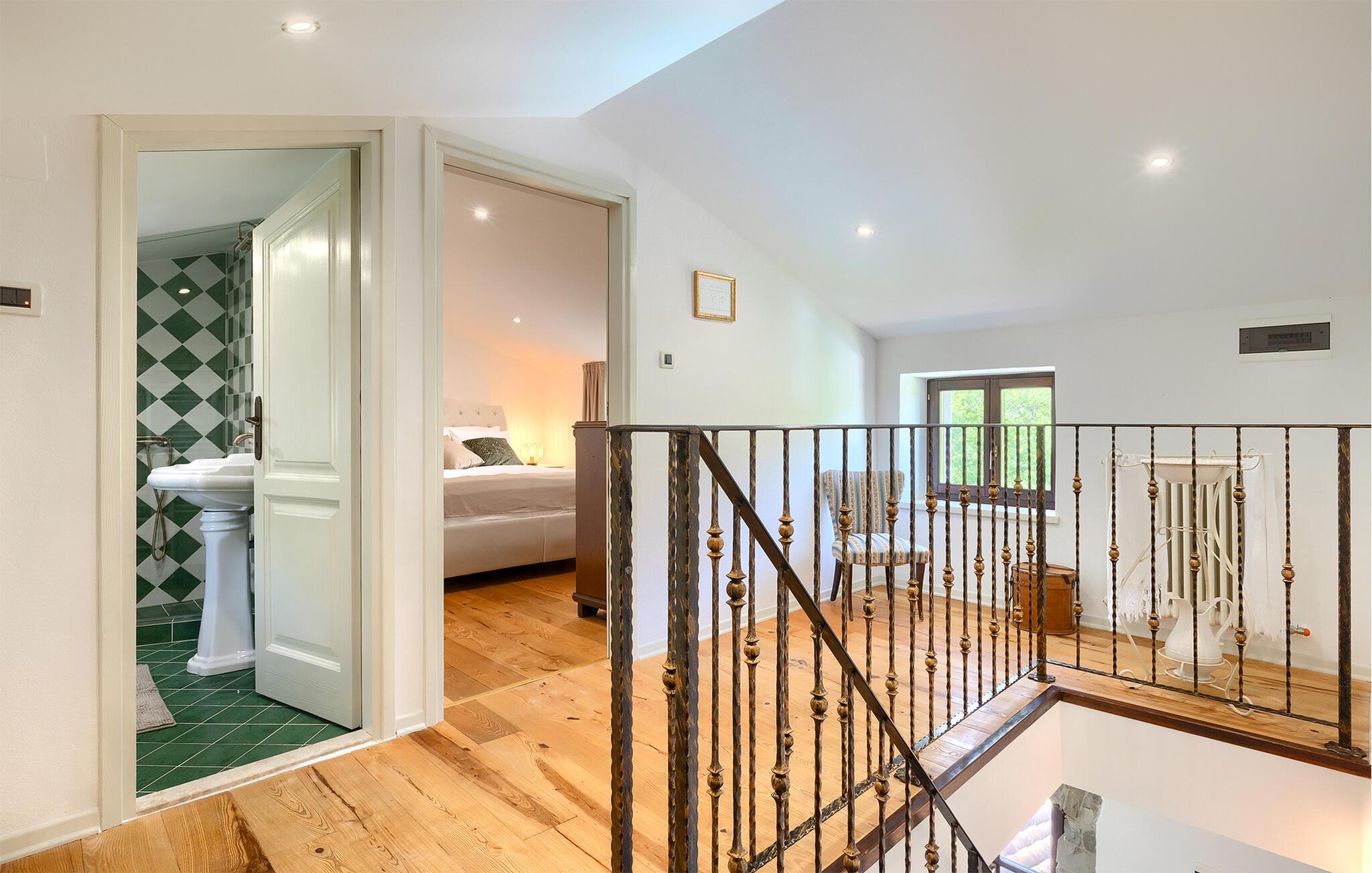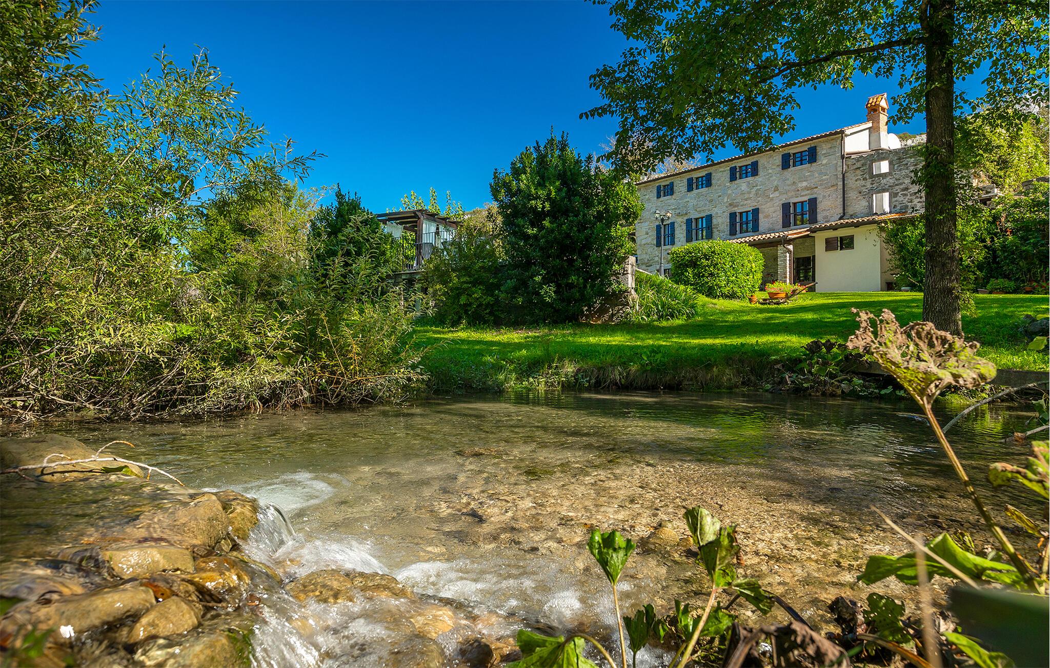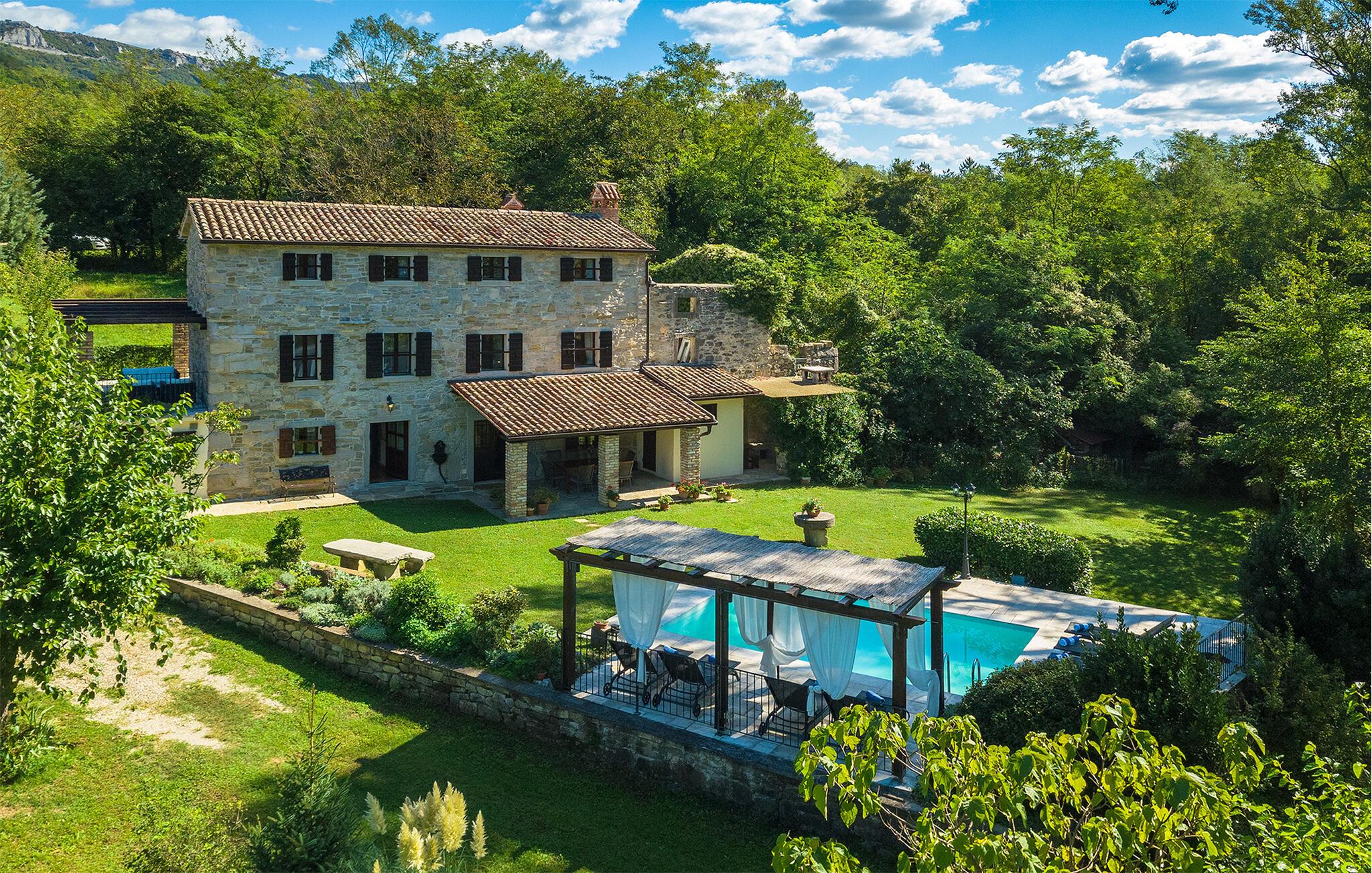 Smukke Villa Mulino ligger midt i det istriske landskab, ideelt til en afslappende ferie. Denne restaurerede villa plejede at være en gammel mølle, og stenhusets autentiske udseende passer perfekt ind i landskabet. Foran villaen kan du køle af i poolen eller nyde din yndlingsdrink på liggestolene. I den rolige atmosfære i de istriske omgivelser vil du blive særligt afslappet af lyden af åen, der løber gennem ejendommen. På den overdækkede terrasse foran villaen kan du nyde retter tilberedt på en muret grill i haven. Inde i villaen er udseendet af klassiske istriske huse med stenvægge og trælofter bevaret. Stuen med pejs er indrettet i denne stil, og fra dette værelse er der også udgang til terrassen. Fra stuen udvider en spisestue, hvorigennem man kommer ind i et charmerende køkken. Du vil blive imponeret af køkkenet, som er indrettet med pastelgrønne toner i kombination med træ og sten. På første sal er der to hyggelige soveværelser med dobbeltsenge, mens de resterende soveværelser med dobbeltsenge er på anden sal. Der er også et badeværelse på hver etage. Du vil ikke kun bruge din fritid på terrassen foran villaen, men også på terrassen på første sal, som byder på udsigt til den betagende natur. Planlægger du en familieferie, vil du især nyde gyngerne til børnene i haven. Villaen er beliggende lige uden for den antikke by Buzet. Buzet ligger i den nordlige del af Istrien nær grænsen til Slovenien. Dens historiske kerne, der stammer fra middelalderen, ligger på en bakketop over en frugtbar dal af den længste flod i Istrien - Mirna. I dag er Buzet almindeligt kendt som 'trøflernes by', da skovene langs Mirna-floden er særligt rige på dem. Ifølge nogle synspunkter er den hvide trøffel i Istrien lige så god som den mest berømte hvide trøffel fra den italienske region Alba. Til ære for denne trøffel arrangeres hvert år Trøffeldage i september og oktober. Den anden weekend i september finder også en stor folkefest i Buzet sted med en særlig attraktion – en kæmpe omelet (almindeligvis kendt som 'fritada' eller 'fritaja') med over 2.000 æg og 10 kg trøfler er tilberedt i en kæmpestor pande. Denne begivenhed markerer officielt begyndelsen på Trøffeldage i Istrien. I Buzets omgivelser er der nogle meget velbevarede middelalderbyer.