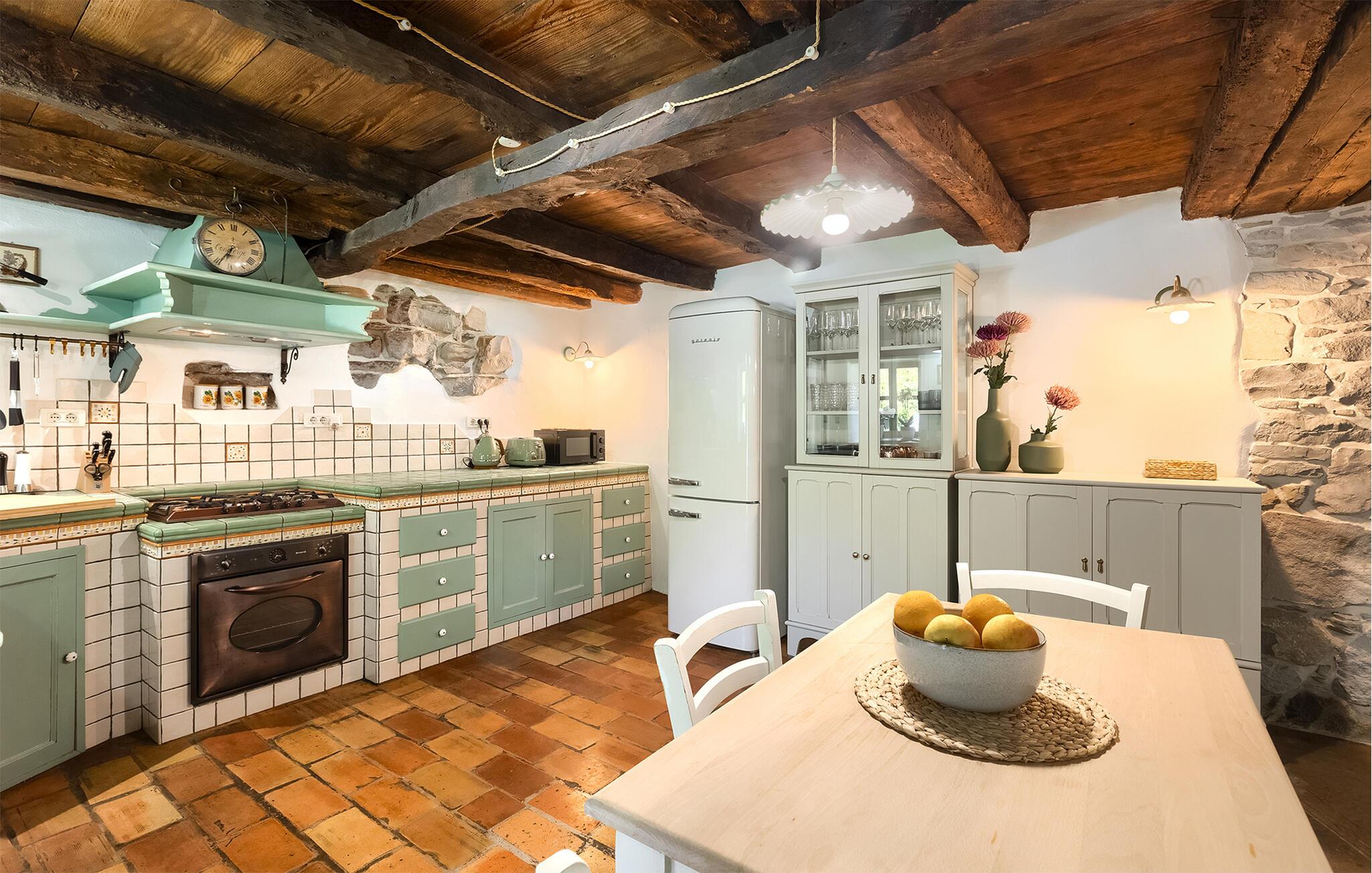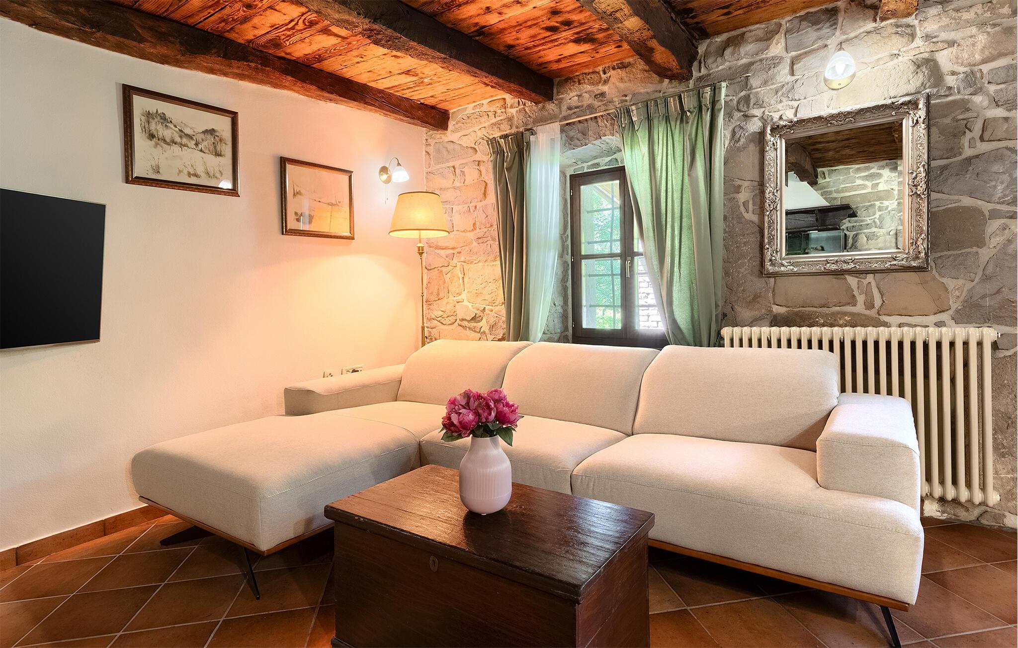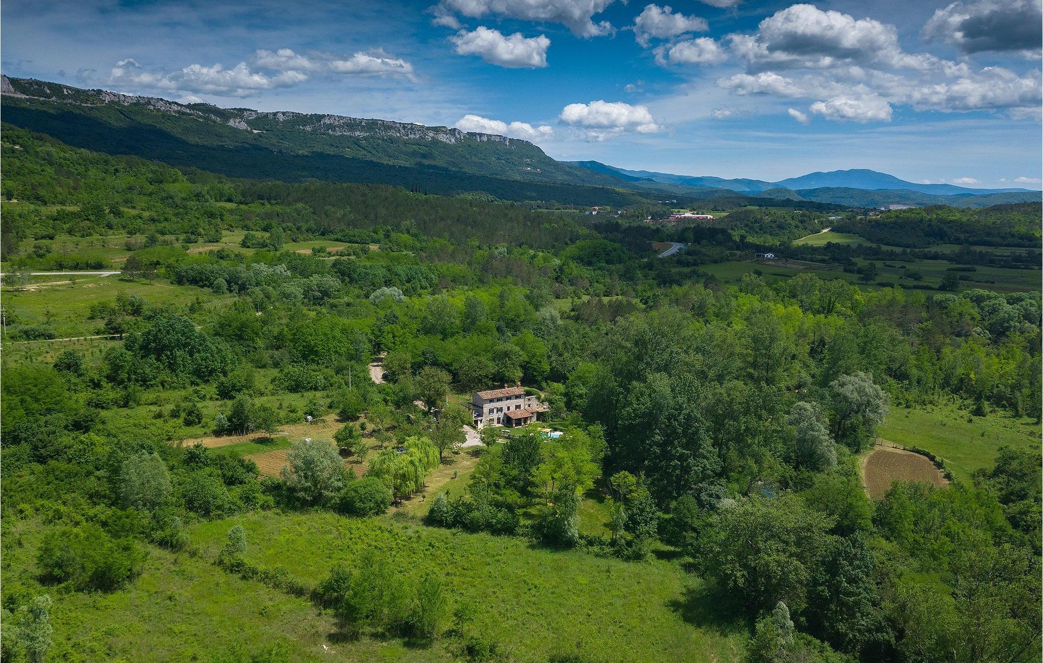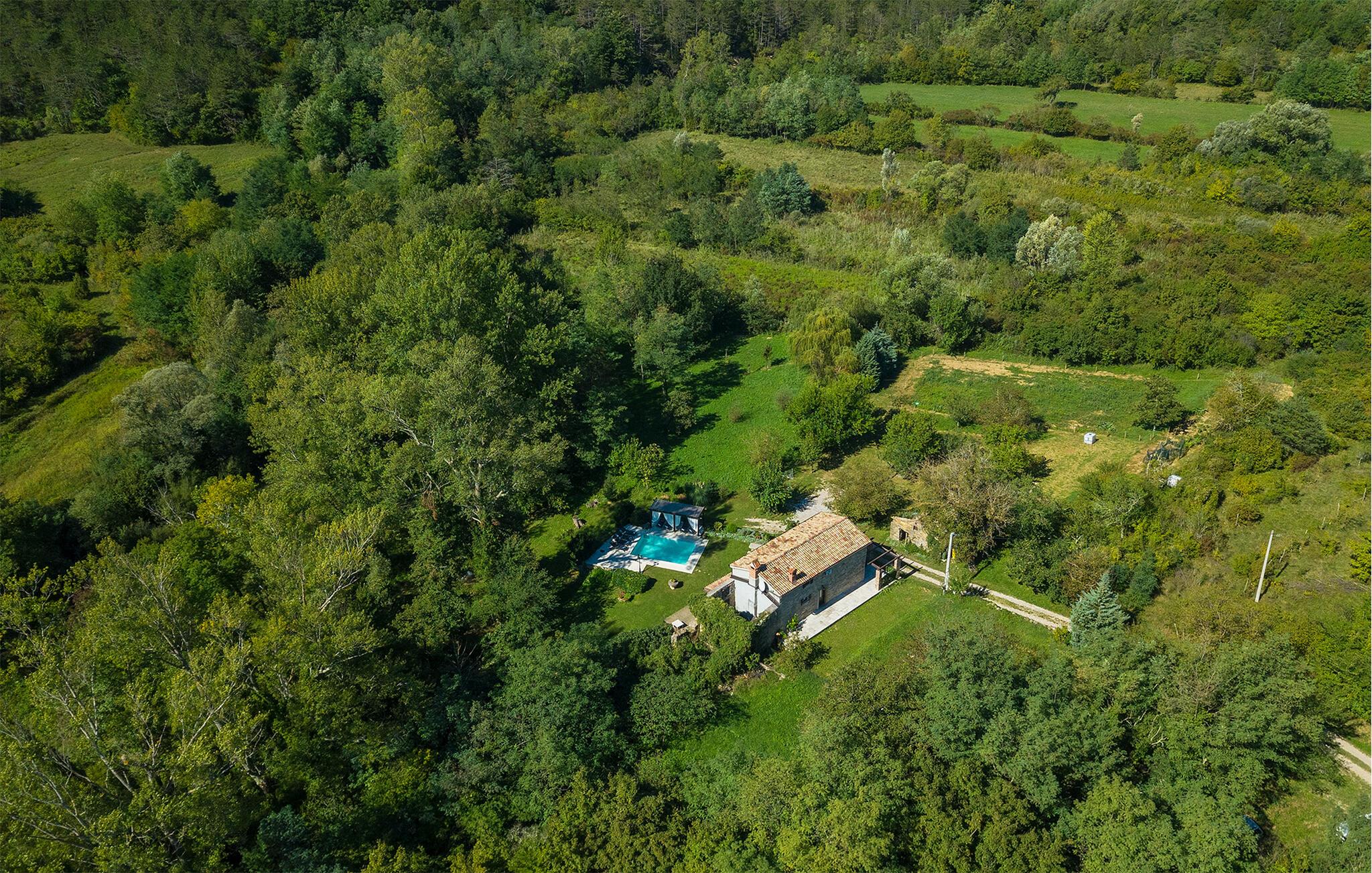 Smukke Villa Mulino ligger midt i det istriske landskab, ideelt til en afslappende ferie. Denne restaurerede villa plejede at være en gammel mølle, og stenhusets autentiske udseende passer perfekt ind i landskabet. Foran villaen kan du køle af i poolen eller nyde din yndlingsdrink på liggestolene. I den rolige atmosfære i de istriske omgivelser vil du blive særligt afslappet af lyden af åen, der løber gennem ejendommen. På den overdækkede terrasse foran villaen kan du nyde retter tilberedt på en muret grill i haven. Inde i villaen er udseendet af klassiske istriske huse med stenvægge og trælofter bevaret. Stuen med pejs er indrettet i denne stil, og fra dette værelse er der også udgang til terrassen. Fra stuen udvider en spisestue, hvorigennem man kommer ind i et charmerende køkken. Du vil blive imponeret af køkkenet, som er indrettet med pastelgrønne toner i kombination med træ og sten. På første sal er der to hyggelige soveværelser med dobbeltsenge, mens de resterende soveværelser med dobbeltsenge er på anden sal. Der er også et badeværelse på hver etage. Du vil ikke kun bruge din fritid på terrassen foran villaen, men også på terrassen på første sal, som byder på udsigt til den betagende natur. Planlægger du en familieferie, vil du især nyde gyngerne til børnene i haven. Villaen er beliggende lige uden for den antikke by Buzet. Buzet ligger i den nordlige del af Istrien nær grænsen til Slovenien. Dens historiske kerne, der stammer fra middelalderen, ligger på en bakketop over en frugtbar dal af den længste flod i Istrien - Mirna. I dag er Buzet almindeligt kendt som 'trøflernes by', da skovene langs Mirna-floden er særligt rige på dem. Ifølge nogle synspunkter er den hvide trøffel i Istrien lige så god som den mest berømte hvide trøffel fra den italienske region Alba. Til ære for denne trøffel arrangeres hvert år Trøffeldage i september og oktober. Den anden weekend i september finder også en stor folkefest i Buzet sted med en særlig attraktion – en kæmpe omelet (almindeligvis kendt som 'fritada' eller 'fritaja') med over 2.000 æg og 10 kg trøfler er tilberedt i en kæmpestor pande. Denne begivenhed markerer officielt begyndelsen på Trøffeldage i Istrien. I Buzets omgivelser er der nogle meget velbevarede middelalderbyer.