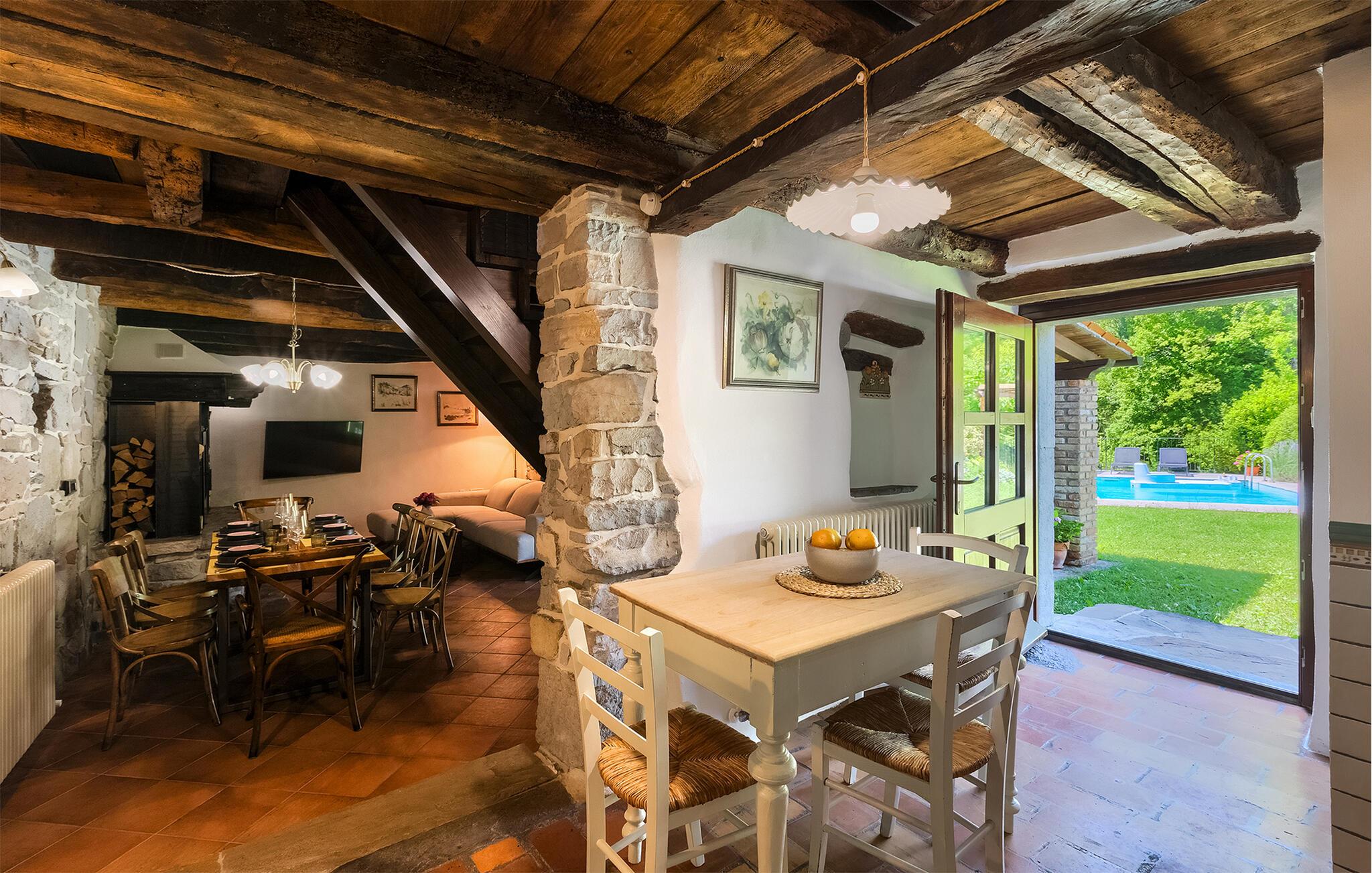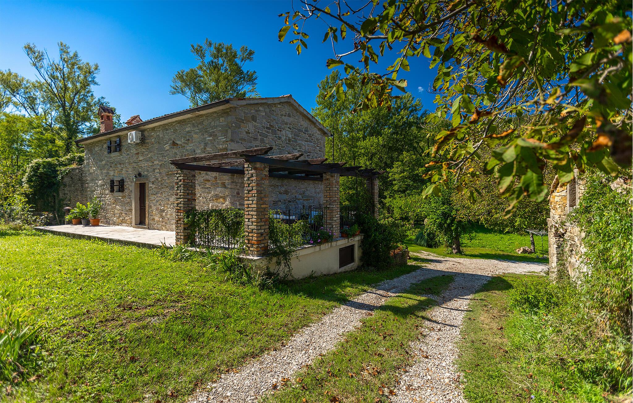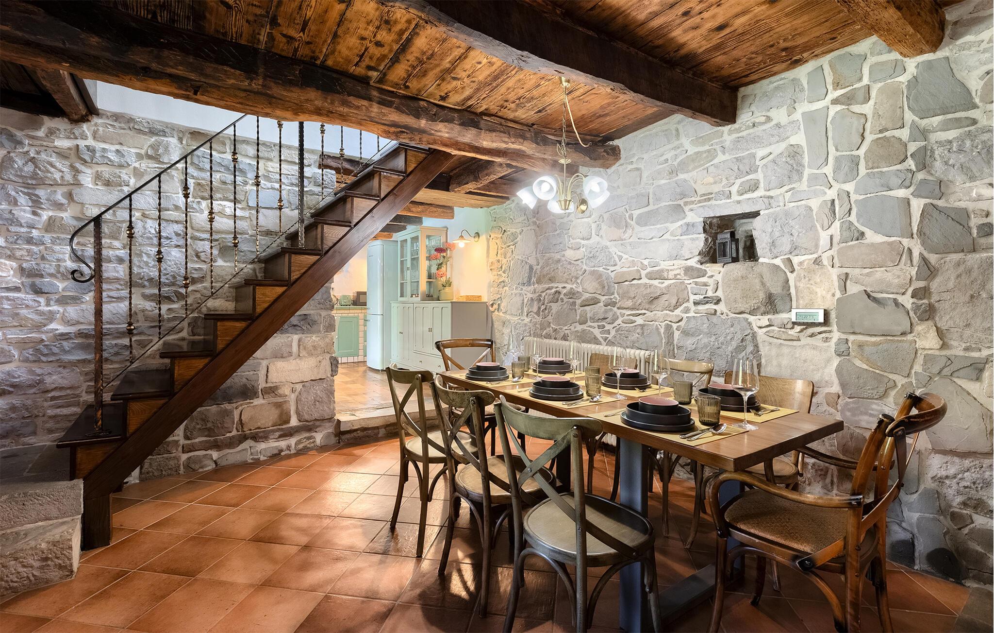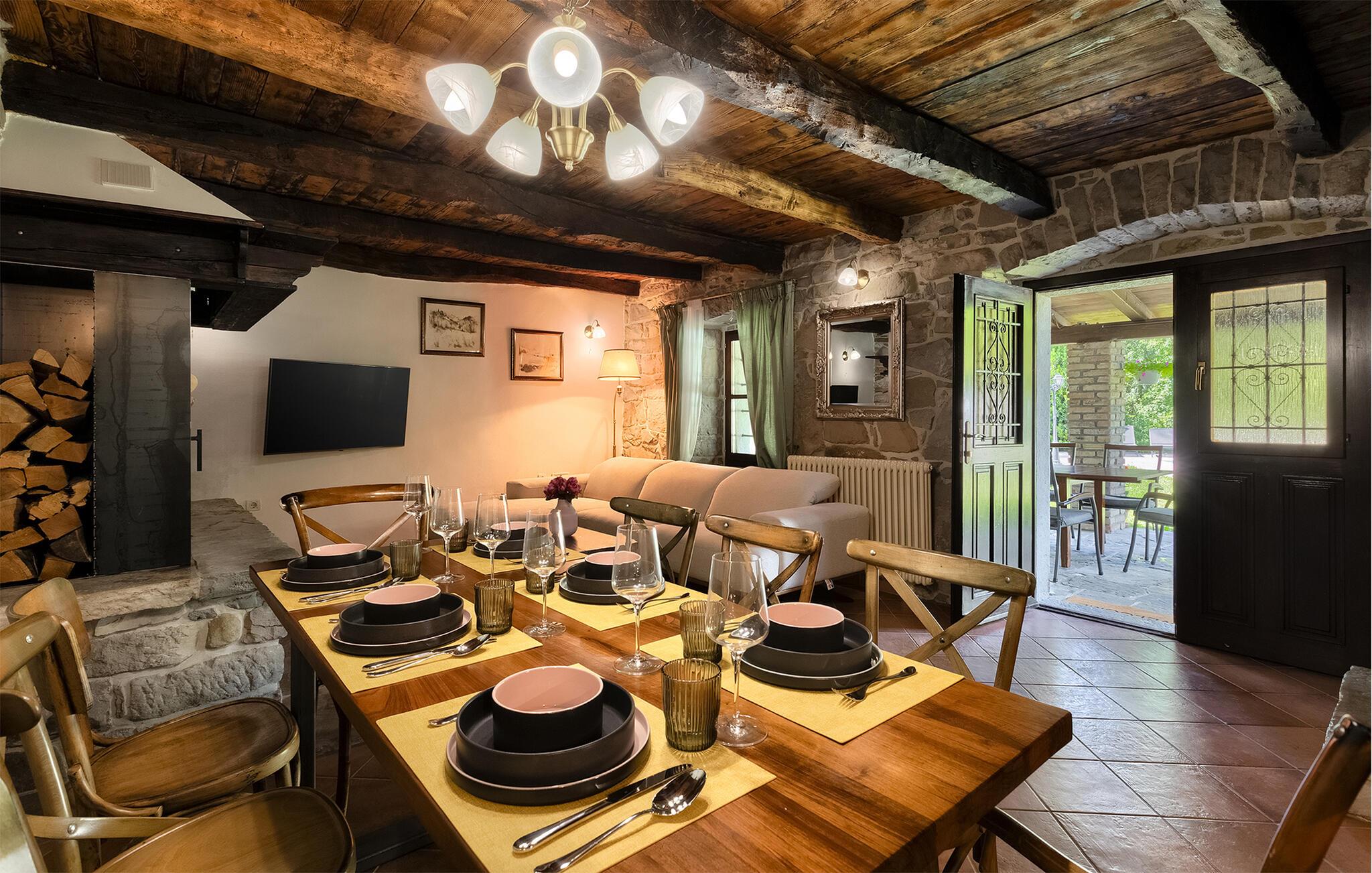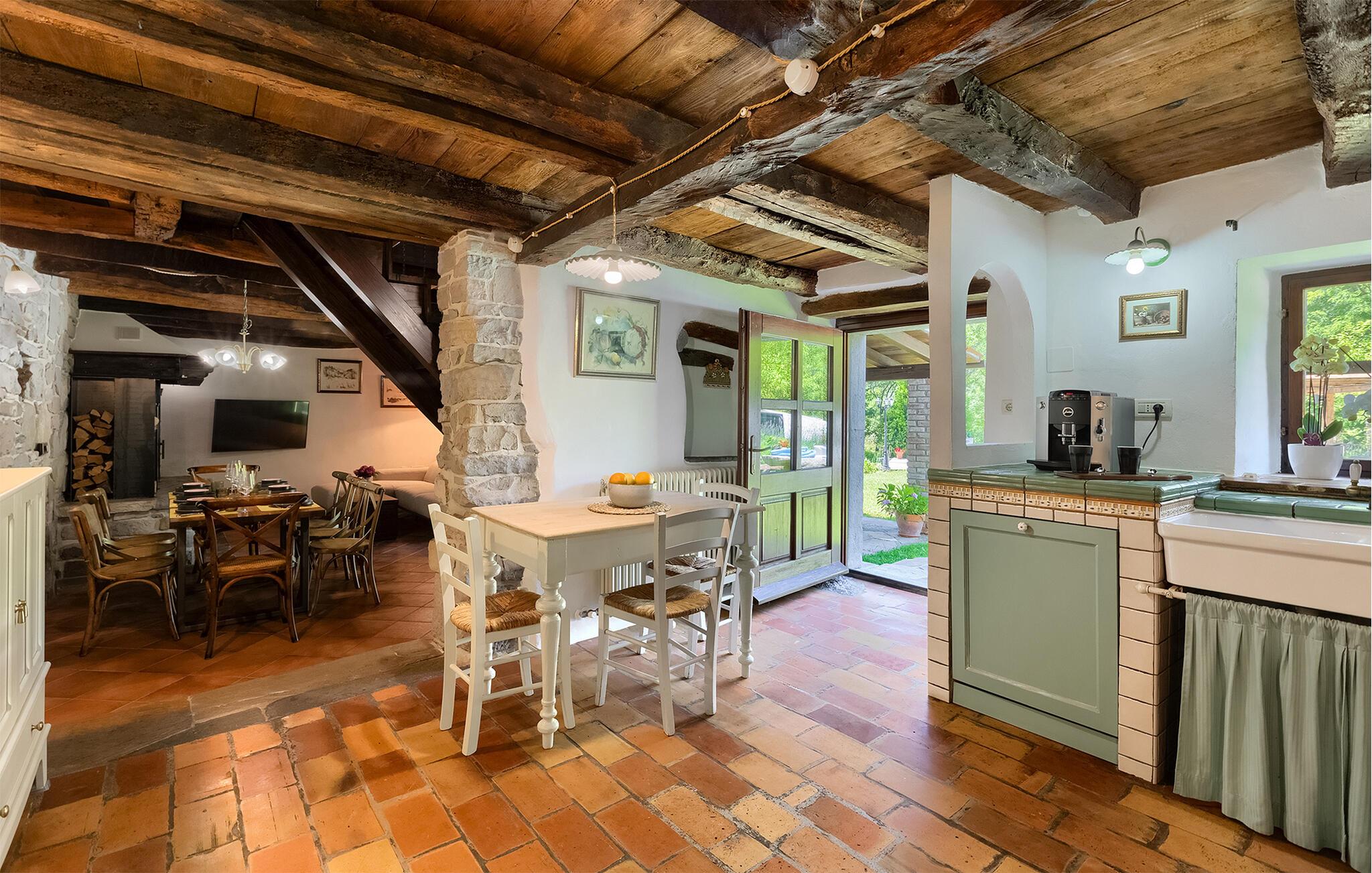Smukke Villa Mulino ligger midt i det istriske landskab, ideelt til en afslappende ferie. Denne restaurerede villa plejede at være en gammel mølle, og stenhusets autentiske udseende passer perfekt ind i landskabet. Foran villaen kan du køle af i poolen eller nyde din yndlingsdrink på liggestolene. I den rolige atmosfære i de istriske omgivelser vil du blive særligt afslappet af lyden af åen, der løber gennem ejendommen. På den overdækkede terrasse foran villaen kan du nyde retter tilberedt på en muret grill i haven. Inde i villaen er udseendet af klassiske istriske huse med stenvægge og trælofter bevaret. Stuen med pejs er indrettet i denne stil, og fra dette værelse er der også udgang til terrassen. Fra stuen udvider en spisestue, hvorigennem man kommer ind i et charmerende køkken. Du vil blive imponeret af køkkenet, som er indrettet med pastelgrønne toner i kombination med træ og sten. På første sal er der to hyggelige soveværelser med dobbeltsenge, mens de resterende soveværelser med dobbeltsenge er på anden sal. Der er også et badeværelse på hver etage. Du vil ikke kun bruge din fritid på terrassen foran villaen, men også på terrassen på første sal, som byder på udsigt til den betagende natur. Planlægger du en familieferie, vil du især nyde gyngerne til børnene i haven. Villaen er beliggende lige uden for den antikke by Buzet. Buzet ligger i den nordlige del af Istrien nær grænsen til Slovenien. Dens historiske kerne, der stammer fra middelalderen, ligger på en bakketop over en frugtbar dal af den længste flod i Istrien - Mirna. I dag er Buzet almindeligt kendt som 'trøflernes by', da skovene langs Mirna-floden er særligt rige på dem. Ifølge nogle synspunkter er den hvide trøffel i Istrien lige så god som den mest berømte hvide trøffel fra den italienske region Alba. Til ære for denne trøffel arrangeres hvert år Trøffeldage i september og oktober. Den anden weekend i september finder også en stor folkefest i Buzet sted med en særlig attraktion – en kæmpe omelet (almindeligvis kendt som 'fritada' eller 'fritaja') med over 2.000 æg og 10 kg trøfler er tilberedt i en kæmpestor pande. Denne begivenhed markerer officielt begyndelsen på Trøffeldage i Istrien. I Buzets omgivelser er der nogle meget velbevarede middelalderbyer.