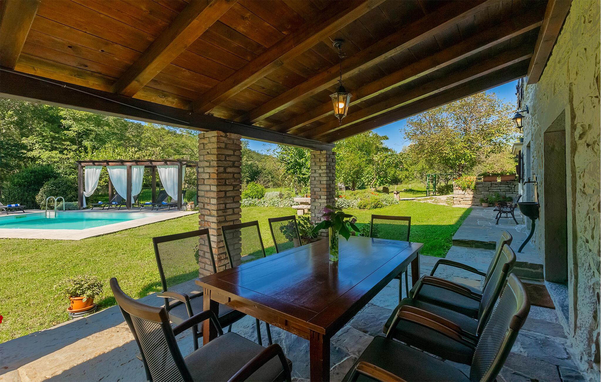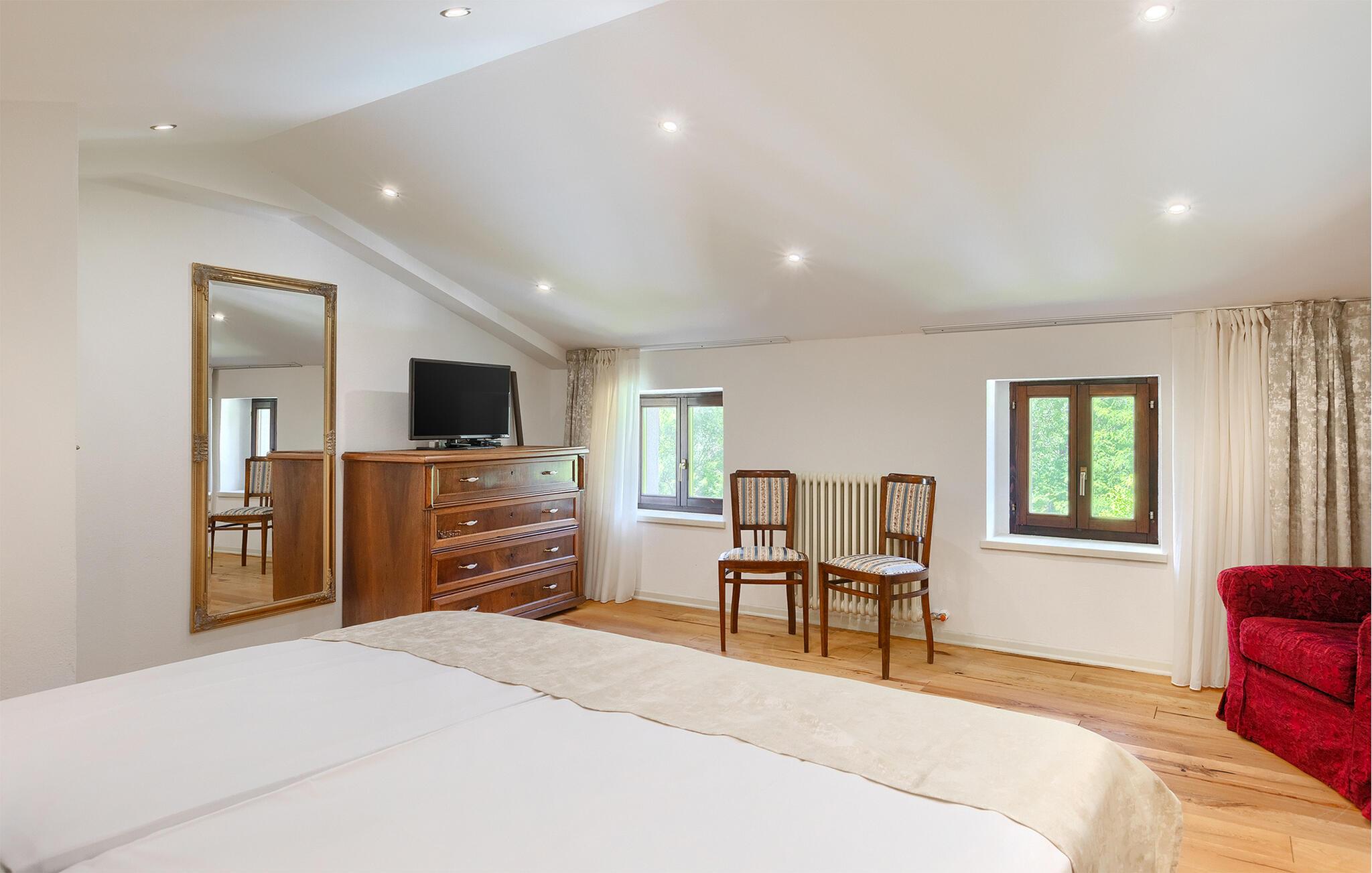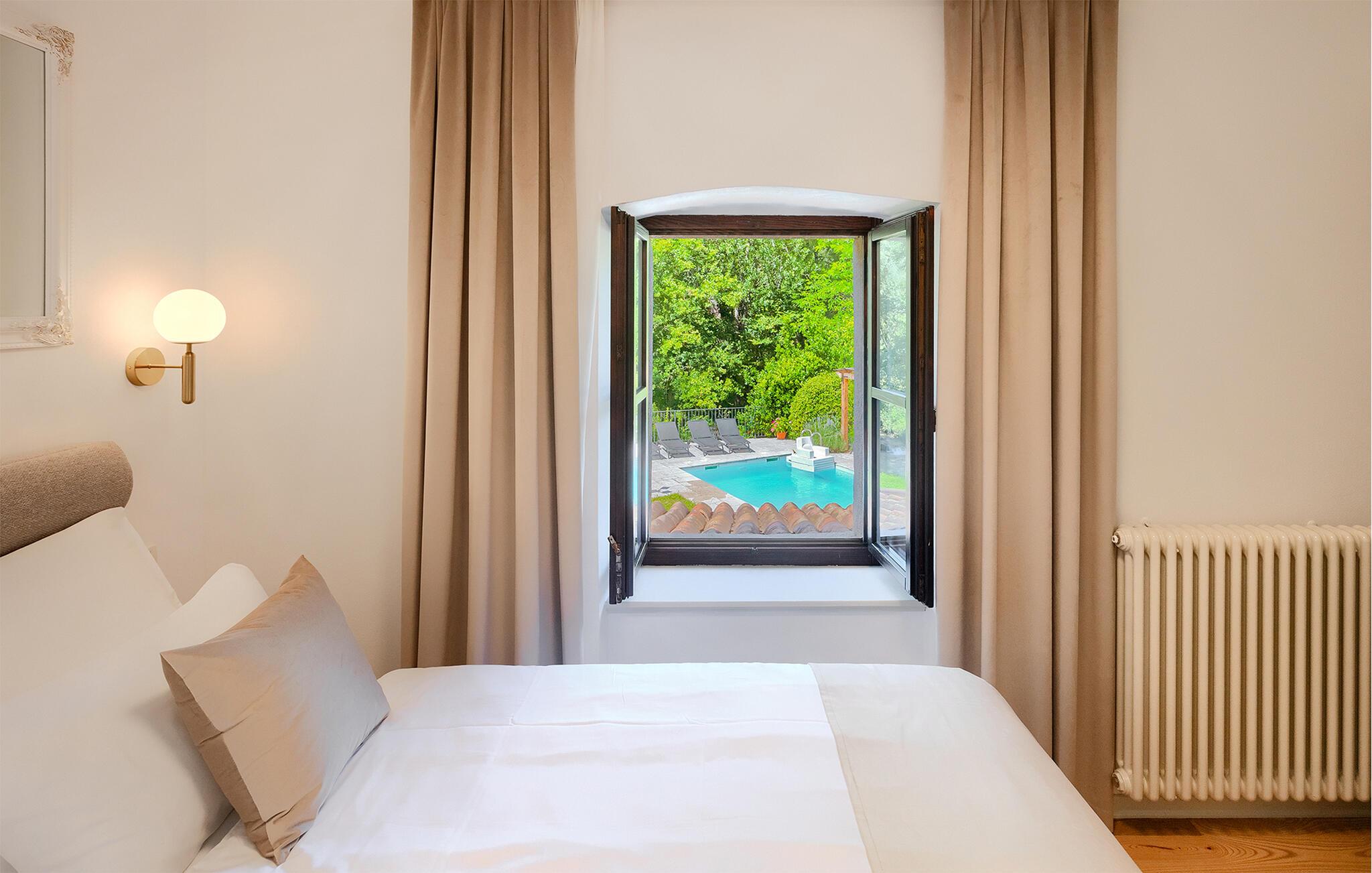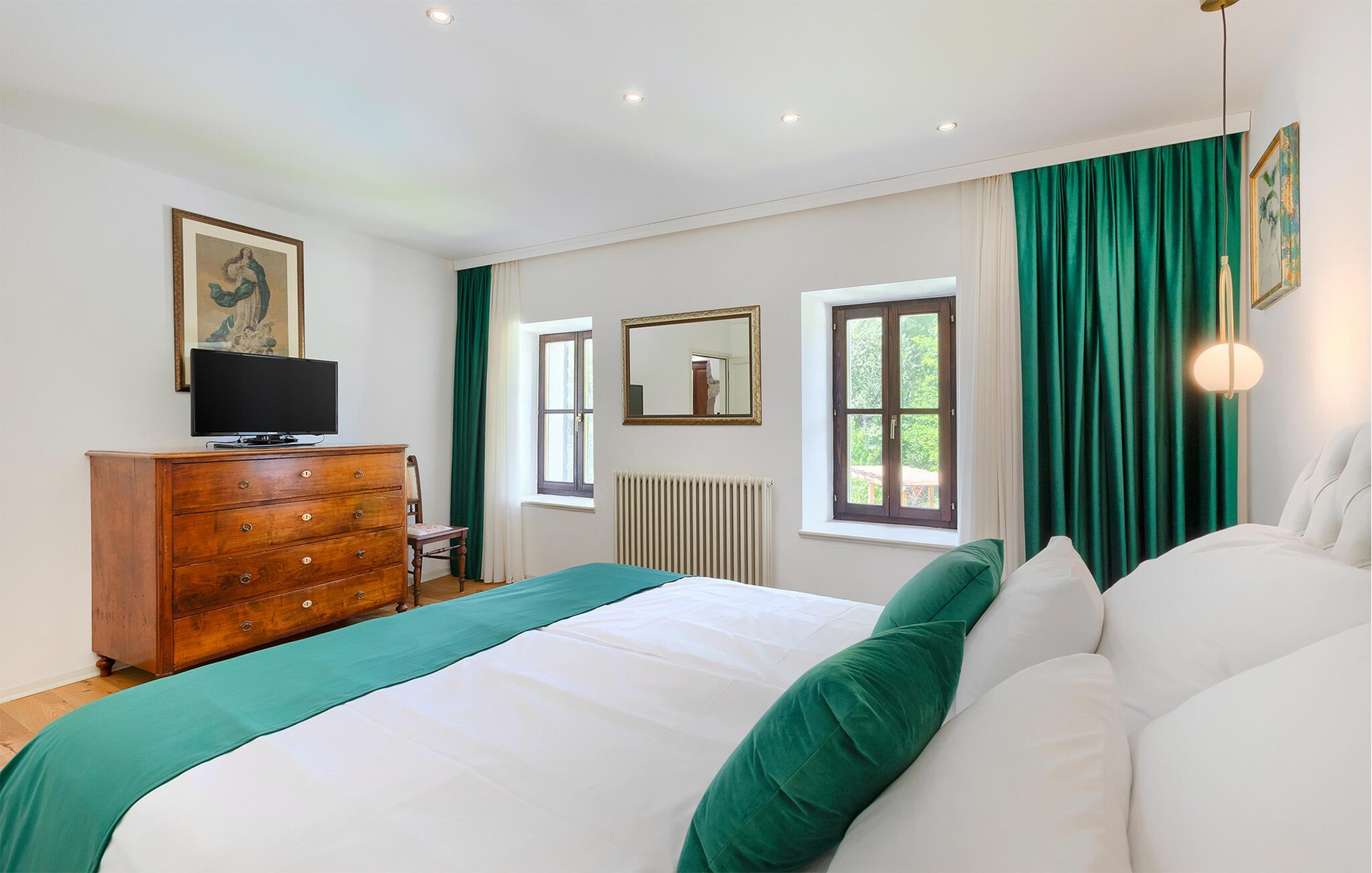 Smukke Villa Mulino ligger midt i det istriske landskab, ideelt til en afslappende ferie. Denne restaurerede villa plejede at være en gammel mølle, og stenhusets autentiske udseende passer perfekt ind i landskabet. Foran villaen kan du køle af i poolen eller nyde din yndlingsdrink på liggestolene. I den rolige atmosfære i de istriske omgivelser vil du blive særligt afslappet af lyden af åen, der løber gennem ejendommen. På den overdækkede terrasse foran villaen kan du nyde retter tilberedt på en muret grill i haven. Inde i villaen er udseendet af klassiske istriske huse med stenvægge og trælofter bevaret. Stuen med pejs er indrettet i denne stil, og fra dette værelse er der også udgang til terrassen. Fra stuen udvider en spisestue, hvorigennem man kommer ind i et charmerende køkken. Du vil blive imponeret af køkkenet, som er indrettet med pastelgrønne toner i kombination med træ og sten. På første sal er der to hyggelige soveværelser med dobbeltsenge, mens de resterende soveværelser med dobbeltsenge er på anden sal. Der er også et badeværelse på hver etage. Du vil ikke kun bruge din fritid på terrassen foran villaen, men også på terrassen på første sal, som byder på udsigt til den betagende natur. Planlægger du en familieferie, vil du især nyde gyngerne til børnene i haven. Villaen er beliggende lige uden for den antikke by Buzet. Buzet ligger i den nordlige del af Istrien nær grænsen til Slovenien. Dens historiske kerne, der stammer fra middelalderen, ligger på en bakketop over en frugtbar dal af den længste flod i Istrien - Mirna. I dag er Buzet almindeligt kendt som 'trøflernes by', da skovene langs Mirna-floden er særligt rige på dem. Ifølge nogle synspunkter er den hvide trøffel i Istrien lige så god som den mest berømte hvide trøffel fra den italienske region Alba. Til ære for denne trøffel arrangeres hvert år Trøffeldage i september og oktober. Den anden weekend i september finder også en stor folkefest i Buzet sted med en særlig attraktion – en kæmpe omelet (almindeligvis kendt som 'fritada' eller 'fritaja') med over 2.000 æg og 10 kg trøfler er tilberedt i en kæmpestor pande. Denne begivenhed markerer officielt begyndelsen på Trøffeldage i Istrien. I Buzets omgivelser er der nogle meget velbevarede middelalderbyer.