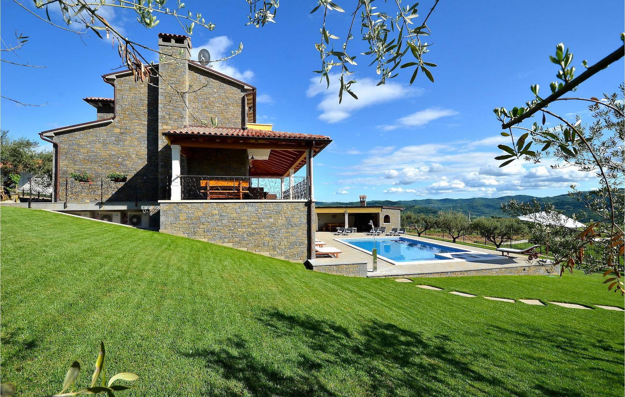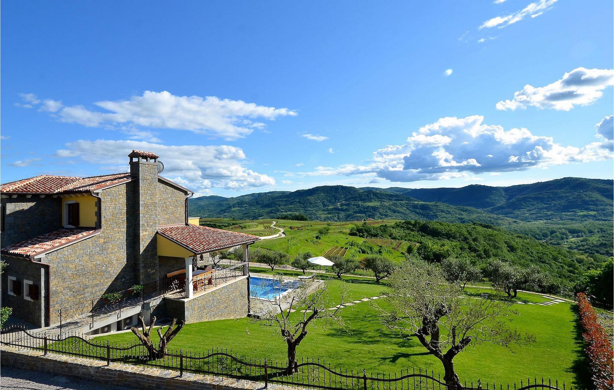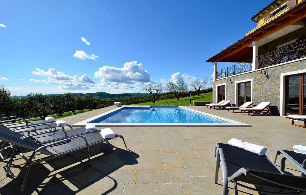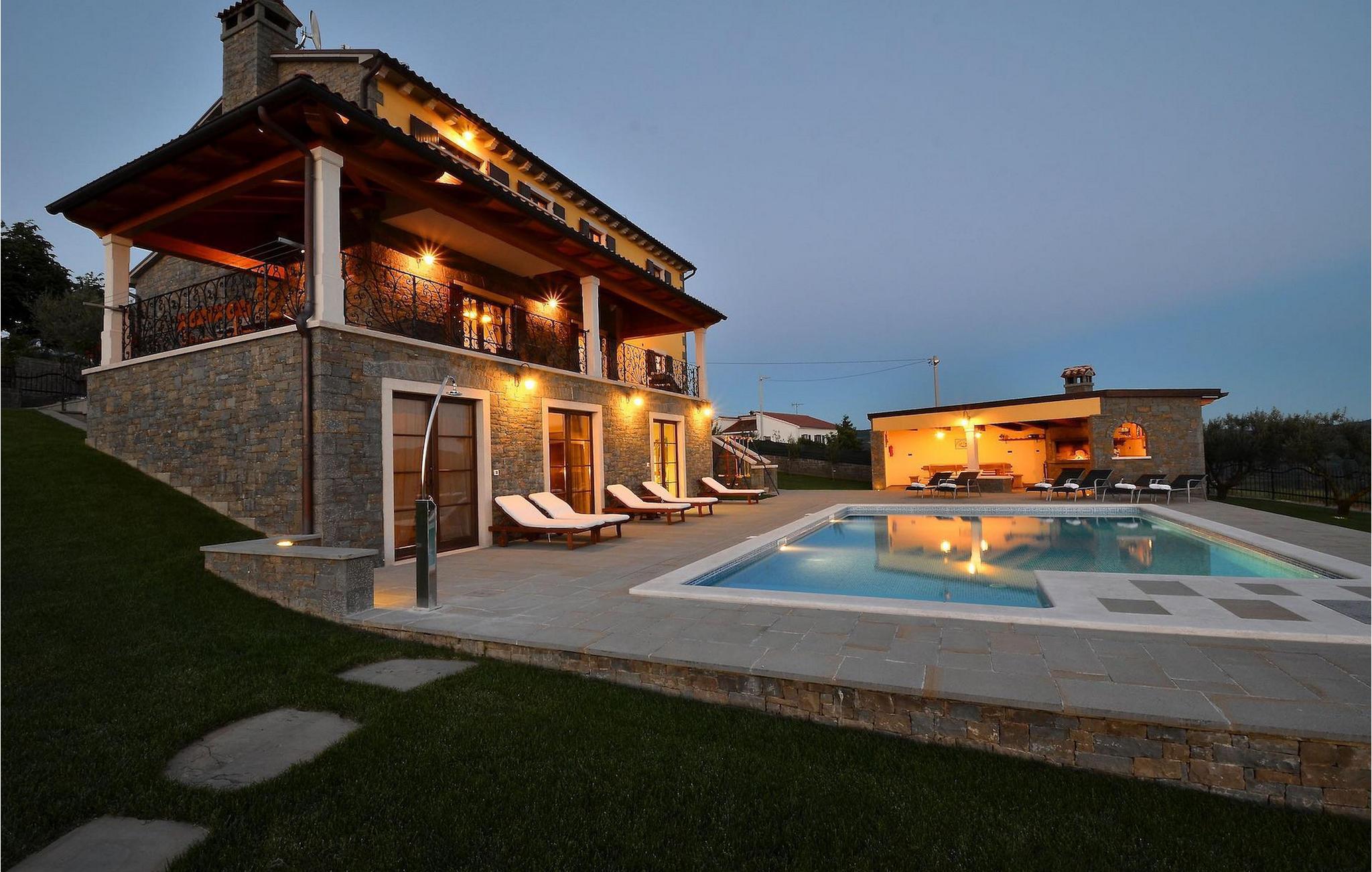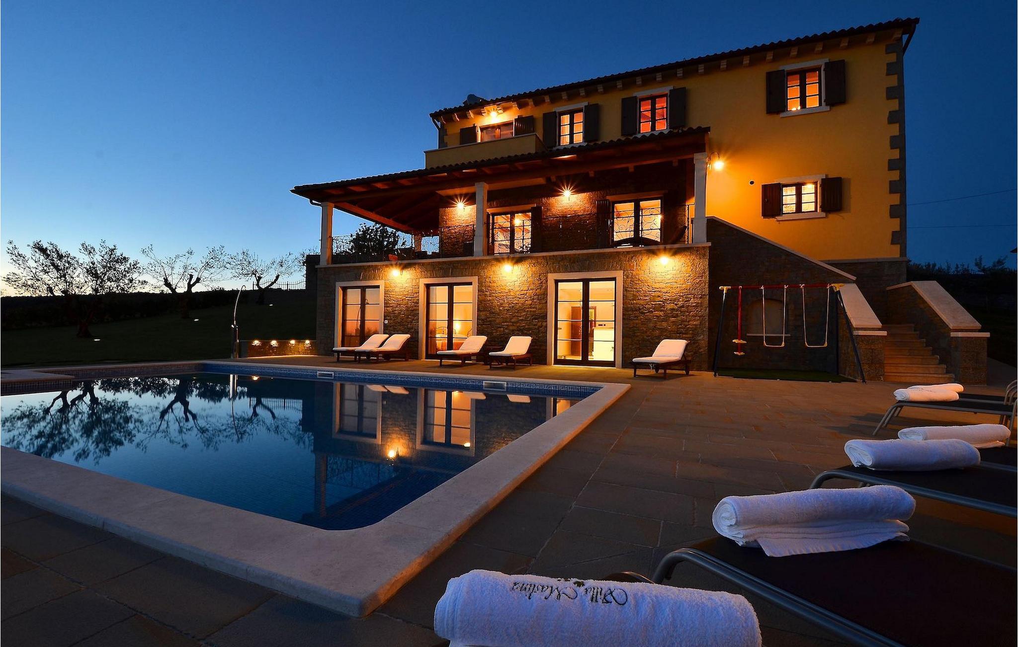 Den rummelige stue i denne villa er et ideelt område at samles, da det omfatter et stort træbord med plads til tolv og en traditionel istrisk pejs. Mens åbningen til venstre fører ind i et køkken udstyret på en moderne måde, trækker den forreste dig ud på en terrasse med udsigt over det hvide trøffelhabitat, den begravede sø Butoniga og flere maleriske, historiske små byer. Lejen inkluderer en gratis trøffelsmagning arrangeret af ejerne. På samme etage er der et rummeligt to-personers soveværelse med eget bad med udgang til terrassen. Villaen tilbyder lokale kvalitetsprodukter lavet af ejerne, såsom istriske pølser med trøfler, trøffelost, trøffelhonning. Anden sal er reserveret til tre soveværelser. Hvert soveværelse har eget badeværelse med to håndvaske og bruser. Stueetagen er reserveret til rekreation, tidsfordriv og afslapning. Intet er overladt til tilfældighederne med alle generationer taget hånd om. For de mindste er der et børnehjørne, mens der for de ældre er plads til afslapning – et wellness-område med en fire personers jacuzzi og en finsk sauna. Også på denne etage er der poolbord, bordfodbold og dartmaskine samt motionsområde med direkte adgang til poolen. Gæsterne har også et vaskeri til deres rådighed. Det femte og også det største soveværelse ligger i stueetagen, det har en dobbeltseng og 2 enkeltsenge, et moderne badeværelse og direkte adgang til haven. Hvis du har brug for at køle af i de varme sommermåneder, er der en 50 m2 stor pool med hydromassagepumper. Du kan fange lidt sol i en af de tolv liggestole, og hvis du ønsker et mindre isoleret sted, vælg et af oliventræerne for at give dig lidt skygge. Mens du nyder udsigten over søen og de omkringliggende hundredeårsskove, kan din yngste hygge sig i sandkassen, på vippen eller gyngerne. I haven er der også et overdækket udekøkken med grill, gaskomfur, vask, køleskab og et tolv personers bord. Her kan gæsterne selv tilberede specialiteter fra Istrien eller stole på professionel vejledning. En mobil butik med basale dagligvarer kommer til landsbyen 3 gange om ugen. Villa Olea er beliggende i en lille og rolig landsby kaldet Paladini, beliggende på en unik høj position, der tilbyder perfekt privatliv og betagende udsigt til søen Butoniga og dens magiske omgivelser. Den større by er Buzet, der er almindeligt kendt som 'trøflernes by', da skovene langs Mirna-floden er særligt rige på dem. Beliggende på en bakke, blev det befæstet under det romerske styre, og den centrale plads med sognekirken for Jomfru Marias himmelfart er selve kernen i den gamle bydel. Mens du er her, så sørg for ikke at gå glip af et besøg på County Museum of Buzet og dets omgivelser. I Buzets omgivelser er der nogle meget velbevarede middelalderbyer.