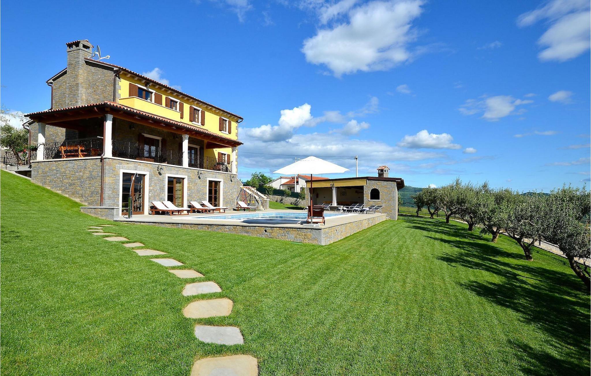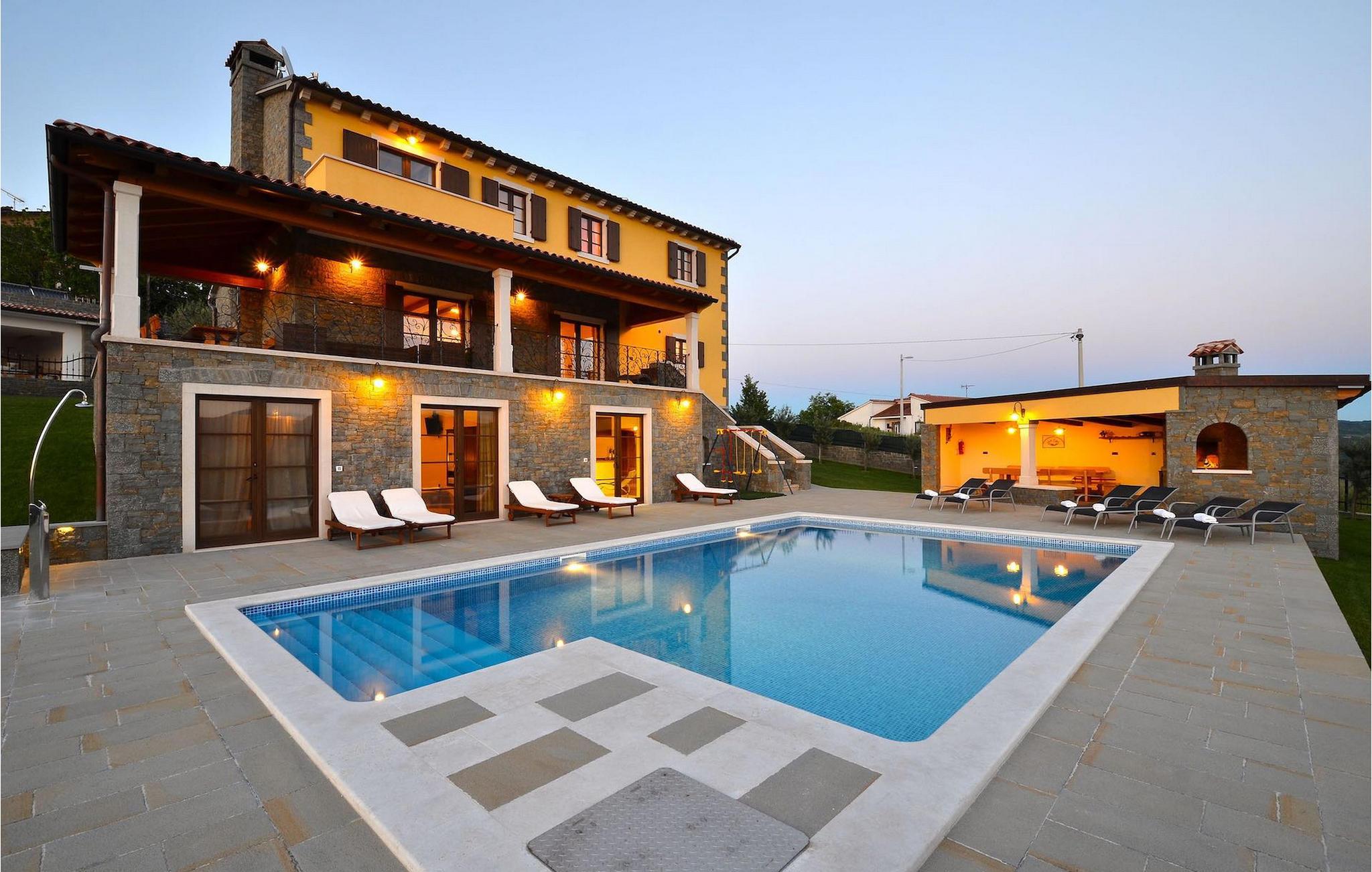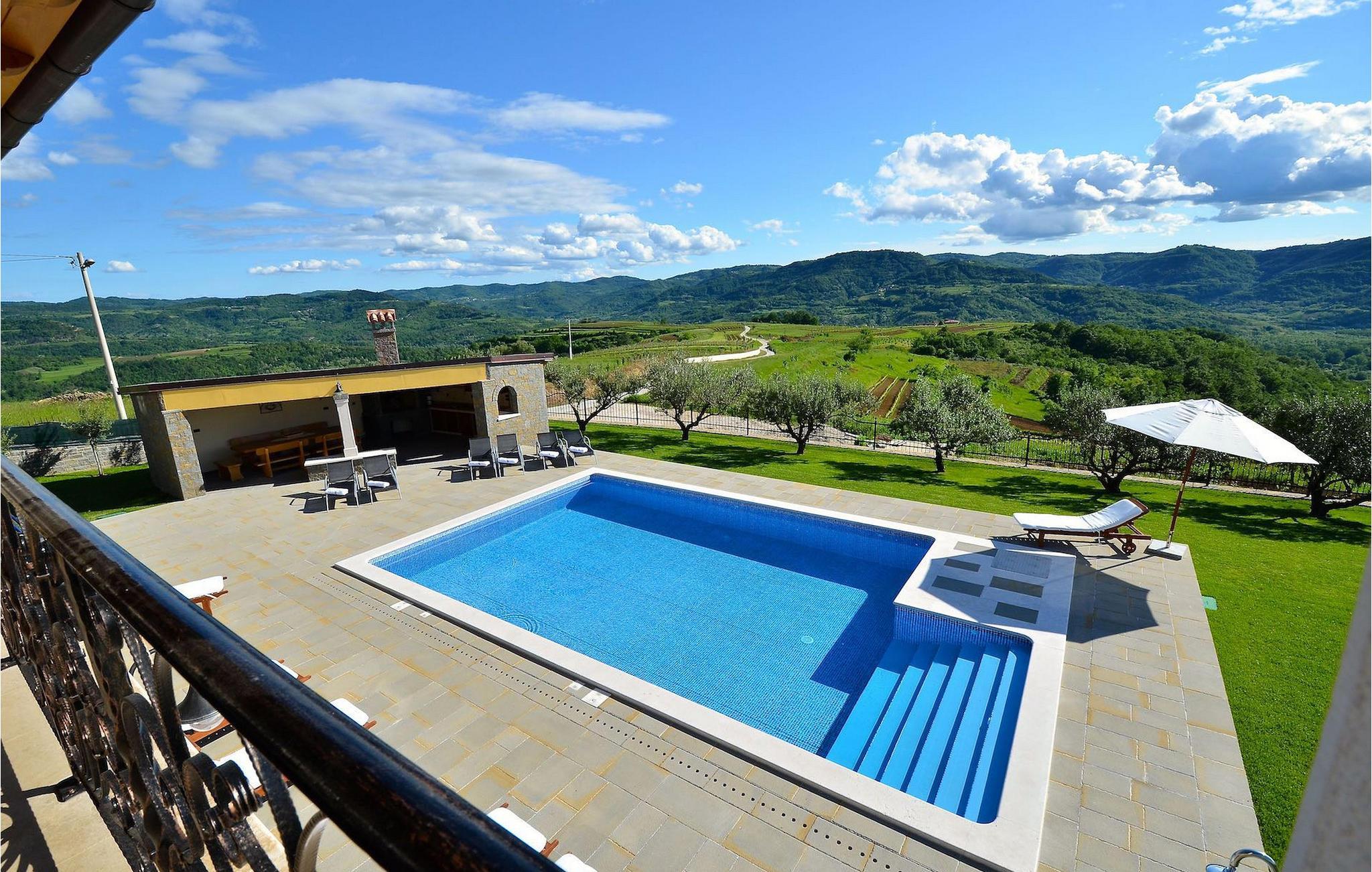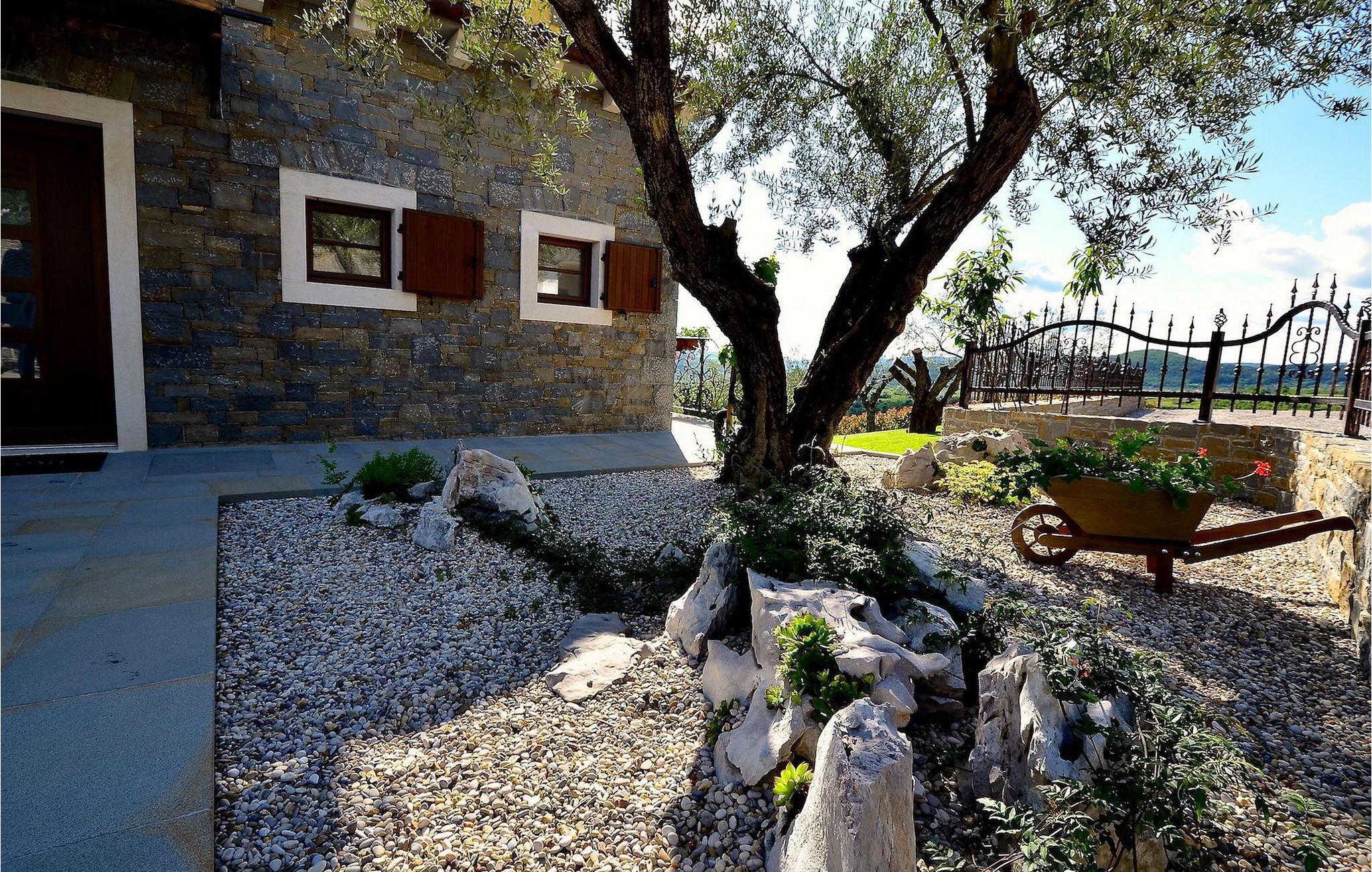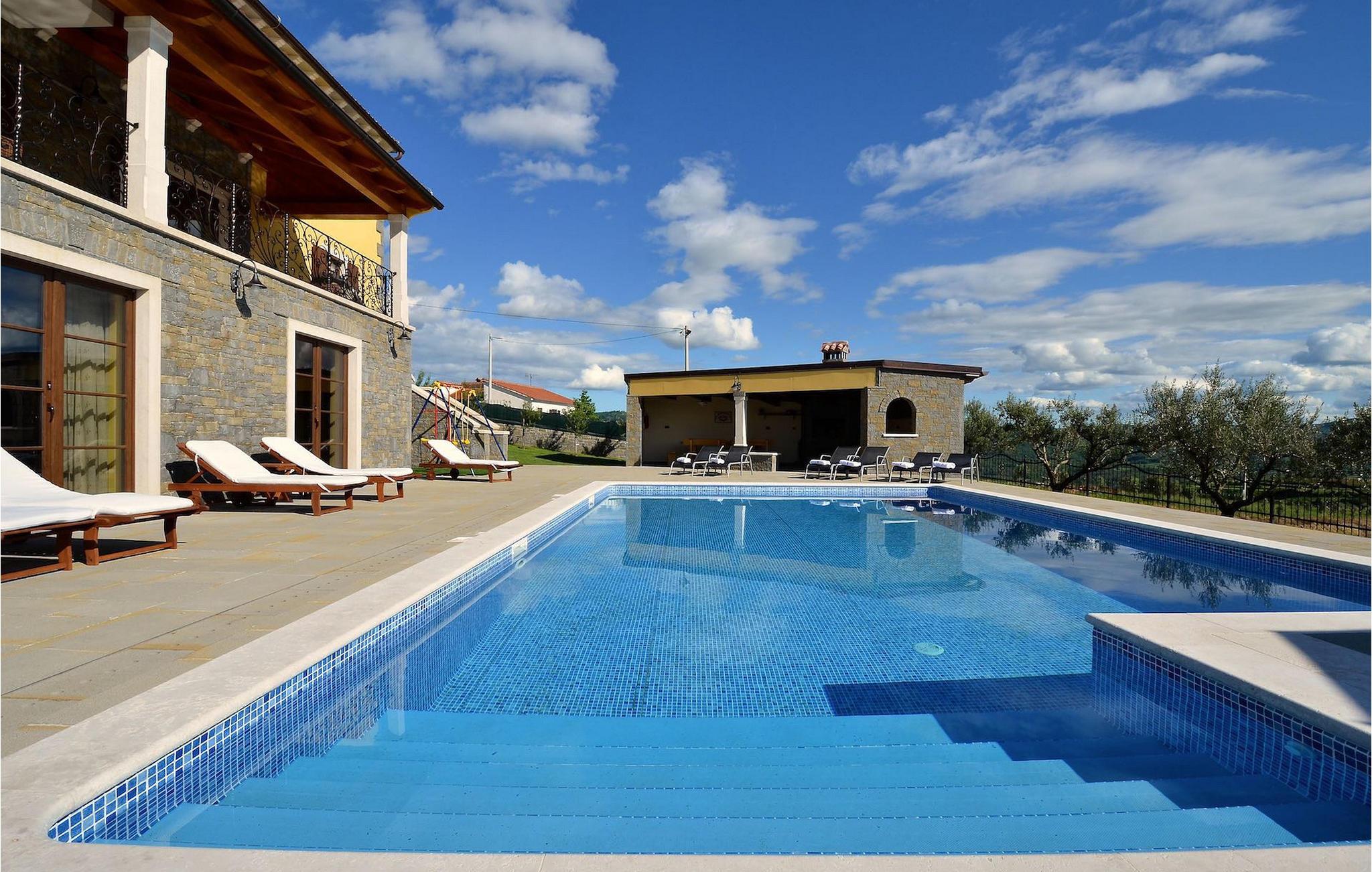 Den rummelige stue i denne villa er et ideelt område at samles, da det omfatter et stort træbord med plads til tolv og en traditionel istrisk pejs. Mens åbningen til venstre fører ind i et køkken udstyret på en moderne måde, trækker den forreste dig ud på en terrasse med udsigt over det hvide trøffelhabitat, den begravede sø Butoniga og flere maleriske, historiske små byer. Lejen inkluderer en gratis trøffelsmagning arrangeret af ejerne. På samme etage er der et rummeligt to-personers soveværelse med eget bad med udgang til terrassen. Villaen tilbyder lokale kvalitetsprodukter lavet af ejerne, såsom istriske pølser med trøfler, trøffelost, trøffelhonning. Anden sal er reserveret til tre soveværelser. Hvert soveværelse har eget badeværelse med to håndvaske og bruser. Stueetagen er reserveret til rekreation, tidsfordriv og afslapning. Intet er overladt til tilfældighederne med alle generationer taget hånd om. For de mindste er der et børnehjørne, mens der for de ældre er plads til afslapning – et wellness-område med en fire personers jacuzzi og en finsk sauna. Også på denne etage er der poolbord, bordfodbold og dartmaskine samt motionsområde med direkte adgang til poolen. Gæsterne har også et vaskeri til deres rådighed. Det femte og også det største soveværelse ligger i stueetagen, det har en dobbeltseng og 2 enkeltsenge, et moderne badeværelse og direkte adgang til haven. Hvis du har brug for at køle af i de varme sommermåneder, er der en 50 m2 stor pool med hydromassagepumper. Du kan fange lidt sol i en af de tolv liggestole, og hvis du ønsker et mindre isoleret sted, vælg et af oliventræerne for at give dig lidt skygge. Mens du nyder udsigten over søen og de omkringliggende hundredeårsskove, kan din yngste hygge sig i sandkassen, på vippen eller gyngerne. I haven er der også et overdækket udekøkken med grill, gaskomfur, vask, køleskab og et tolv personers bord. Her kan gæsterne selv tilberede specialiteter fra Istrien eller stole på professionel vejledning. En mobil butik med basale dagligvarer kommer til landsbyen 3 gange om ugen. Villa Olea er beliggende i en lille og rolig landsby kaldet Paladini, beliggende på en unik høj position, der tilbyder perfekt privatliv og betagende udsigt til søen Butoniga og dens magiske omgivelser. Den større by er Buzet, der er almindeligt kendt som 'trøflernes by', da skovene langs Mirna-floden er særligt rige på dem. Beliggende på en bakke, blev det befæstet under det romerske styre, og den centrale plads med sognekirken for Jomfru Marias himmelfart er selve kernen i den gamle bydel. Mens du er her, så sørg for ikke at gå glip af et besøg på County Museum of Buzet og dets omgivelser. I Buzets omgivelser er der nogle meget velbevarede middelalderbyer.