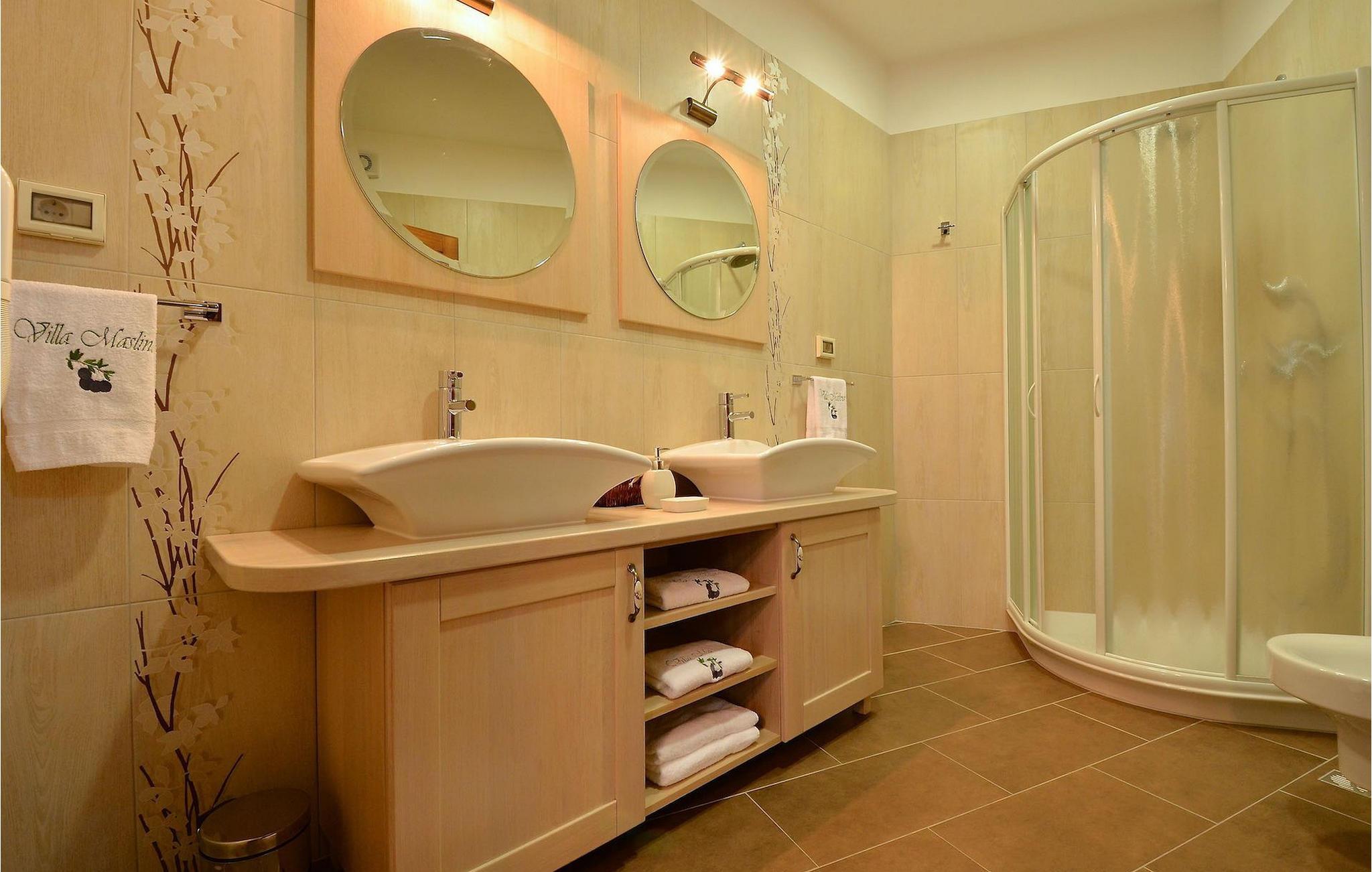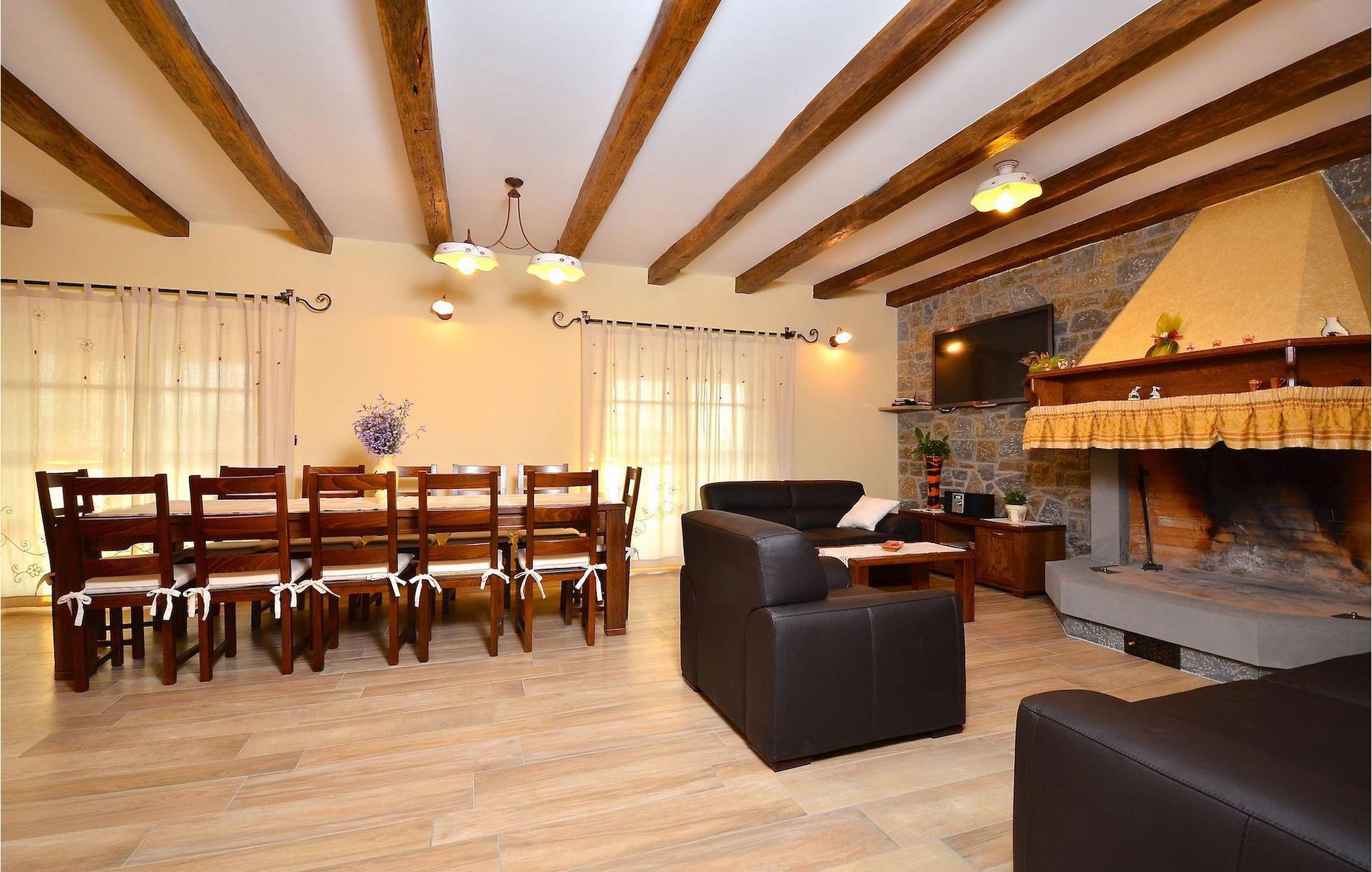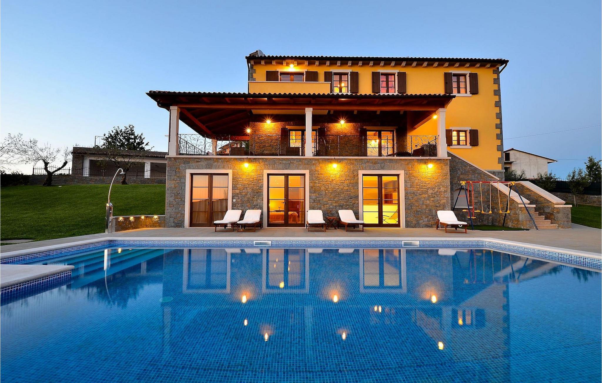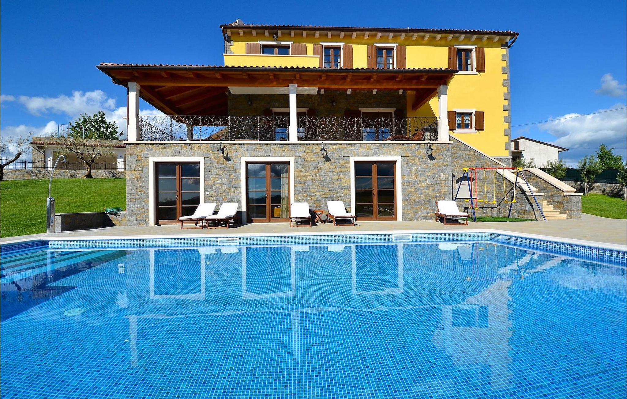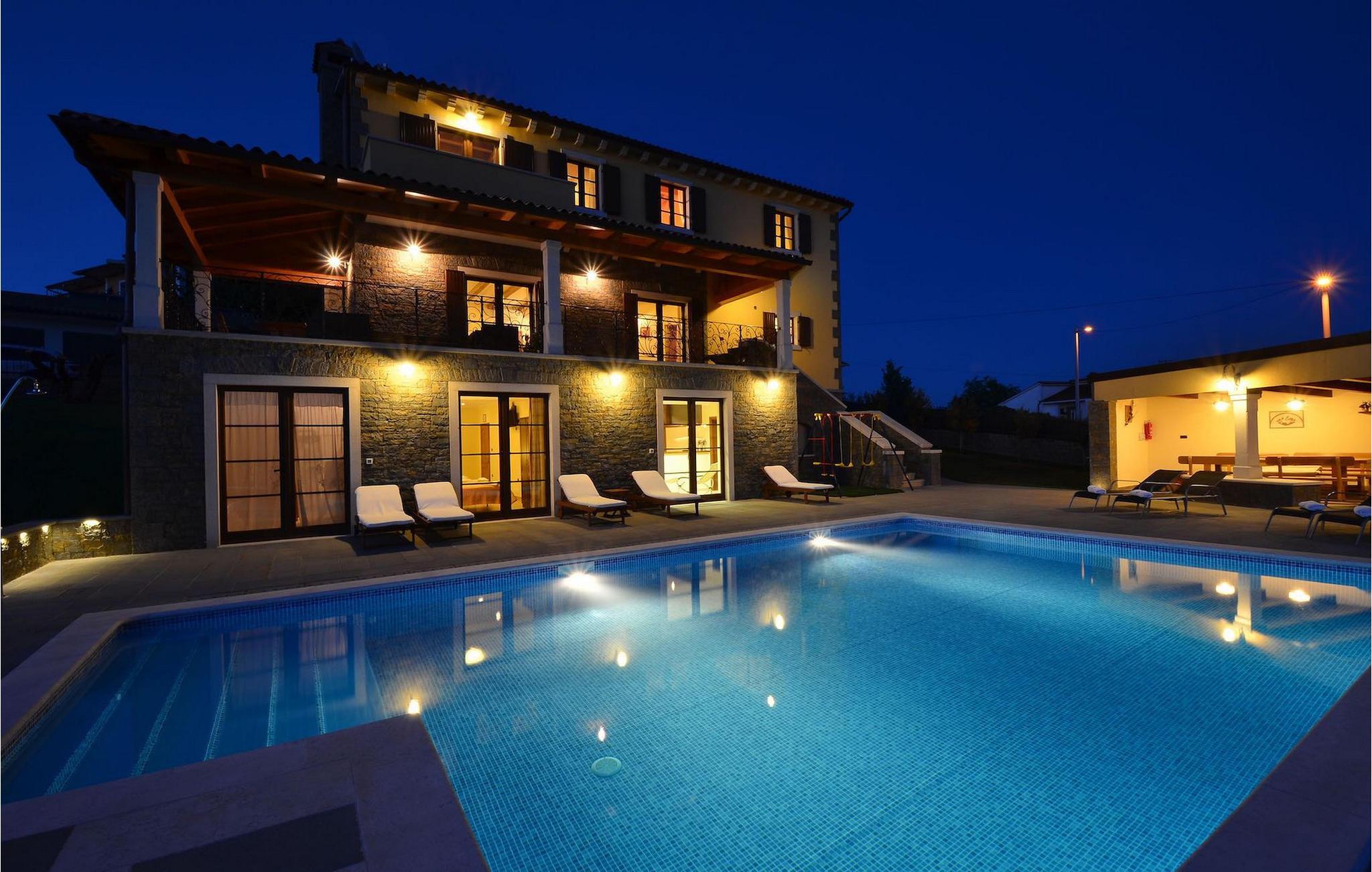 Den rummelige stue i denne villa er et ideelt område at samles, da det omfatter et stort træbord med plads til tolv og en traditionel istrisk pejs. Mens åbningen til venstre fører ind i et køkken udstyret på en moderne måde, trækker den forreste dig ud på en terrasse med udsigt over det hvide trøffelhabitat, den begravede sø Butoniga og flere maleriske, historiske små byer. Lejen inkluderer en gratis trøffelsmagning arrangeret af ejerne. På samme etage er der et rummeligt to-personers soveværelse med eget bad med udgang til terrassen. Villaen tilbyder lokale kvalitetsprodukter lavet af ejerne, såsom istriske pølser med trøfler, trøffelost, trøffelhonning. Anden sal er reserveret til tre soveværelser. Hvert soveværelse har eget badeværelse med to håndvaske og bruser. Stueetagen er reserveret til rekreation, tidsfordriv og afslapning. Intet er overladt til tilfældighederne med alle generationer taget hånd om. For de mindste er der et børnehjørne, mens der for de ældre er plads til afslapning – et wellness-område med en fire personers jacuzzi og en finsk sauna. Også på denne etage er der poolbord, bordfodbold og dartmaskine samt motionsområde med direkte adgang til poolen. Gæsterne har også et vaskeri til deres rådighed. Det femte og også det største soveværelse ligger i stueetagen, det har en dobbeltseng og 2 enkeltsenge, et moderne badeværelse og direkte adgang til haven. Hvis du har brug for at køle af i de varme sommermåneder, er der en 50 m2 stor pool med hydromassagepumper. Du kan fange lidt sol i en af de tolv liggestole, og hvis du ønsker et mindre isoleret sted, vælg et af oliventræerne for at give dig lidt skygge. Mens du nyder udsigten over søen og de omkringliggende hundredeårsskove, kan din yngste hygge sig i sandkassen, på vippen eller gyngerne. I haven er der også et overdækket udekøkken med grill, gaskomfur, vask, køleskab og et tolv personers bord. Her kan gæsterne selv tilberede specialiteter fra Istrien eller stole på professionel vejledning. En mobil butik med basale dagligvarer kommer til landsbyen 3 gange om ugen. Villa Olea er beliggende i en lille og rolig landsby kaldet Paladini, beliggende på en unik høj position, der tilbyder perfekt privatliv og betagende udsigt til søen Butoniga og dens magiske omgivelser. Den større by er Buzet, der er almindeligt kendt som 'trøflernes by', da skovene langs Mirna-floden er særligt rige på dem. Beliggende på en bakke, blev det befæstet under det romerske styre, og den centrale plads med sognekirken for Jomfru Marias himmelfart er selve kernen i den gamle bydel. Mens du er her, så sørg for ikke at gå glip af et besøg på County Museum of Buzet og dets omgivelser. I Buzets omgivelser er der nogle meget velbevarede middelalderbyer.