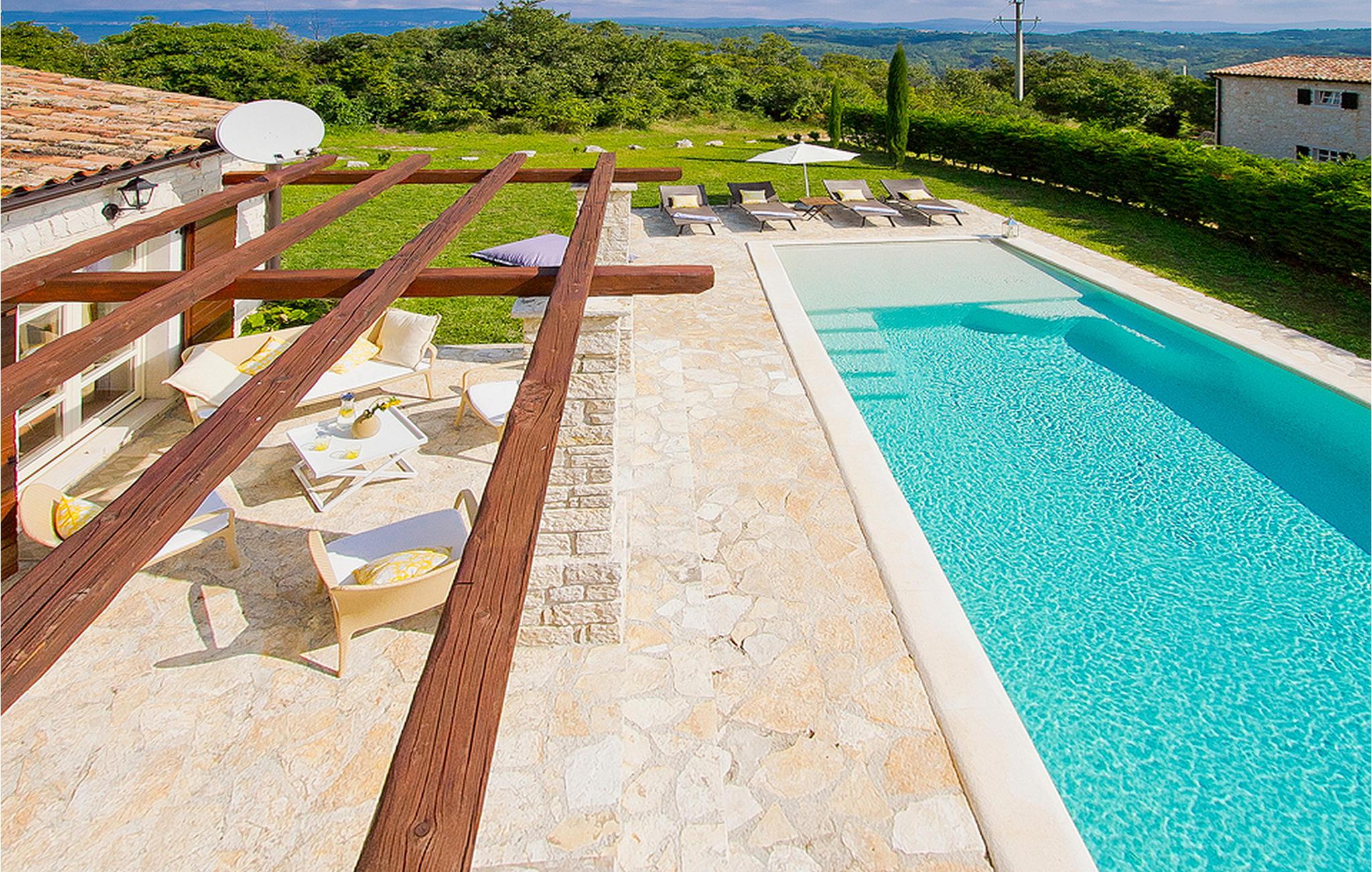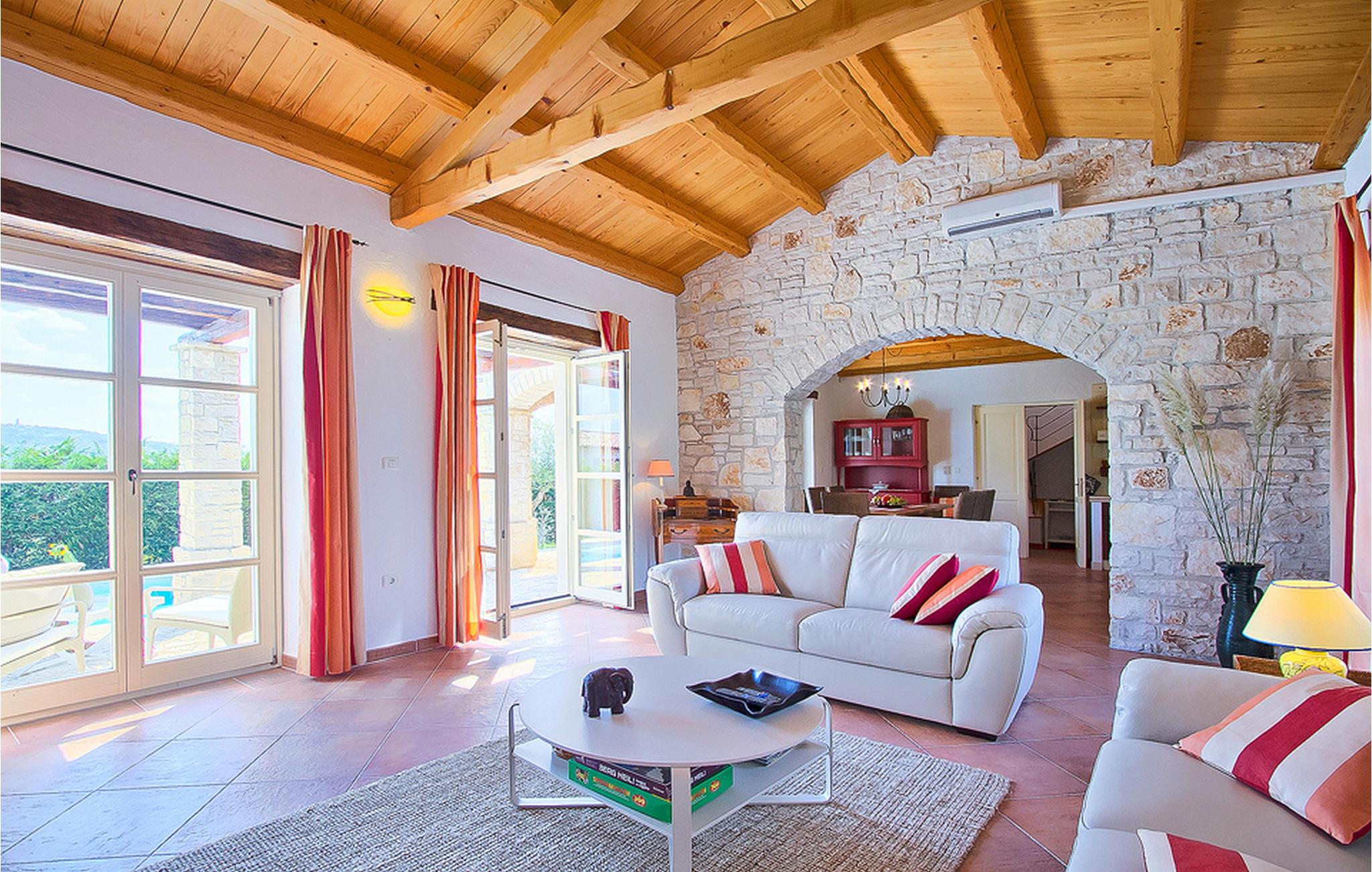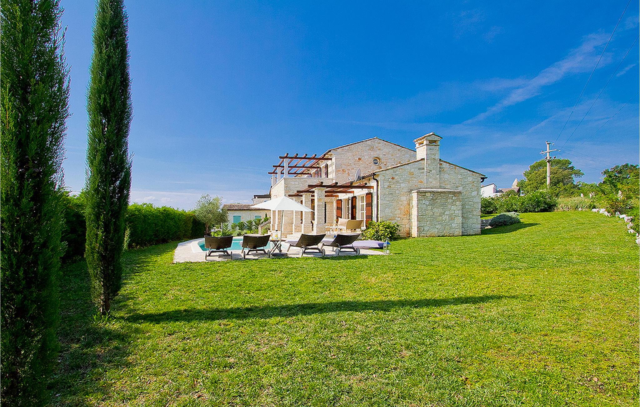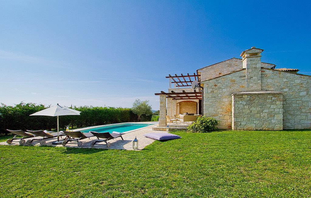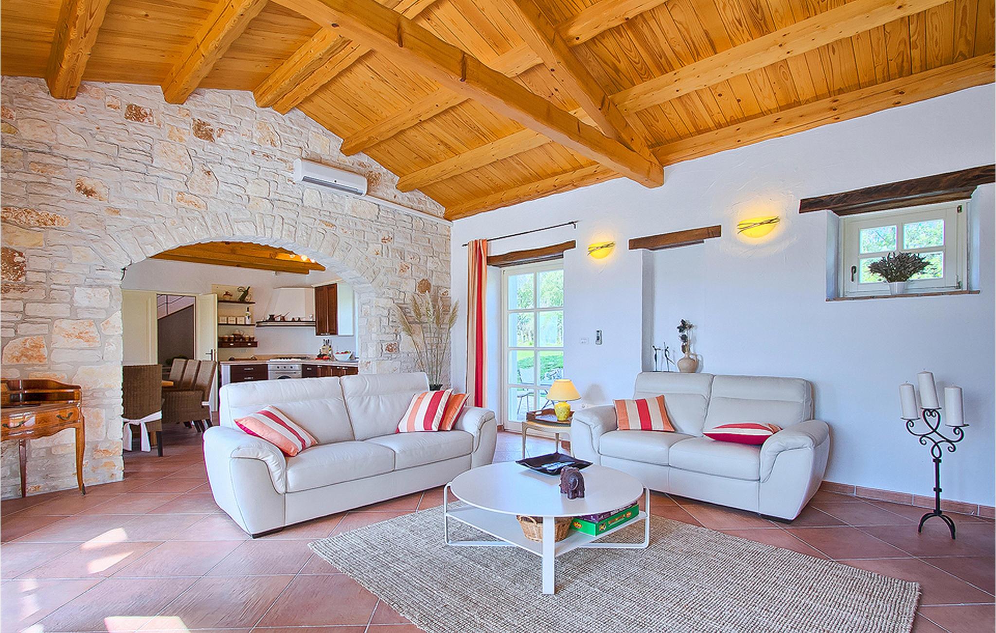 In der wunderschönen mit Holzbalken geschmackvoll dekorierten Villa gibt es vier Schlafzimmer, drei Bäder und ein schönes Wohnzimmer mit angeschlossener Küche und Essbereich. Das Erdgeschoss verfügt über Zugang zum Pool, charmanten grünen Garten und gemütlicher Essecke. Hier können Sie leckere Mahlzeiten zubereiten oder einfach ein Glas guten istrischen Weins genießen. Der große private Pool 40 m2 ist ausschließlich für die Nutzung während Ihres Aufenthaltes in dieser schönen Villa. Aus der Terrasse im Obergeschoss können Sie den herrlichen Blick auf die Umgebung genießen. Villa Livia hat einen schönen Garten rund um die Villa. Hier können Sie in der Sonne an bequemen Liegestühlen genießen. Diese Villa bietet einen ruhigen Rückzugsort aus der Hektik des 21. Jahrhunderts und ist doch gut als Ausgangspunkt, von dem Sie alle Freuden, die Istrien zu bieten hat, besuchen können. Jugendgruppen sind nicht erlaubt.