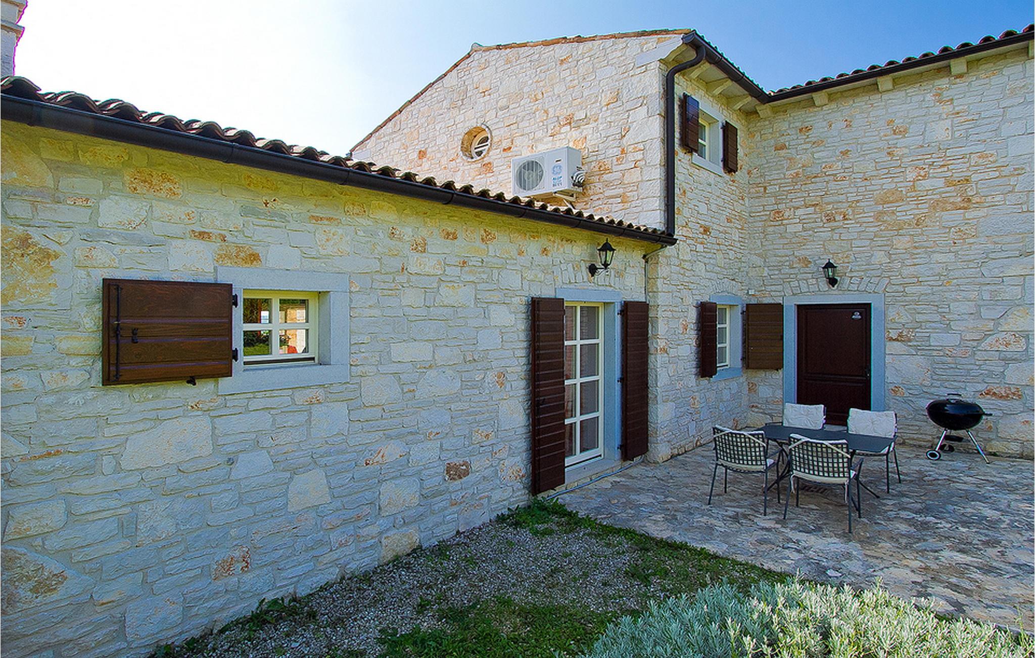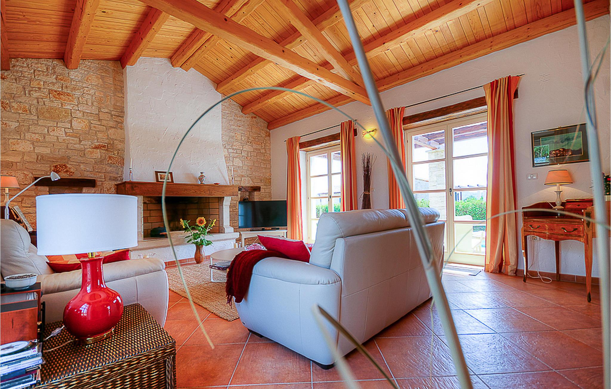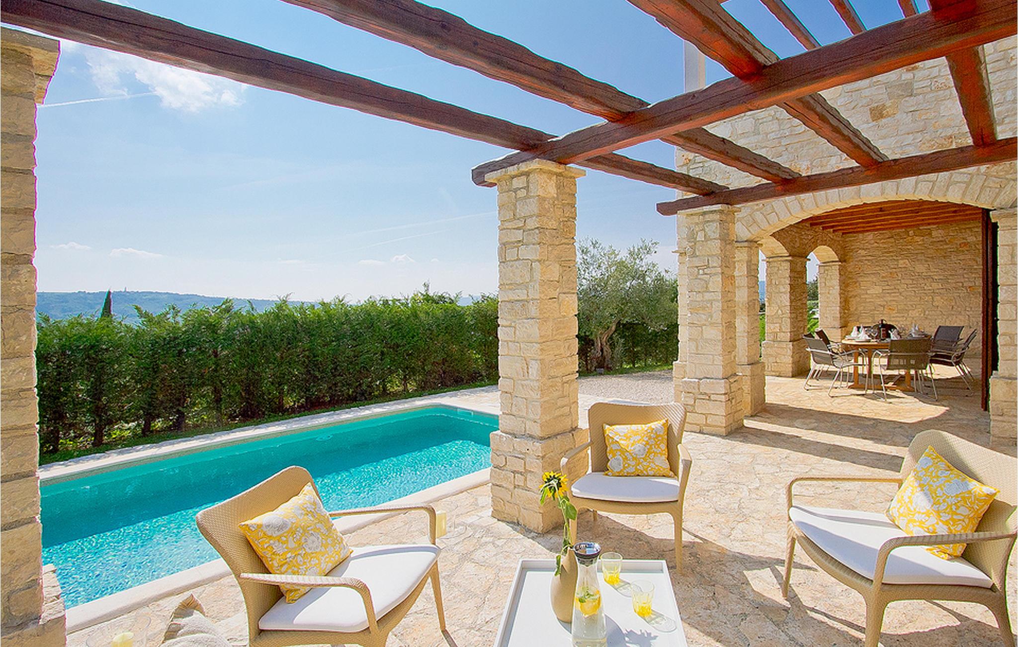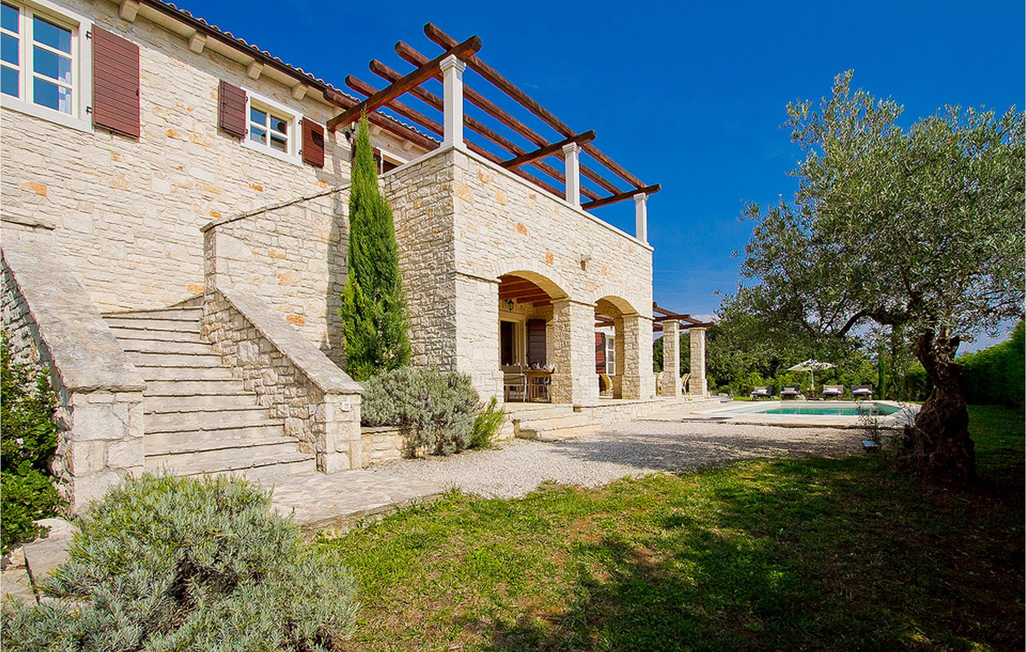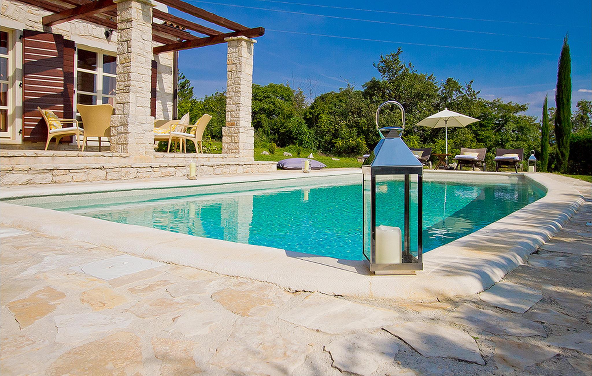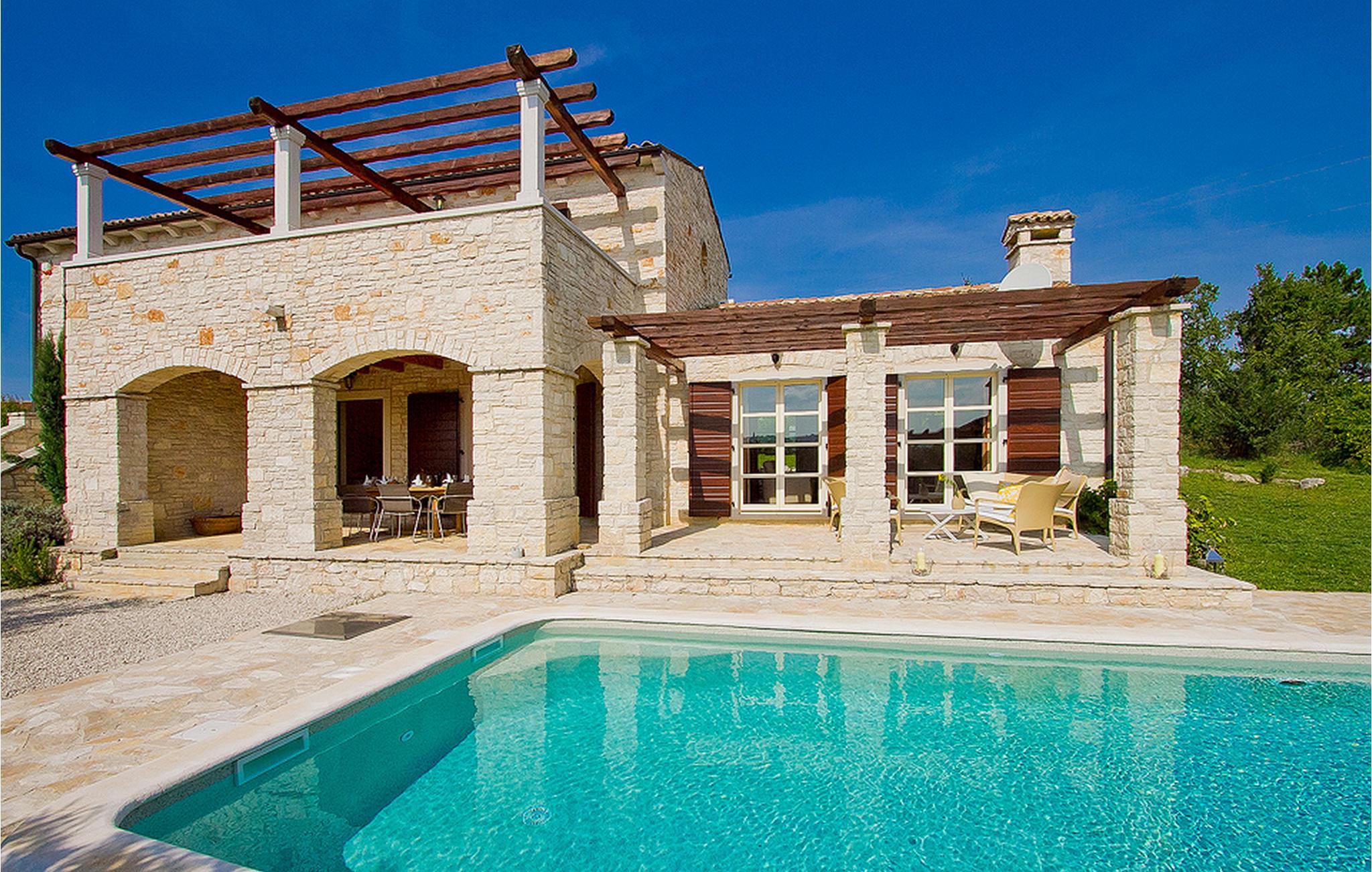 In der wunderschönen mit Holzbalken geschmackvoll dekorierten Villa gibt es vier Schlafzimmer, drei Bäder und ein schönes Wohnzimmer mit angeschlossener Küche und Essbereich. Das Erdgeschoss verfügt über Zugang zum Pool, charmanten grünen Garten und gemütlicher Essecke. Hier können Sie leckere Mahlzeiten zubereiten oder einfach ein Glas guten istrischen Weins genießen. Der große private Pool 40 m2 ist ausschließlich für die Nutzung während Ihres Aufenthaltes in dieser schönen Villa. Aus der Terrasse im Obergeschoss können Sie den herrlichen Blick auf die Umgebung genießen. Villa Livia hat einen schönen Garten rund um die Villa. Hier können Sie in der Sonne an bequemen Liegestühlen genießen. Diese Villa bietet einen ruhigen Rückzugsort aus der Hektik des 21. Jahrhunderts und ist doch gut als Ausgangspunkt, von dem Sie alle Freuden, die Istrien zu bieten hat, besuchen können. Jugendgruppen sind nicht erlaubt.