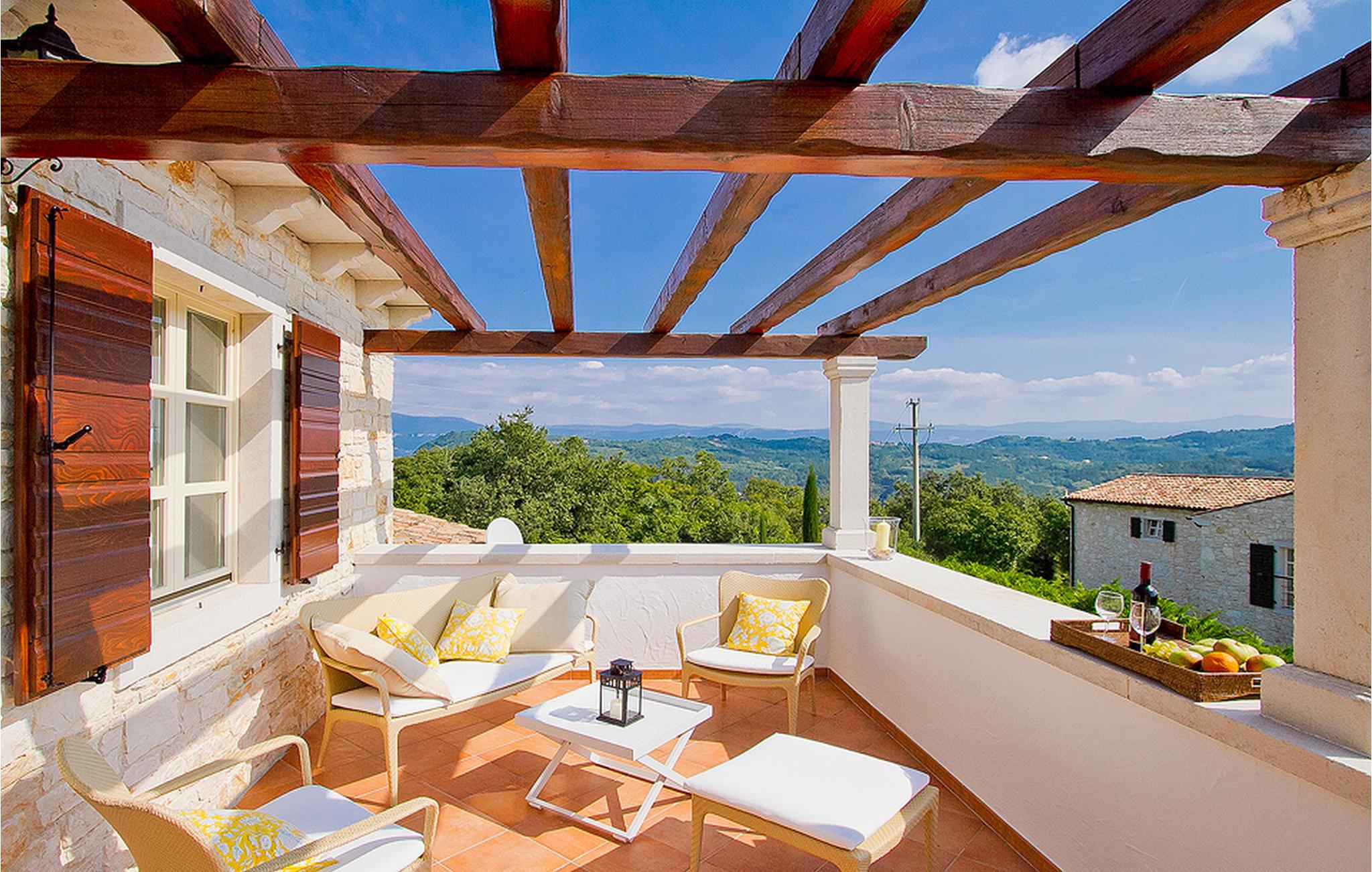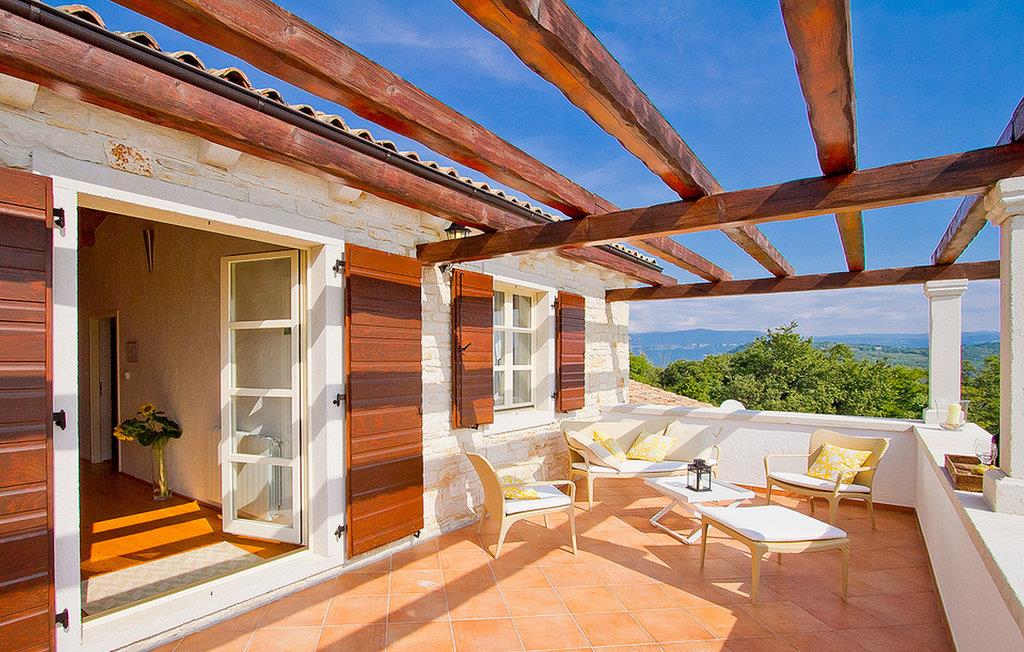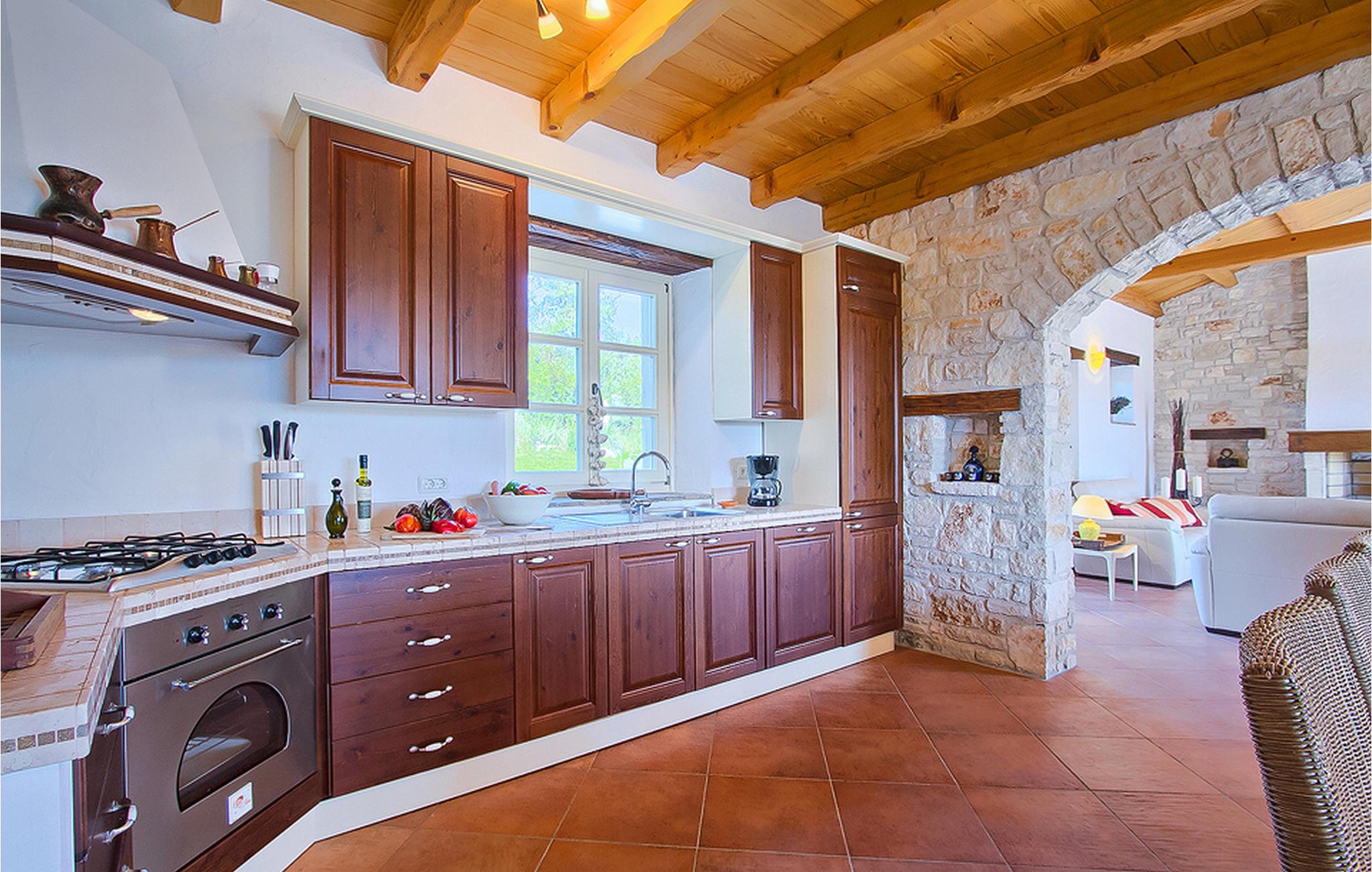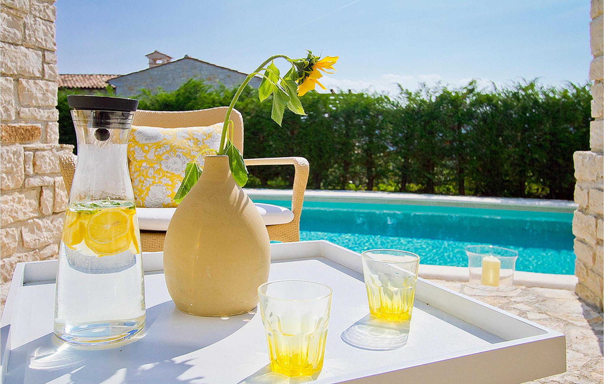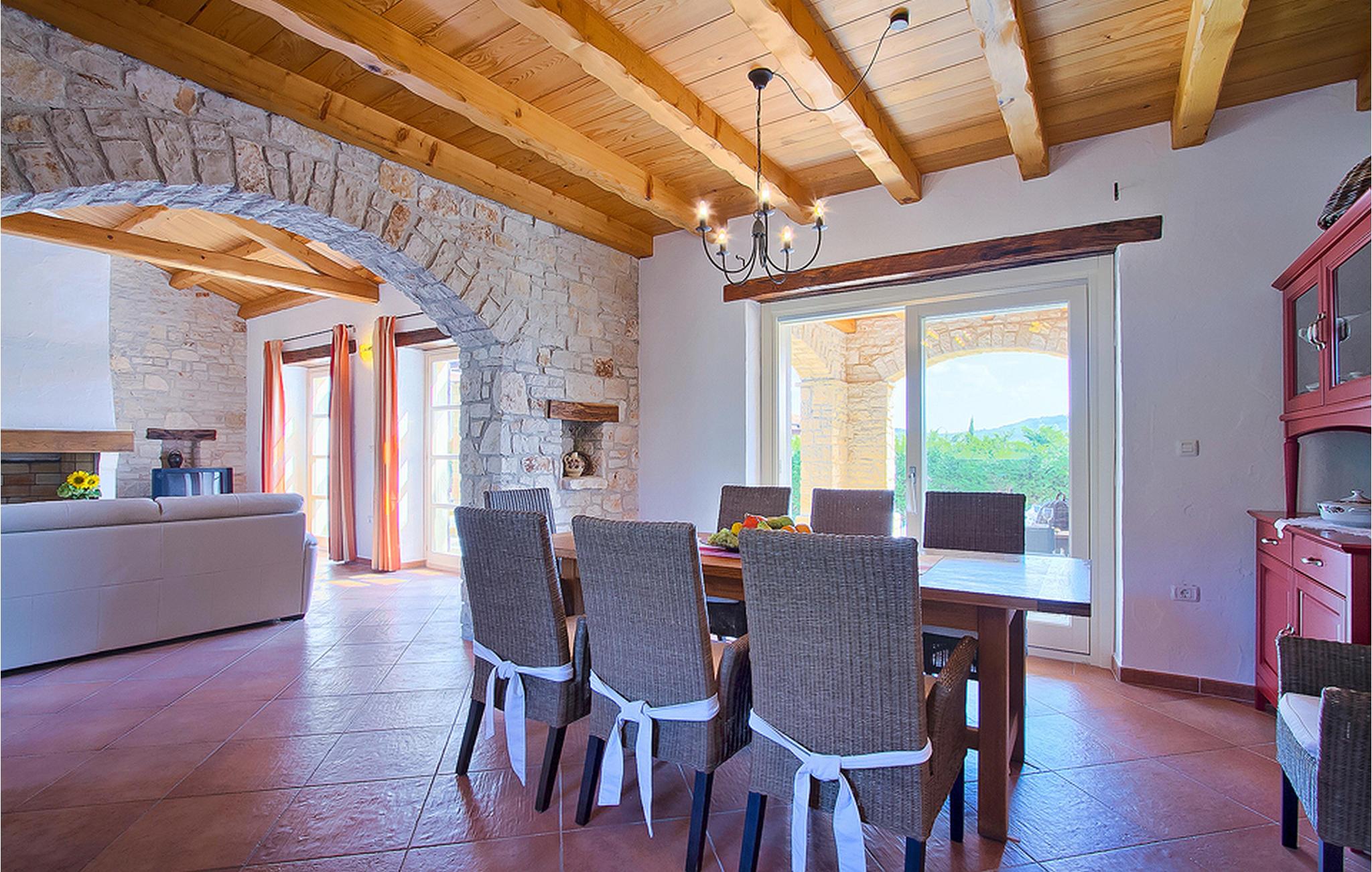 In der wunderschönen mit Holzbalken geschmackvoll dekorierten Villa gibt es vier Schlafzimmer, drei Bäder und ein schönes Wohnzimmer mit angeschlossener Küche und Essbereich. Das Erdgeschoss verfügt über Zugang zum Pool, charmanten grünen Garten und gemütlicher Essecke. Hier können Sie leckere Mahlzeiten zubereiten oder einfach ein Glas guten istrischen Weins genießen. Der große private Pool 40 m2 ist ausschließlich für die Nutzung während Ihres Aufenthaltes in dieser schönen Villa. Aus der Terrasse im Obergeschoss können Sie den herrlichen Blick auf die Umgebung genießen. Villa Livia hat einen schönen Garten rund um die Villa. Hier können Sie in der Sonne an bequemen Liegestühlen genießen. Diese Villa bietet einen ruhigen Rückzugsort aus der Hektik des 21. Jahrhunderts und ist doch gut als Ausgangspunkt, von dem Sie alle Freuden, die Istrien zu bieten hat, besuchen können. Jugendgruppen sind nicht erlaubt.
