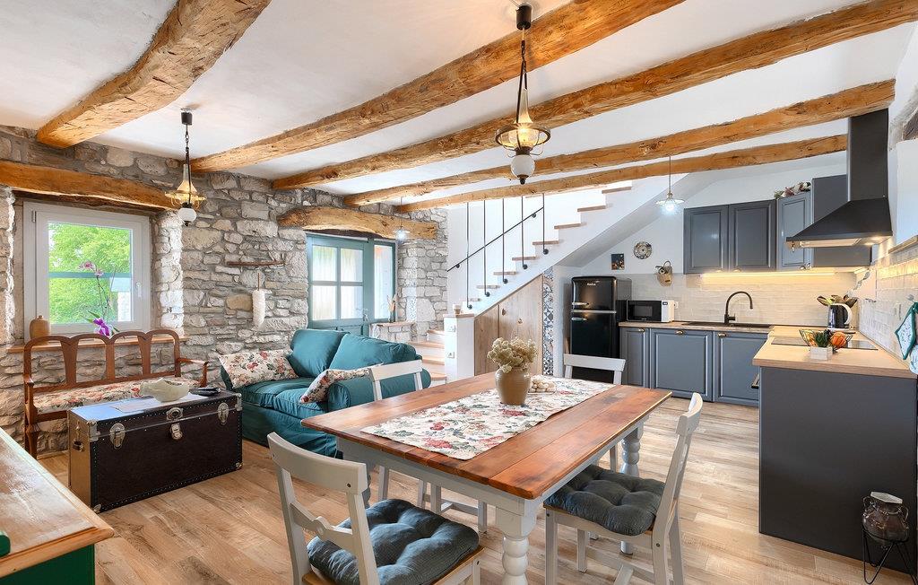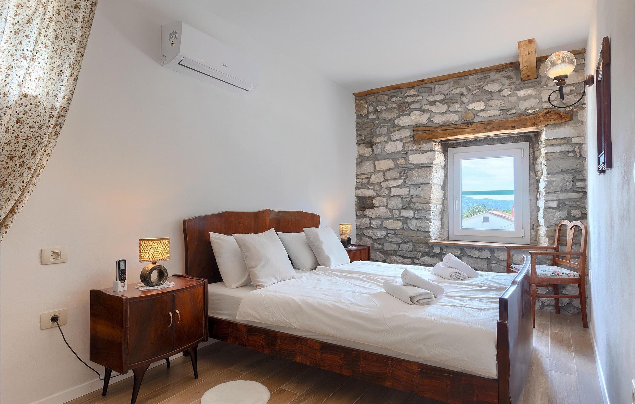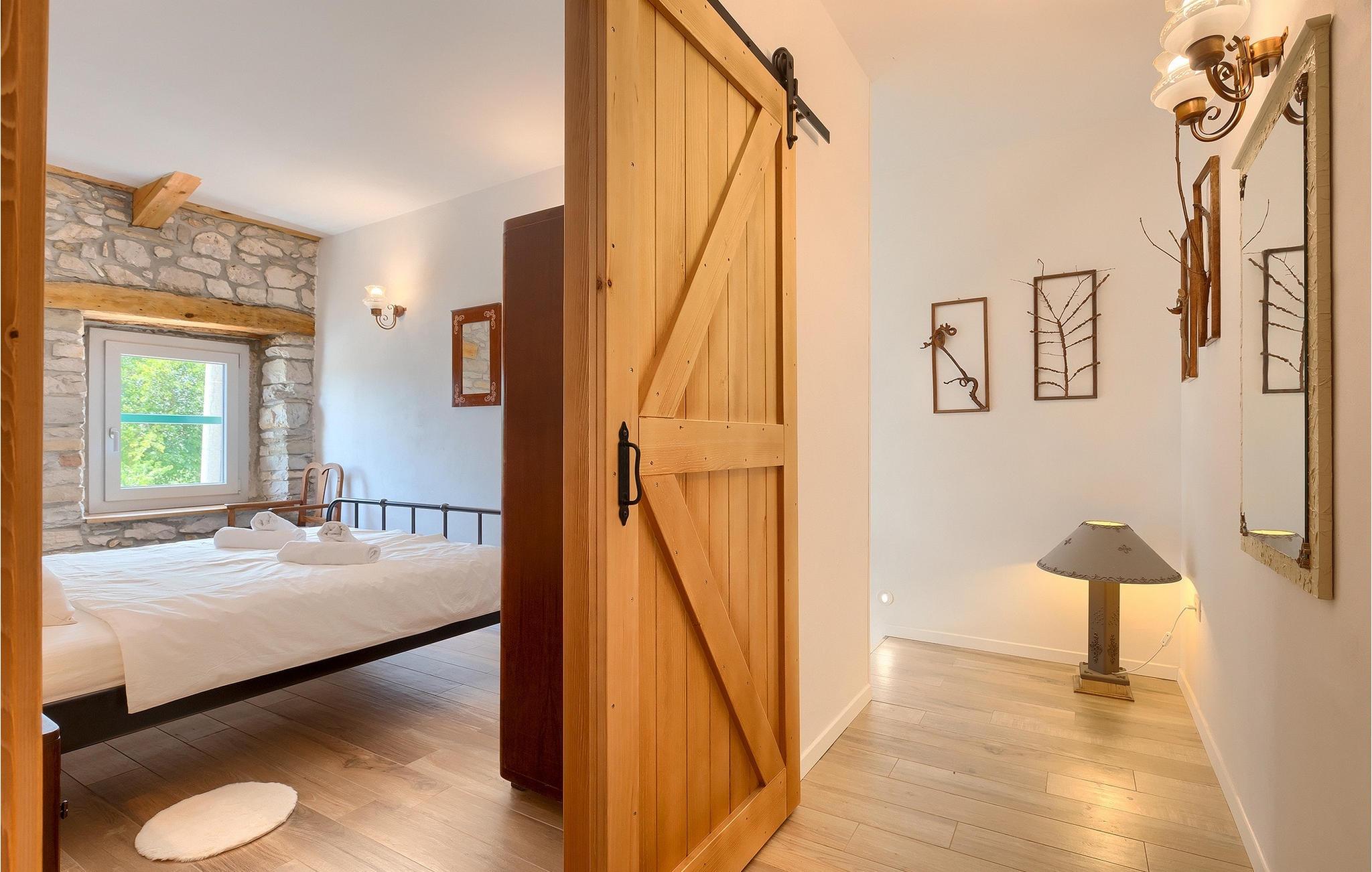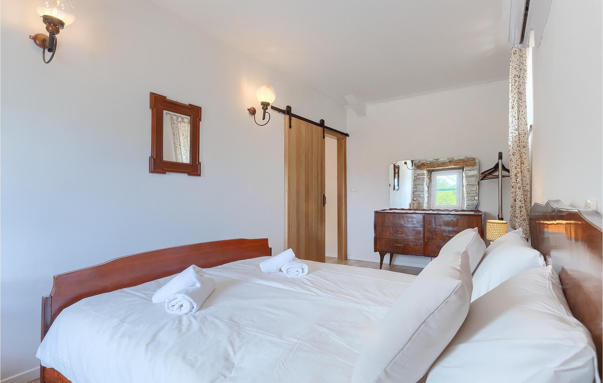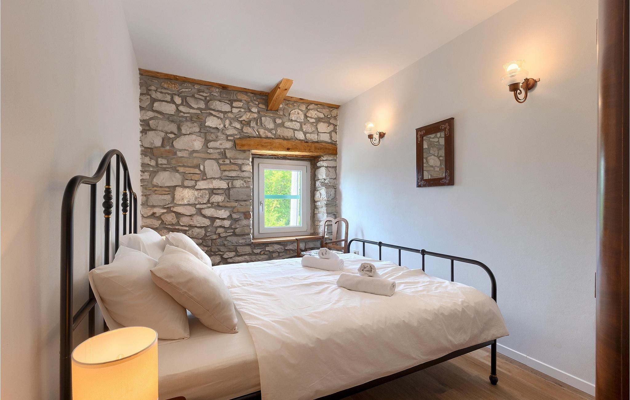 Denne idylliske traditionelle villa ligger i den middelalderlige og romantiske by Buzet. Alt er indrettet i en meget varm stil, så du vil føle dig hjemme. Villa Klara kan rumme op til 4 personer i dette hus. Husets udendørsareal er på 1300 m2, hvor du kan svømme i den private pool eller nyde solens stråler på liggestole. Mens du tilbereder traditionelle istriske retter på grillen med dine kære, kan du nyde den smukke udsigt fra den overdækkede terrasse på vinmarkerne og oliventræerne, der omgiver dette hus. Første sal er indrettet i rustik stil og består af fuldt udstyret køkken, spisestue og stue med naturligt lysindfald. På første sal er der desuden toilet og 1 badeværelse, samt direkte udgang til villaens terrasse. Trappen fører til 2. sal, hvor der er to rustikt møblerede soveværelser med dobbeltseng, dekoreret med en stenmur og antikke møbler, der giver denne villa sin unikke karakter. Book Villa Klara og sørg for en unik ferie i det smukke istriske landskab!Denne villa er beliggende nær Buzet, en af de middelalderlige maleriske byer i Istrien, omgivet af floden Mirna, kendt for sine stier med oliventræer og vinmarker, århundreder gammel arkitektur ideel til gåture og sightseeing. Takket være den rige vegetation langs Mirna-floden er Buzet også kendt som "Trøflernes by", så du bør ikke gå glip af søgen efter trøfler. Når du udforsker Buzets gader og dens omgivelser, vil du støde på bryggerier og traditionelle vinbarer, hvor du bør prøve lokale specialiteter: Istrisk malvasia, prosciutto og pasta med trøfler. For dem, der ønsker at holde en aktiv ferie, byder dette område på adskillige aktiviteter: Besøg i bjerglejren Raspadalica, hvor du kan nyde gratis klatring, paragliding eller cykling, eller vandre- og cykelture på de velkendte stier i denne region. Hum, der er kendt som den mindste by i verden, er bestemt et anbefalet sted at lære denne lille bys charme og unikke karakter at kende. Vandløbet i floden Mirna med sine vandfald og turkise bassiner i den gamle bydel i Kotli er bestemt et naturfænomen, der er perfekt til en dagstur.