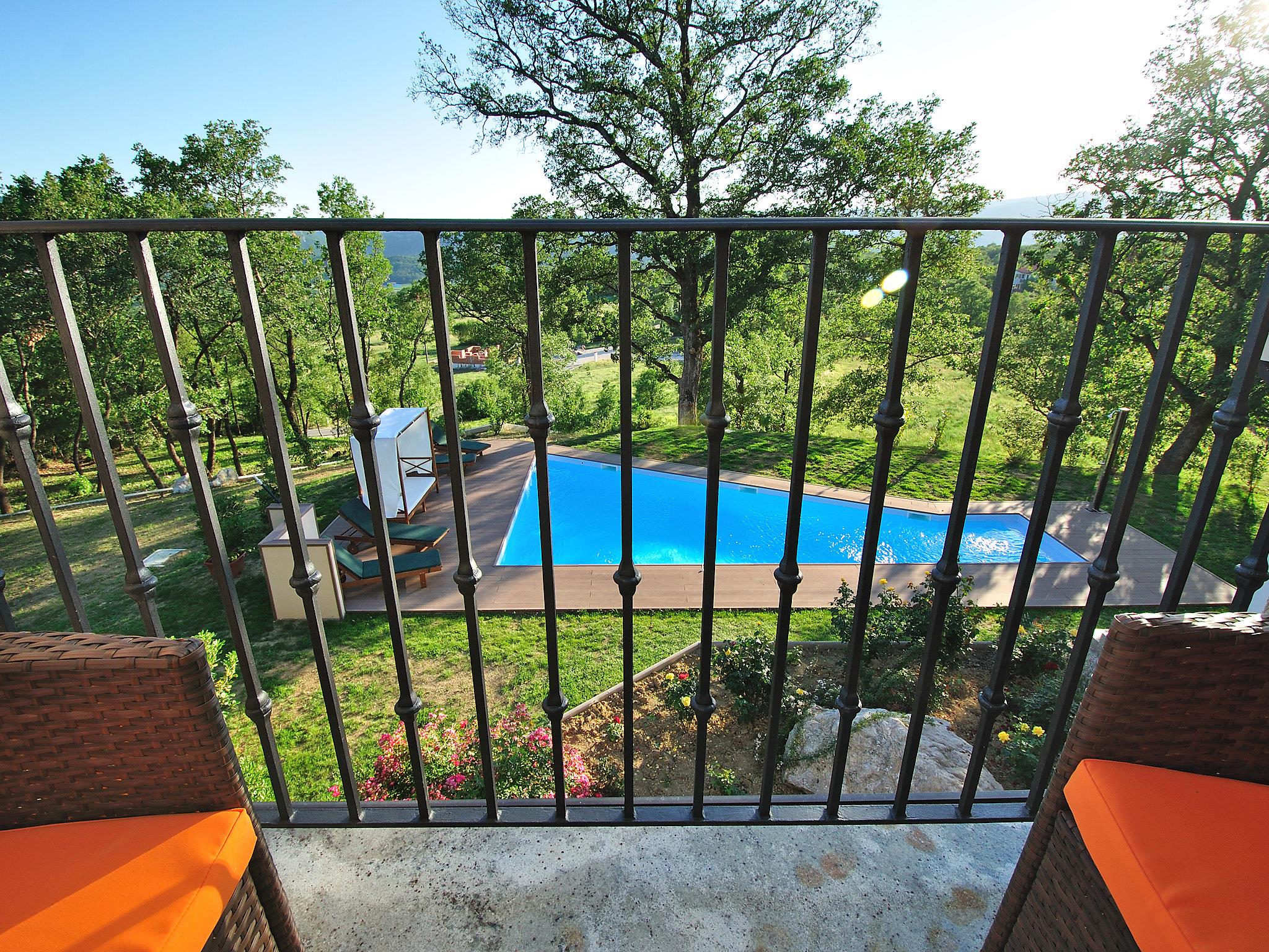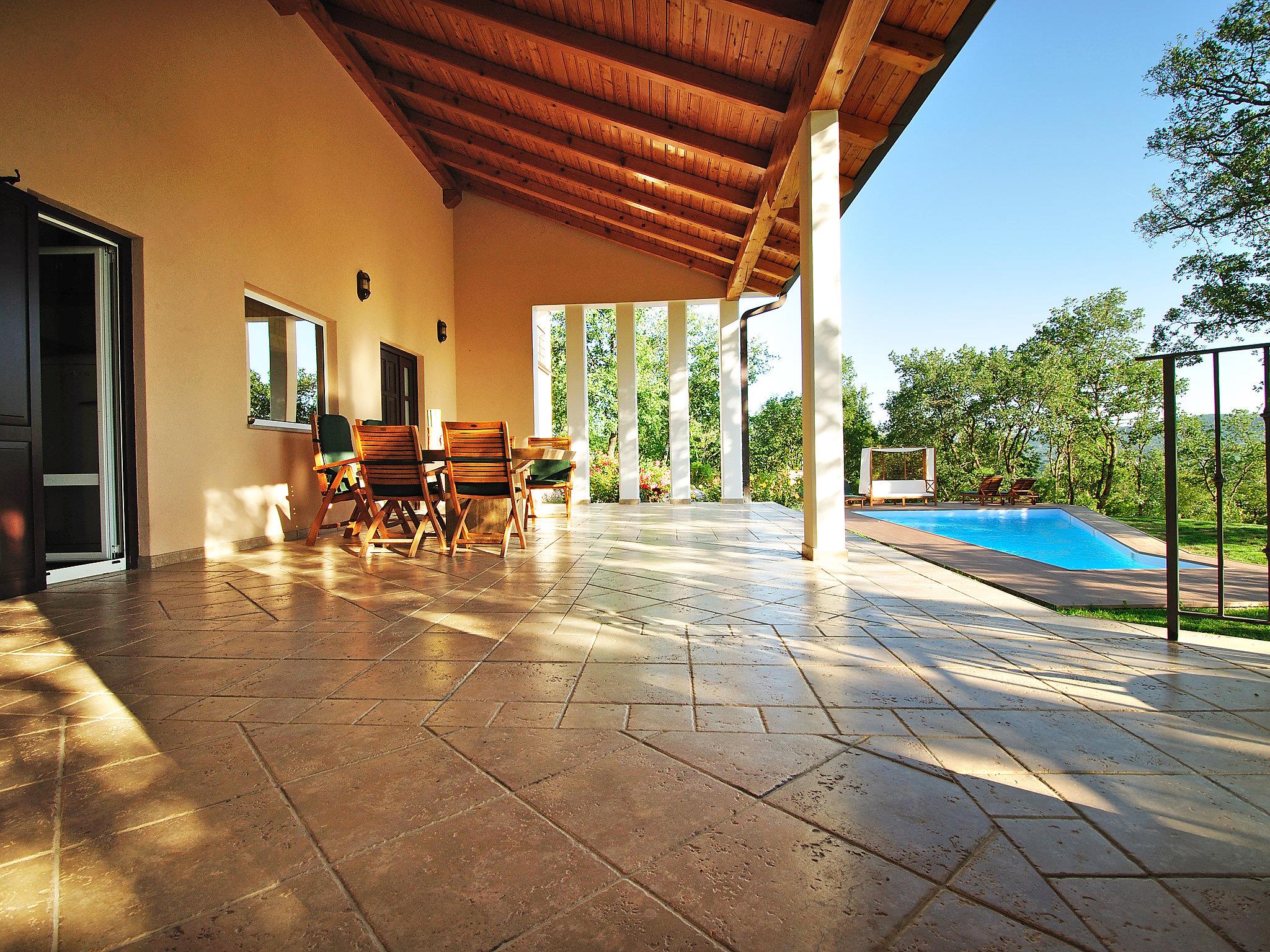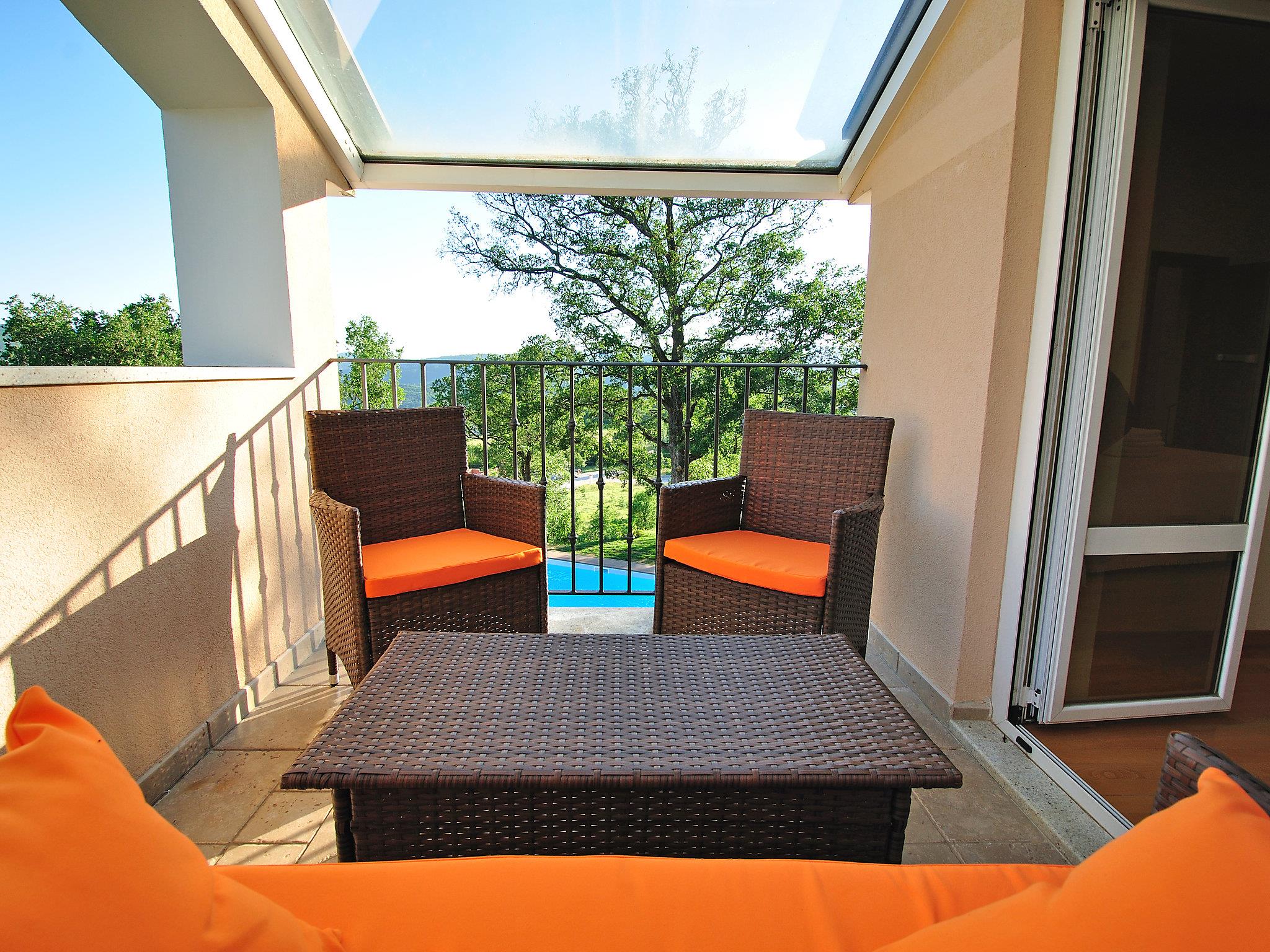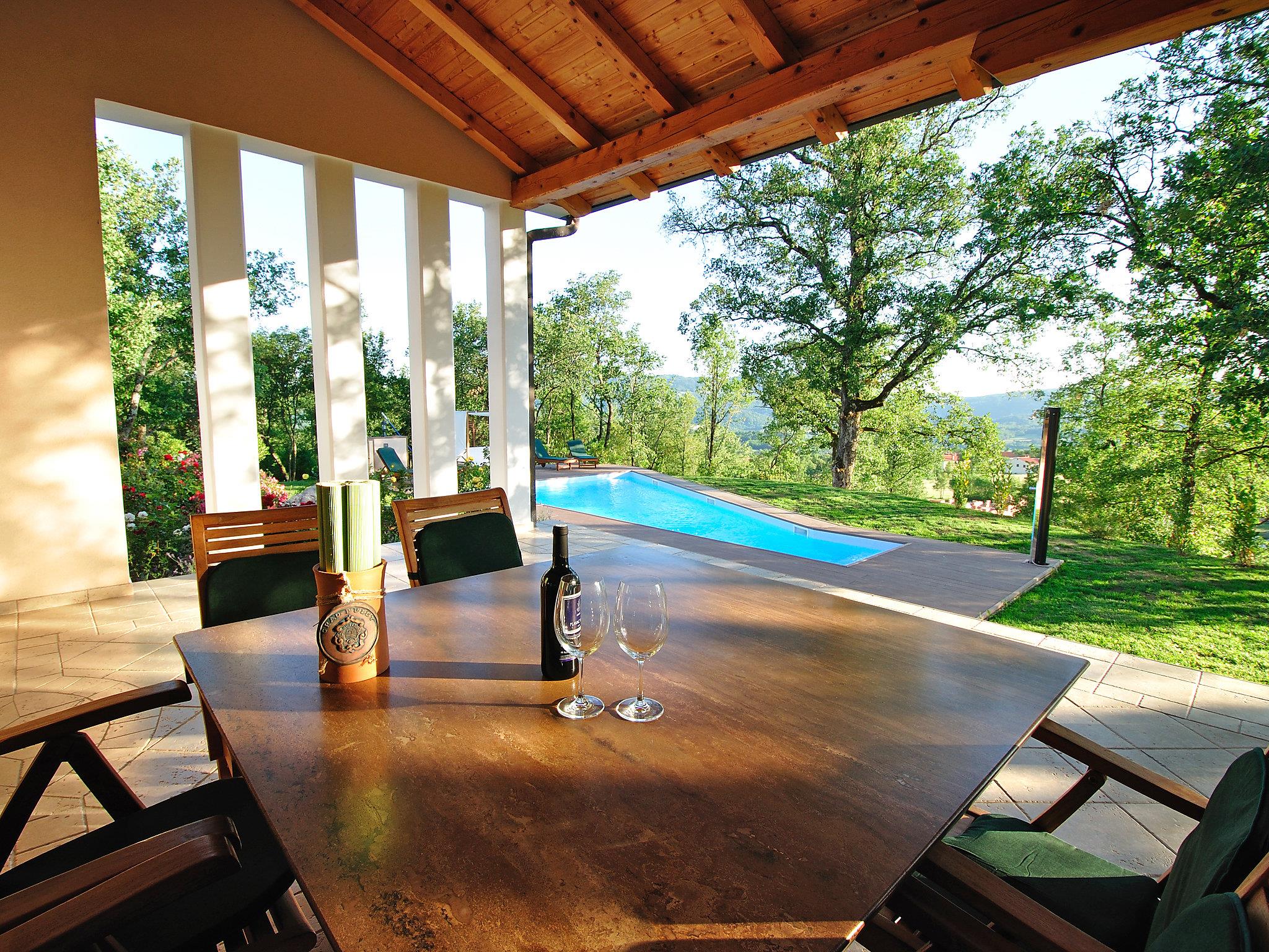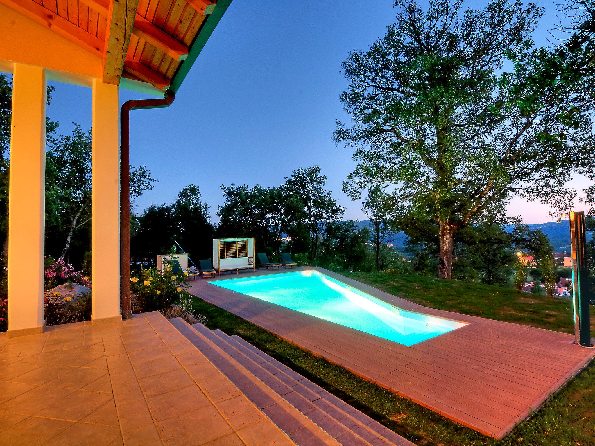Modern, beautiful villa "Vesna", 2 storeys. 2.5 km from the centre of Buzet, 35 km from the centre of Novigrad, outside the resort, in a quiet position on top of a hill, 35 km from the sea, in the countryside. Private: property 3'000 m2 (fenced), garden with lawn and flowers, swimming pool (40 m2, depth 140 cm, seasonal availability: 01.May. - 18.Sep.) with internal staircase. Outdoor shower. In the house: internet access, washing machine, tumble dryer. Parking at the house on the premises. Shop 2.5 km, restaurant 2.5 km, bus stop 1.9 km, pebble beach 35 km. Tennis 2.5 km, walking paths from the house, cycle lane 50 m. Nearby attractions: park prirode Ucka 25 km. Swimming pool with hydromassage.