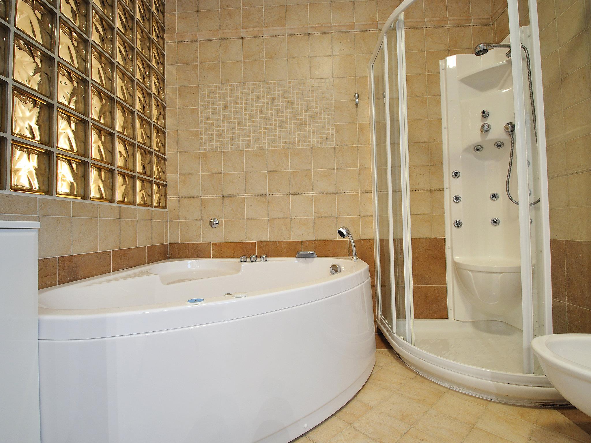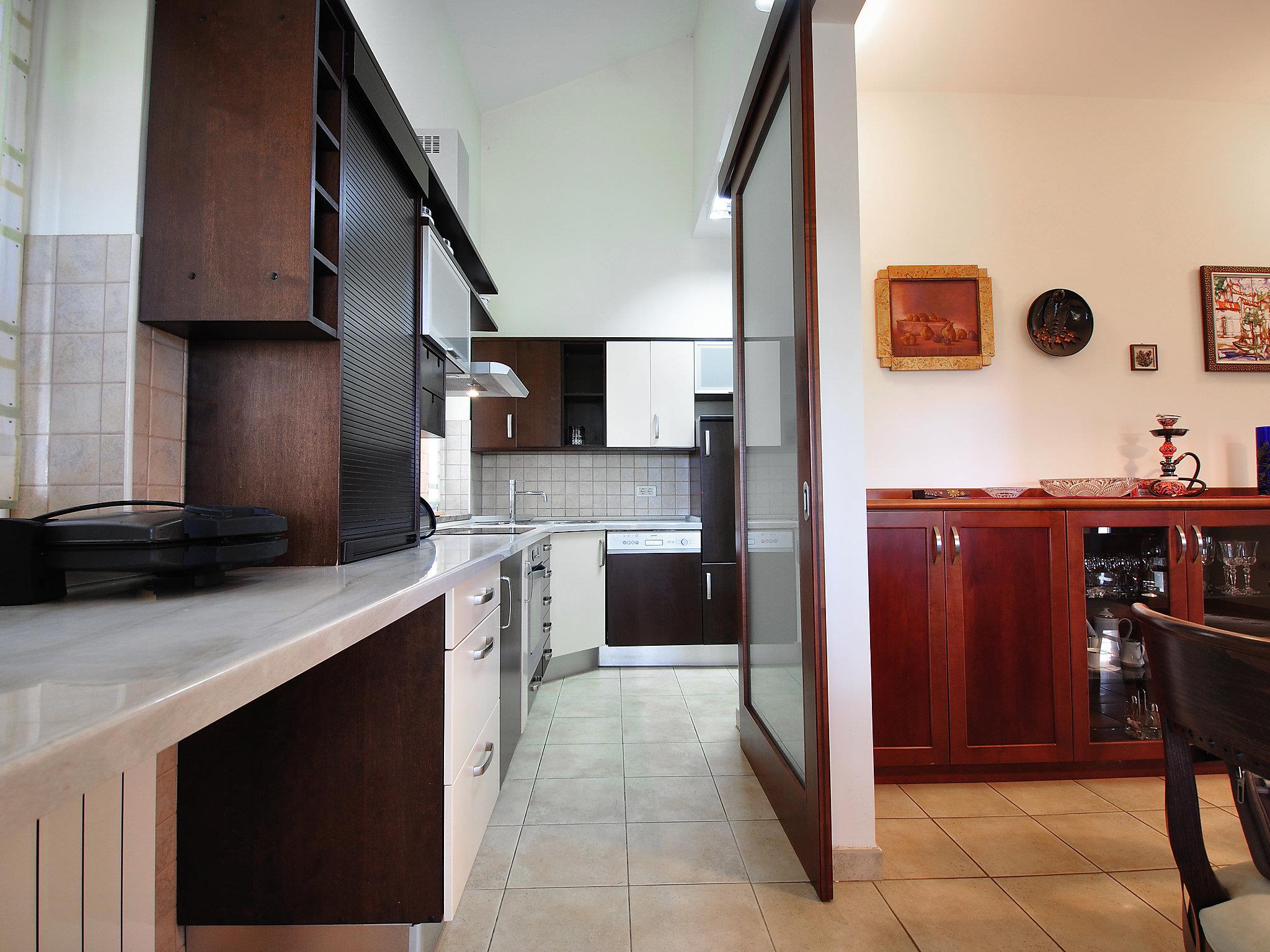6-room villa 300 m2 on 2 levels. Comfortable and tasteful furnishings: living room with panoramic window with satellite TV (flat screen), DVD and air conditioning. Dining room with satellite TV (flat screen). Exit to the terrace. Open kitchen (4 hot plates, oven, dishwasher, microwave). Sep. WC. Upper floor: 1 room with sloping ceilings, ceiling height 160 - 250 cm with 1 french bed (160 cm, length 200 cm), bath/shower/WC, hydro massage shower and hydro massage bath. 1 room with sloping ceilings, ceiling height 160 - 250 cm with 1 double bed (2 x 80 cm, length 200 cm), shower/WC and air conditioning. Exit to the terrace. 1 room with sloping ceilings, ceiling height 160 - 250 cm with 1 double bed (2 x 80 cm, length 200 cm), air conditioning. 1 room with sloping ceilings, ceiling height 160 - 250 cm with rooflight with 2 beds (80 cm, length 190 cm). Shower/WC. Terrace 55 m2, roofed terrace 6 m2. Terrace furniture, barbecue (portable), deck chairs. View of the swimming pool and the countryside. Facilities: baby cot. Internet (WiFi, free). Garage (2 cars). Maximum 1 pet/ dog allowed. On the ground floor:tavern with barbecue, satellite-TV (flat screen TV).