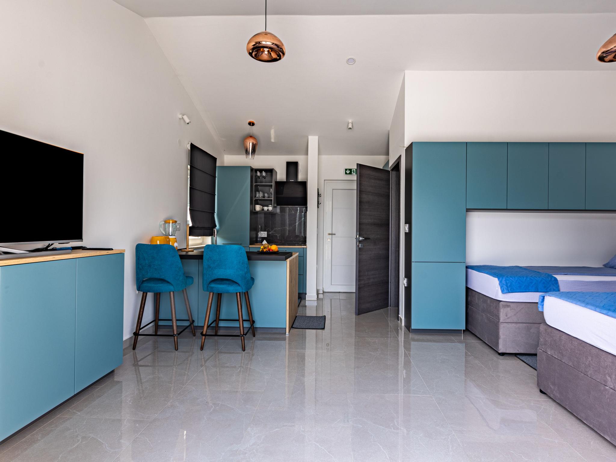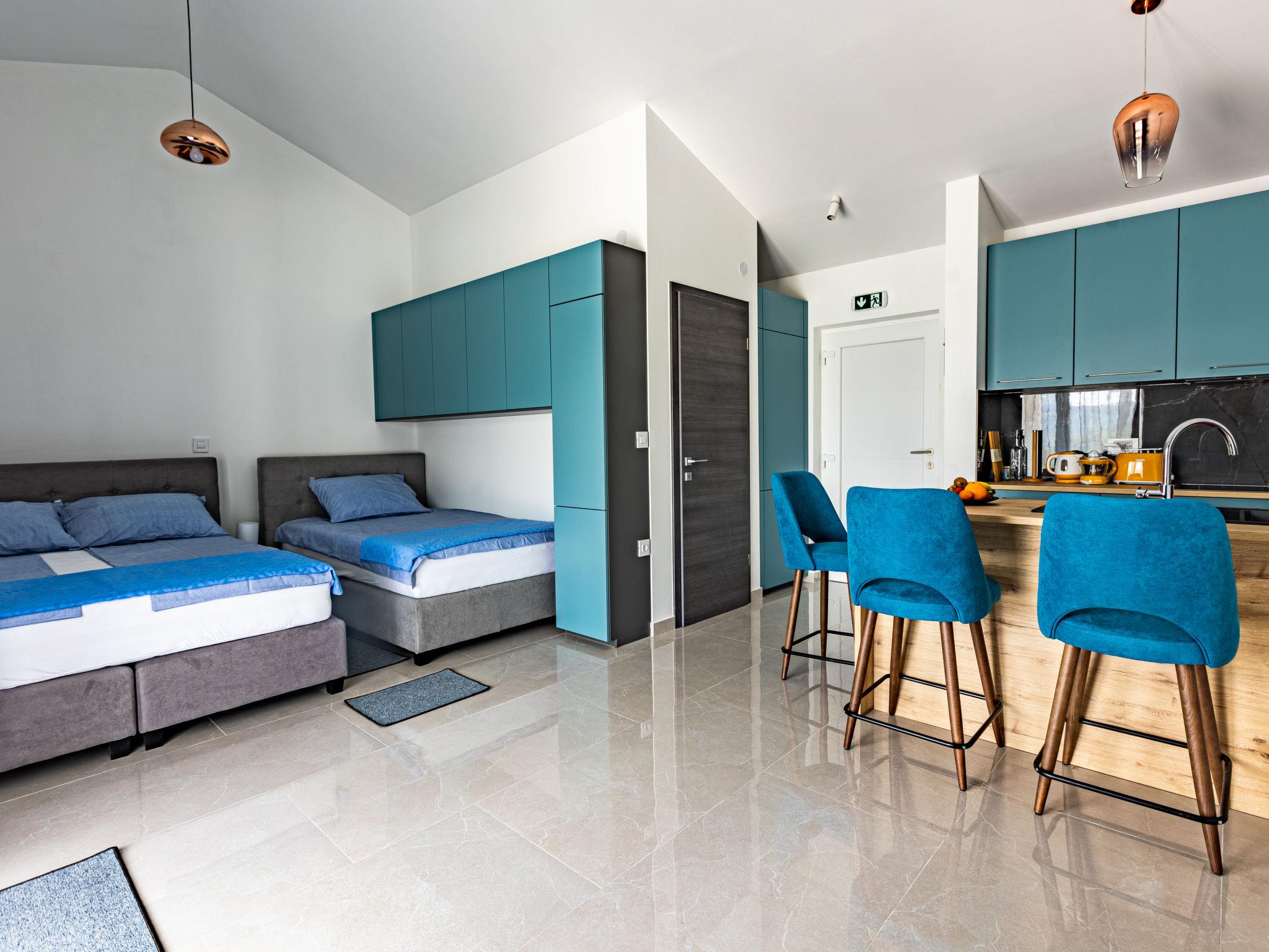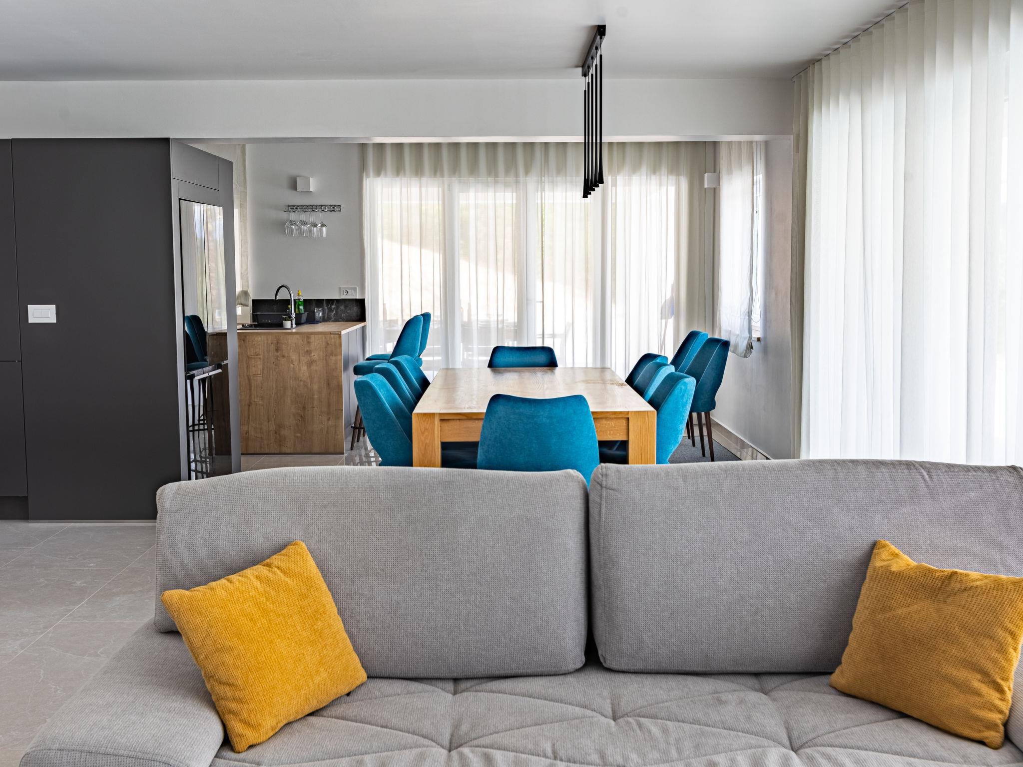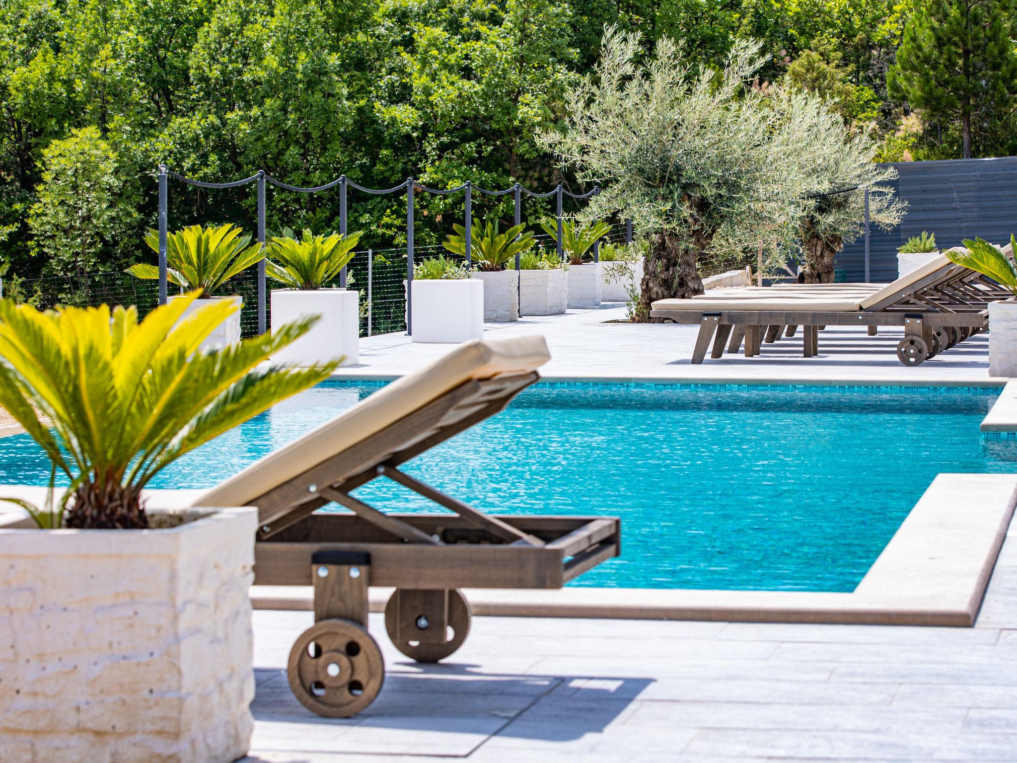 6-room house 290 m2 on 2 levels. Beautiful and cosy furnishings: living/dining room with satellite TV and air conditioning. Exit to the terrace, to the swimming pool. Living/sleeping room with 1 french bed (140 cm, length 200 cm), kitchen corner, shower/WC, satellite TV and air conditioning. Exit to the terrace, to the swimming pool. 1 room with 1 bed (120 cm, length 200 cm), shower/WC and air conditioning. Exit to the terrace, to the swimming pool. Studio with 1 bed (90 cm, length 200 cm), 1 french bed (160 cm, length 200 cm), kitchen corner, shower/WC, satellite TV and air conditioning. Exit to the terrace, to the swimming pool. Open kitchen (oven, dishwasher, 4 induction hot plates, toaster, kettle, microwave, freezer, electric coffee machine). Exit to the terrace. 2 sep. WC's. Upper floor: 2 rooms, each room with 1 french bed (180 cm, length 200 cm), shower/WC and air conditioning. Exit to the balcony. Forced-air heating. Balcony 18 m2, terrace 120 m2 partly roofed terrace 35 m2, roofed. Terrace furniture, balcony furniture, deck chairs. Beautiful view of the countryside. Facilities: iron, children's high chair, hair dryer. Internet (WiFi, free). Please note: non-smoking house. Maximum 1 small pet/ dog allowed. No internal connecting door between the separated properties. The main house consists of a living room and an open kitchen on the ground floor and 2 bedrooms on the first floor. Next to the house is an apartment on the ground floor, consisting of a living/sleeping room, a kitchen block and one bedroom. The third accommodation unit is a studio apartment on the ground floor.