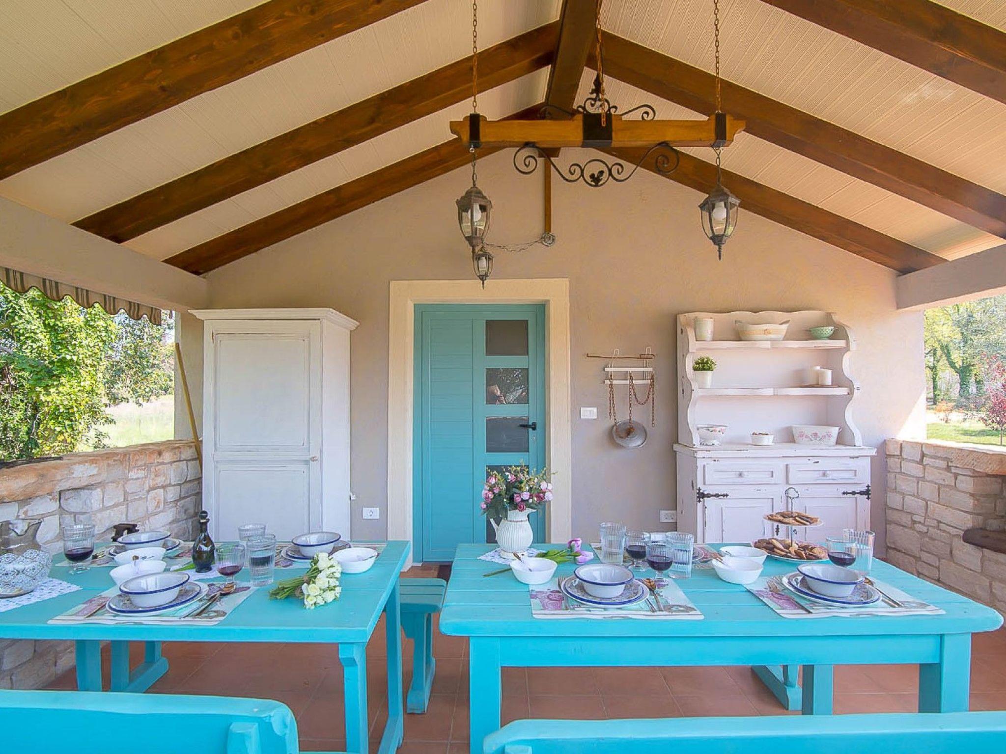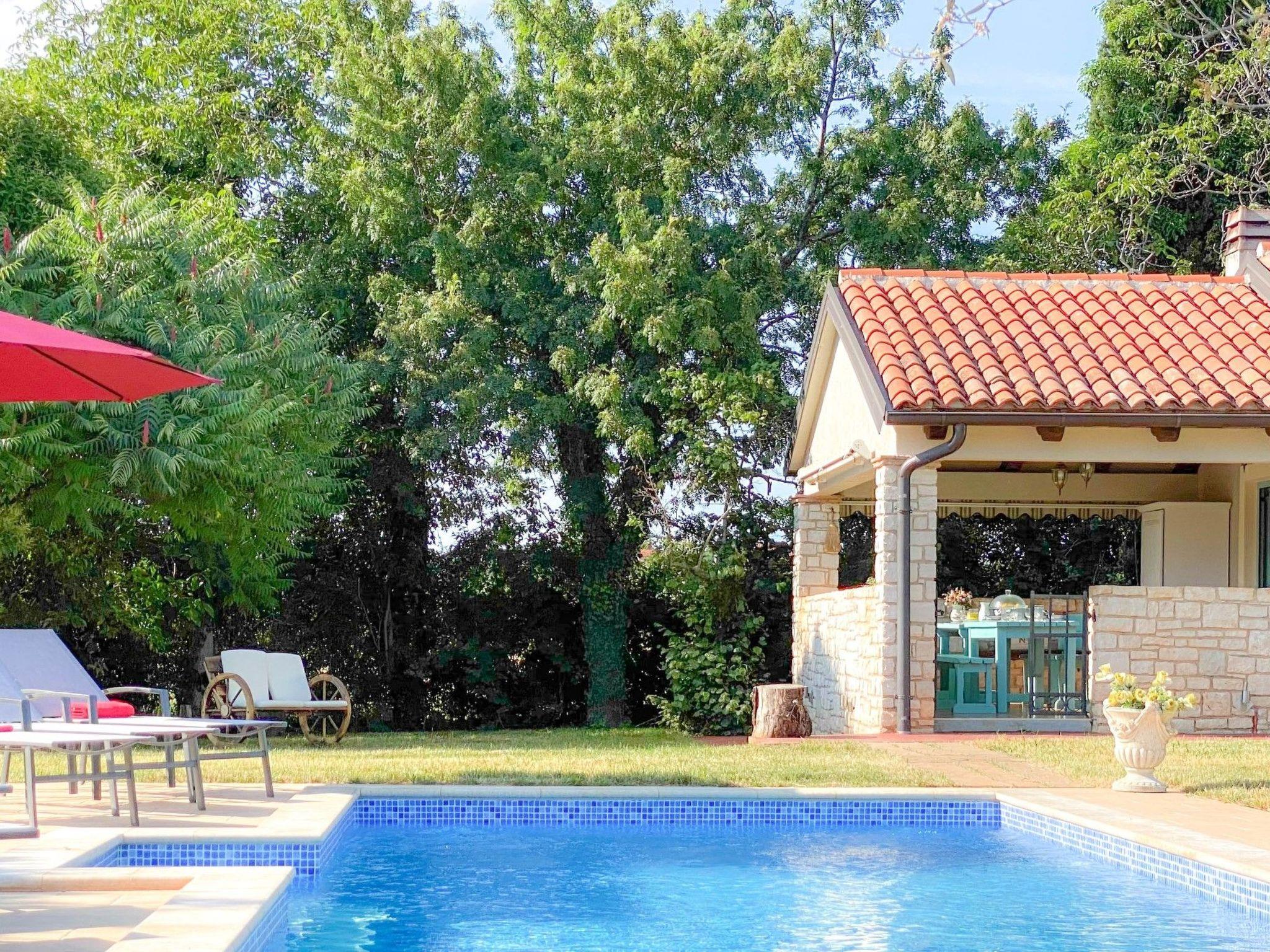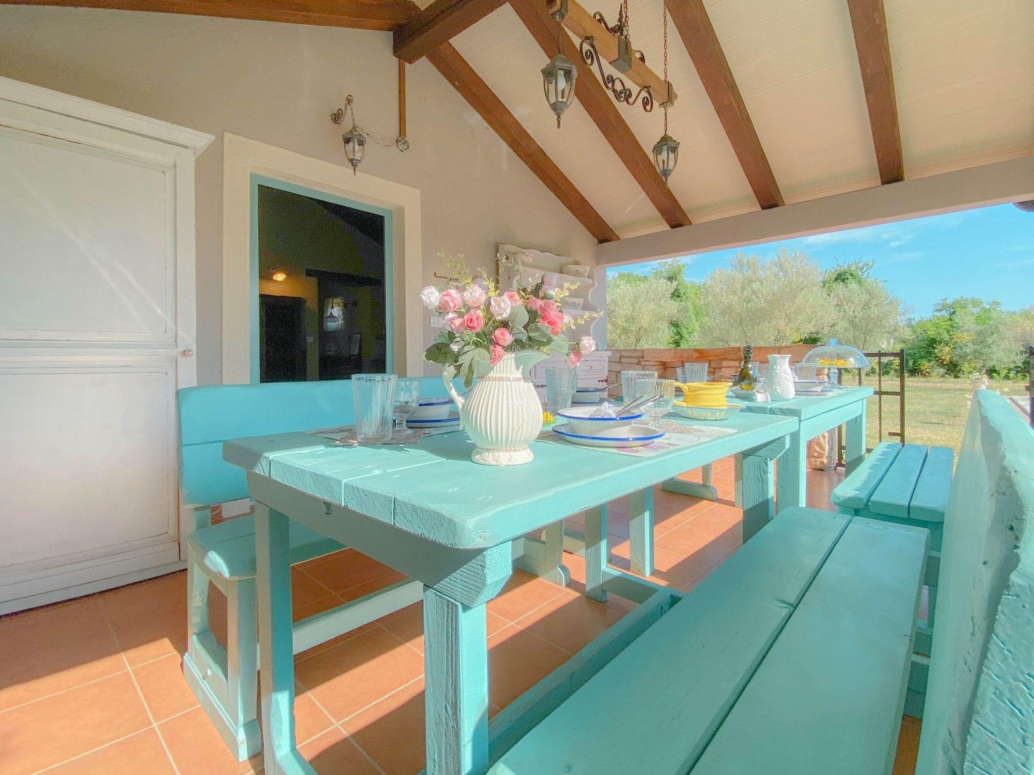 The outdoor area of Villa Romana is a testament to leisure and relaxation. The heart of this oasis is the private pool, complemented by sun loungers and parasols for soaking up the Istrian sun. Additionally, a 40m2 covered terrace complete with a barbecue and dining area invites guests to enjoy al fresco meals amidst the tranquil surroundings. An outdoor shower adds a touch of convenience, making it easy to freshen up after a dip in the pool or a day at the nearby beach.
