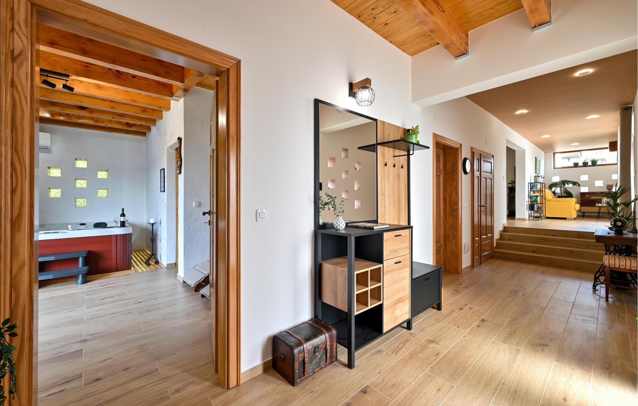 Dette moderne feriehus byder jer velkommen med en stilfuld og komfortabel atmosfære, hvor I straks vil føle jer hjemme. Varme grønne toner i den åbne stue- og spiseafdeling skaber en hyggelig og afslappet stemning. Blandt husets mange højdepunkter er den smagfuldt indrettede wellnessafdeling, der forkæler jer med en hydromassage-kar og en sauna.