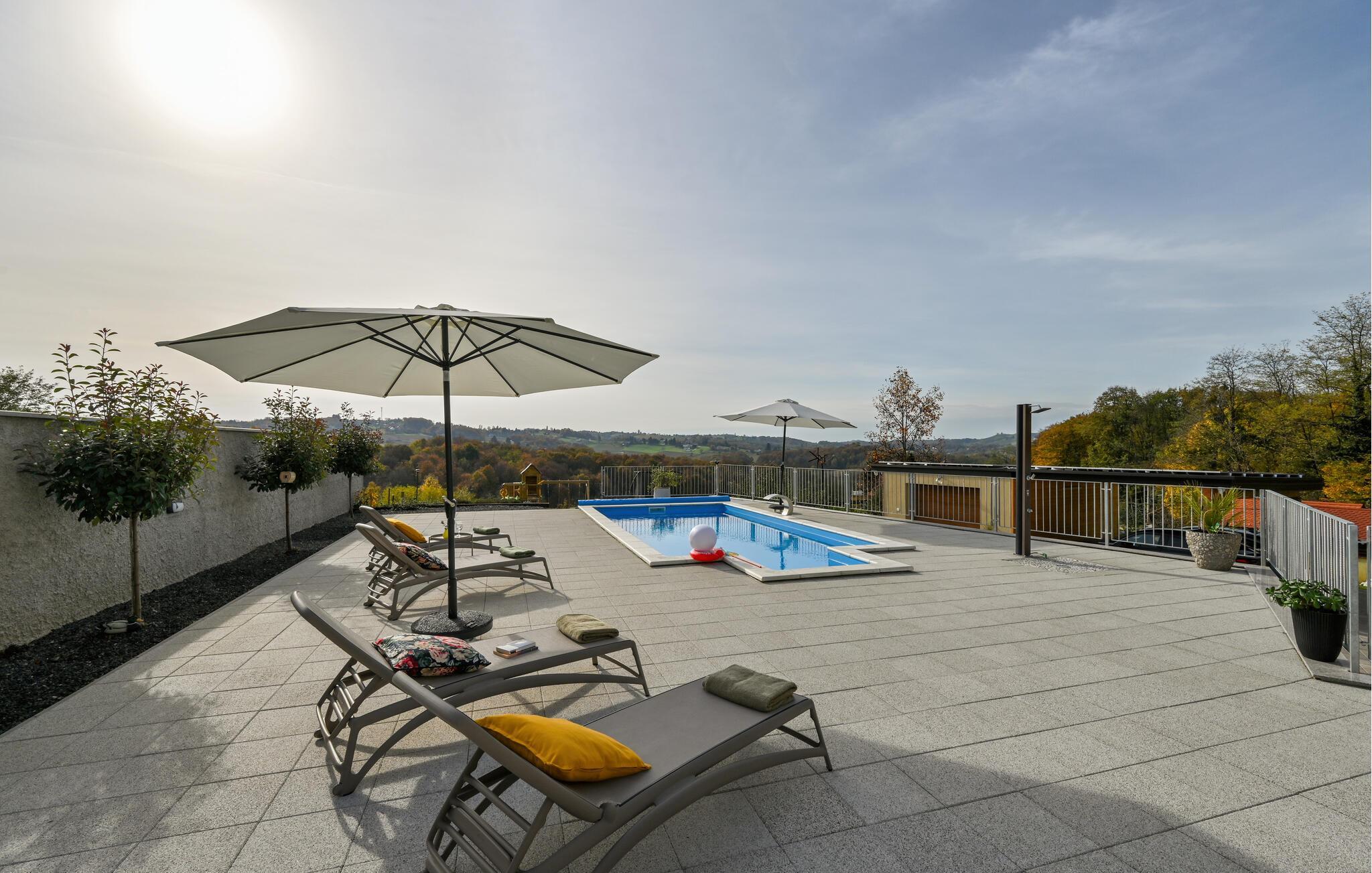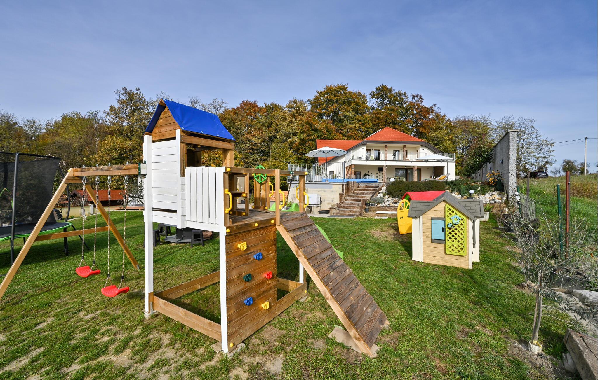 Det rummelige udendørsområde har flere terrasser, der lægger op til solbadning, stjernekig og hyggelige grillaftener. På den overdækkede terrasse med udendørs spiseplads kan I nyde stemningsfulde måltider med udsigt til poolen. Til de yngste gæster er der en farverig legeplads med gynger, rutsjebane og trampolin – perfekt til uforglemmelige familiestunder.