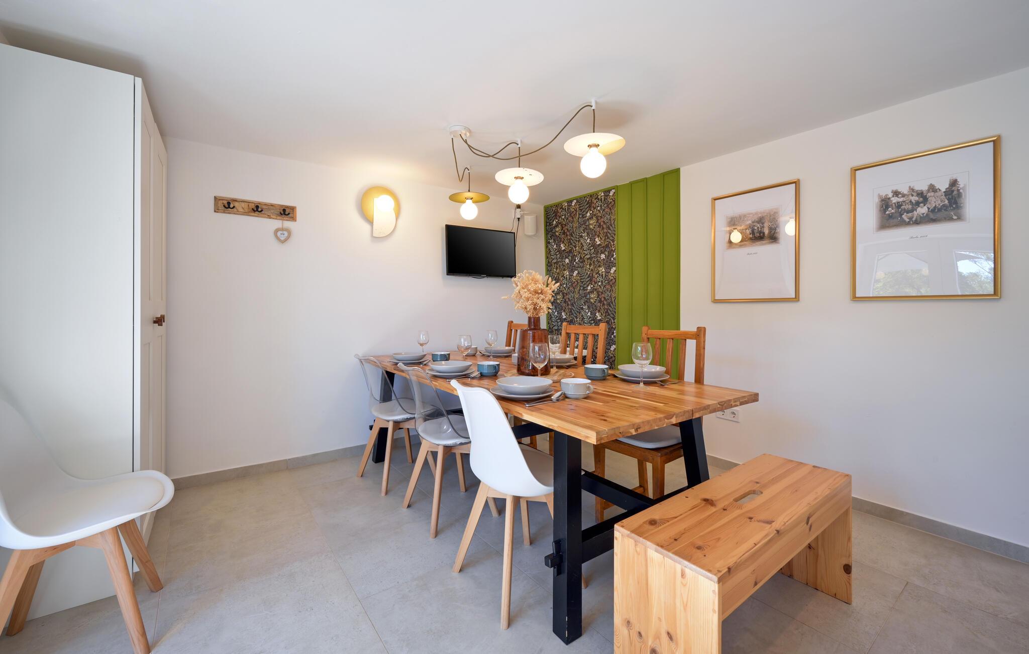 Omgivet af ro og frodig natur er dette moderne og komfortabelt møblerede feriehus det ideelle sted at undslippe den travle hverdag. Tilbered lækre retter i det åbne køkken og sæt jer ved spisebordet. Nyd harmoniske spilleaftener her eller sæt jer til rette til en filmaften på sofaen.
