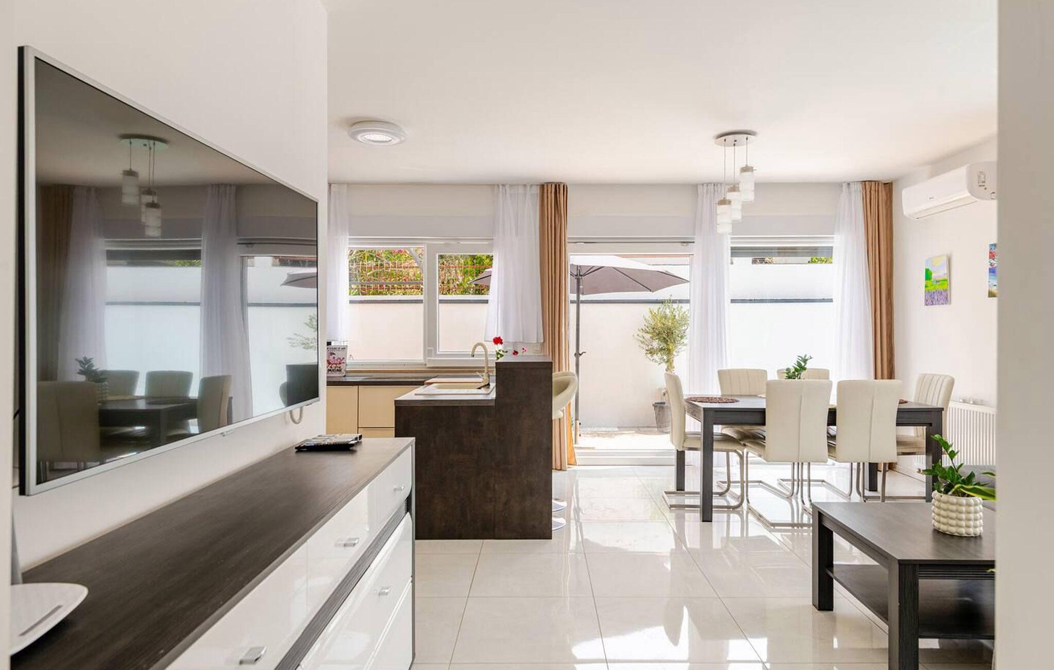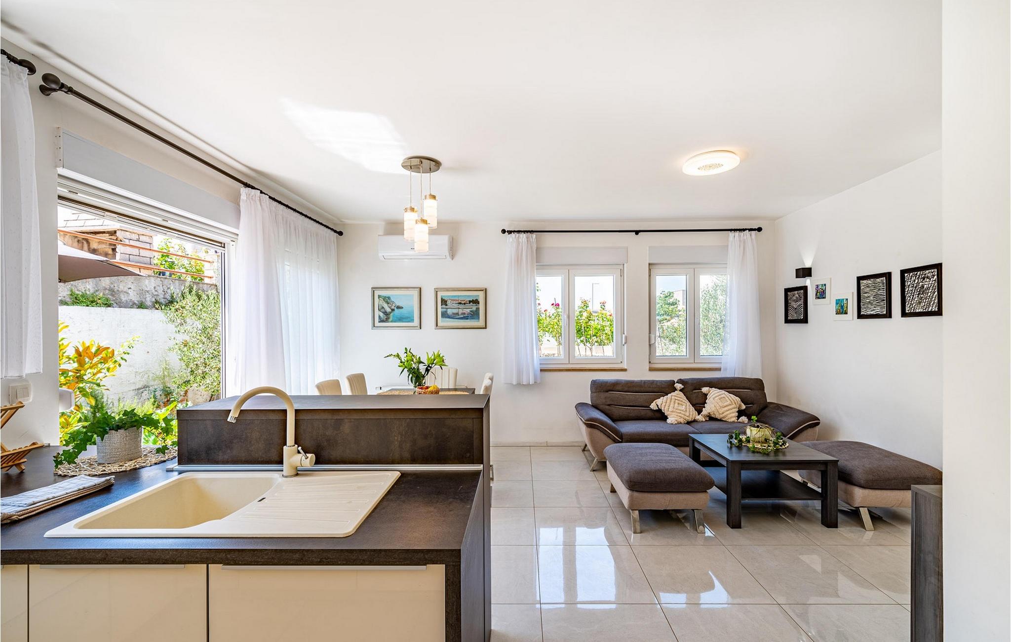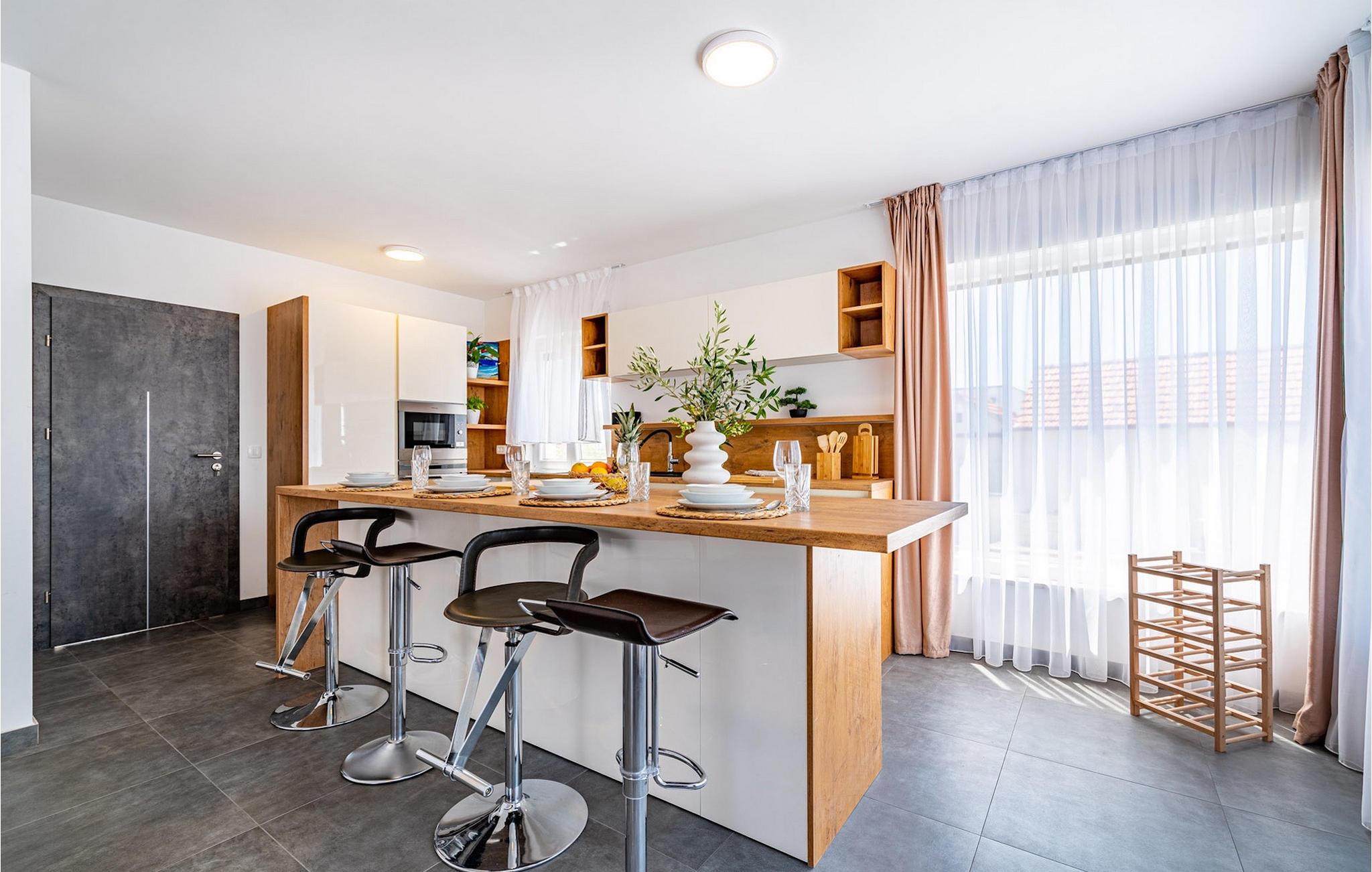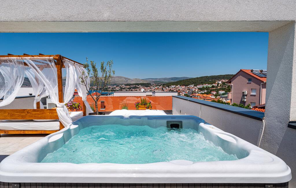 Wenn Sie auf der Suche nach einem schönen Ferienhaus in Meeresnähe sind, in dem Sie sich entspannen und den Alltagsstress loslassen können, ist die Villa Rooftop Spa eine perfekte Wahl. Wie der Name schon sagt, ist das Highlight der Villa die Dachterrasse, auf der Sie eine grüne Oase finden können. Die Terrasse besteht aus einem Wellnessbereich mit Jacuzzi und Sonnenliegen, wo Sie sich entspannen und den herrlichen Meerblick genießen können. Nur wenige Schritte entfernt befindet sich ein schattiger Essbereich im Freien und ein Holzkohlegrill, der perfekte Ort für entspannte Abendessen mit Ihren Liebsten. Das Innere dieser zweistöckigen Villa ist in einem sehr gemütlichen Stil gehalten und vermittelt seinen Gästen ein Gefühl von Zuhause. Das Erdgeschoss besteht aus einer modernen und gut ausgestatteten Küche, einer Essecke, einem gemütlichen Wohnzimmer mit Schlafsofa und 2 Doppelschlafzimmern. Im Obergeschoss befinden sich eine geräumige Küche mit Essecke, ein gemütliches Wohnzimmer mit einem zusätzlichen Schlafsofa, ein Badezimmer mit Badewanne und ein Hauptschlafzimmer mit eigenem Bad. Die Villa ist perfekt für Familien oder Gruppen, die einen erholsamen Urlaub suchen, also verpassen Sie nicht diese Chance und buchen Sie die Villa Rooftop Spa gleich jetzt.Die charmante Villa Rooftop Spa befindet sich auf der Insel Ciovo, nicht weit von Trogir entfernt. Die Insel ist durch eine Brücke mit dem Festland verbunden, und Sie können dieses schöne Reiseziel sehr einfach und schnell erreichen. Während Trogir der Ort ist, an dem Sie nach Geschichte suchen und die alten Mauern, Gassen und den Geist des früheren Mediterrans bewundern können, ist Ciovo der Ort, an dem Sie Erholung, Unterhaltung, gutes Essen und Strände finden werden. Die beliebtesten Ausflugsziele befinden sich im Okrug Gornji und Okrug Donji, wo Sie auch die besten Restaurants finden. Im südwestlichen Teil der Insel finden Sie die schönen Kieselstrände Labadusa, Barbara und Kava, während im Nordwesten der beliebteste 2 km lange Strand "Okruška Copacabana" in Okrug Gornji liegt. Besuchen Sie die historische Stadt Trogir, die seit 1997 auf der UNESCO-Liste steht. Machen Sie einen Spaziergang durch die engen Gassen der Altstadt und erleben Sie ihre reiche Geschichte.
